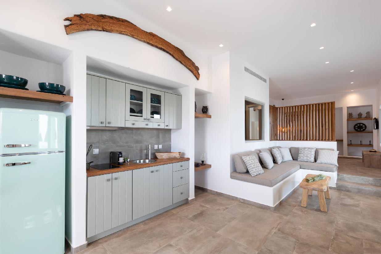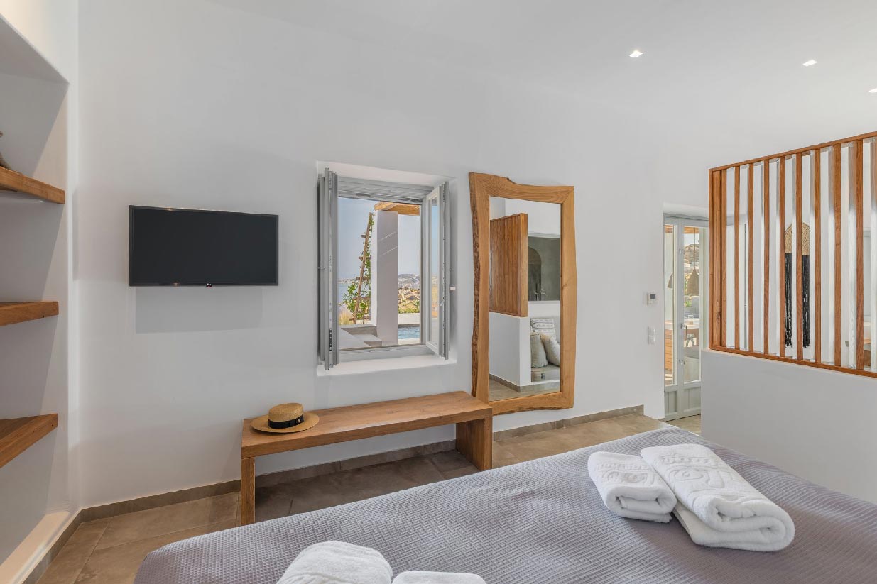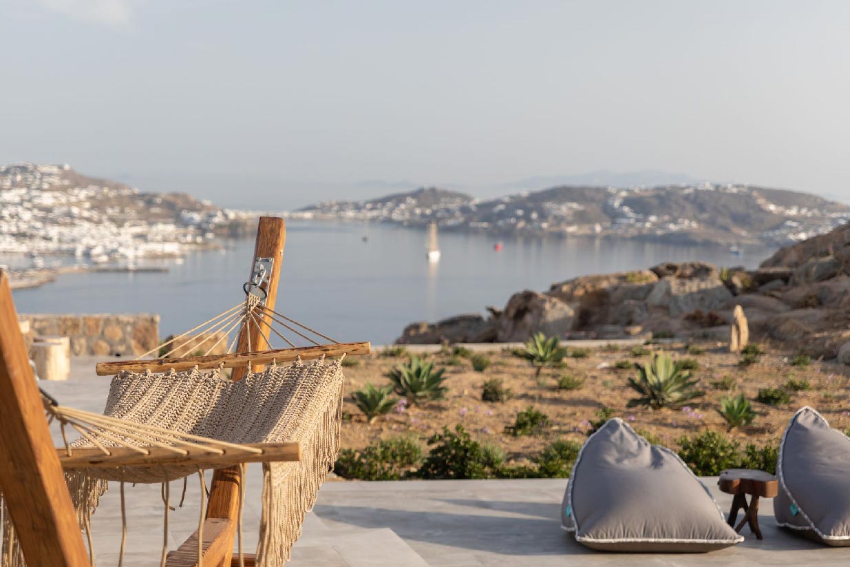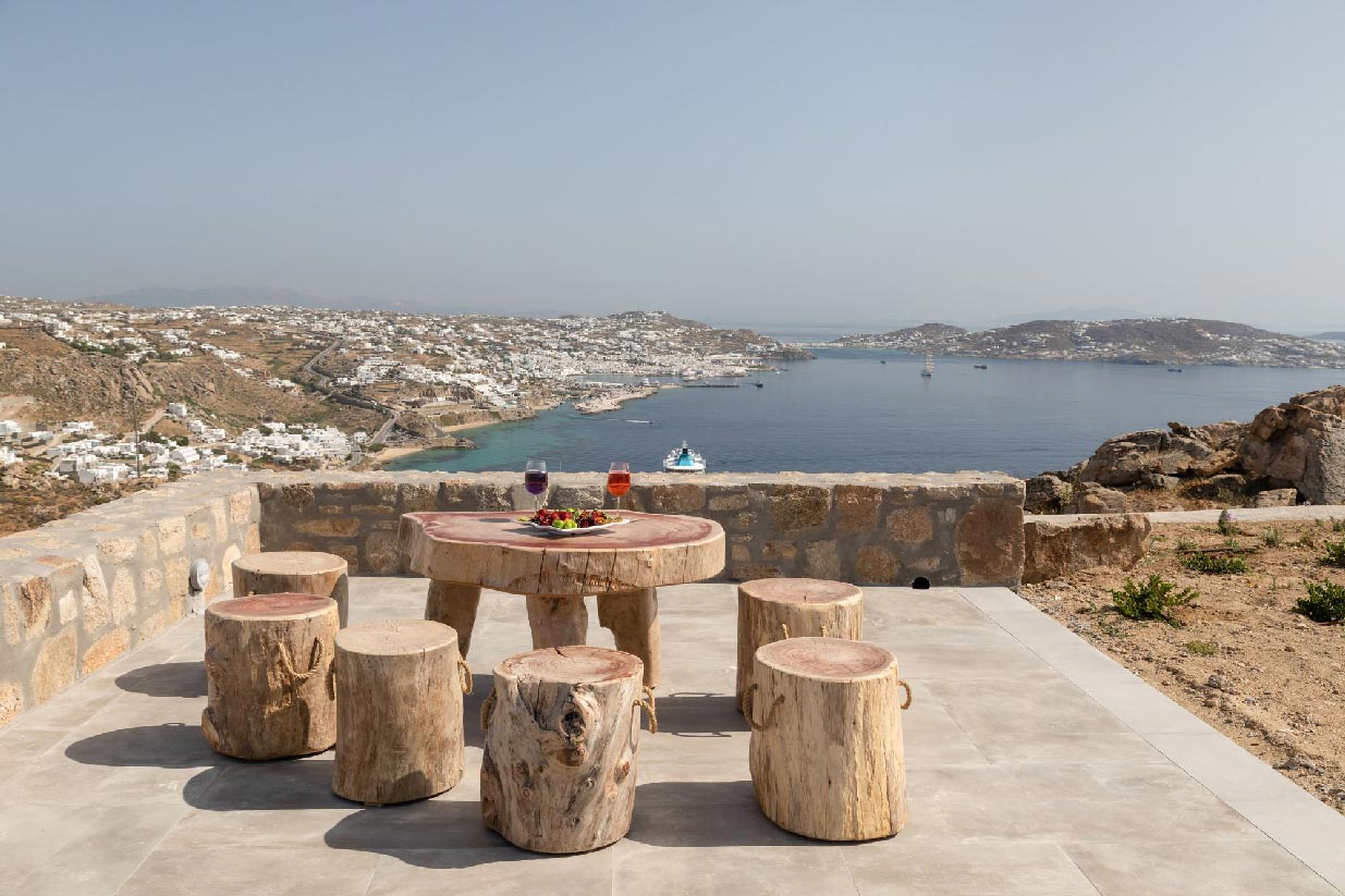 Villa Alessio is modernly designed and furnished with high standards and attention to every detail, inspired by light boho elements and the magnificent rural aspect of Mykonos Island. The design and construction of the villa were based on traditional local stone and quality materials, blending in total harmony with the natural environment. The garden of the property is filled with a variety of cacti and local flowers that give the property an earthy essence and breeze.