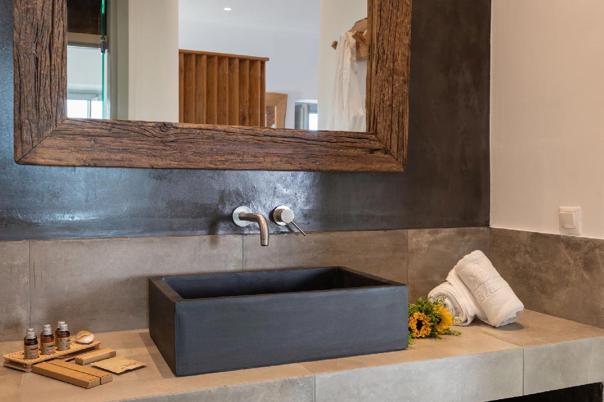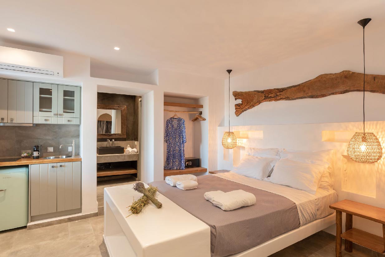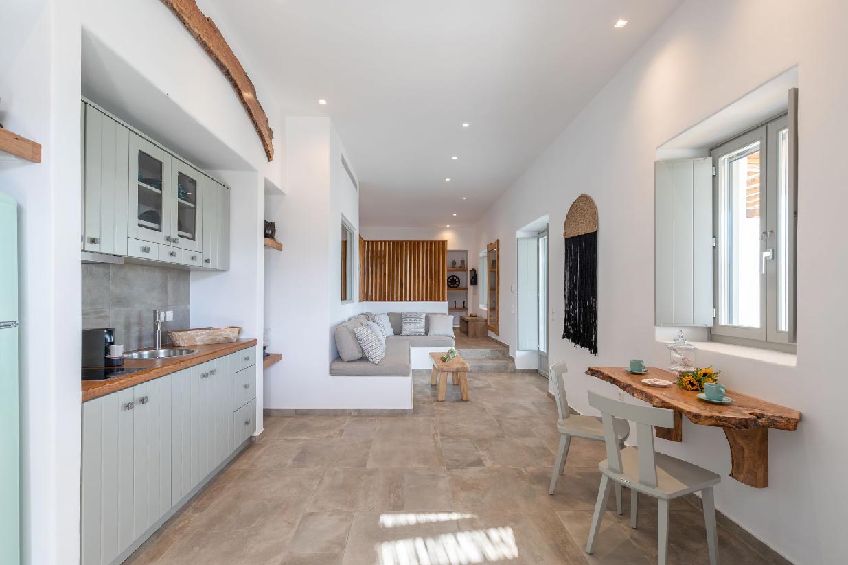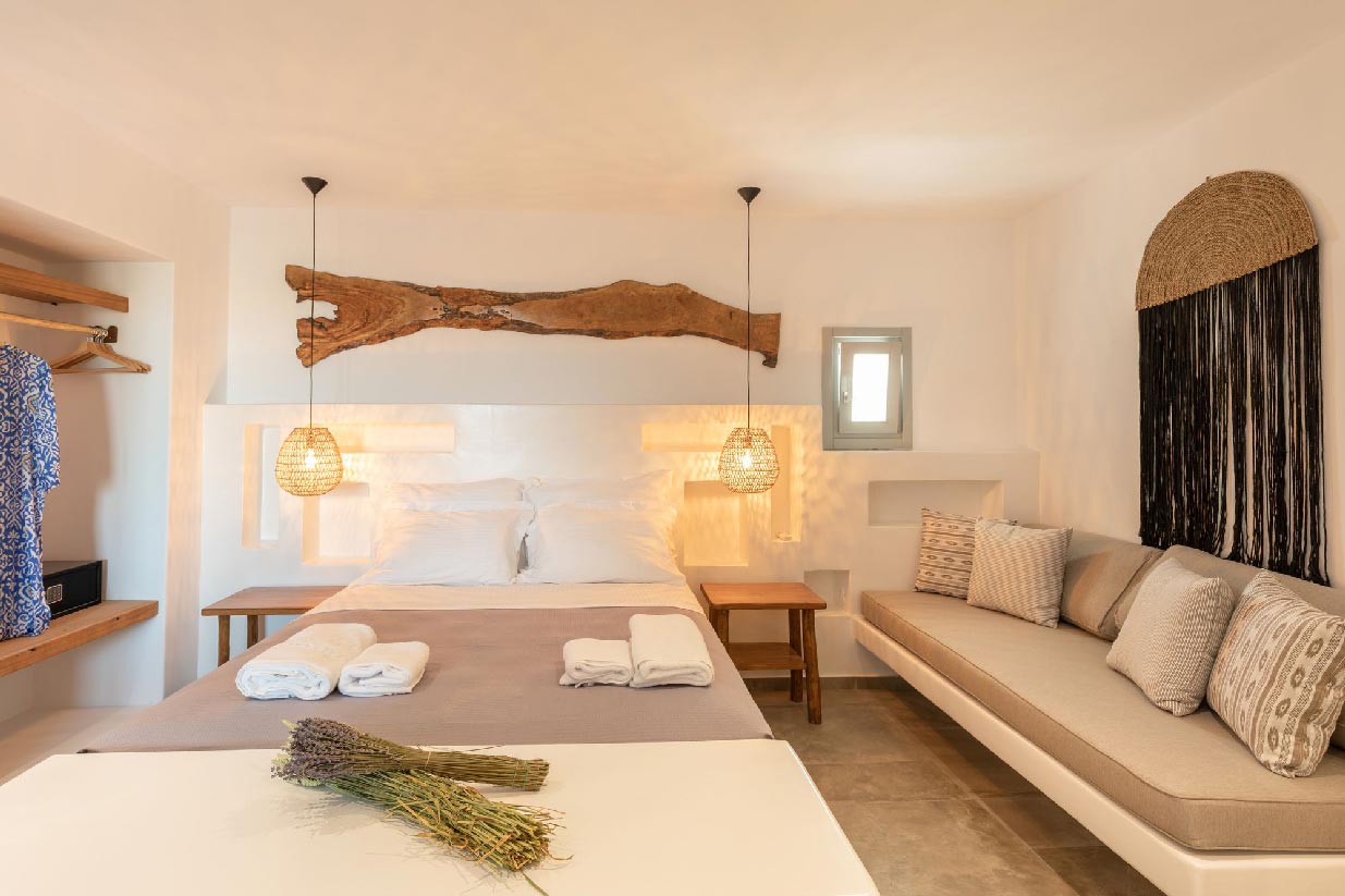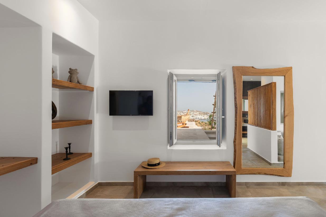 Villa Alessio is modernly designed and furnished with high standards and attention to every detail, inspired by light boho elements and the magnificent rural aspect of Mykonos Island. The design and construction of the villa were based on traditional local stone and quality materials, blending in total harmony with the natural environment. The garden of the property is filled with a variety of cacti and local flowers that give the property an earthy essence and breeze.