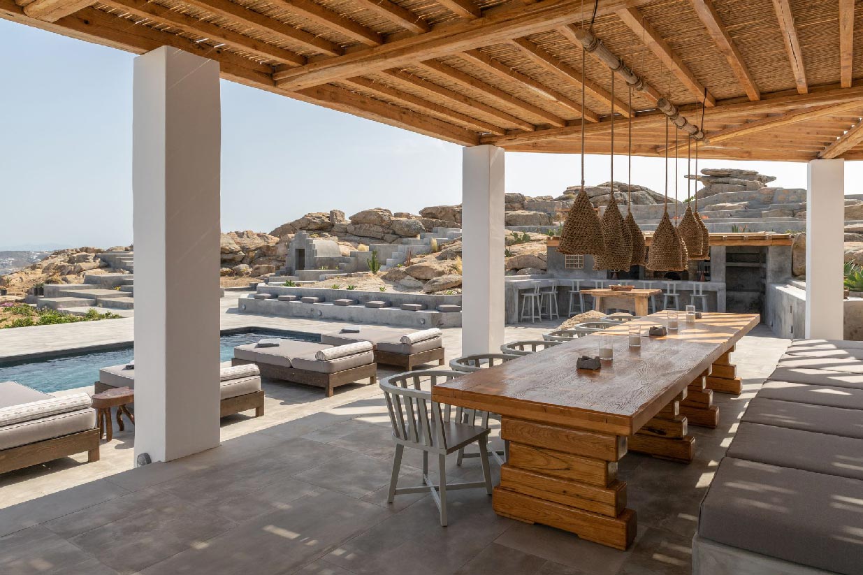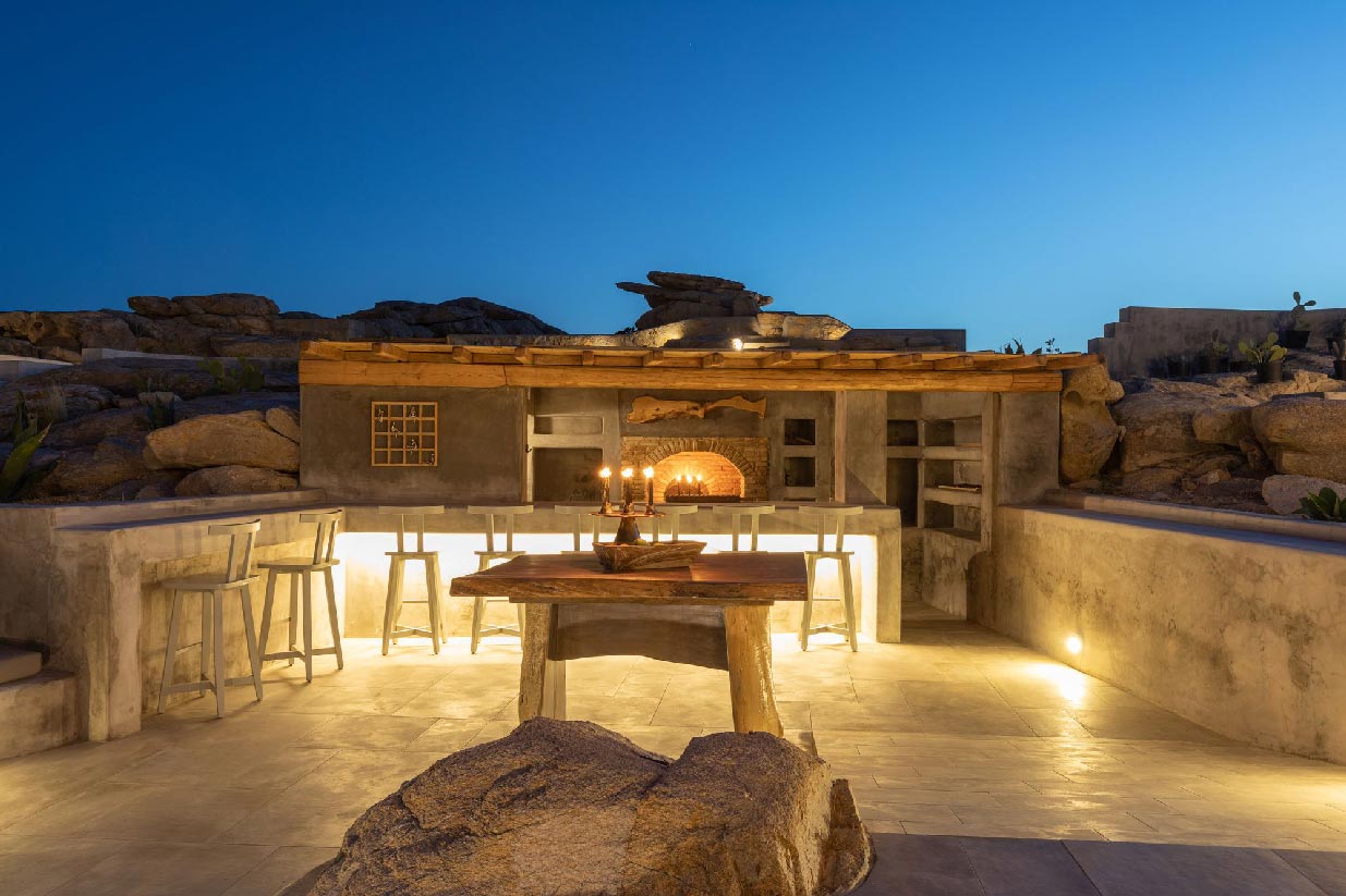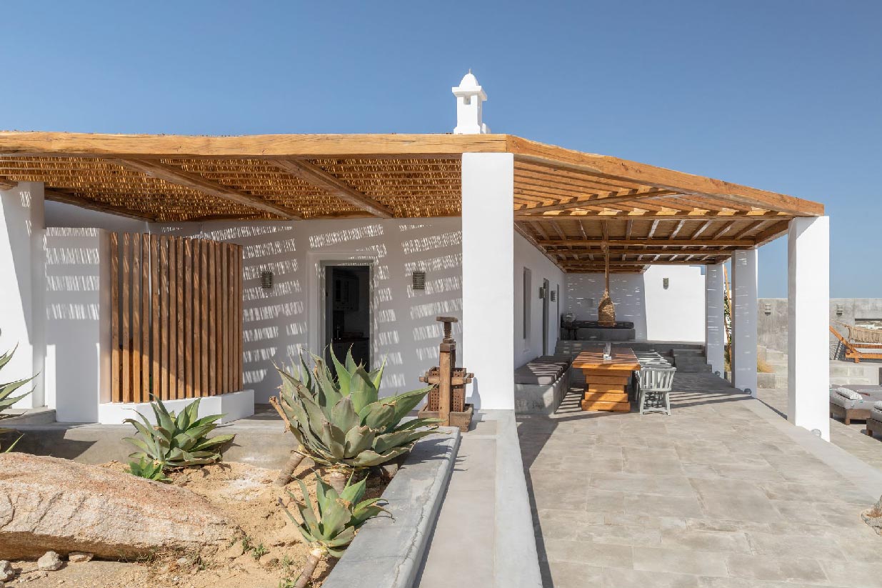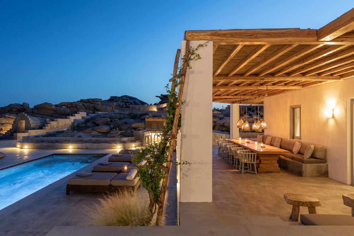 Following the authentic mykonian way of living, almi consists of one main house and 3 independent guest houses that frame a very secluded pool and a large outdoor living area surrounded by the impressive Mykonian nature of epic rocks and cactus.