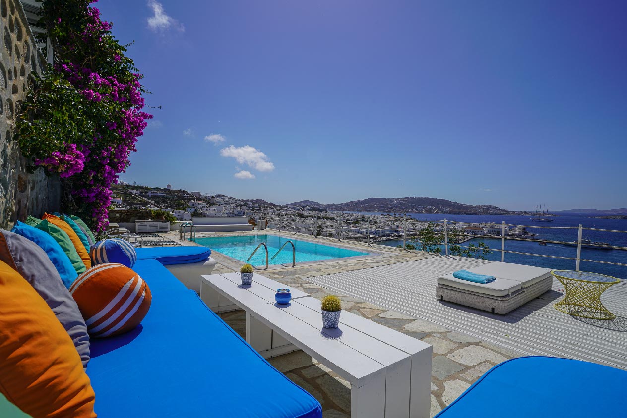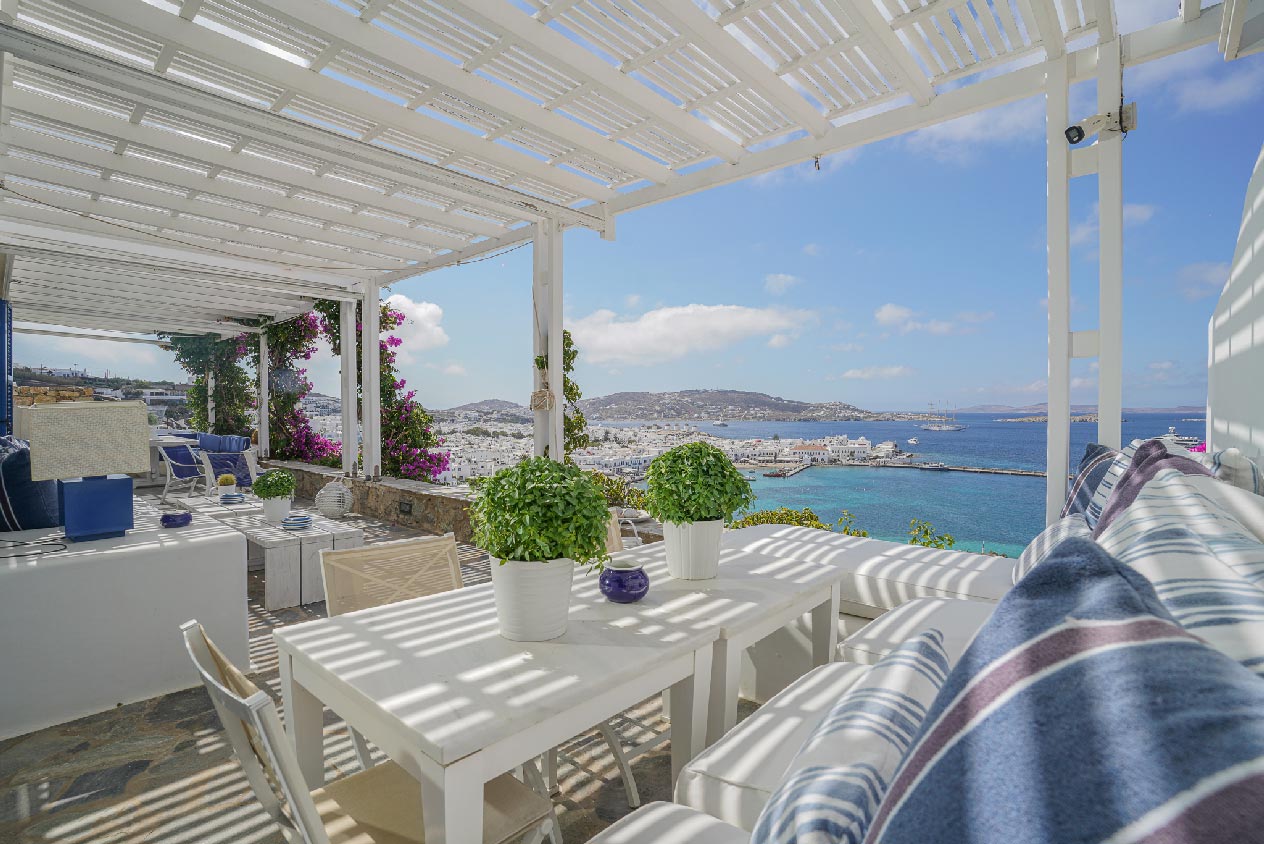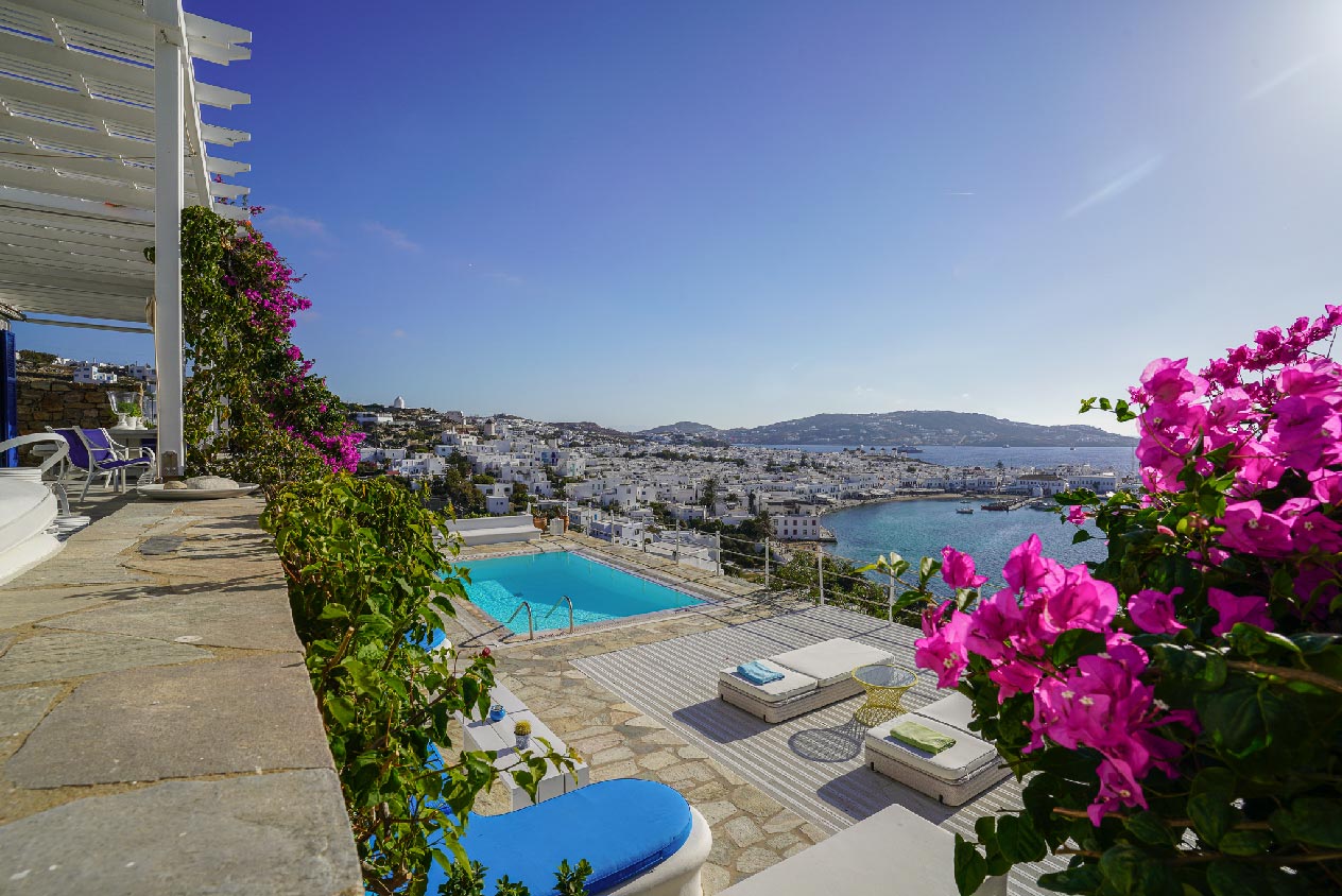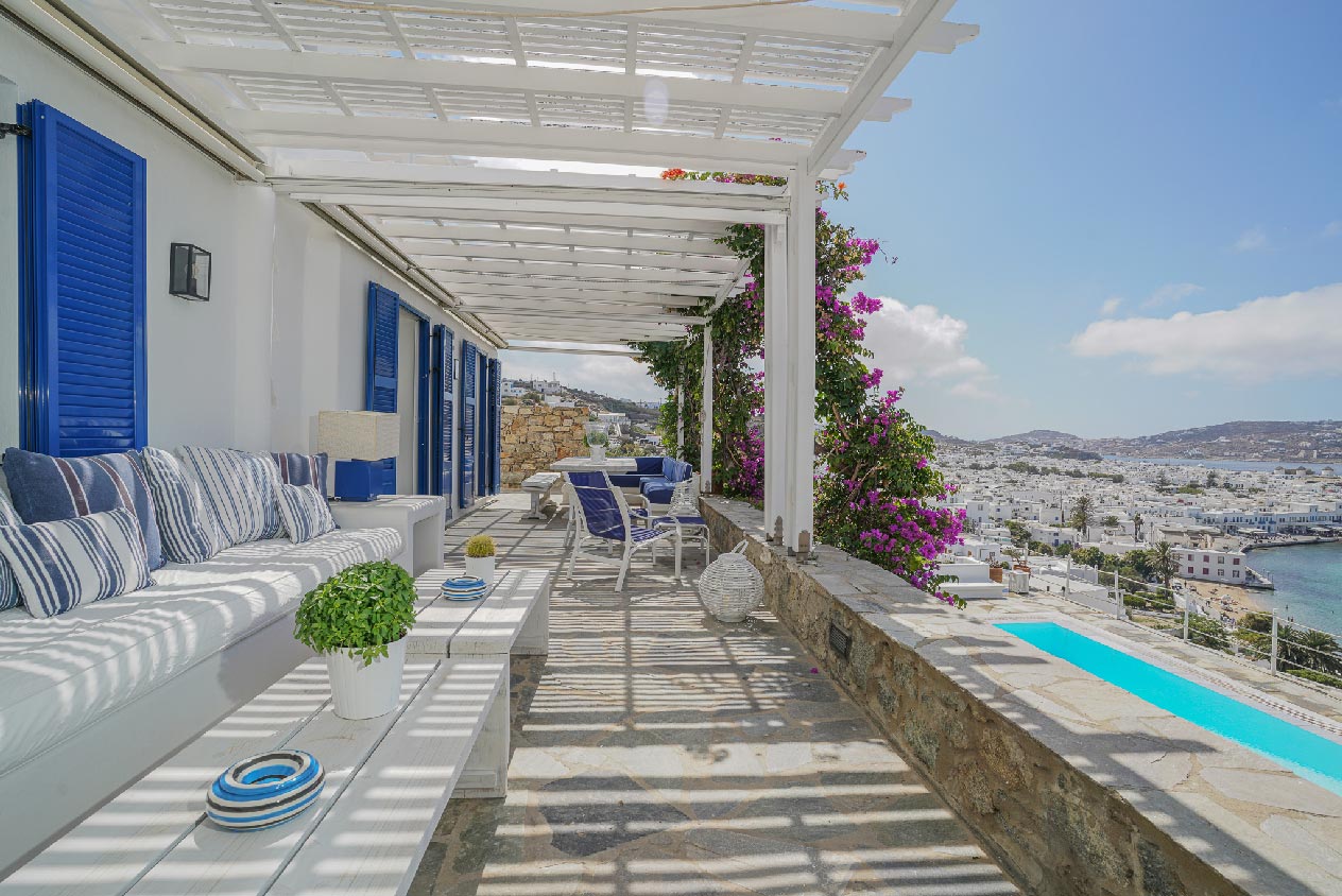 Postcard views , 5 minute walk into Mykonos town. Perched above the old port of Mykonos town.The villa enjoys breathtaking views of Mykonian sunsets, the town's unique Cycladic architecture and the endless Aegean sea. This special villa is the ideal refuge for guests who want the best of all worlds, a perfect location with direct access to Mykonos’ cosmopolitan lifestyle as well as tranquility and relaxation. Staying here, guests can enjoy unforgettable moments and create the best memories.Outdoor space consists of two terraces, facing Mykonos town, maximizing the magnificent views. The upper terrace, which is outside the living area, has a comfortable seating area and an outdoor dining area covered with an elegant pergola. Just a few steps down is a second terrace with a private swimming pool, as well as a relaxation area with its own small bar. Cosmopolitanism is rediscovered in the style and comfort of the interiors.
