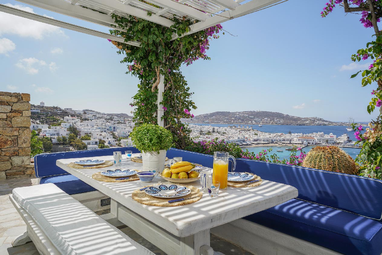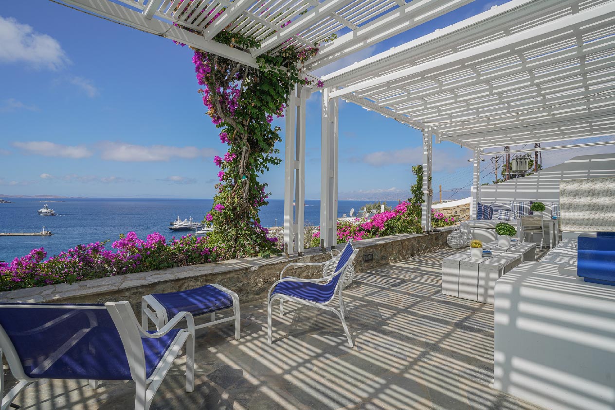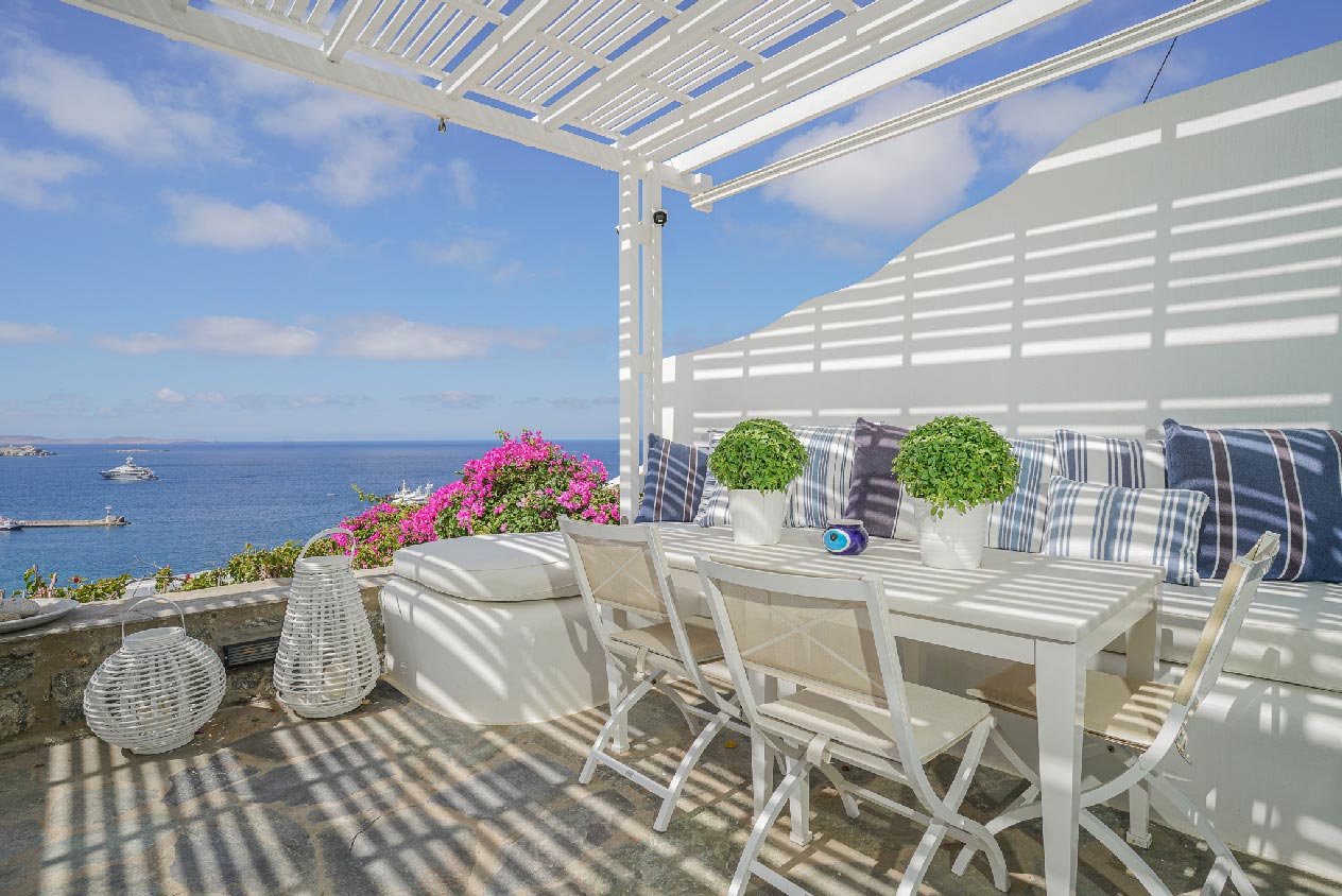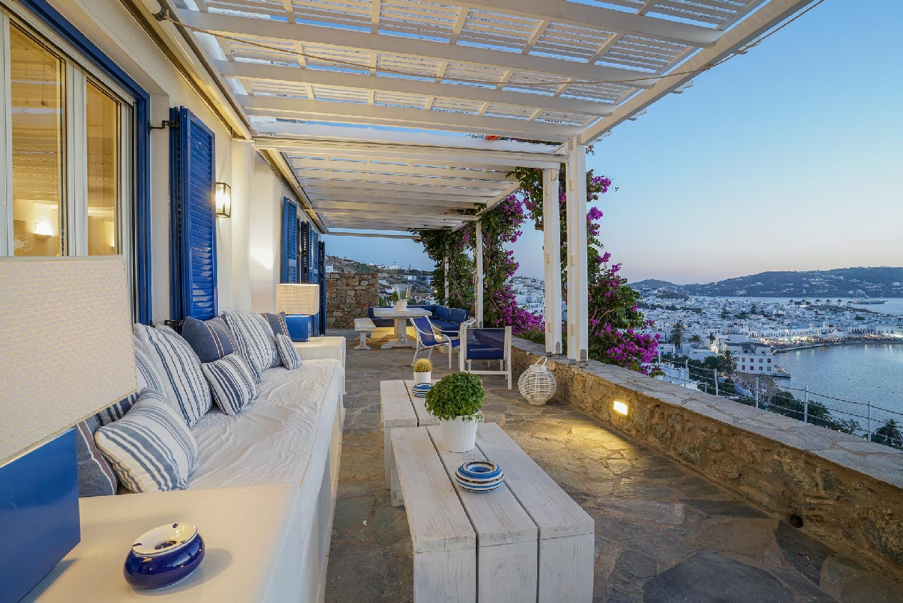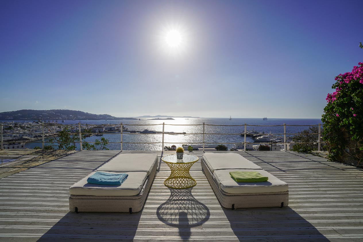 Postcard views , 5 minute walk into Mykonos town. Perched above the old port of Mykonos town.The villa enjoys breathtaking views of Mykonian sunsets, the town's unique Cycladic architecture and the endless Aegean sea. This special villa is the ideal refuge for guests who want the best of all worlds, a perfect location with direct access to Mykonos’ cosmopolitan lifestyle as well as tranquility and relaxation. Staying here, guests can enjoy unforgettable moments and create the best memories.Outdoor space consists of two terraces, facing Mykonos town, maximizing the magnificent views. The upper terrace, which is outside the living area, has a comfortable seating area and an outdoor dining area covered with an elegant pergola. Just a few steps down is a second terrace with a private swimming pool, as well as a relaxation area with its own small bar. Cosmopolitanism is rediscovered in the style and comfort of the interiors.