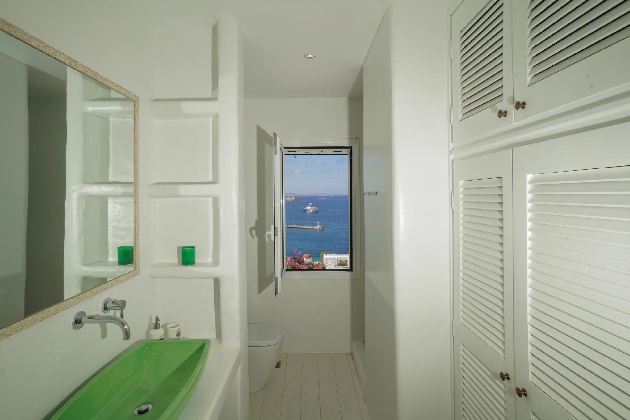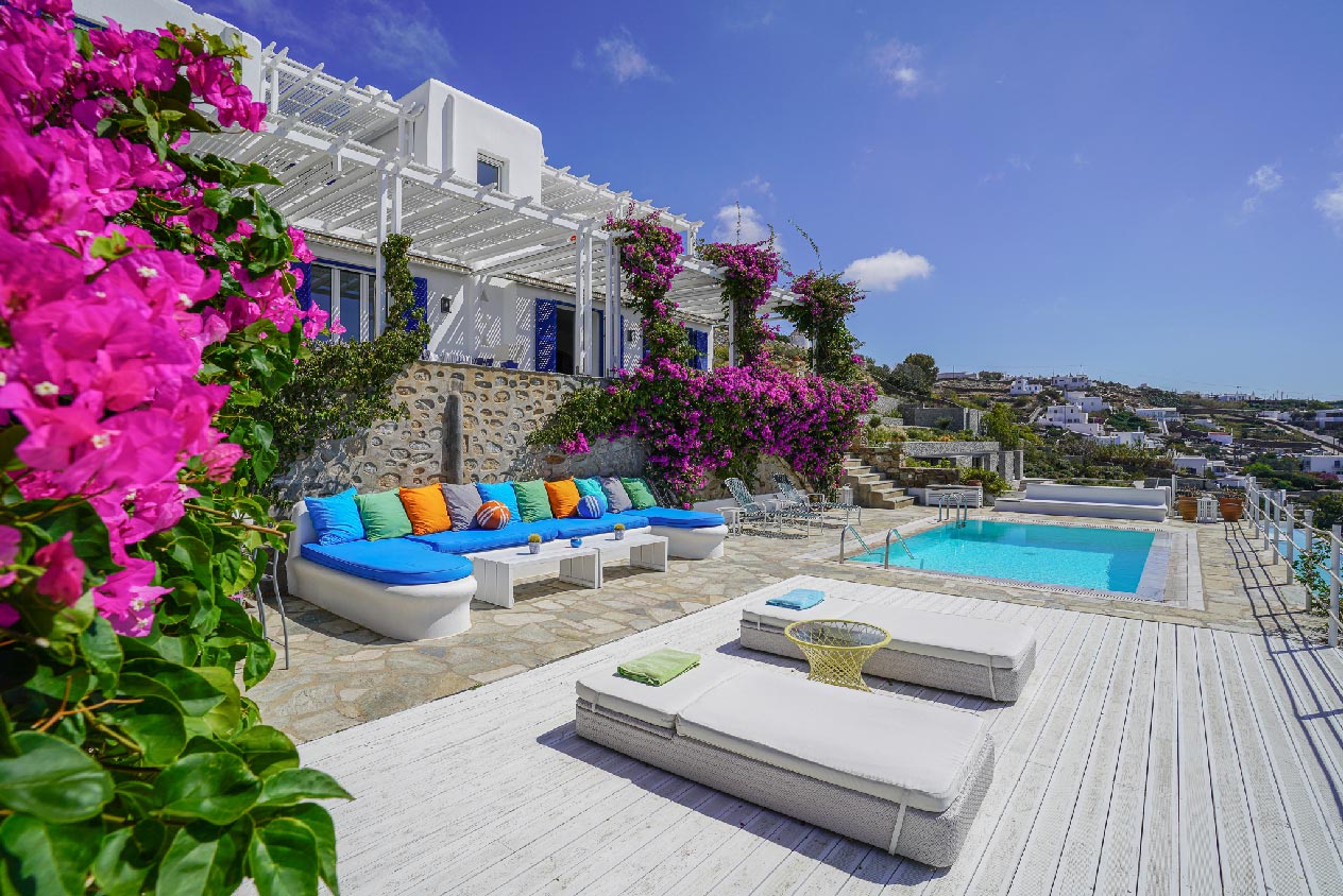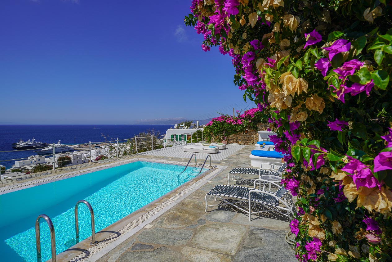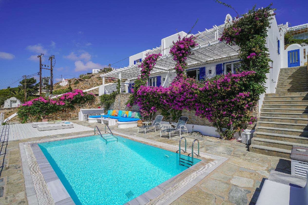 Postcard views , 5 minute walk into Mykonos town. Perched above the old port of Mykonos town.The villa enjoys breathtaking views of Mykonian sunsets, the town's unique Cycladic architecture and the endless Aegean sea. This special villa is the ideal refuge for guests who want the best of all worlds, a perfect location with direct access to Mykonos’ cosmopolitan lifestyle as well as tranquility and relaxation. Staying here, guests can enjoy unforgettable moments and create the best memories.Outdoor space consists of two terraces, facing Mykonos town, maximizing the magnificent views. The upper terrace, which is outside the living area, has a comfortable seating area and an outdoor dining area covered with an elegant pergola. Just a few steps down is a second terrace with a private swimming pool, as well as a relaxation area with its own small bar. Cosmopolitanism is rediscovered in the style and comfort of the interiors.