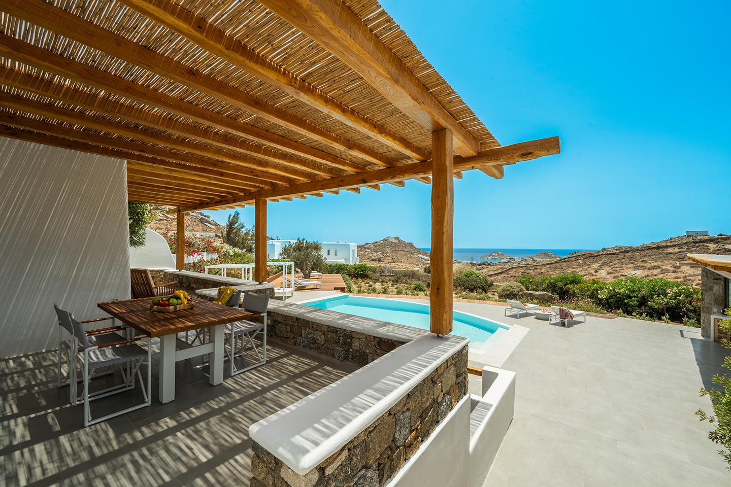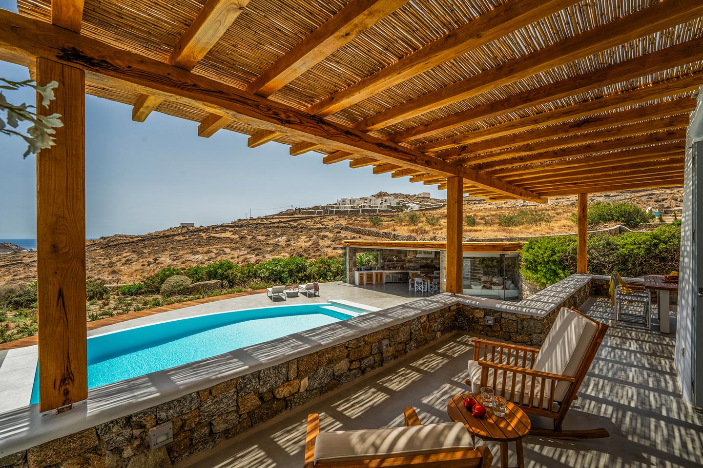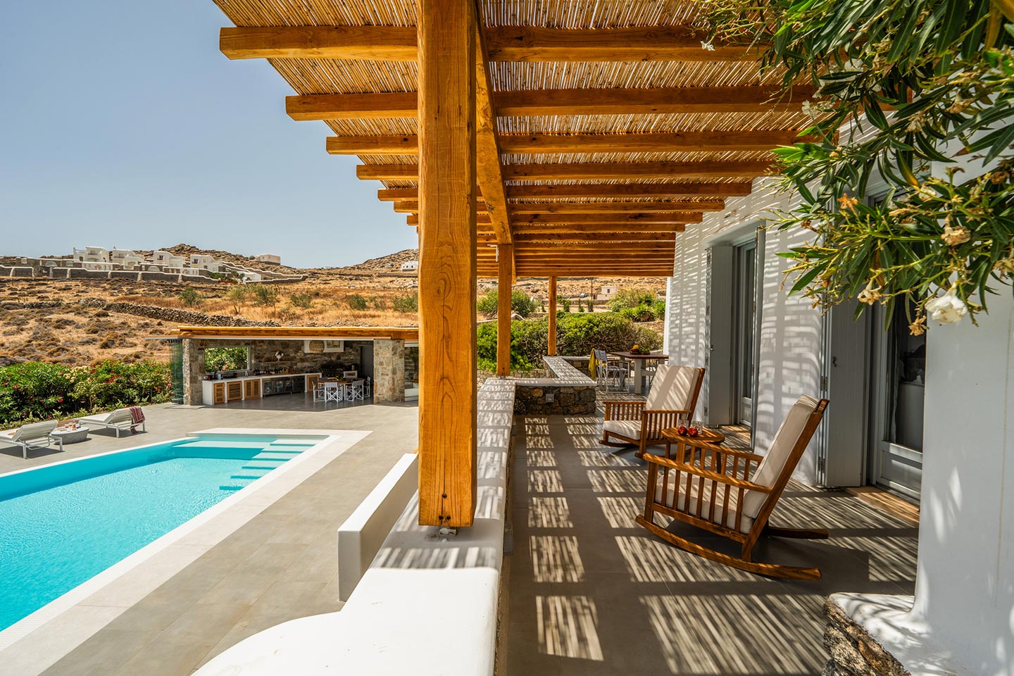 Escape to this paradise in this newly renovated 4 -bedroom villa in the upcoming area of Kalafatis . Designed with elegance and comfort in mind, this villa offers the perfect blend of luxury and tranquillity. Dive into the heated swimming pool, perfect for year -round enjoyment, and unwi nd under the expansive pergola, ideal for outdoor dining and entertai ni ng. The fully equipped, state -of -the - art outdoor kitchen is perfect for prepari ng delicious meals to be enjoyed alfresco.