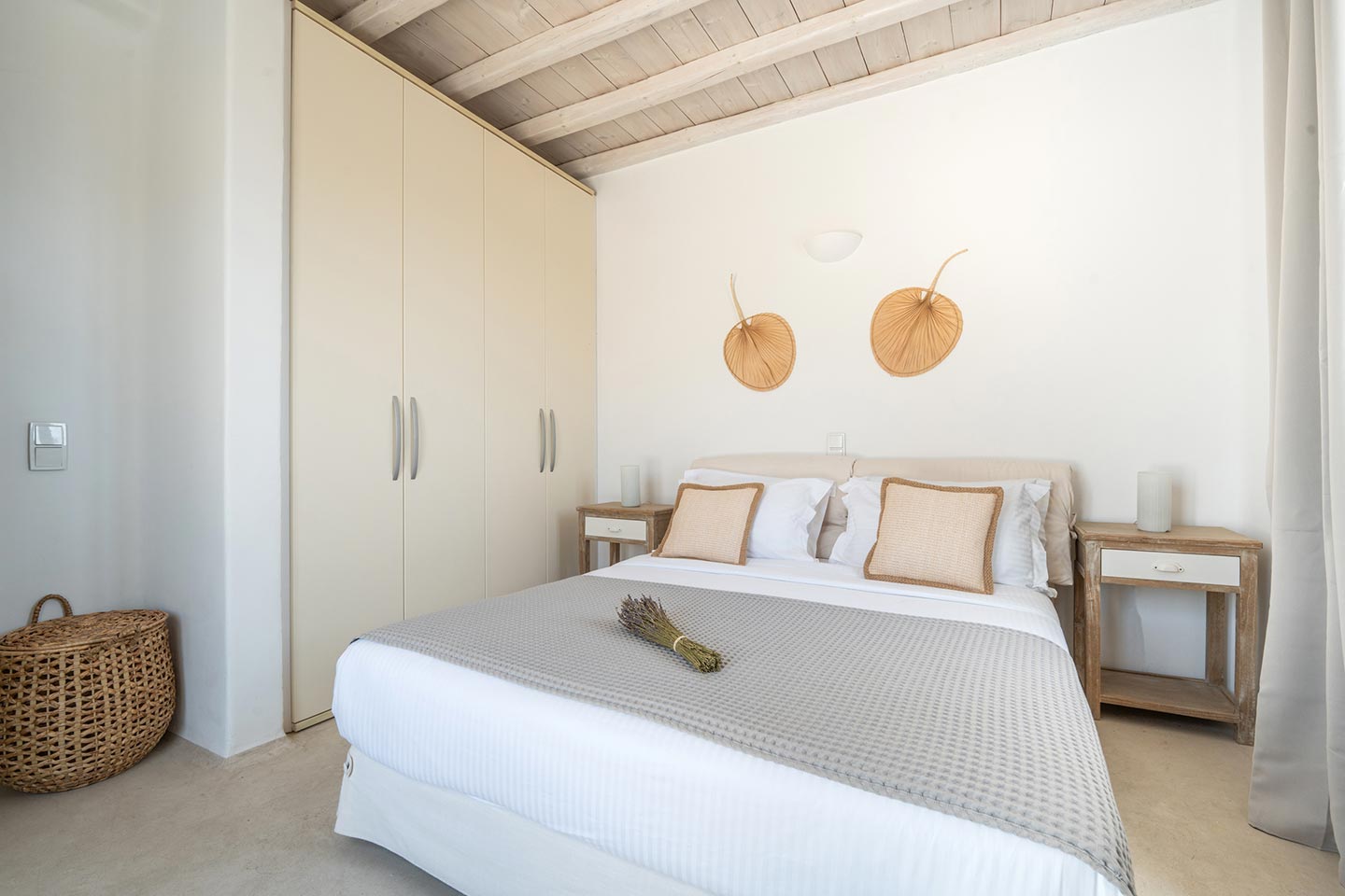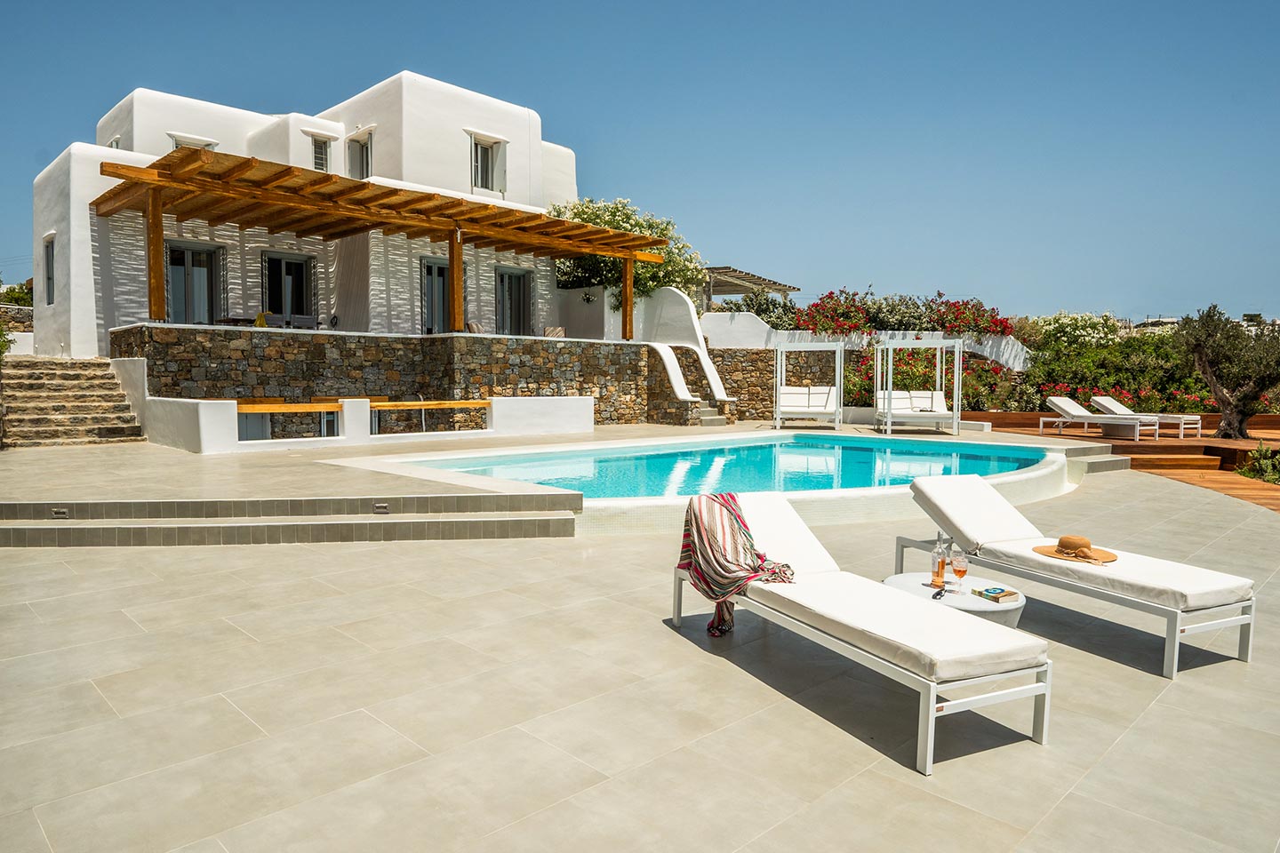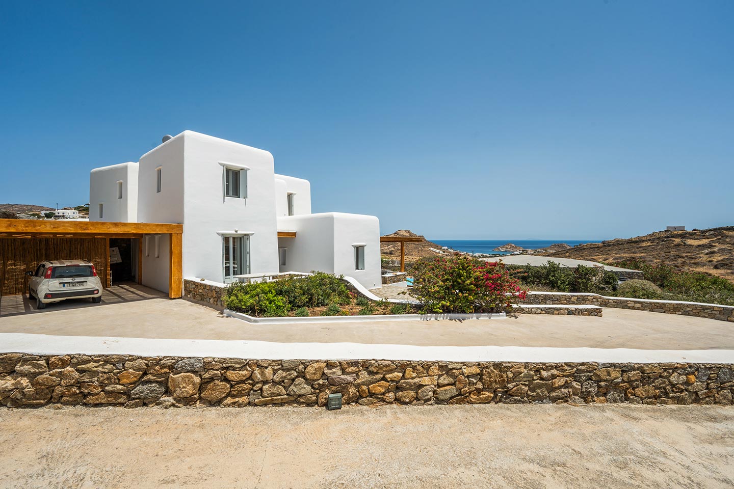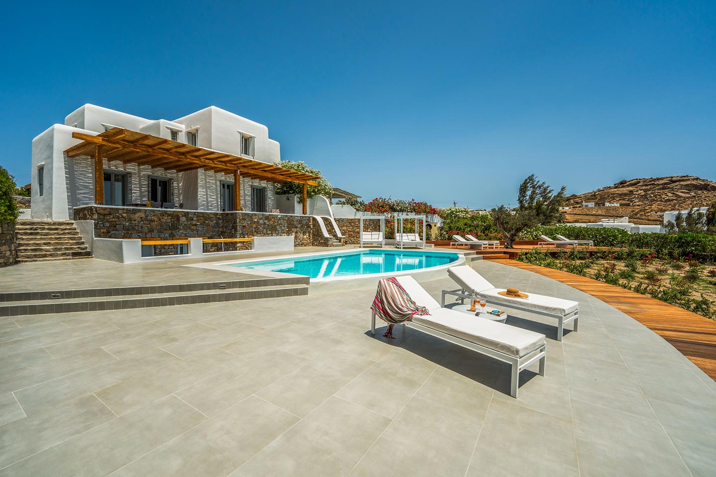 The villa boasts four spacious bedrooms decorated with high quality furnishing and linen and all of them with private bathrooms . Nestled in the serene Kalafatis area, the villa provides a peaceful retreat while being just a short drive away from the famous beaches of Mykonos . It is perfect for families or group of friends, offering an idyllic setting for creati ng unforge ttab le memories .