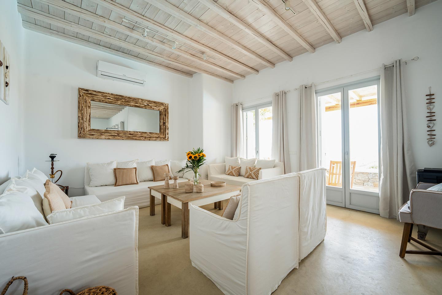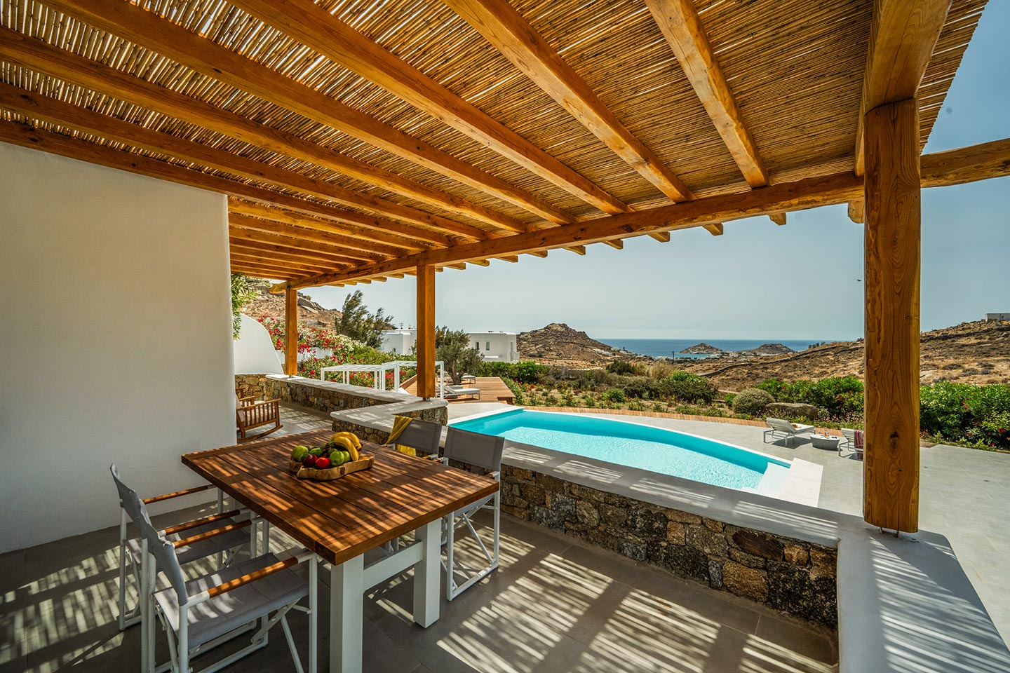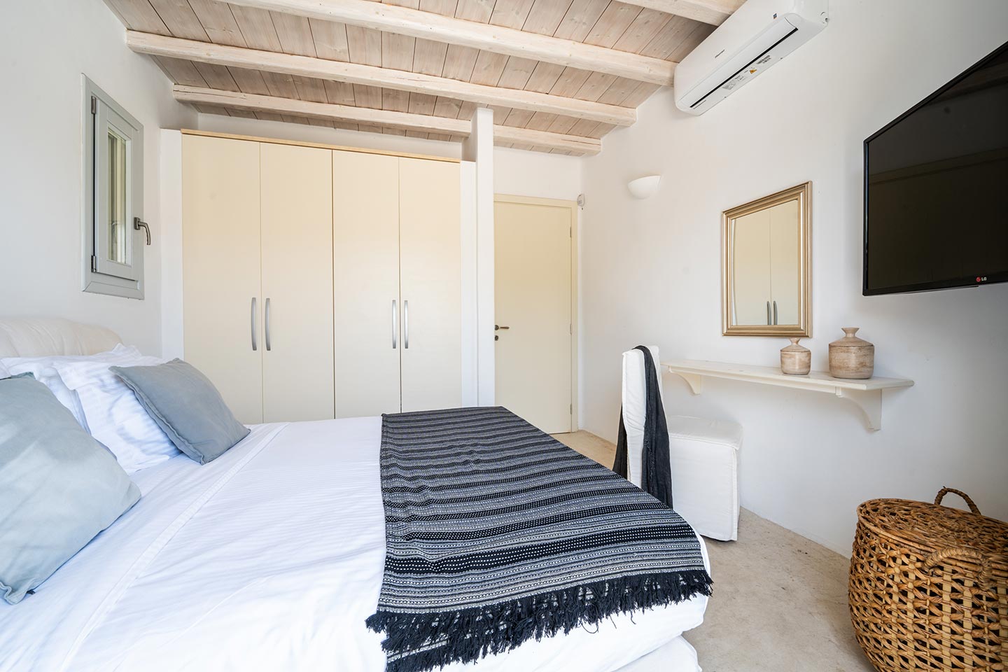 The villa boasts four spacious bedrooms decorated with high quality furnishing and linen and all of them with private bathrooms . Nestled in the serene Kalafatis area, the villa provides a peaceful retreat while being just a short drive away from the famous beaches of Mykonos . It is perfect for families or group of friends, offering an idyllic setting for creati ng unforge ttab le memories .