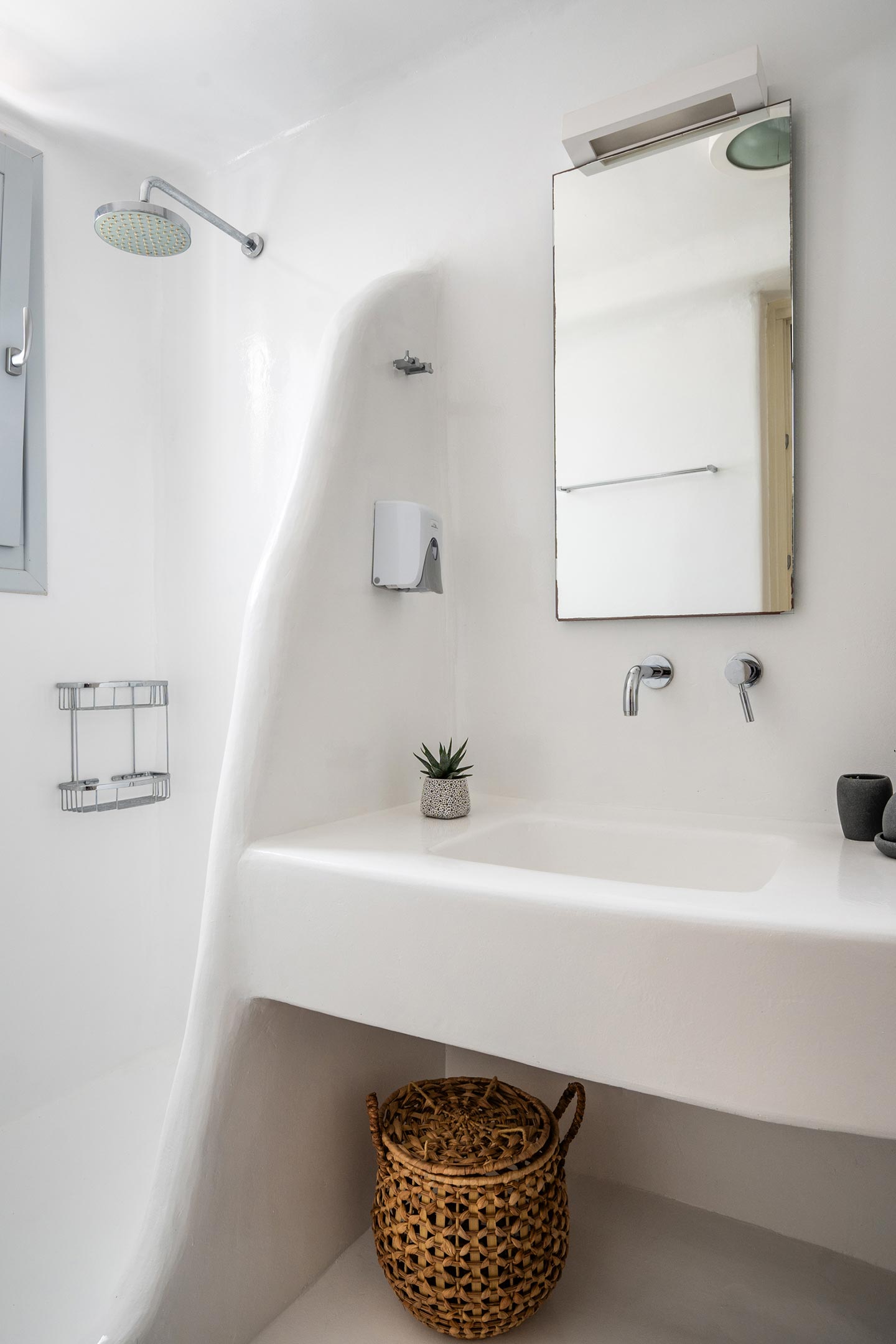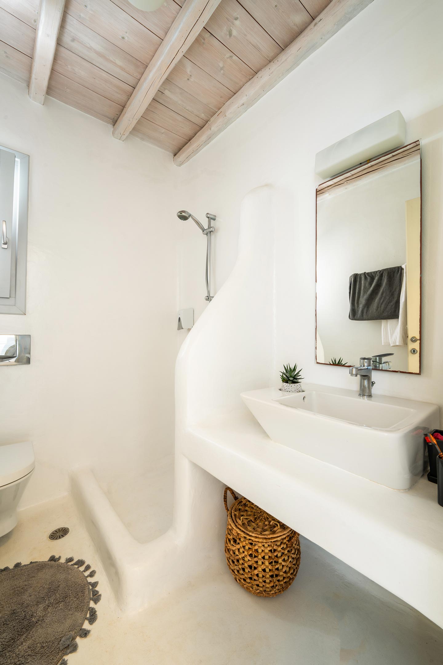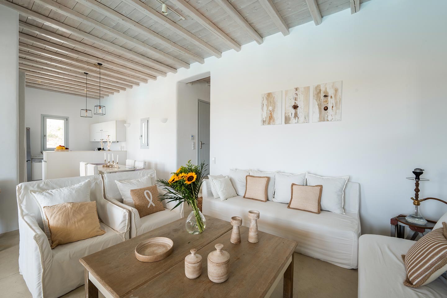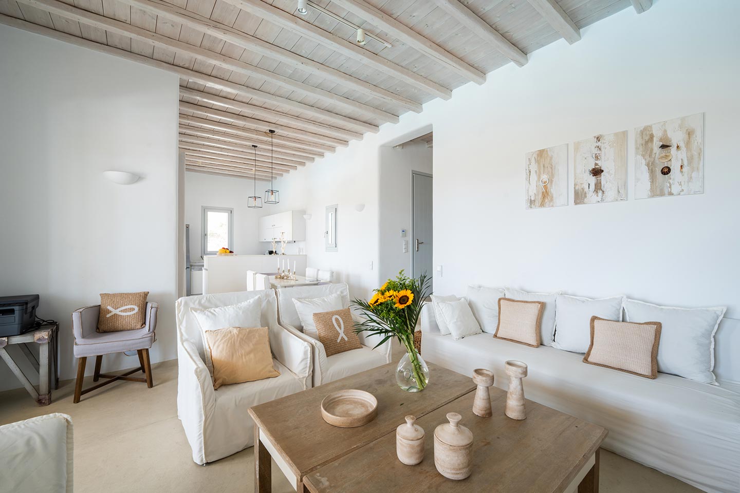 The villa boasts four spacious bedrooms decorated with high quality furnishing and linen and all of them with private bathrooms . Nestled in the serene Kalafatis area, the villa provides a peaceful retreat while being just a short drive away from the famous beaches of Mykonos . It is perfect for families or group of friends, offering an idyllic setting for creati ng unforge ttab le memories .