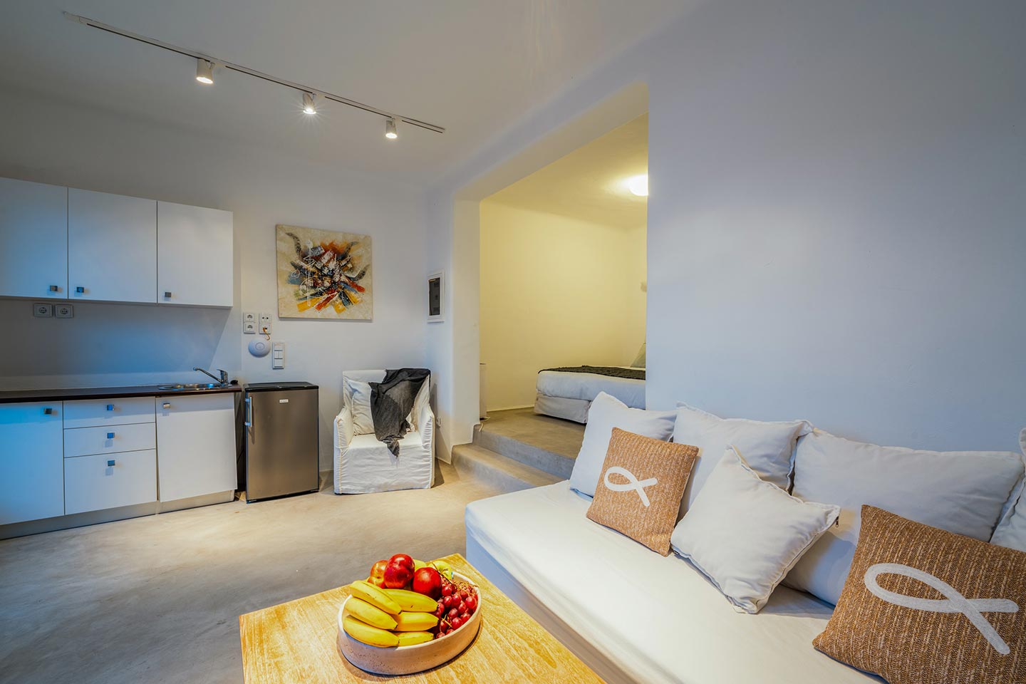 ➢ Living area with three comfortable sofas and large windows that open to private balcony