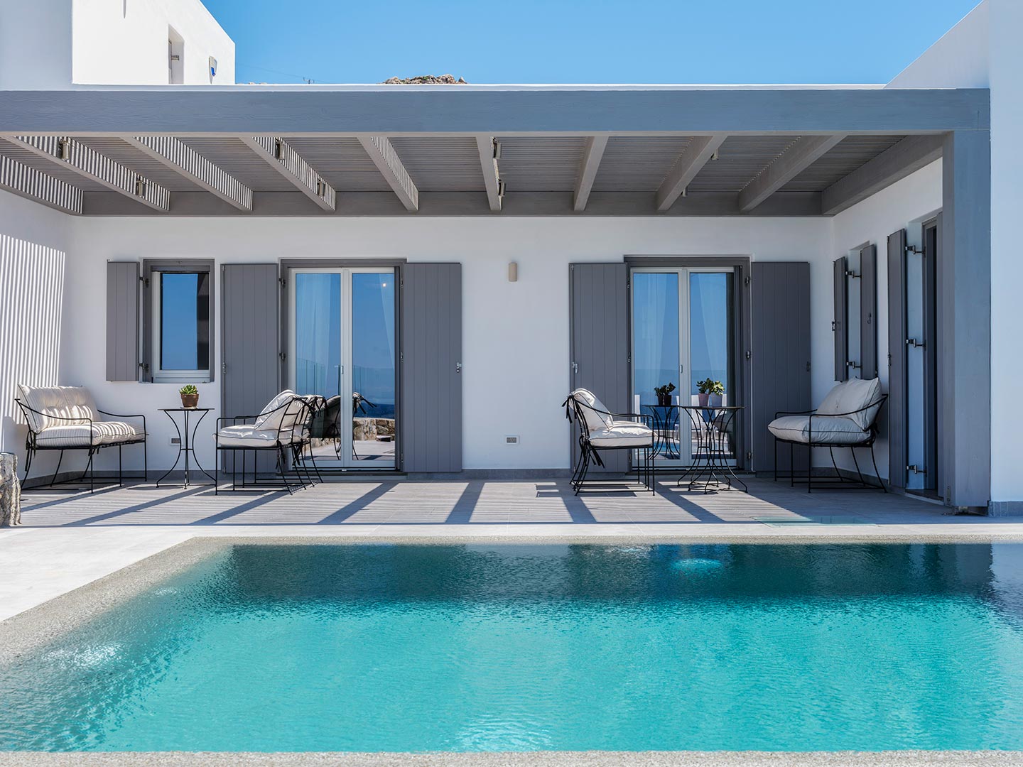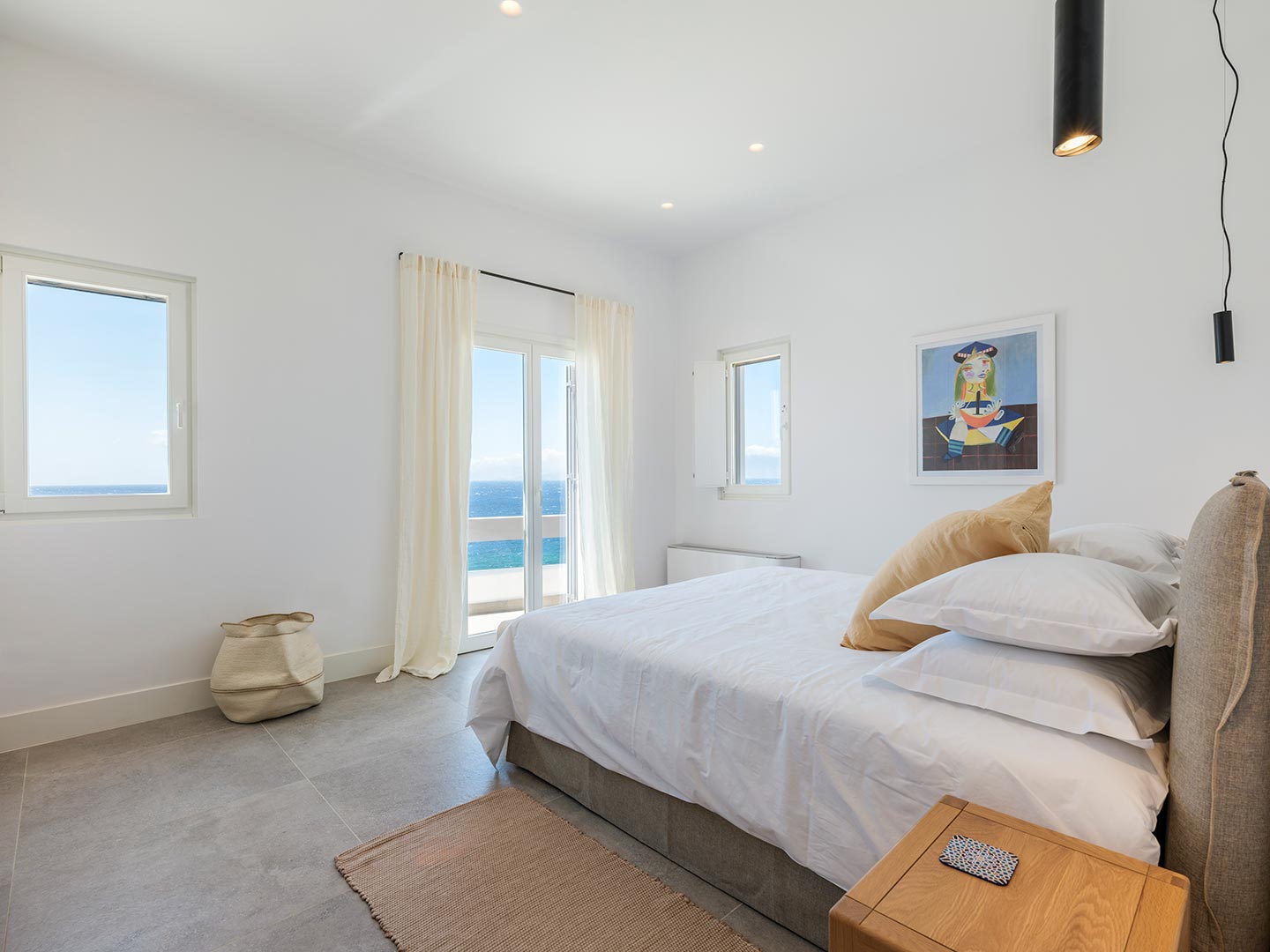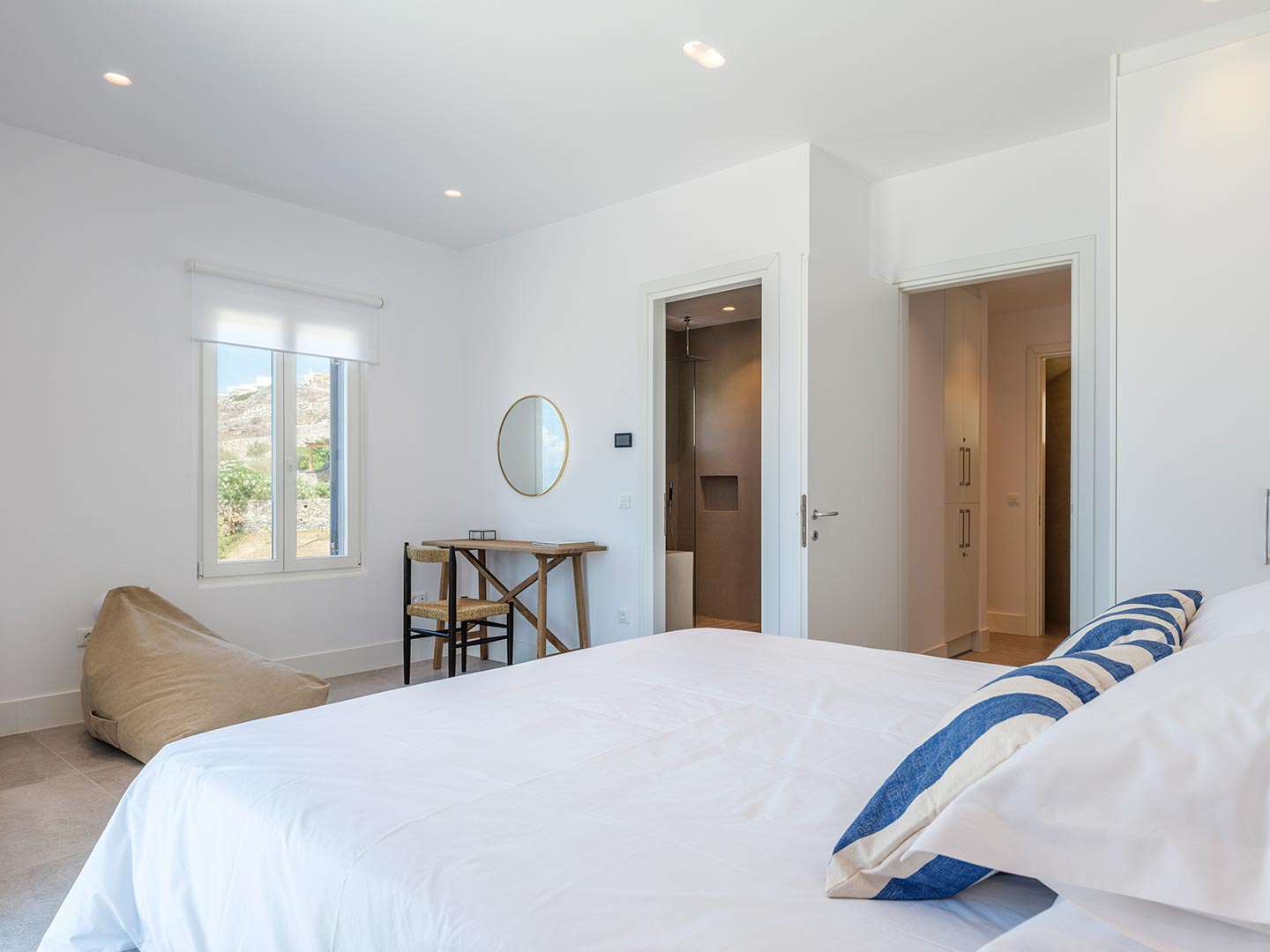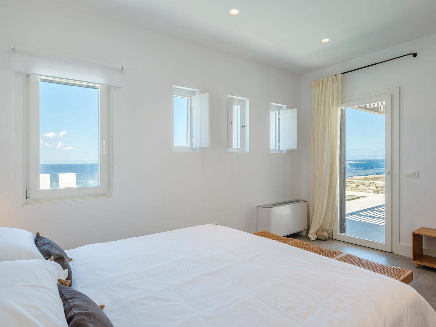 ➢ 3 Double bedroom with queen sized bed and ensuite bathroom. Equipped with AC, wardrobe, safe box and has direct access to pool and bed views to the Aegean Sea.