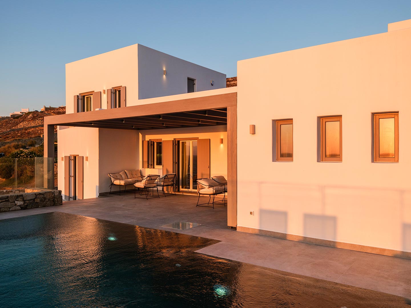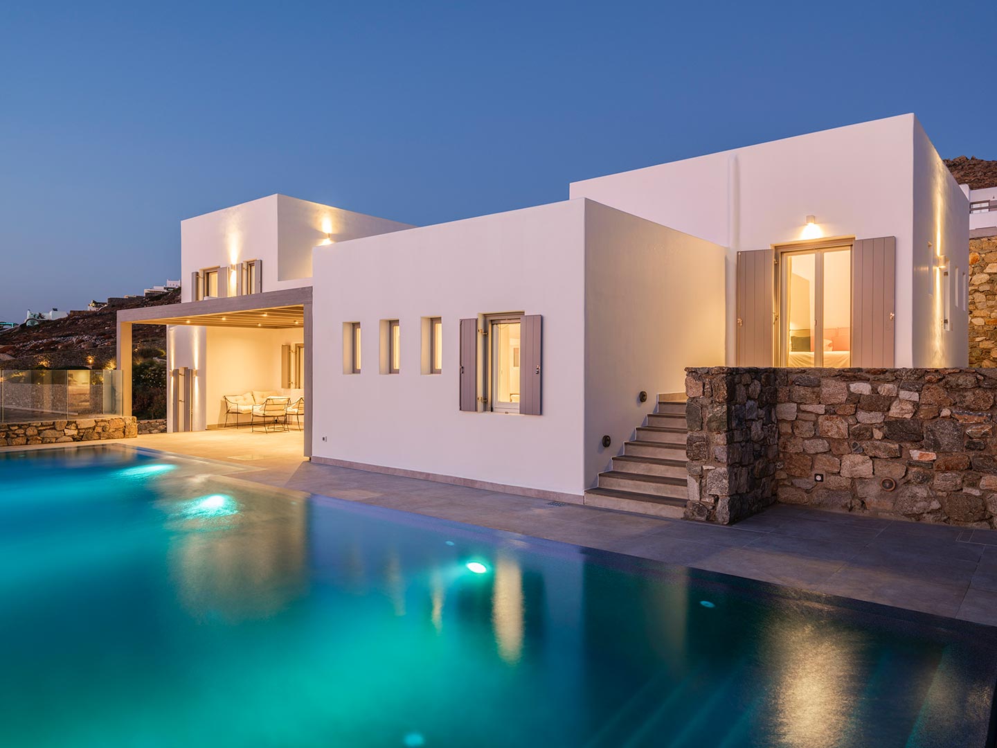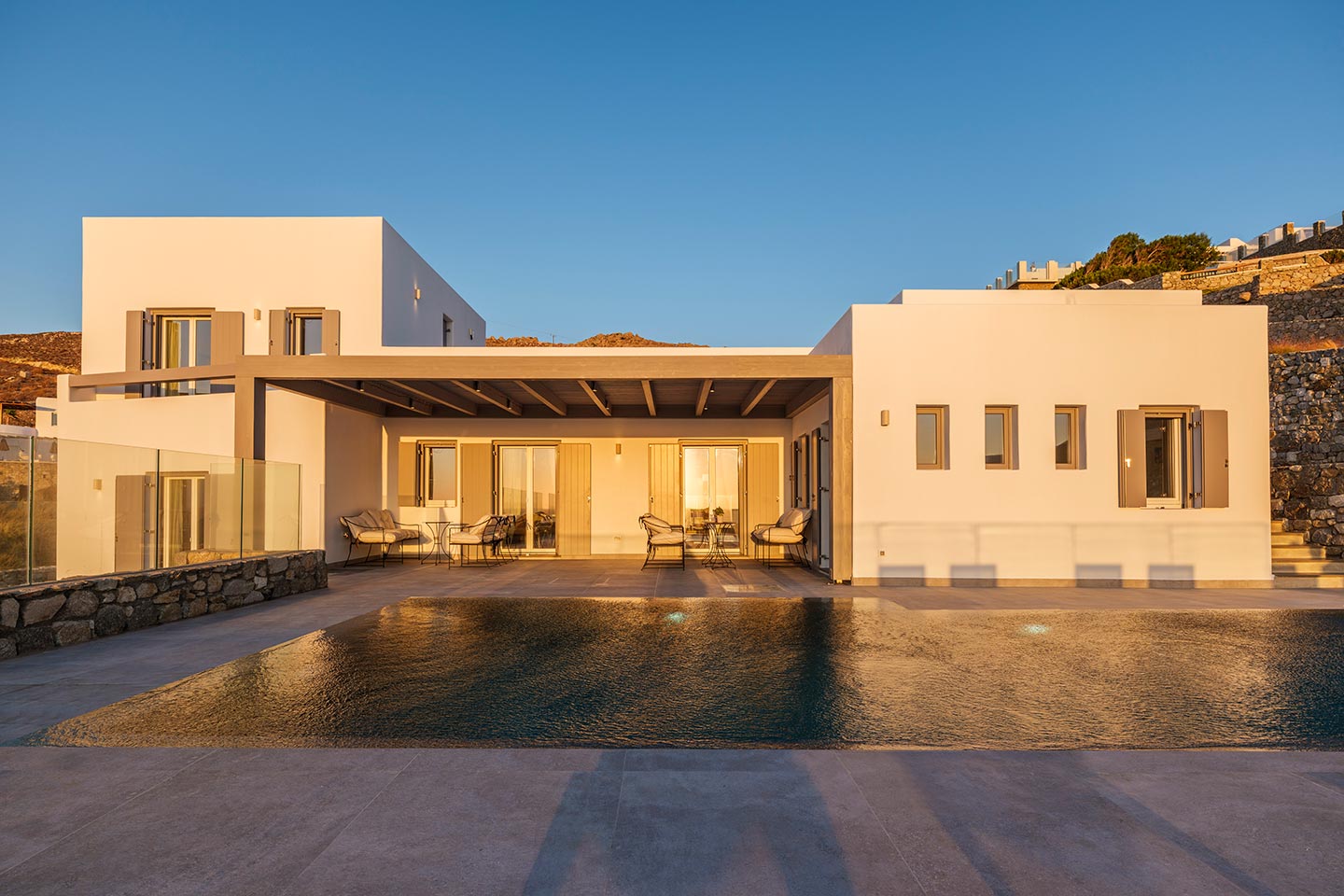 Boasting a privileged location in the Pouli area, just a few minutes away from the vibrant town of Mykonos, this beachfront villa is a luxurious modern retreat that epitomizes elegance and comfort. This modern architectural masterpiece seamlessly blends contemporary design with breathtaking natural beauty Each of the spacious bedrooms features an ensuite bathroom, providing comfort and privacy, and has been tastefully decorated with high -end finishes .
