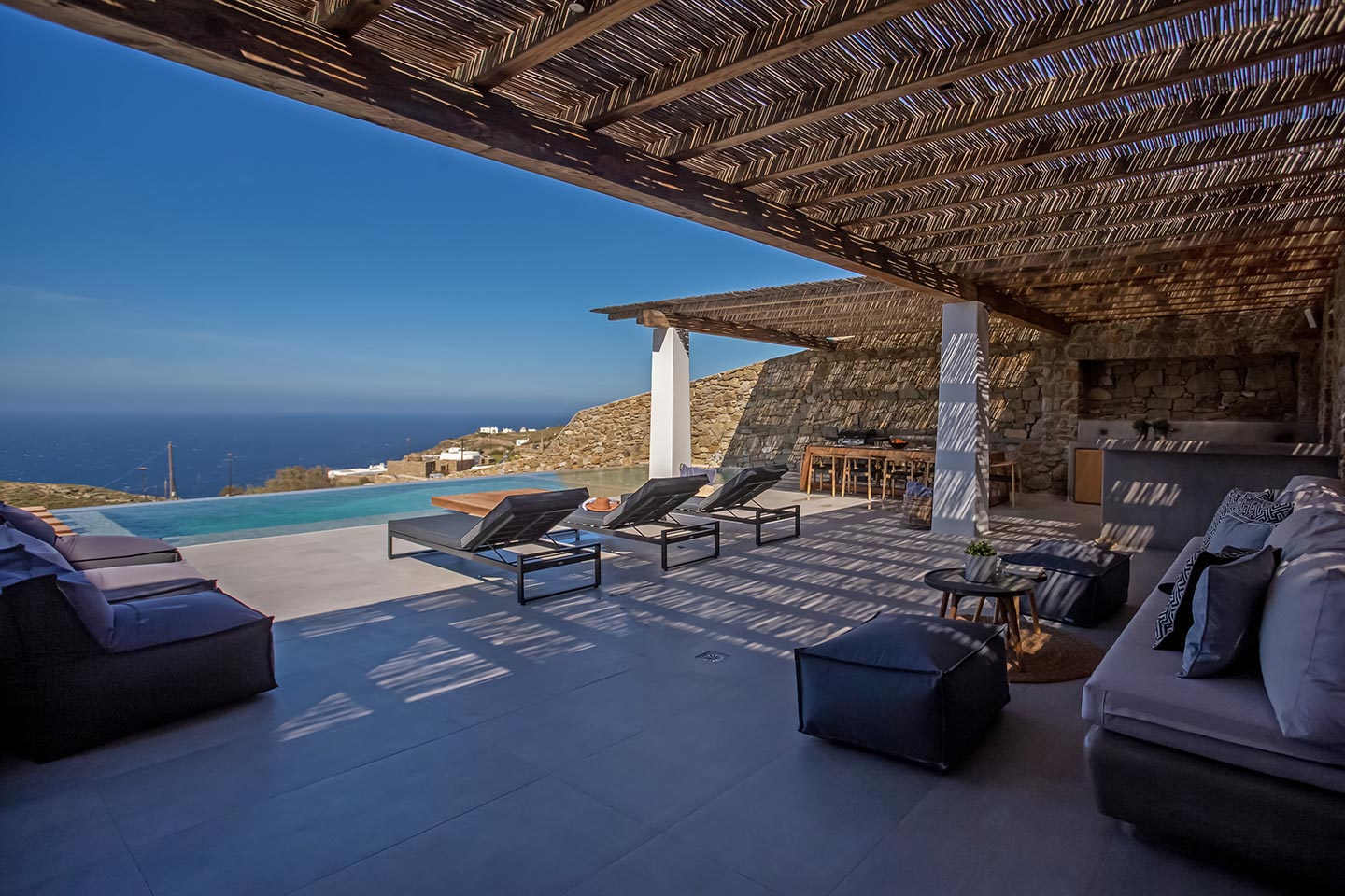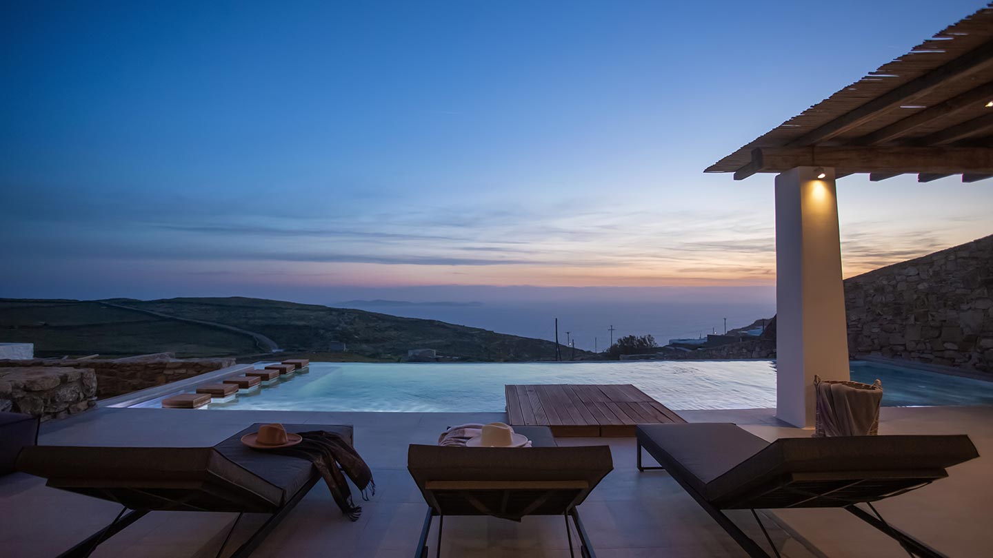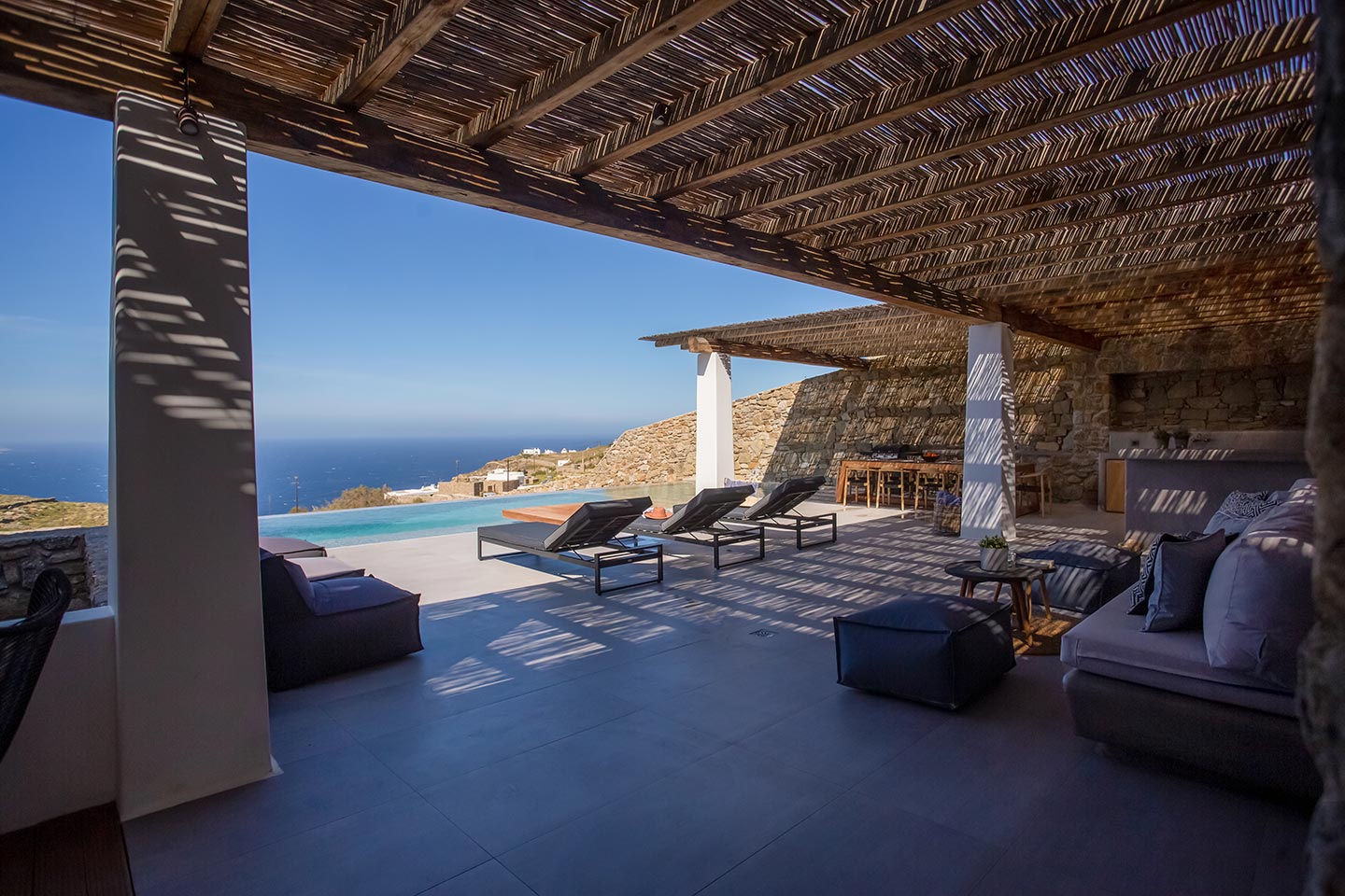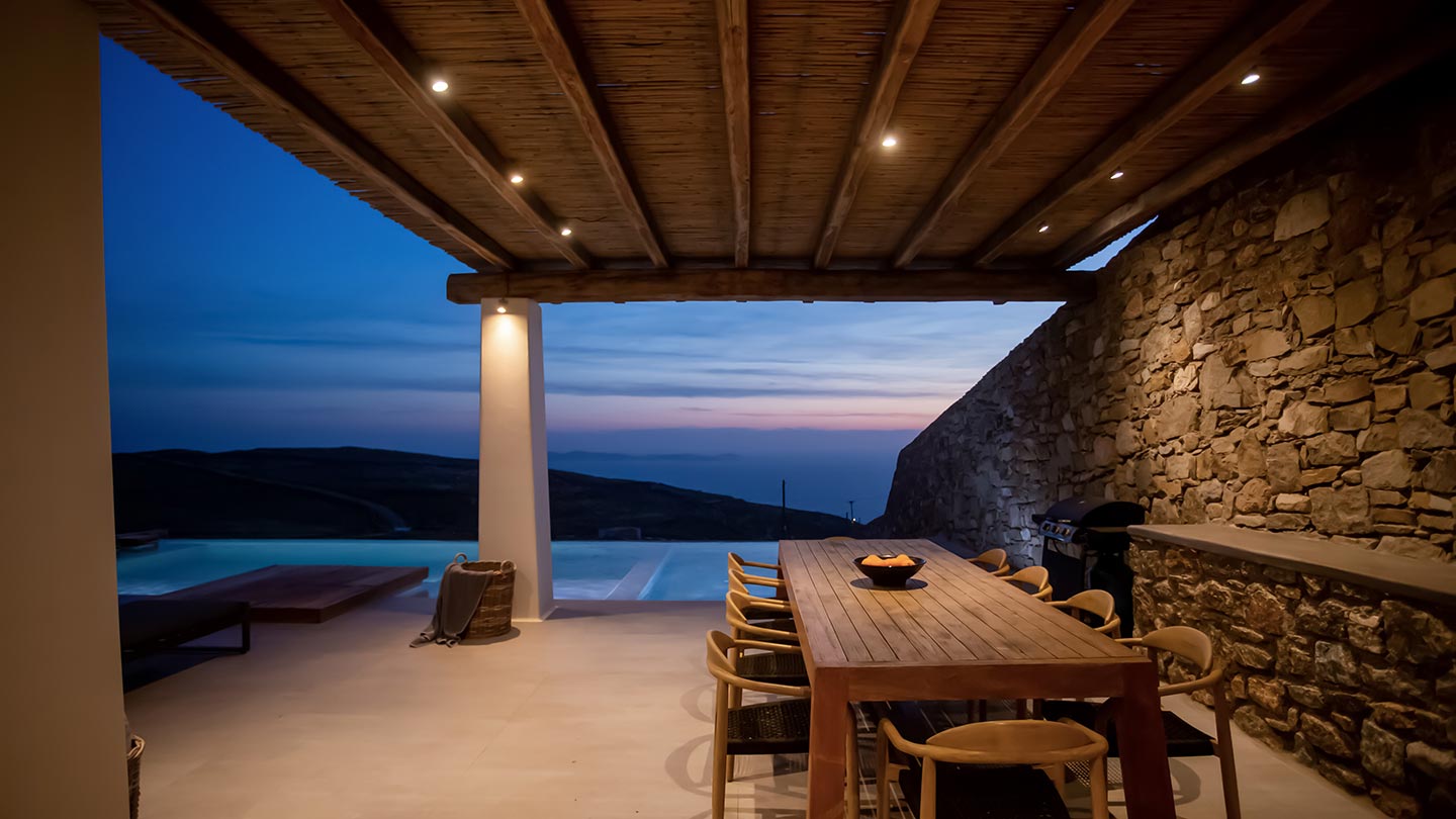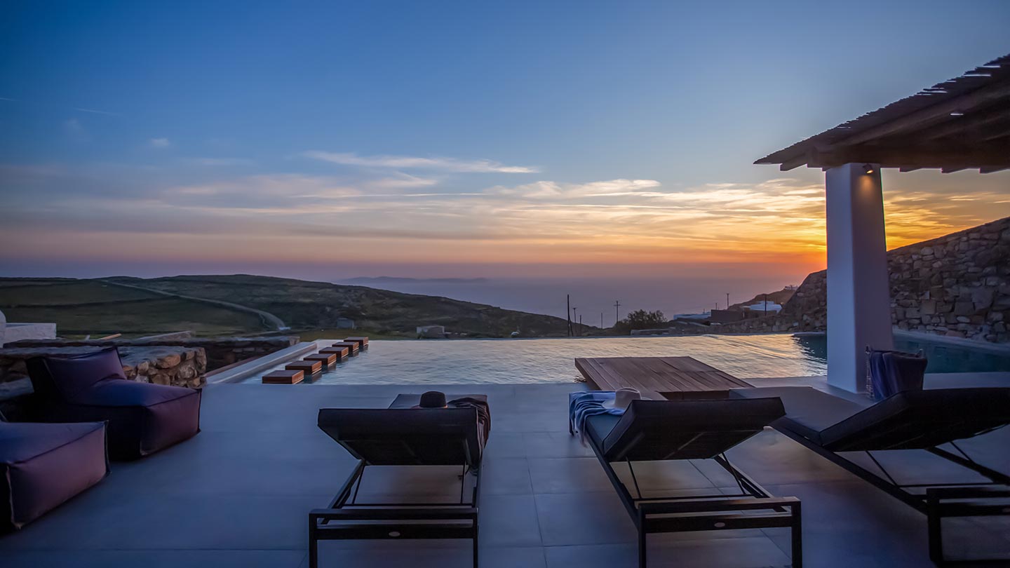 Outdoor living is the wow element of the villa ‘s concept. You can enjoy the pool, along with great sea views and same time BBQ or cook in the fully equipped secondary outdoor kitchen  and in the evening you can have cocktails in the bar, enjoying a glorious sunset. Both kitchens have stoves, fridge and dishwashers, as well as all basic utensils. The infinity pool is the center of the outdoor activities including separate low depth section, either for kids or for adults relaxing sun loungers for sunbathing and more. What’s an island for, if you do not see sea? Spectacular views to sea and close islands of Syros, Delos and the Aegean archipelago. Amazing sunset views!