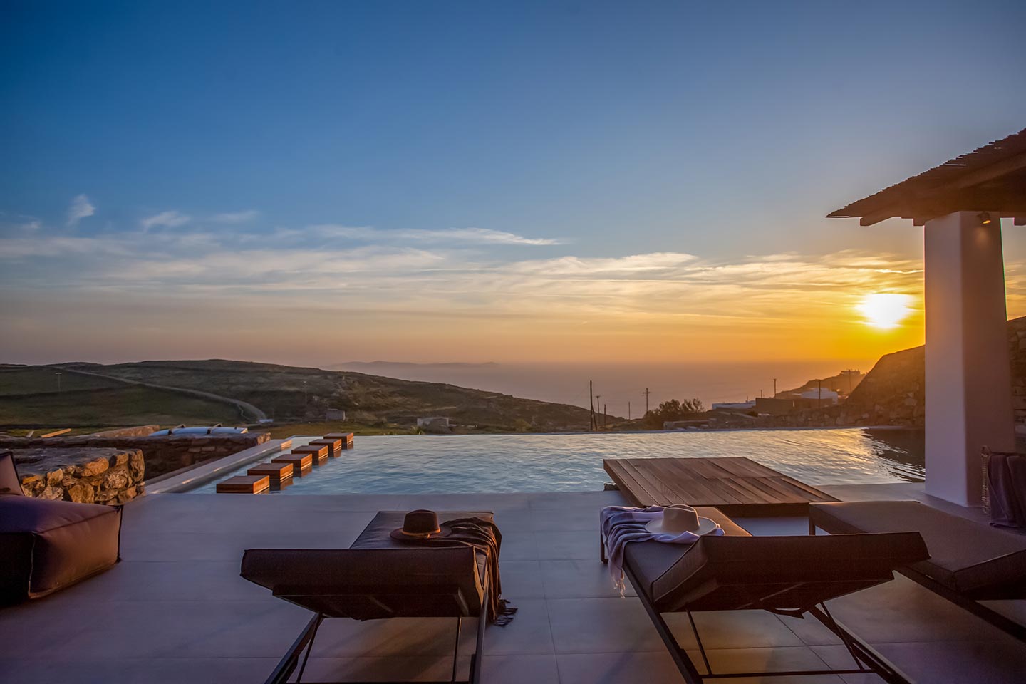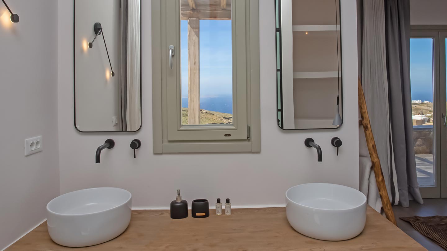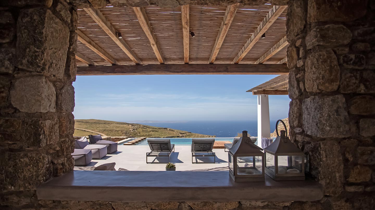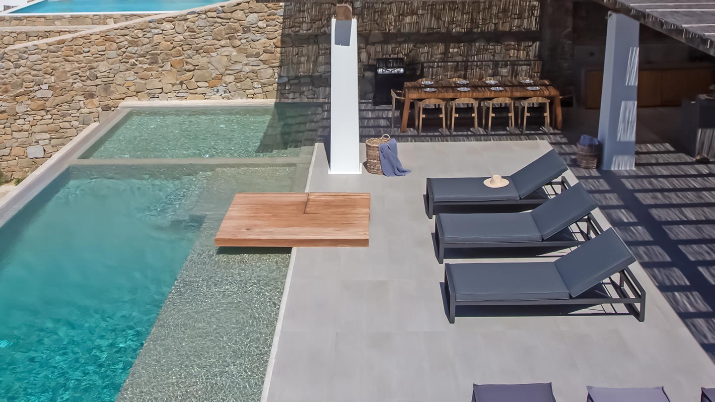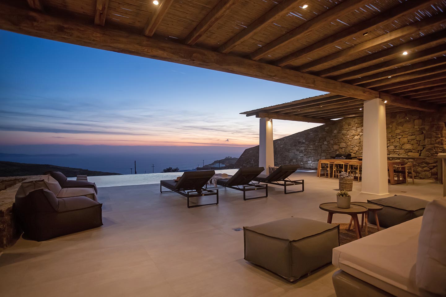 Outdoor living is the wow element of the villa ‘s concept. You can enjoy the pool, along with great sea views and same time BBQ or cook in the fully equipped secondary outdoor kitchen  and in the evening you can have cocktails in the bar, enjoying a glorious sunset. Both kitchens have stoves, fridge and dishwashers, as well as all basic utensils. The infinity pool is the center of the outdoor activities including separate low depth section, either for kids or for adults relaxing sun loungers for sunbathing and more. What’s an island for, if you do not see sea? Spectacular views to sea and close islands of Syros, Delos and the Aegean archipelago. Amazing sunset views!
