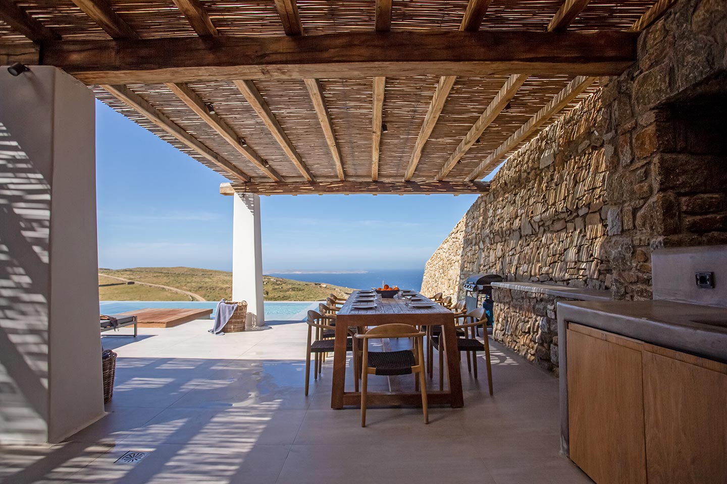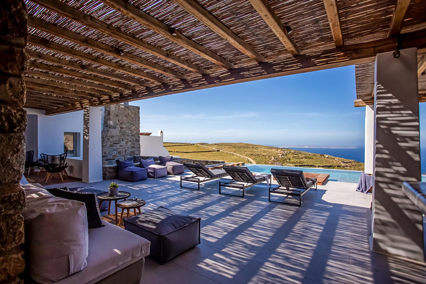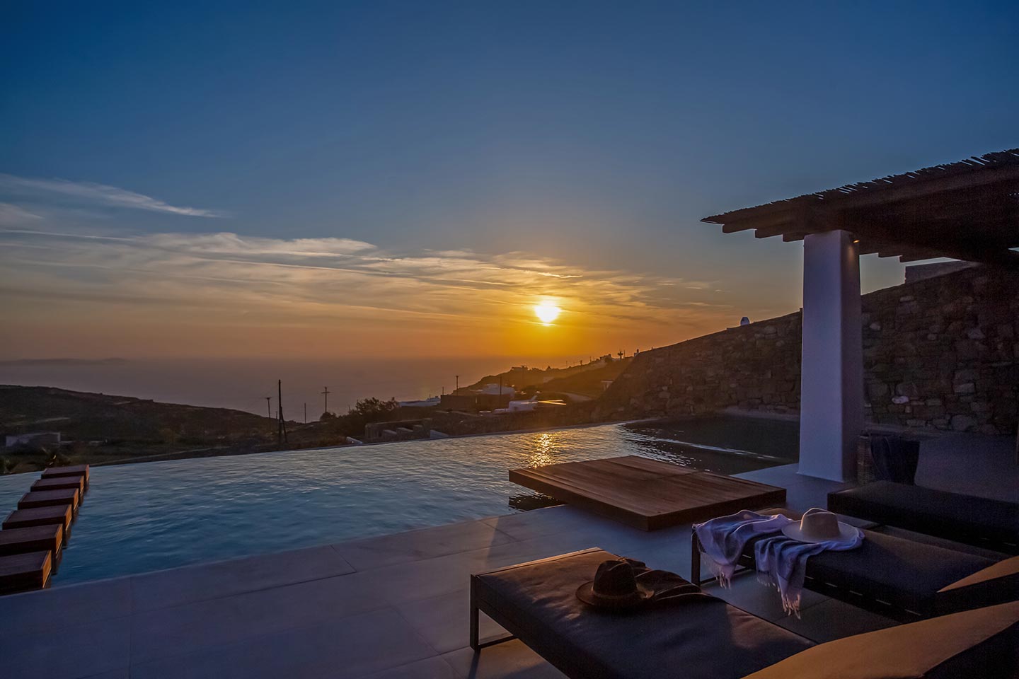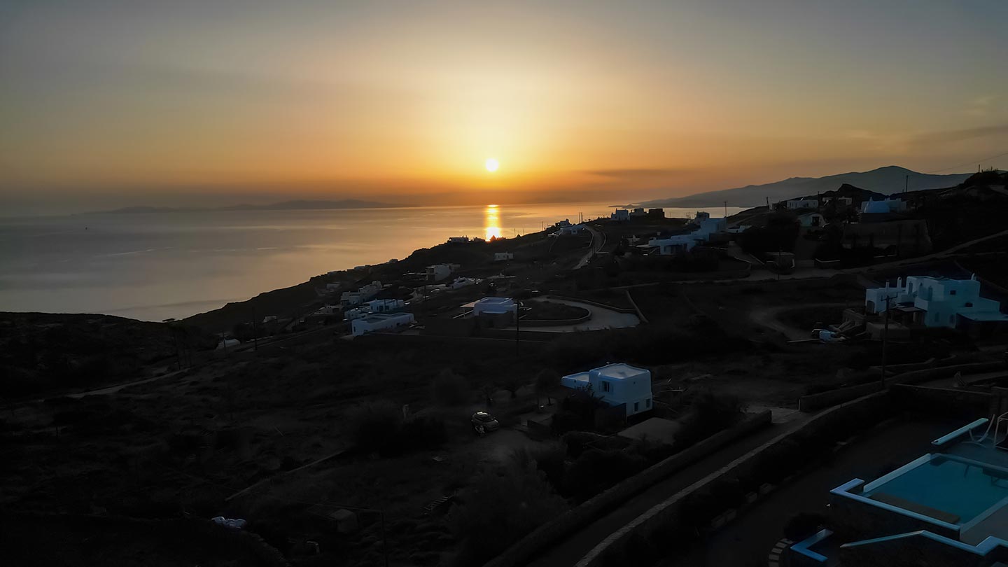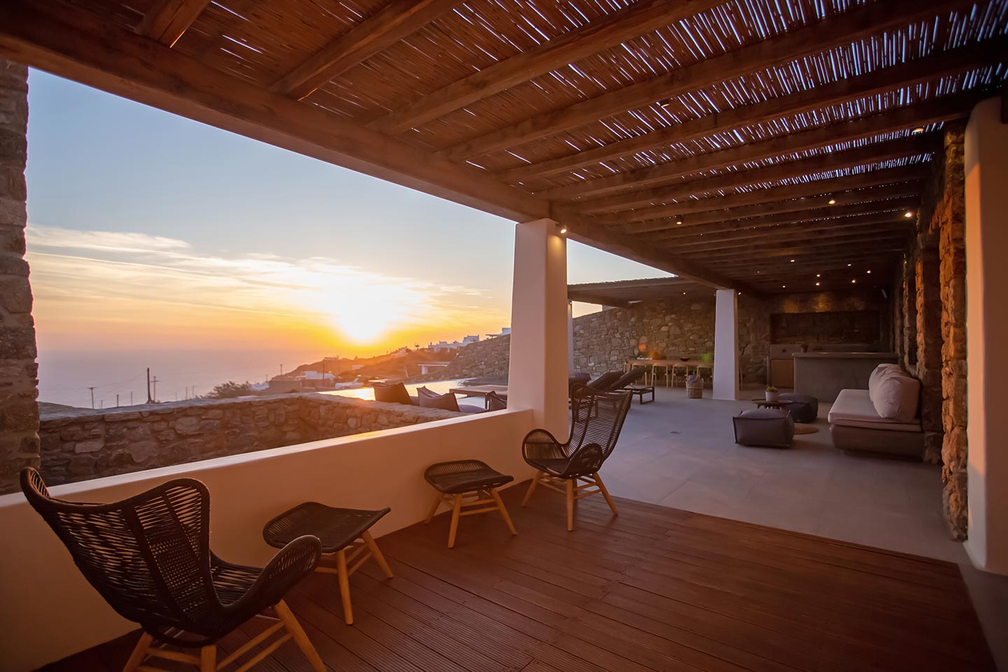 Outdoor living is the wow element of the villa ‘s concept. You can enjoy the pool, along with great sea views and same time BBQ or cook in the fully equipped secondary outdoor kitchen  and in the evening you can have cocktails in the bar, enjoying a glorious sunset. Both kitchens have stoves, fridge and dishwashers, as well as all basic utensils. The infinity pool is the center of the outdoor activities including separate low depth section, either for kids or for adults relaxing sun loungers for sunbathing and more. What’s an island for, if you do not see sea? Spectacular views to sea and close islands of Syros, Delos and the Aegean archipelago. Amazing sunset views!