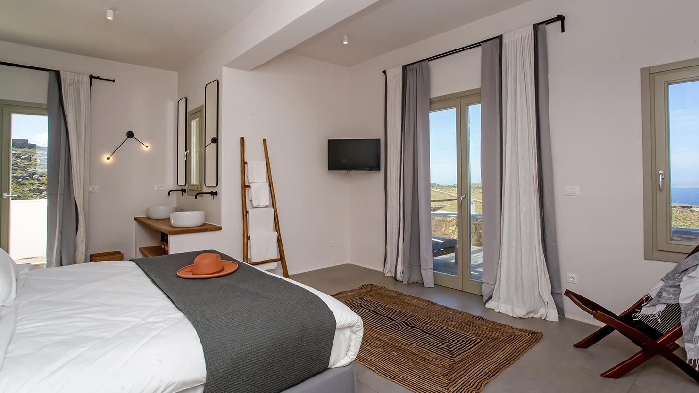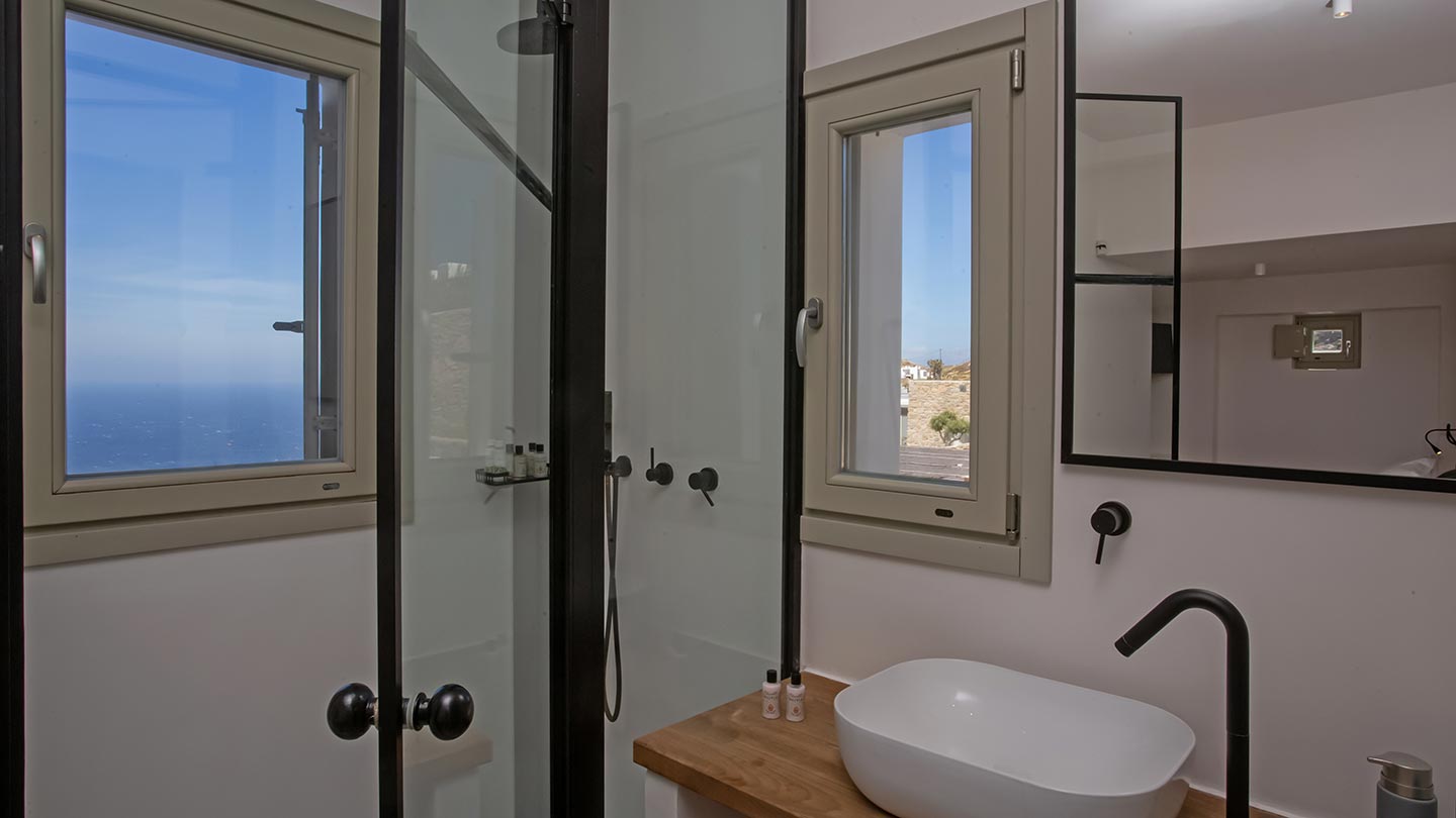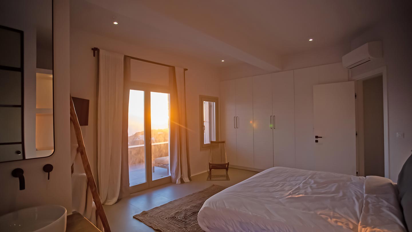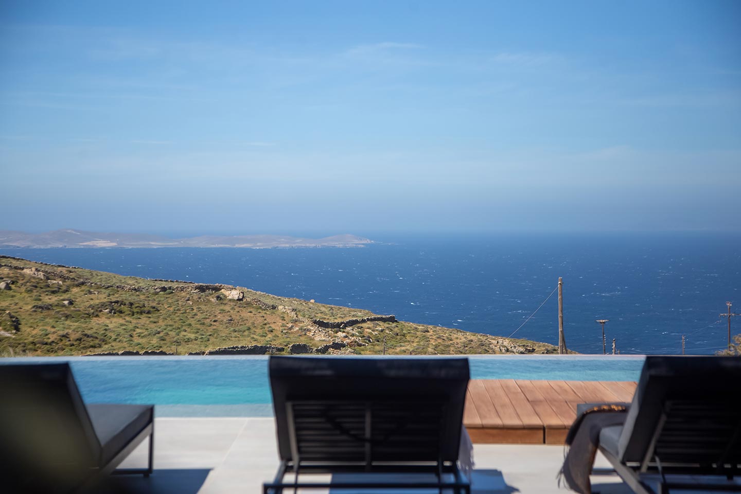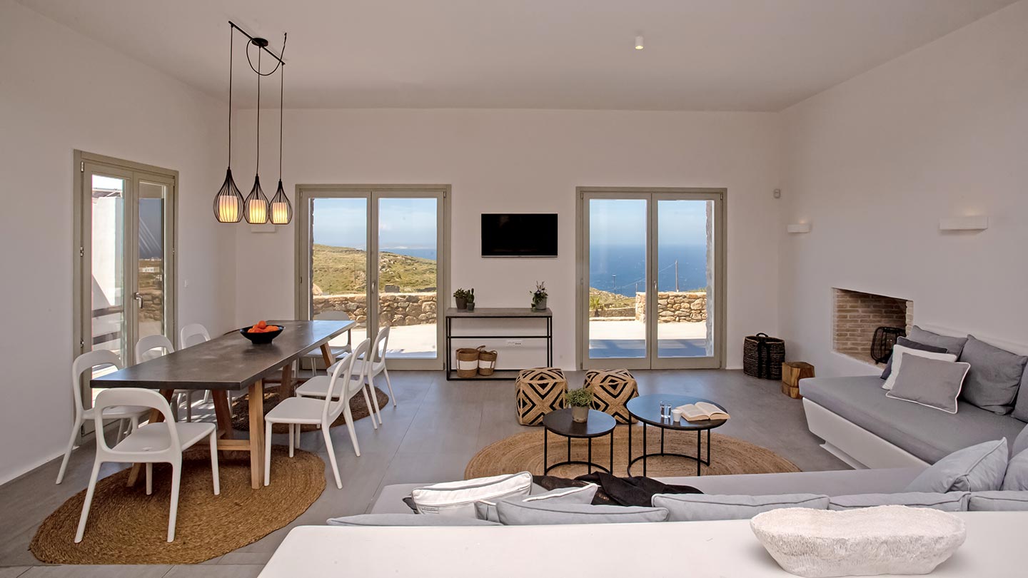 Outdoor living is the wow element of the villa ‘s concept. You can enjoy the pool, along with great sea views and same time BBQ or cook in the fully equipped secondary outdoor kitchen  and in the evening you can have cocktails in the bar, enjoying a glorious sunset. Both kitchens have stoves, fridge and dishwashers, as well as all basic utensils. The infinity pool is the center of the outdoor activities including separate low depth section, either for kids or for adults relaxing sun loungers for sunbathing and more. What’s an island for, if you do not see sea? Spectacular views to sea and close islands of Syros, Delos and the Aegean archipelago. Amazing sunset views!