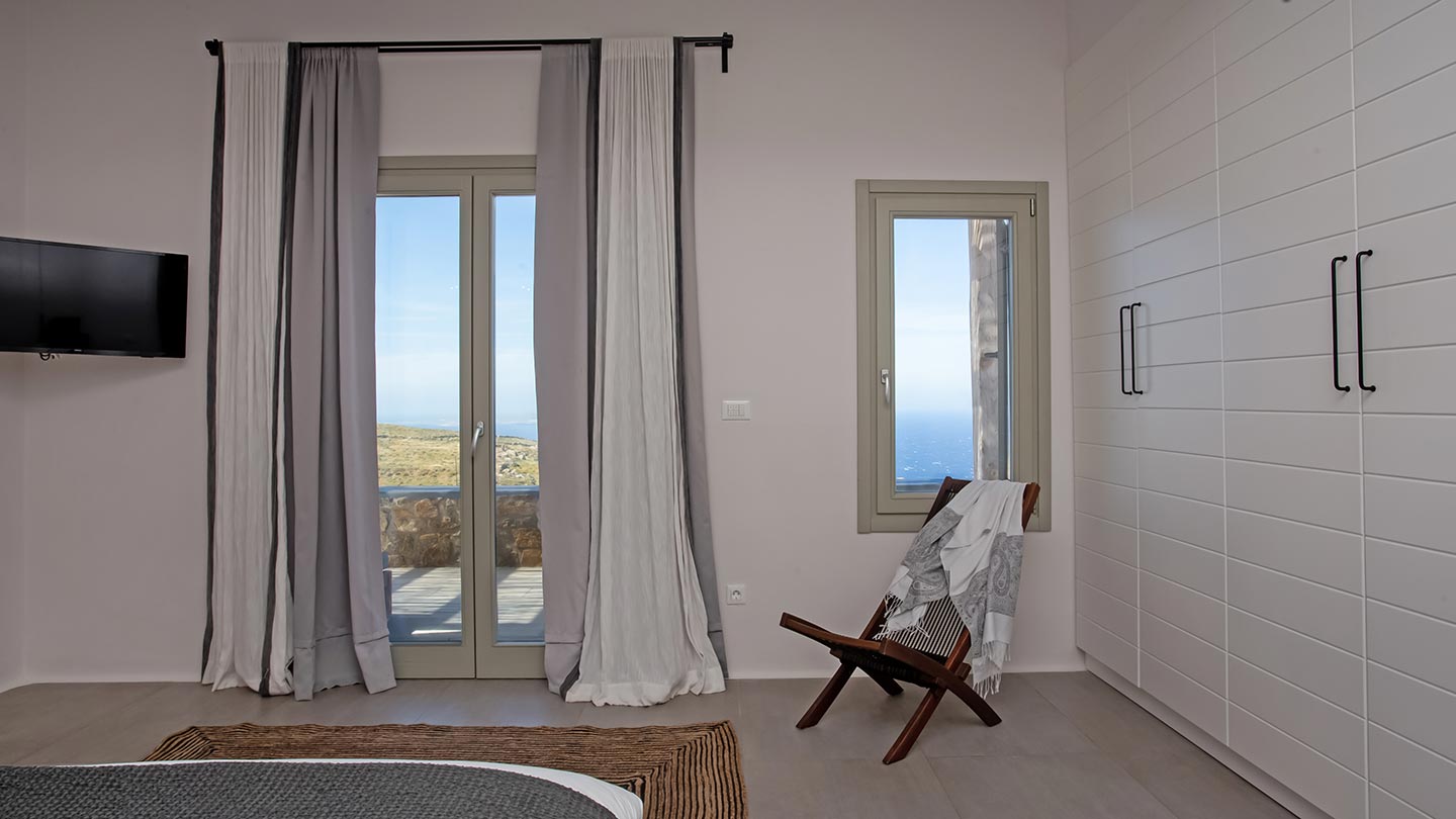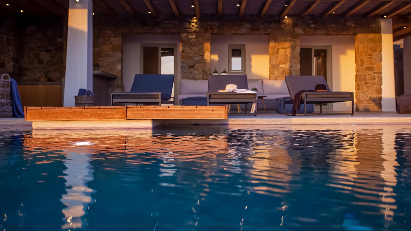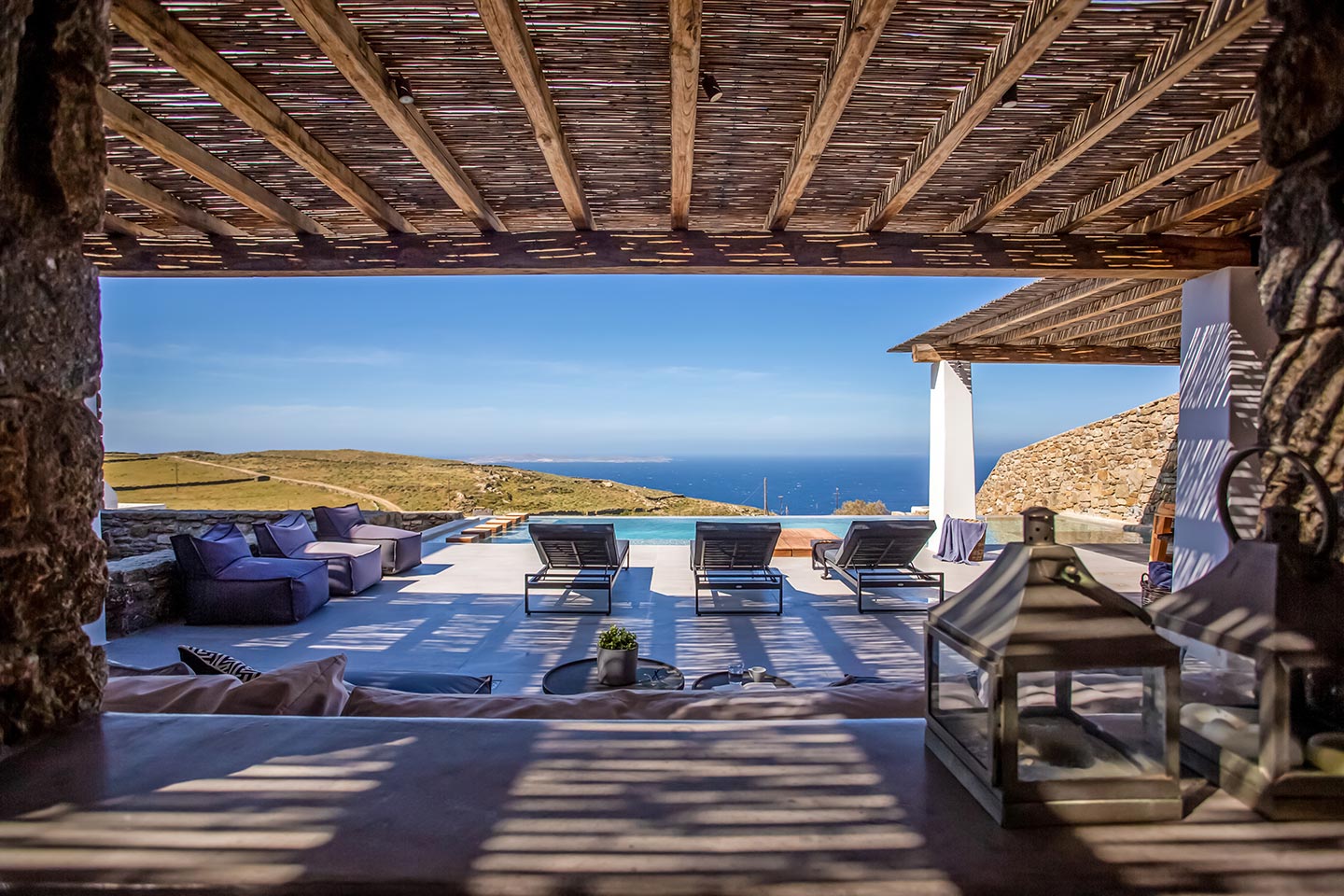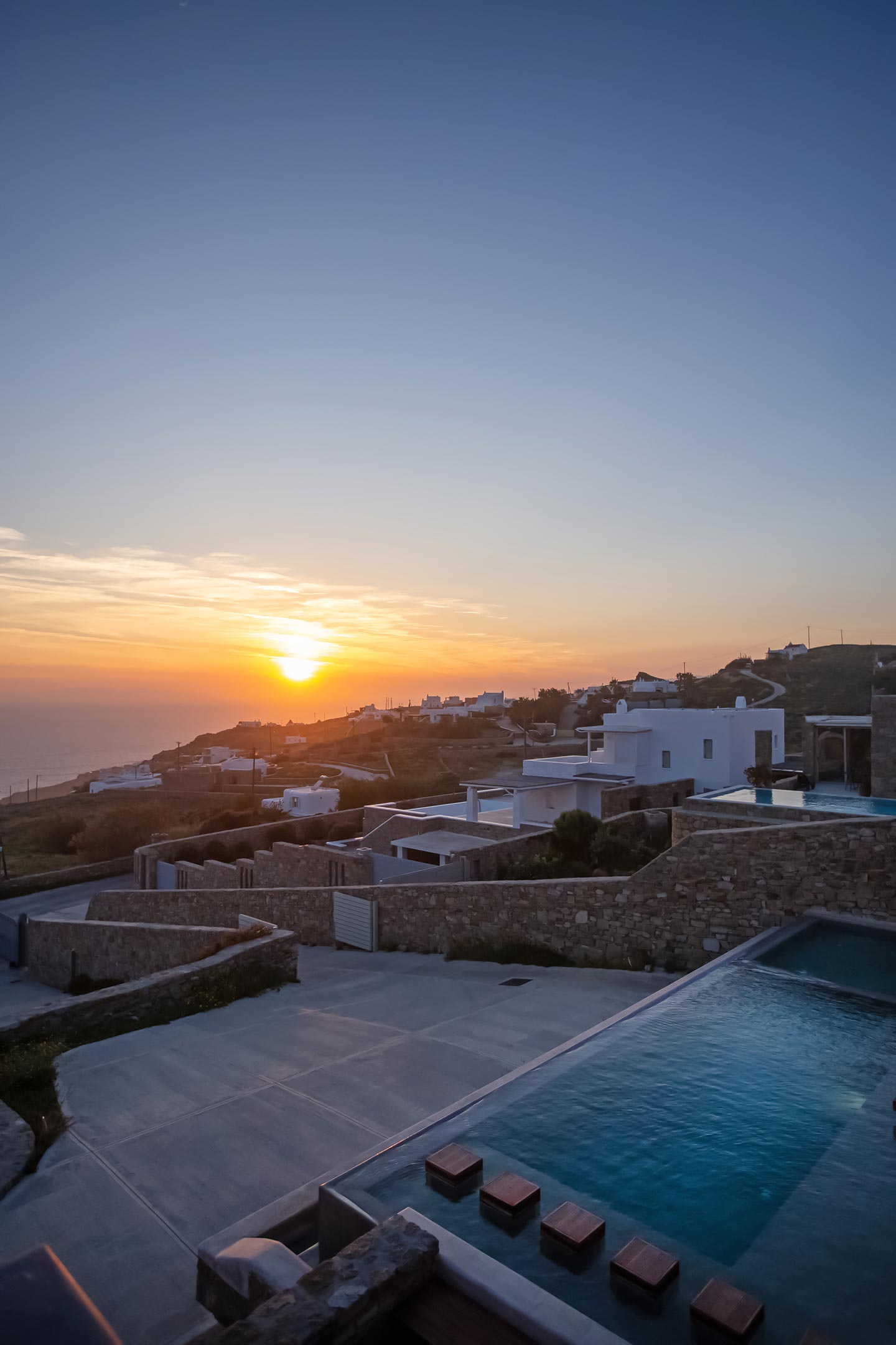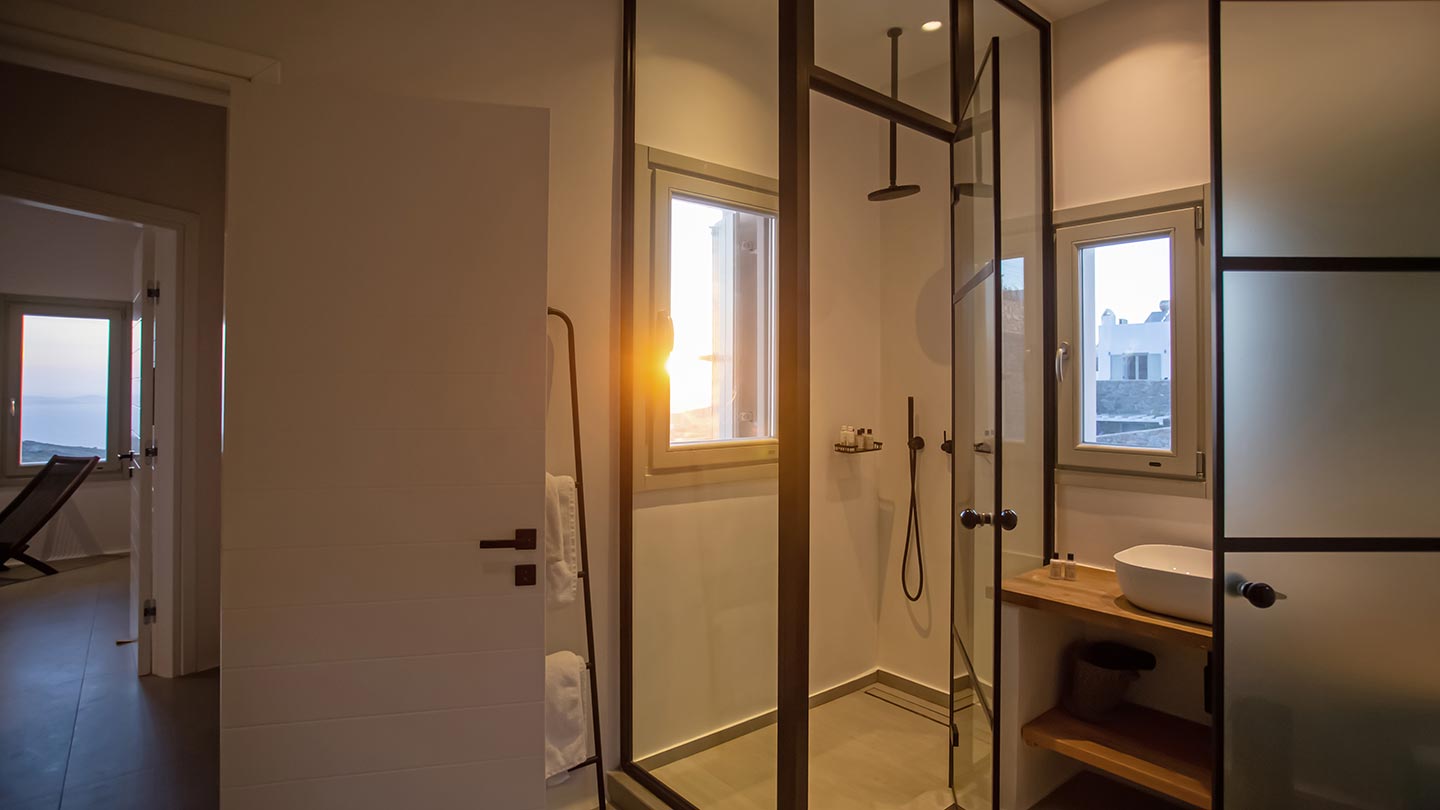 Outdoor living is the wow element of the villa ‘s concept. You can enjoy the pool, along with great sea views and same time BBQ or cook in the fully equipped secondary outdoor kitchen  and in the evening you can have cocktails in the bar, enjoying a glorious sunset. Both kitchens have stoves, fridge and dishwashers, as well as all basic utensils. The infinity pool is the center of the outdoor activities including separate low depth section, either for kids or for adults relaxing sun loungers for sunbathing and more. What’s an island for, if you do not see sea? Spectacular views to sea and close islands of Syros, Delos and the Aegean archipelago. Amazing sunset views!