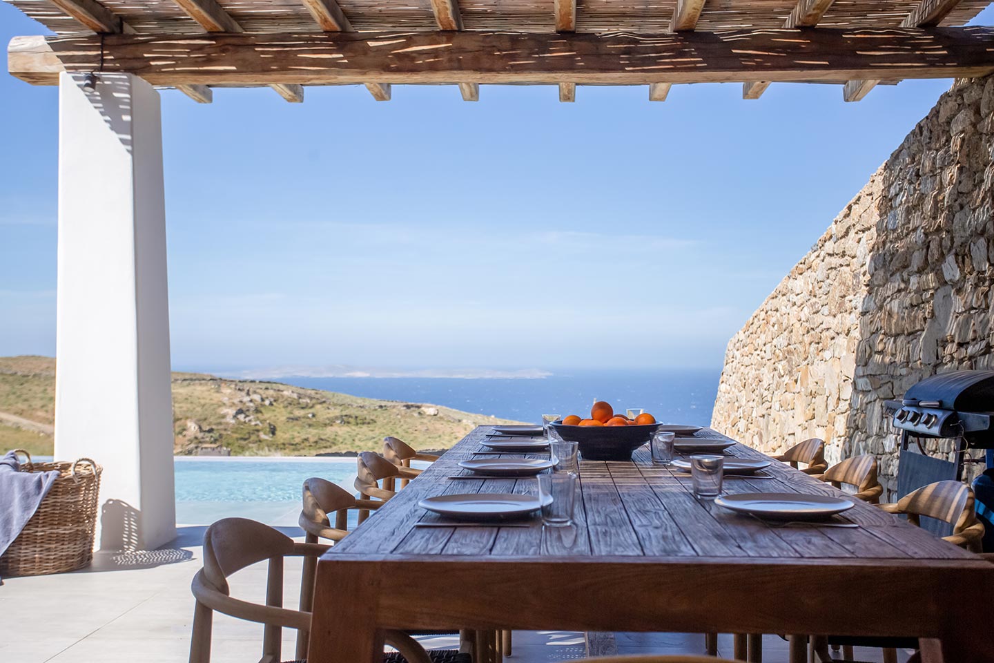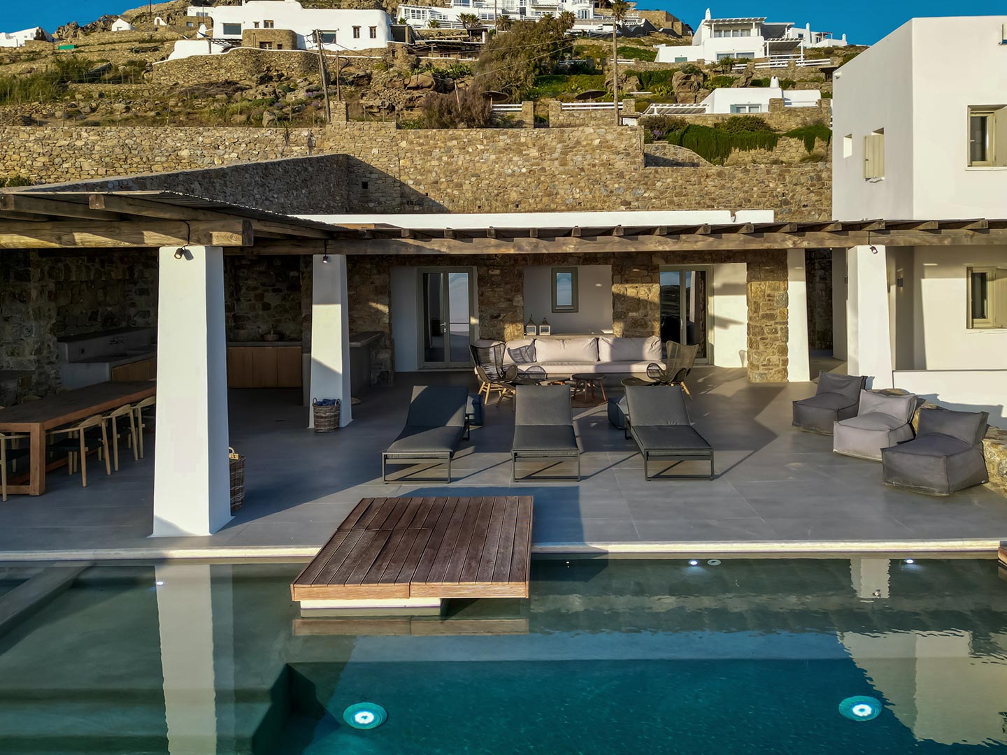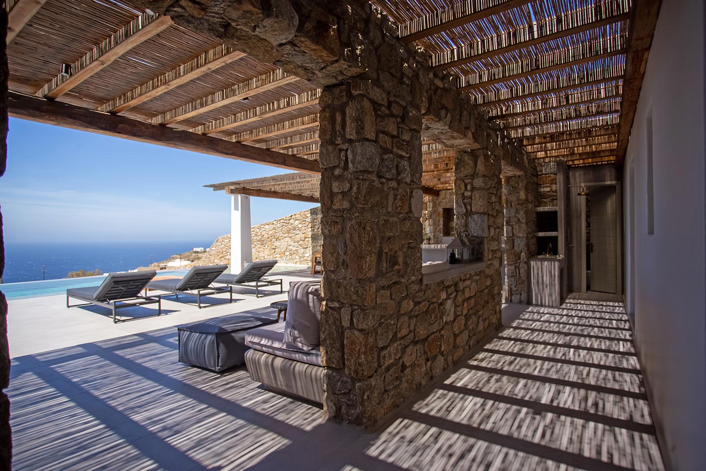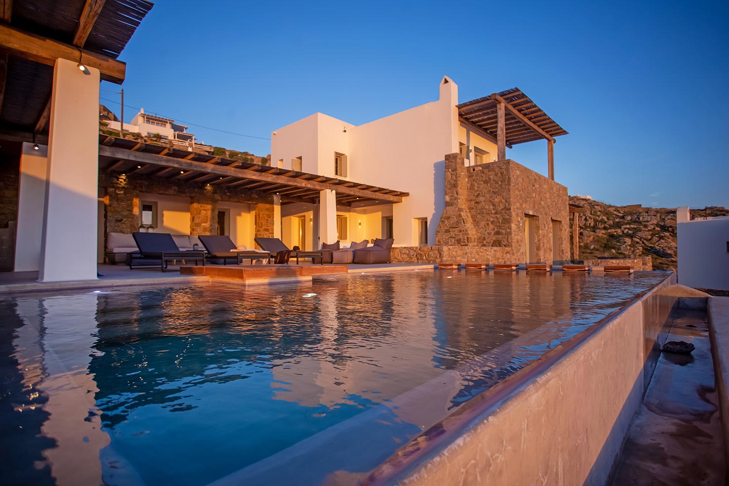 Outdoor living is the wow element of the villa ‘s concept. You can enjoy the pool, along with great sea views and same time BBQ or cook in the fully equipped secondary outdoor kitchen  and in the evening you can have cocktails in the bar, enjoying a glorious sunset. Both kitchens have stoves, fridge and dishwashers, as well as all basic utensils. The infinity pool is the center of the outdoor activities including separate low depth section, either for kids or for adults relaxing sun loungers for sunbathing and more. What’s an island for, if you do not see sea? Spectacular views to sea and close islands of Syros, Delos and the Aegean archipelago. Amazing sunset views!