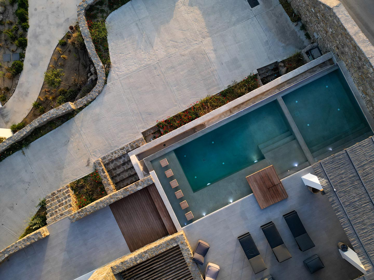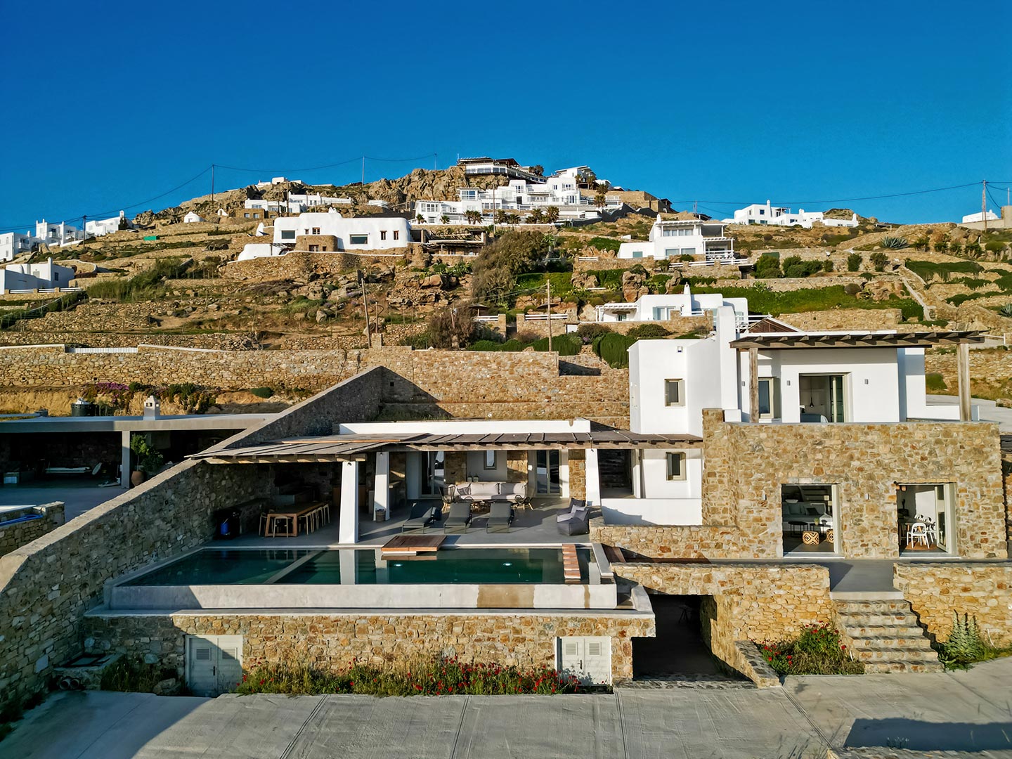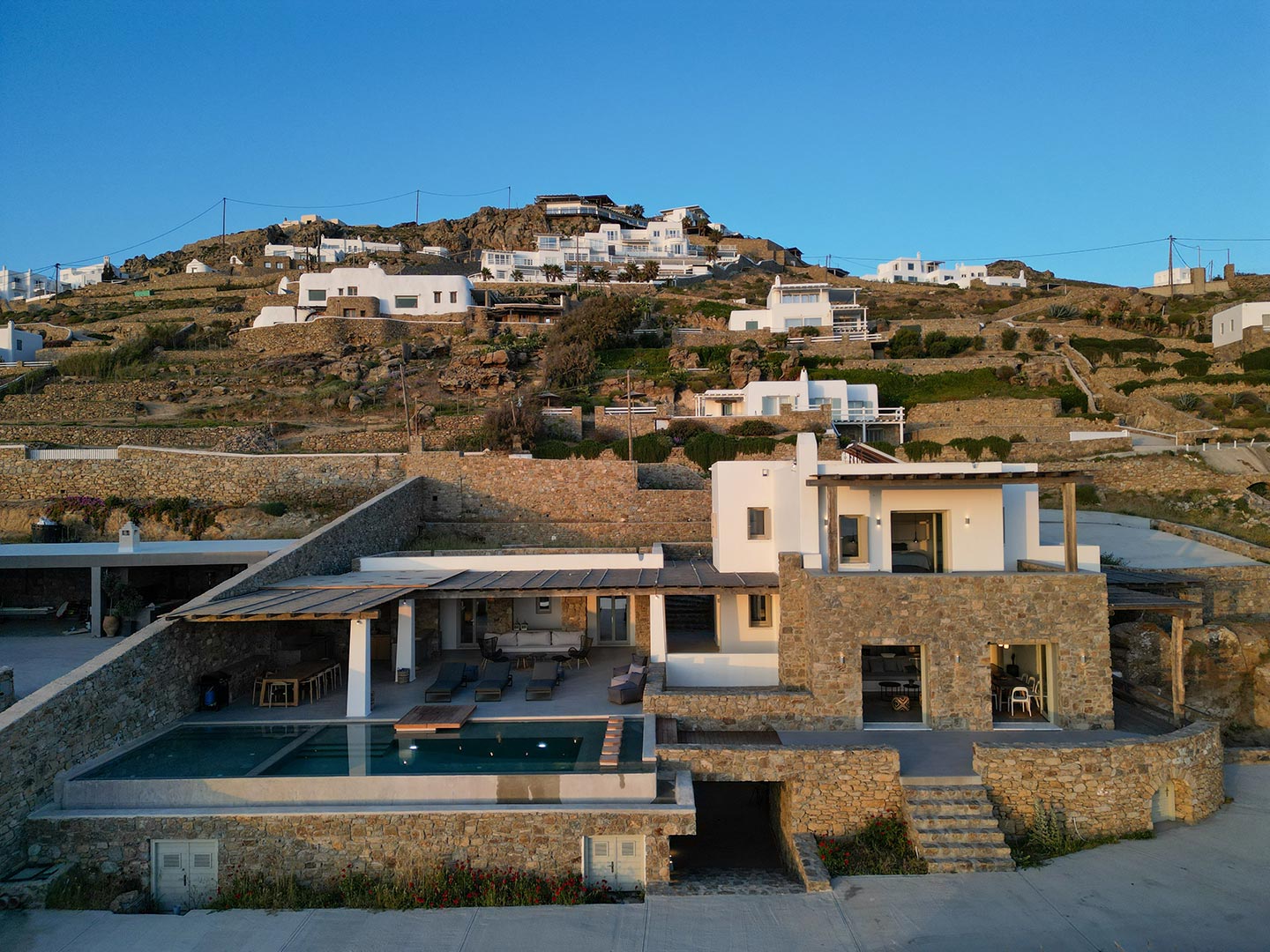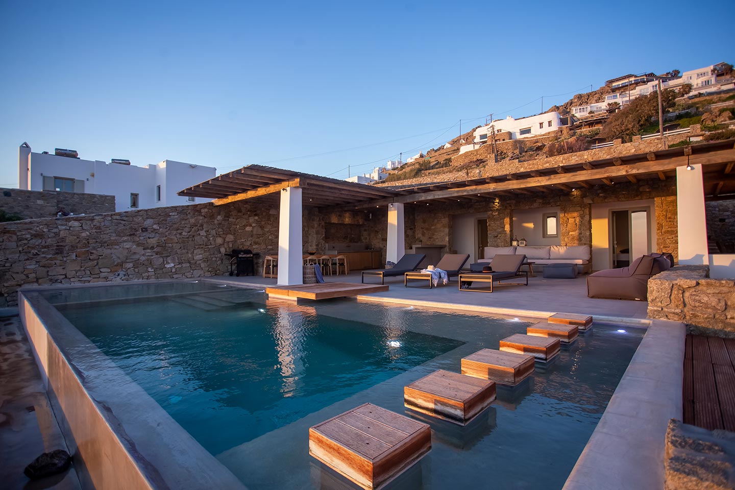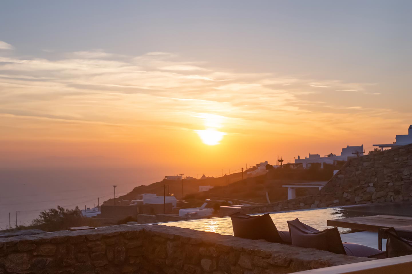 Outdoor living is the wow element of the villa ‘s concept. You can enjoy the pool, along with great sea views and same time BBQ or cook in the fully equipped secondary outdoor kitchen  and in the evening you can have cocktails in the bar, enjoying a glorious sunset. Both kitchens have stoves, fridge and dishwashers, as well as all basic utensils. The infinity pool is the center of the outdoor activities including separate low depth section, either for kids or for adults relaxing sun loungers for sunbathing and more. What’s an island for, if you do not see sea? Spectacular views to sea and close islands of Syros, Delos and the Aegean archipelago. Amazing sunset views!