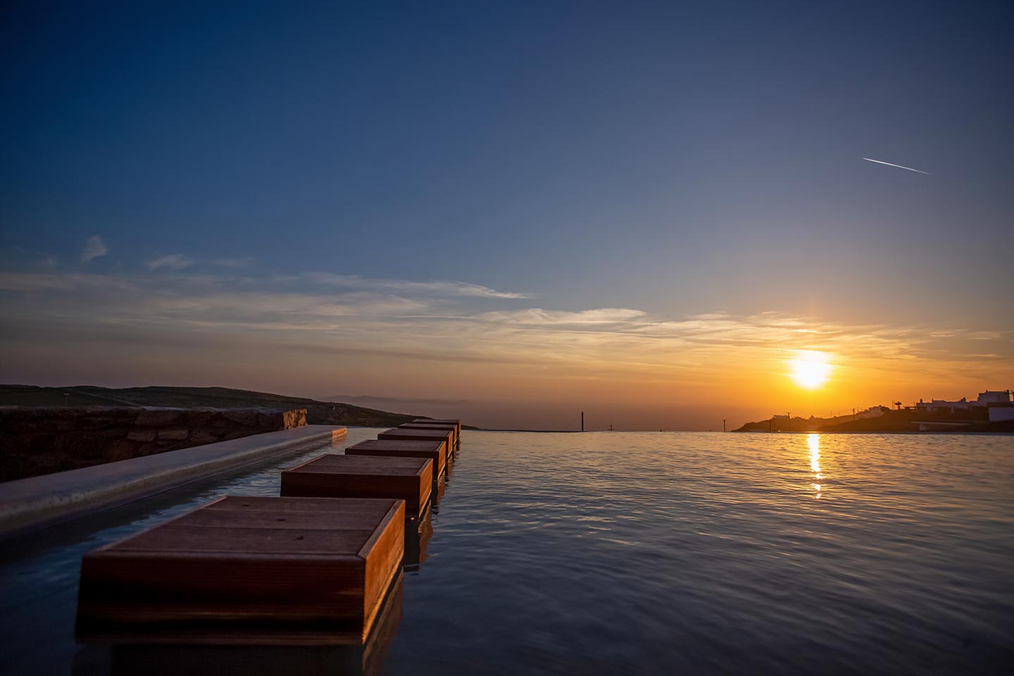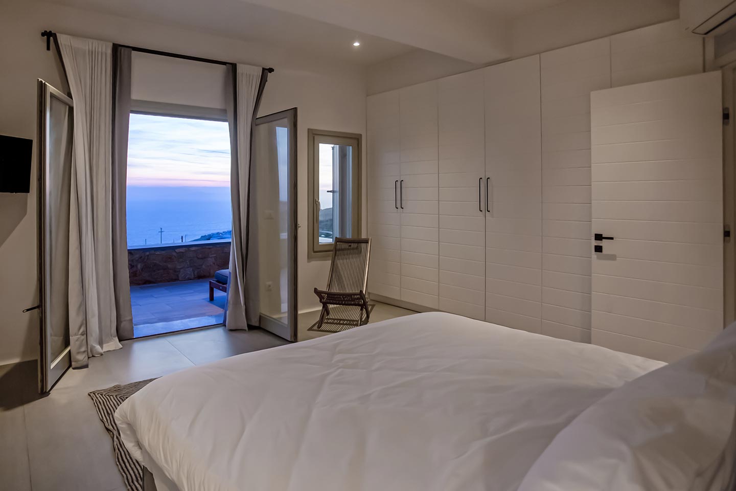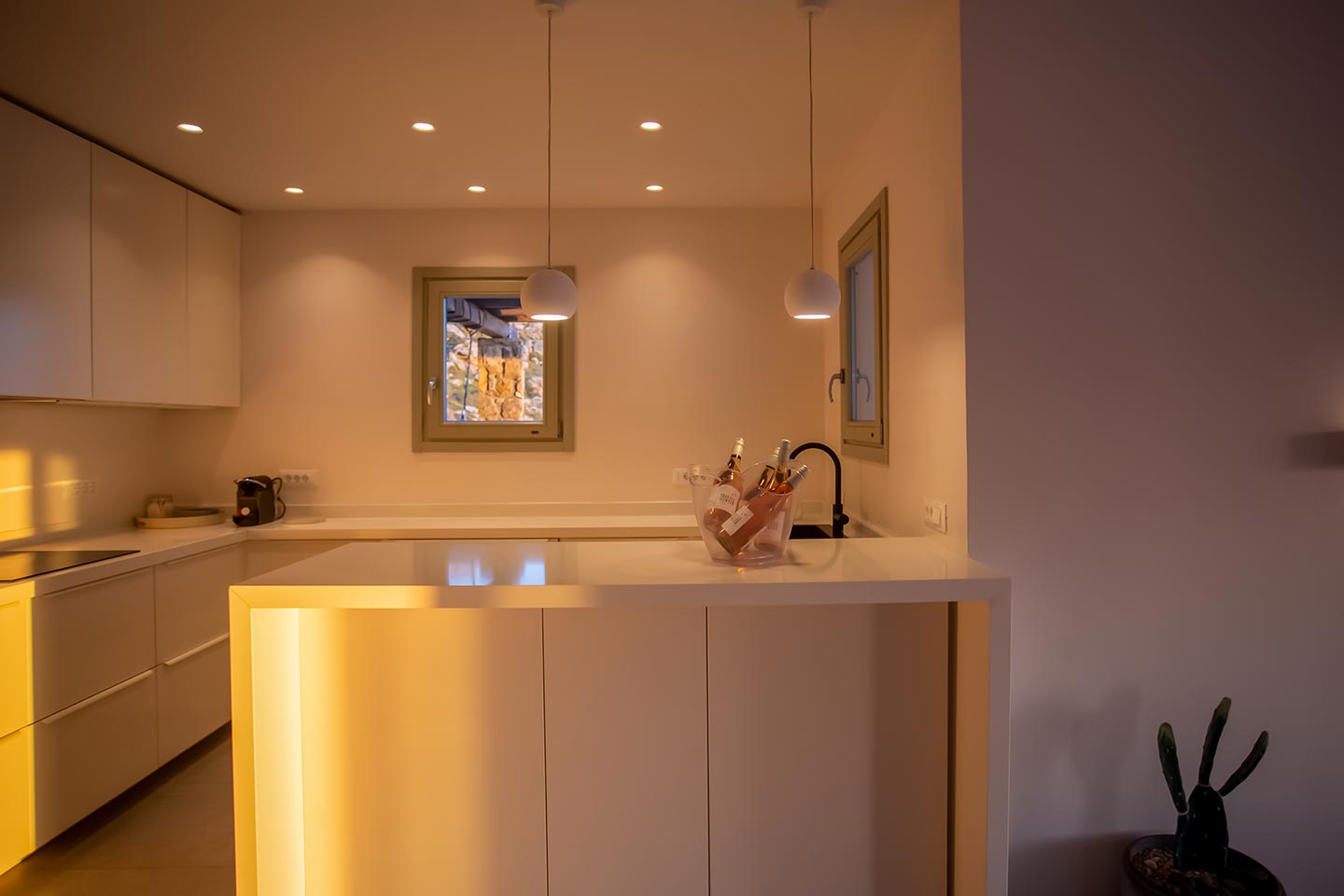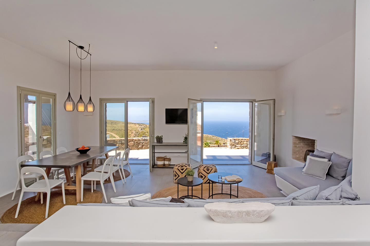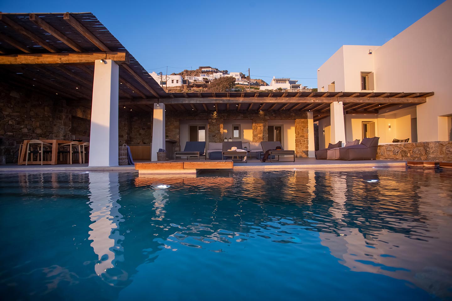 Outdoor living is the wow element of the villa ‘s concept. You can enjoy the pool, along with great sea views and same time BBQ or cook in the fully equipped secondary outdoor kitchen  and in the evening you can have cocktails in the bar, enjoying a glorious sunset. Both kitchens have stoves, fridge and dishwashers, as well as all basic utensils. The infinity pool is the center of the outdoor activities including separate low depth section, either for kids or for adults relaxing sun loungers for sunbathing and more. What’s an island for, if you do not see sea? Spectacular views to sea and close islands of Syros, Delos and the Aegean archipelago. Amazing sunset views!