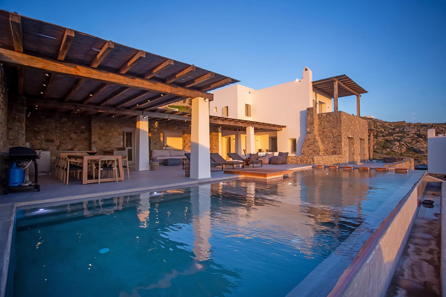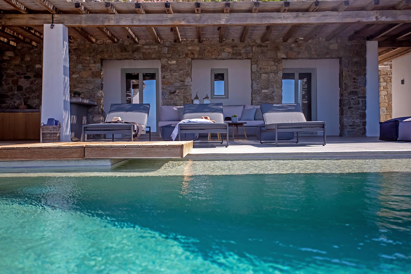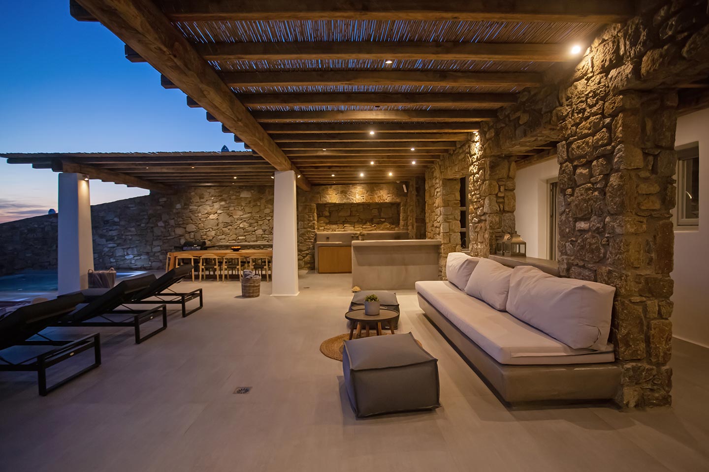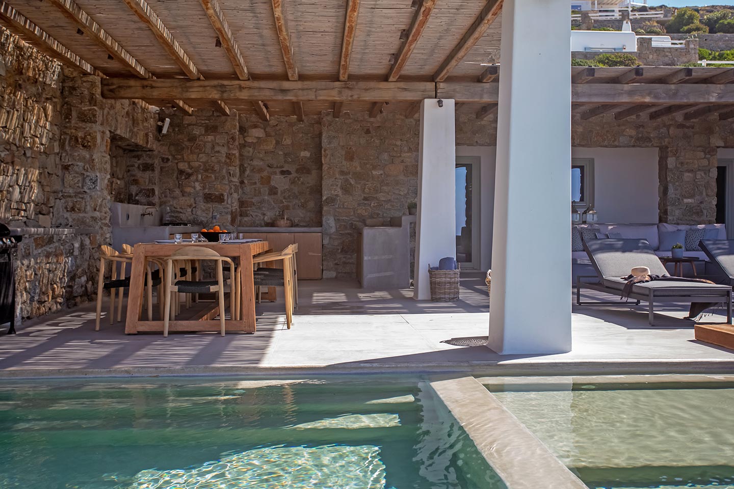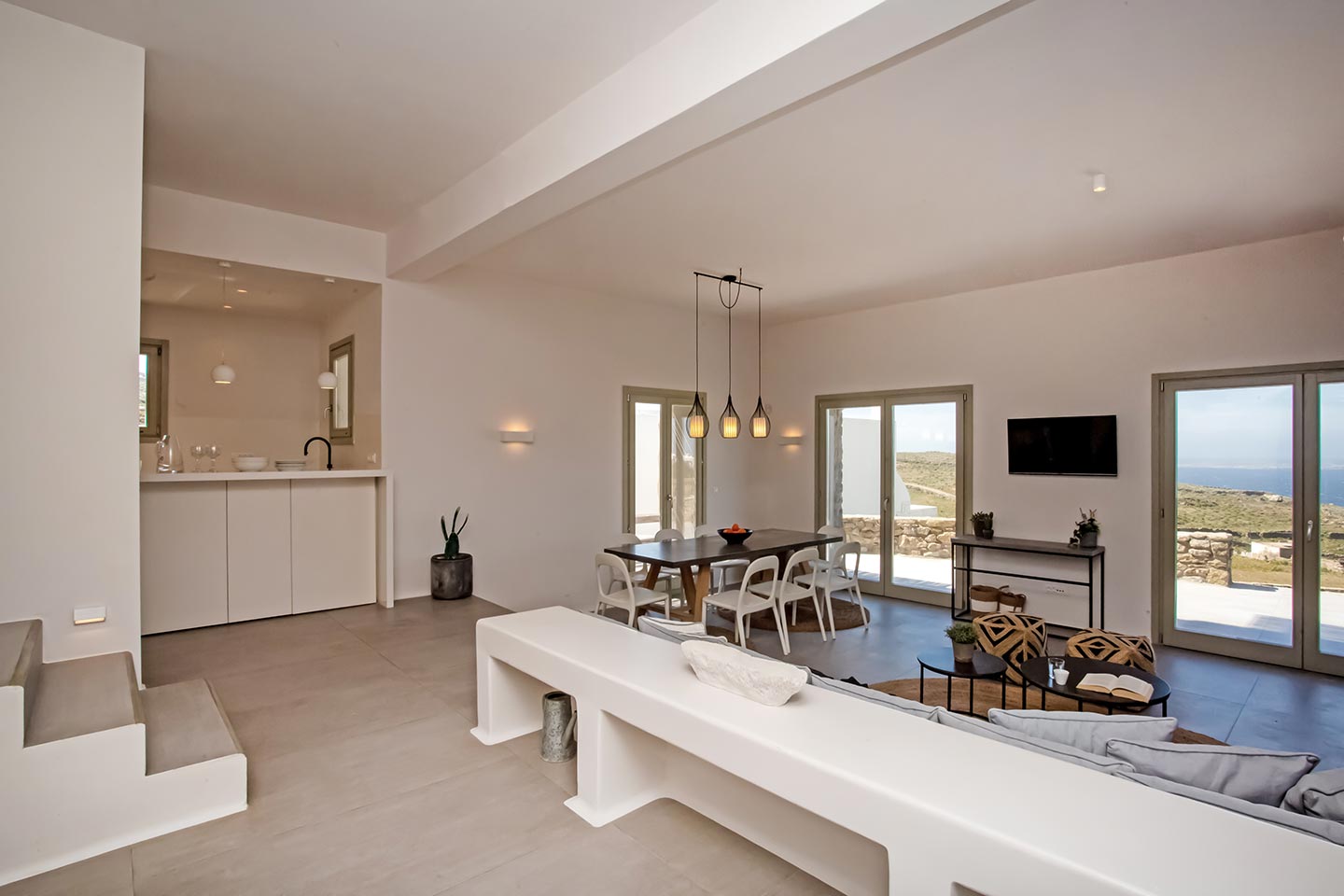 Here is the place, where you can feel a relaxed elegance and discreet luxury. There is a positive aura from morning till late night, all times of the day, you can enjoy a different aspect - view - feeling of it. Sophisticated, minimal, contemporary , luxurious and stylish but also respecting local culture and architecture. Designed with relaxed elegance, to serve a family as well as a big group of friends, with focus in functionality. Less is more.