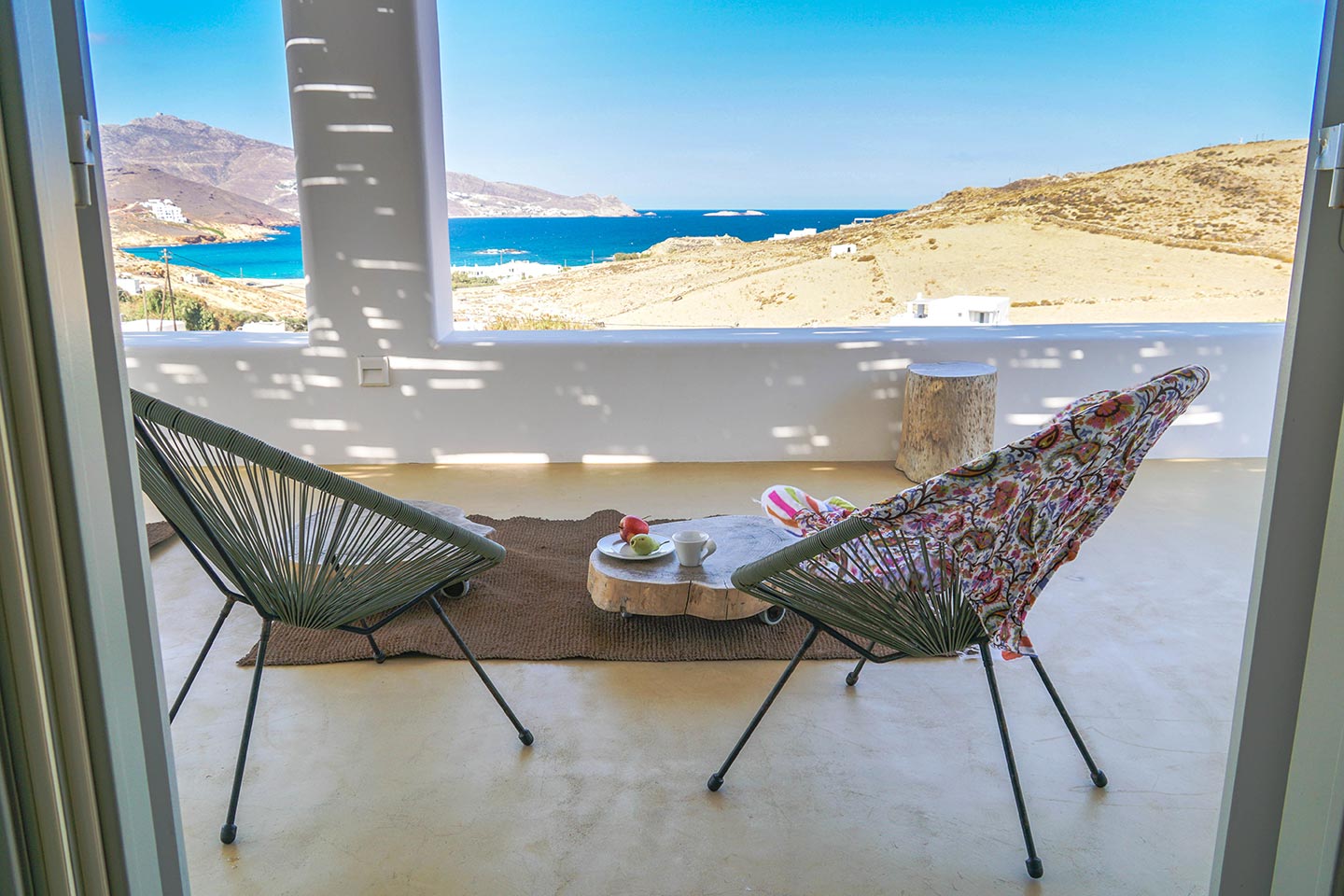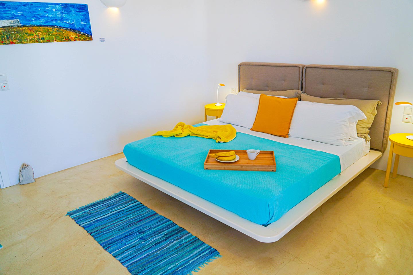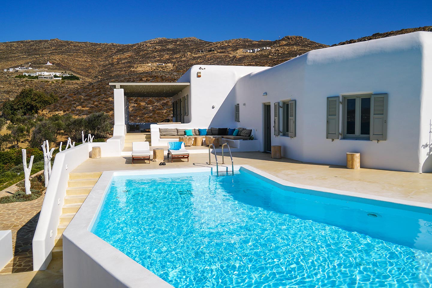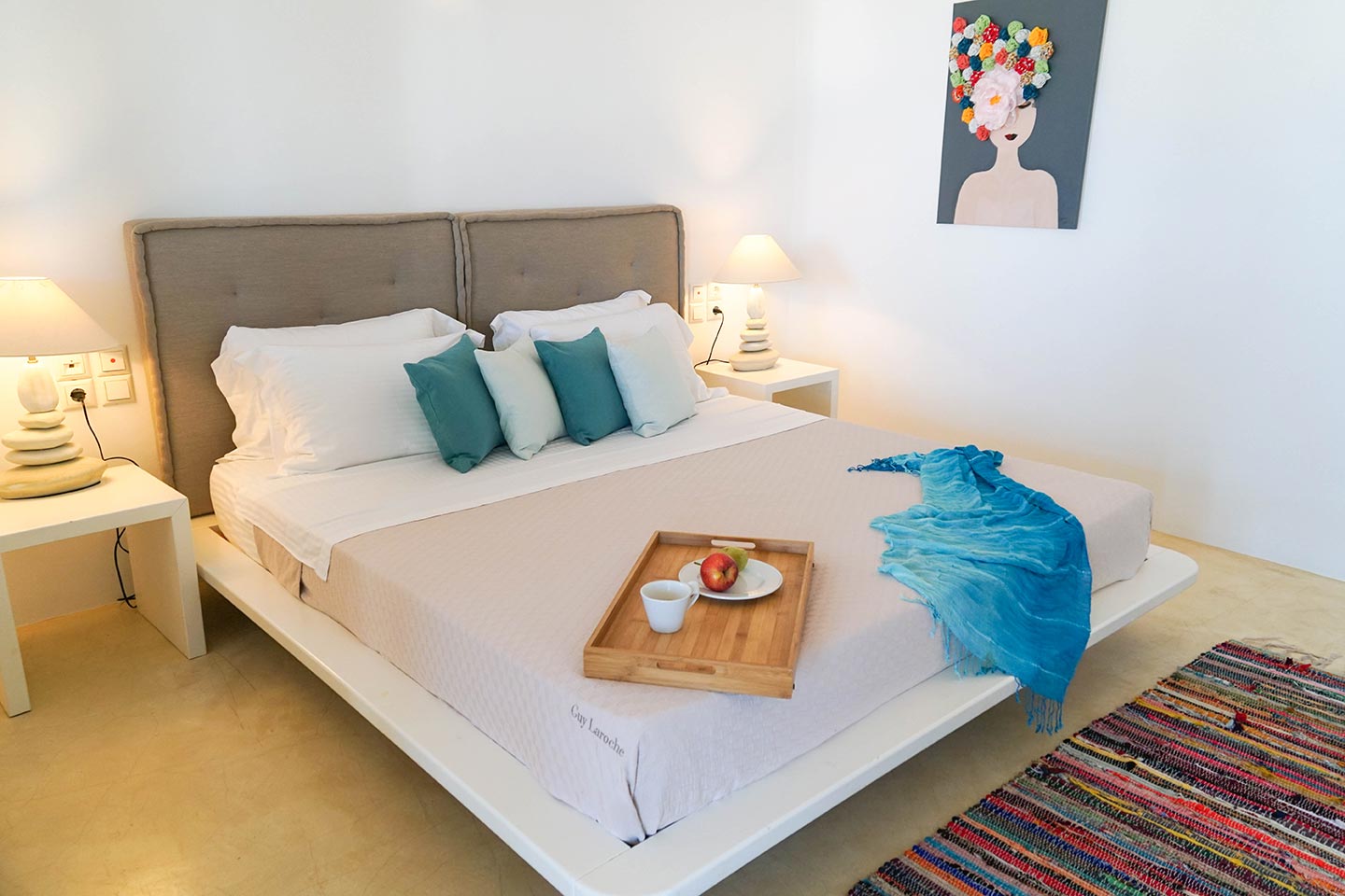 Later on during the evening guests can simply relax and enjoy the serenity this luxury villa rental in Mykonos offers, gazing at the sea and stars in any one of the four available outside sitting areas.The villa is located at a distance of 2 km from the picturesque Ano Mera, 6 km from the sizzling nightlife of Mykonos and 4 km from the beaches of Elia, Kalafatis and Kalo Livadi. Ftelia Boheme is in the middle of the Mykonian universe and 1 km from Alemagou restaurant.