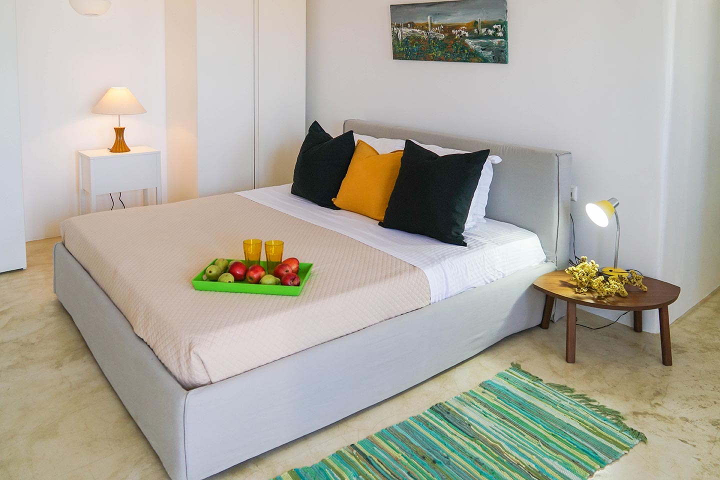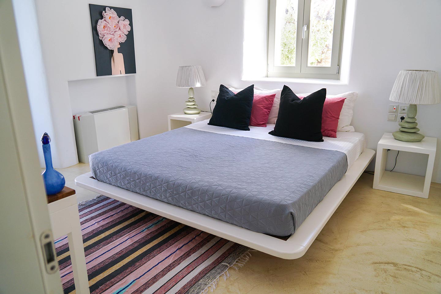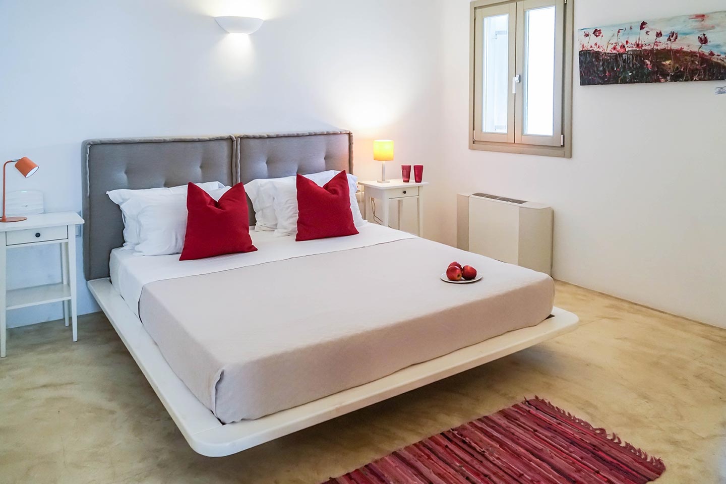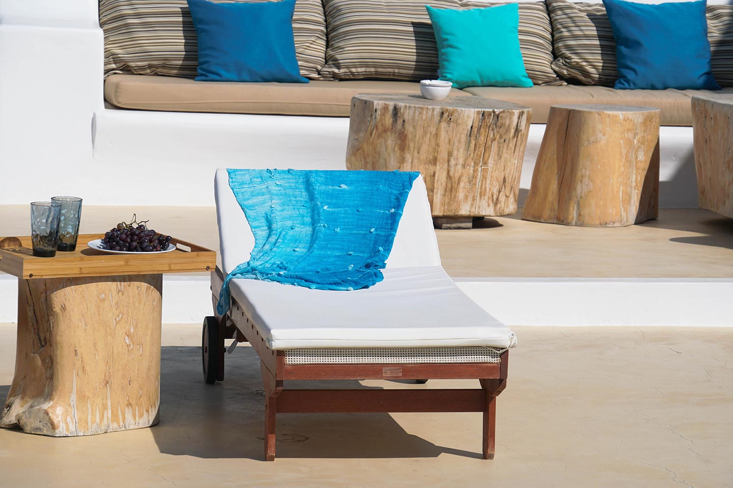 Later on during the evening guests can simply relax and enjoy the serenity this luxury villa rental in Mykonos offers, gazing at the sea and stars in any one of the four available outside sitting areas.The villa is located at a distance of 2 km from the picturesque Ano Mera, 6 km from the sizzling nightlife of Mykonos and 4 km from the beaches of Elia, Kalafatis and Kalo Livadi. Ftelia Boheme is in the middle of the Mykonian universe and 1 km from Alemagou restaurant.