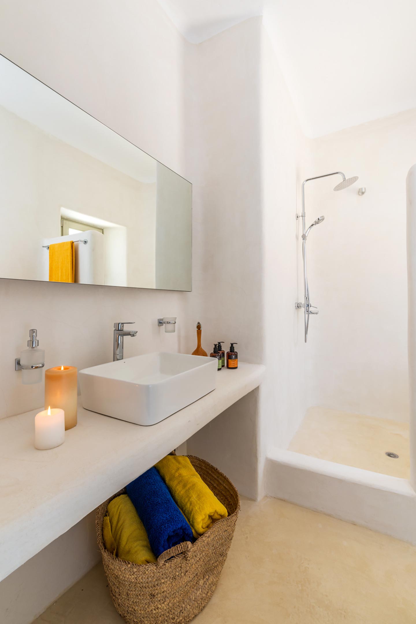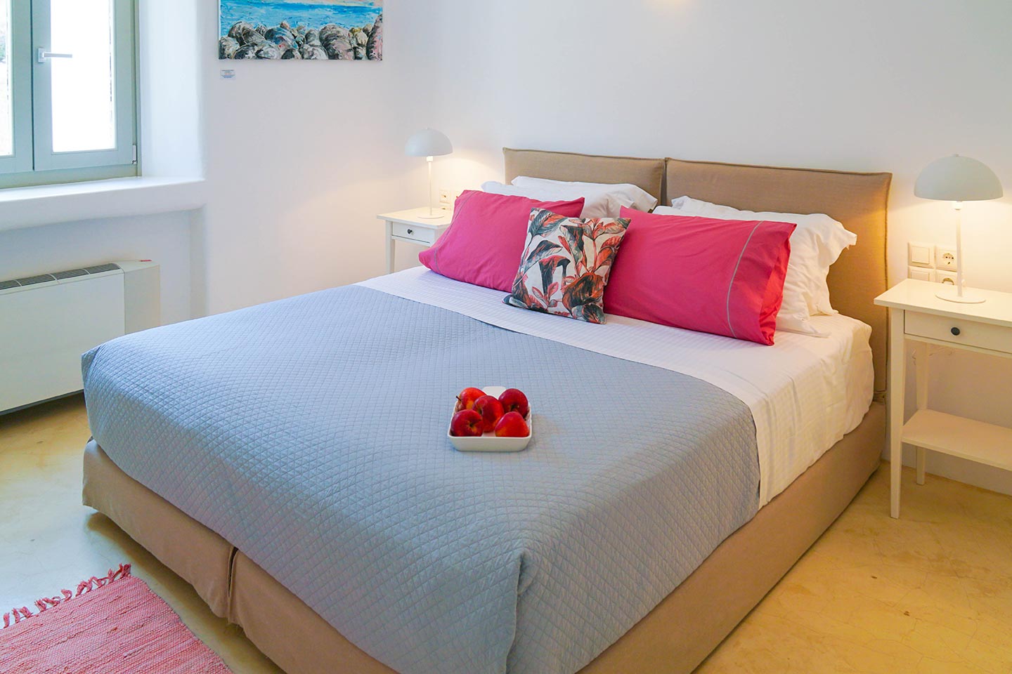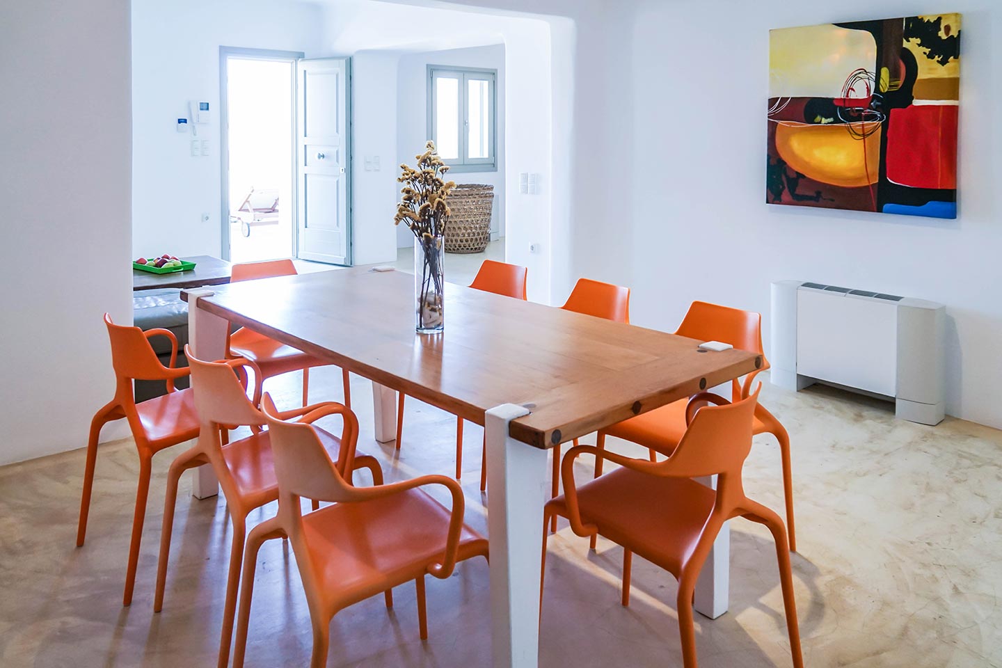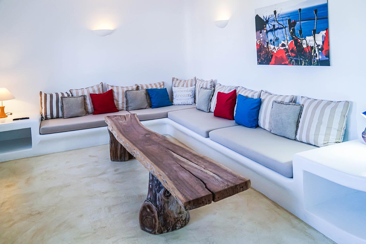 Later on during the evening guests can simply relax and enjoy the serenity this luxury villa rental in Mykonos offers, gazing at the sea and stars in any one of the four available outside sitting areas.The villa is located at a distance of 2 km from the picturesque Ano Mera, 6 km from the sizzling nightlife of Mykonos and 4 km from the beaches of Elia, Kalafatis and Kalo Livadi. Ftelia Boheme is in the middle of the Mykonian universe and 1 km from Alemagou restaurant.