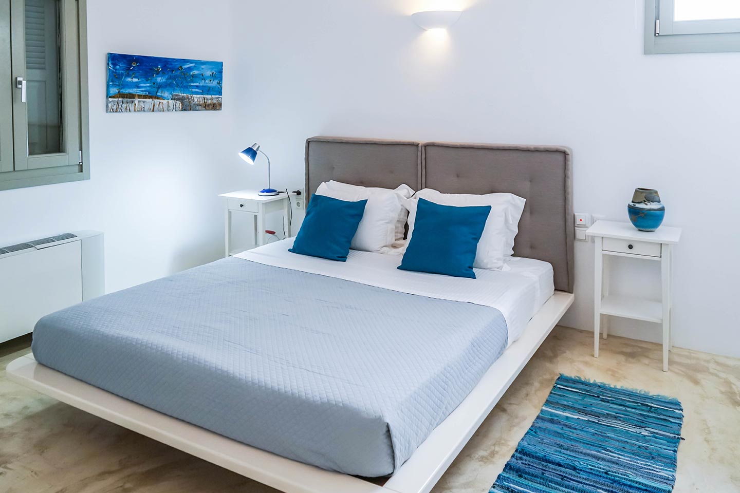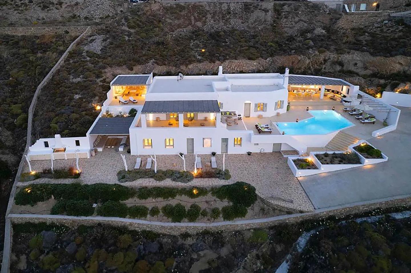 This luxury villa rental in Mykonos is built on a slight slope overlooking Ftelia bay that has been established as the windsurfers and kite surfers paradise, with its impressive waves and strong winds. The location is ideal for guests in search of tranquility and privacy as well as for more active travelers. Visitors can dwell in the 60sqm pool, have fun barbecuing in 2 barbeques or hike down 500m and enjoy the lovely turquoise waters of the Aegean and the sandy beach .