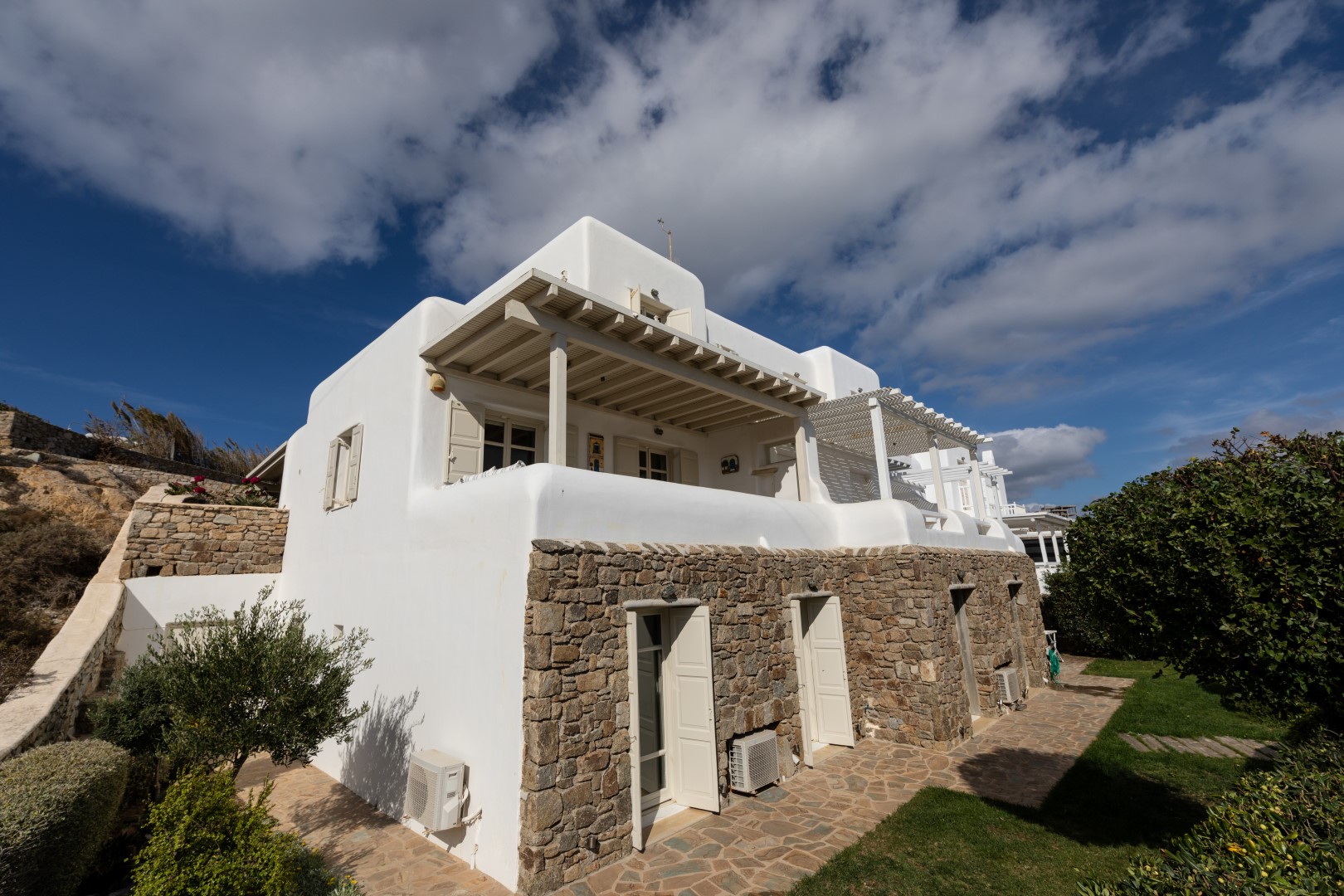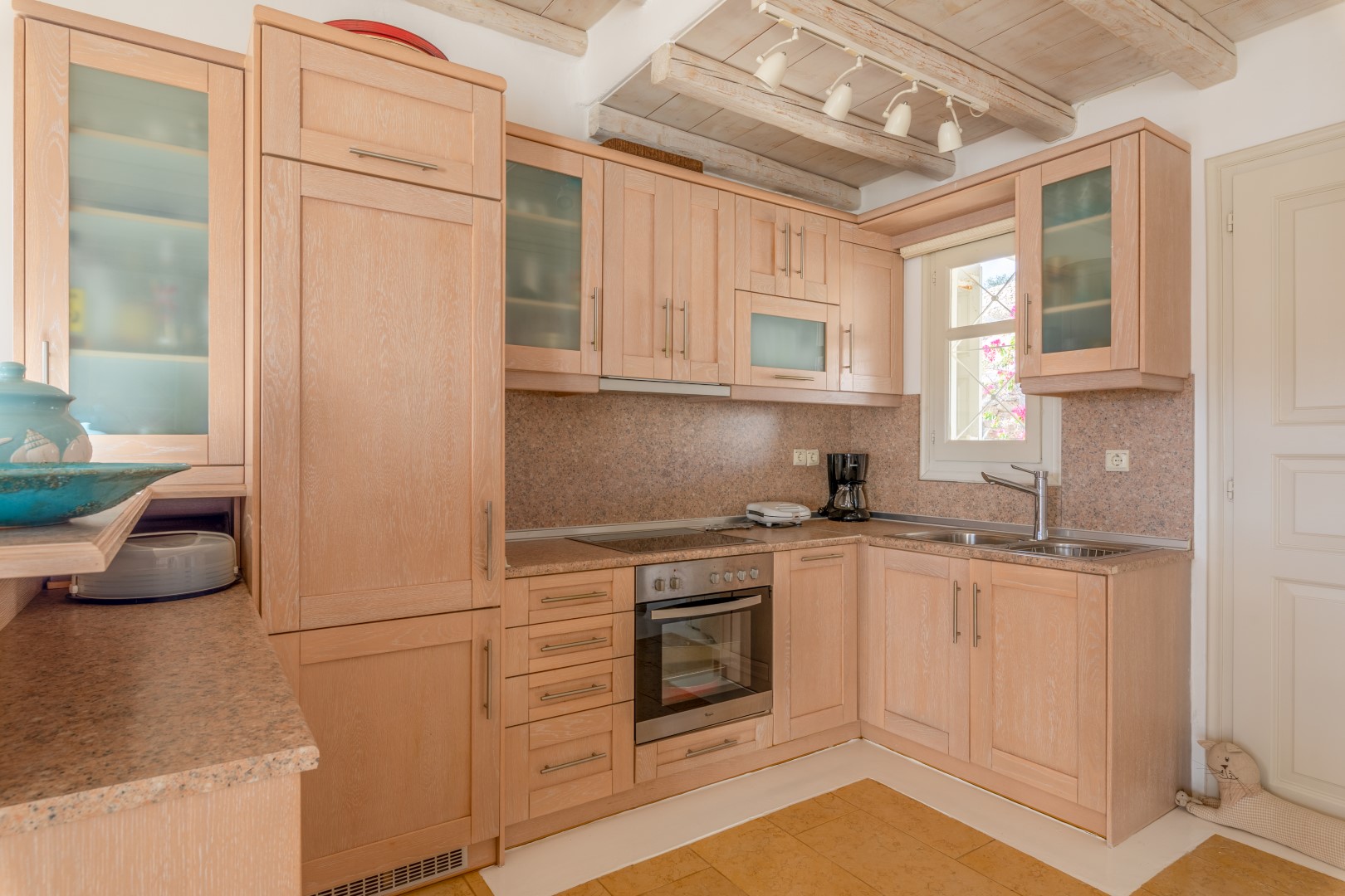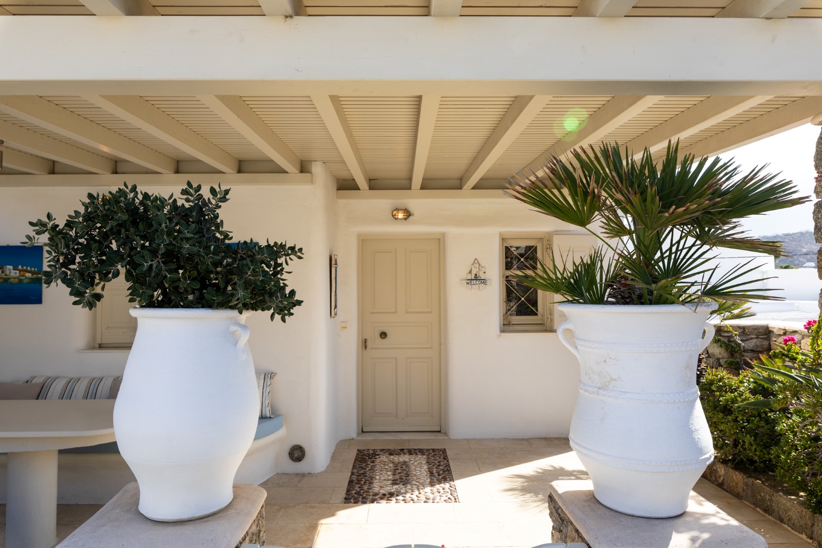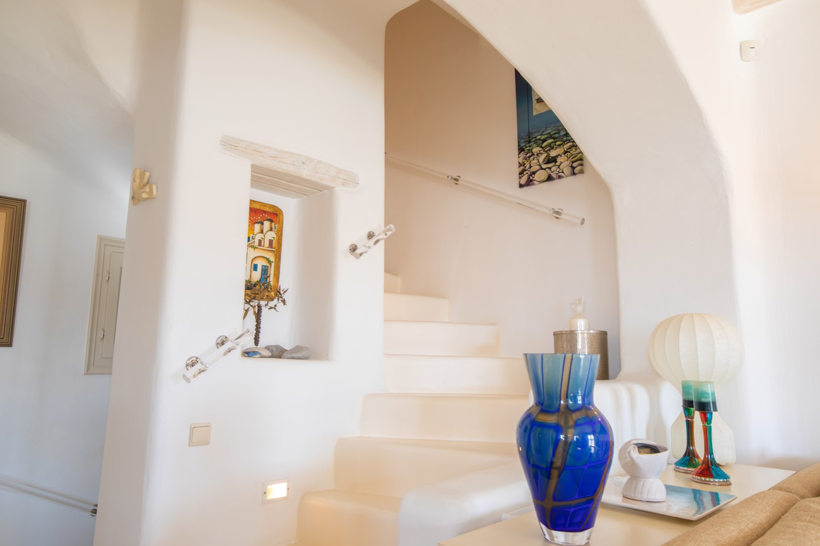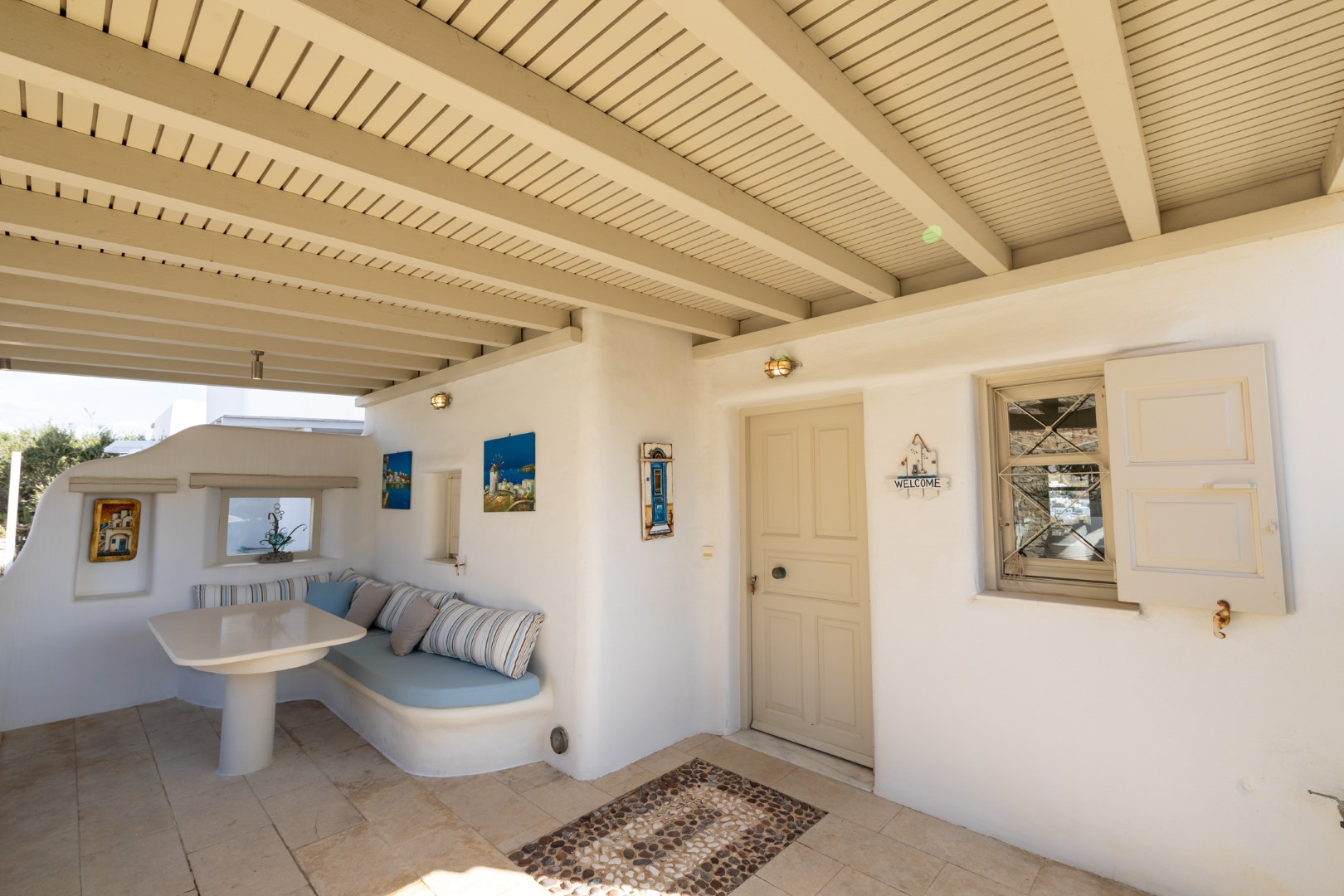 The decor is classic Cycladic with luxurious attributes. The living room has a Smart TV and a fully equipped kitchen with everything needed to enjoy convenient cooking including but not limited: to electric ovens and coffee maker (Nespresso) for the outmost home feeling. Cameras(outdoor) and alarm systems are available for security.