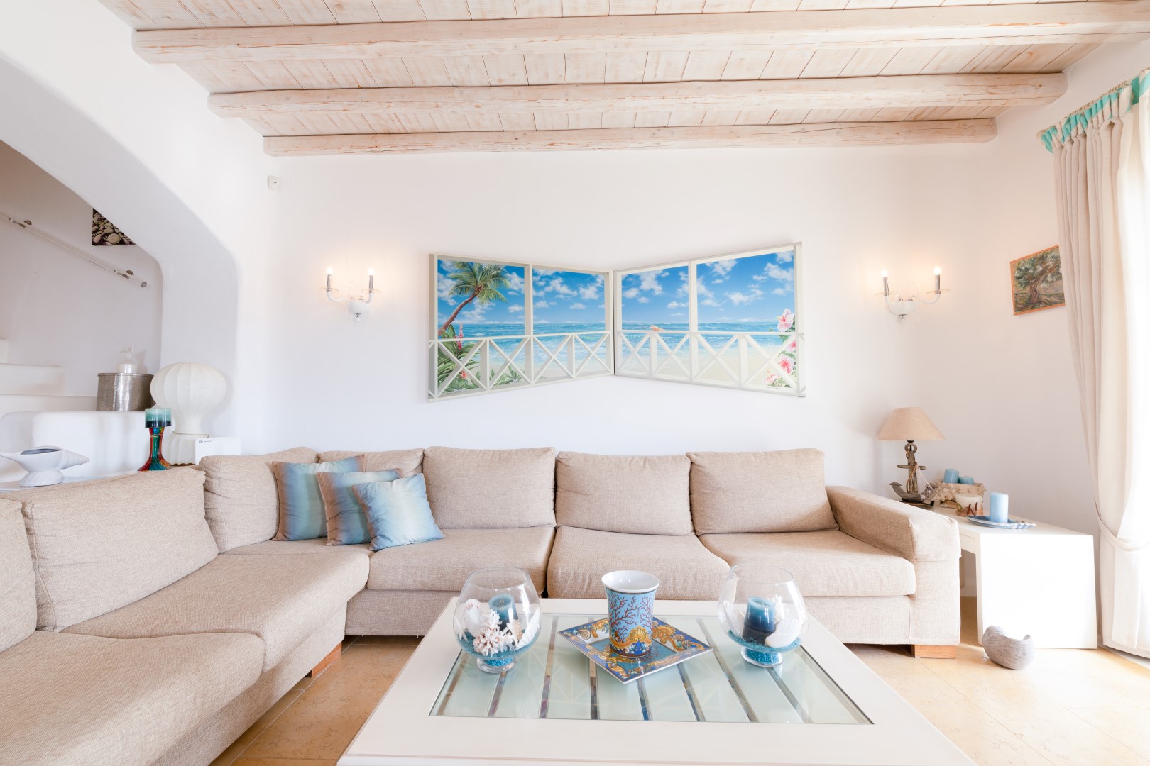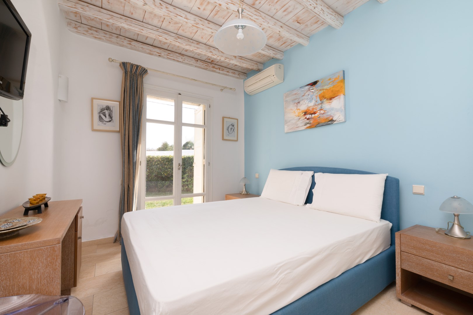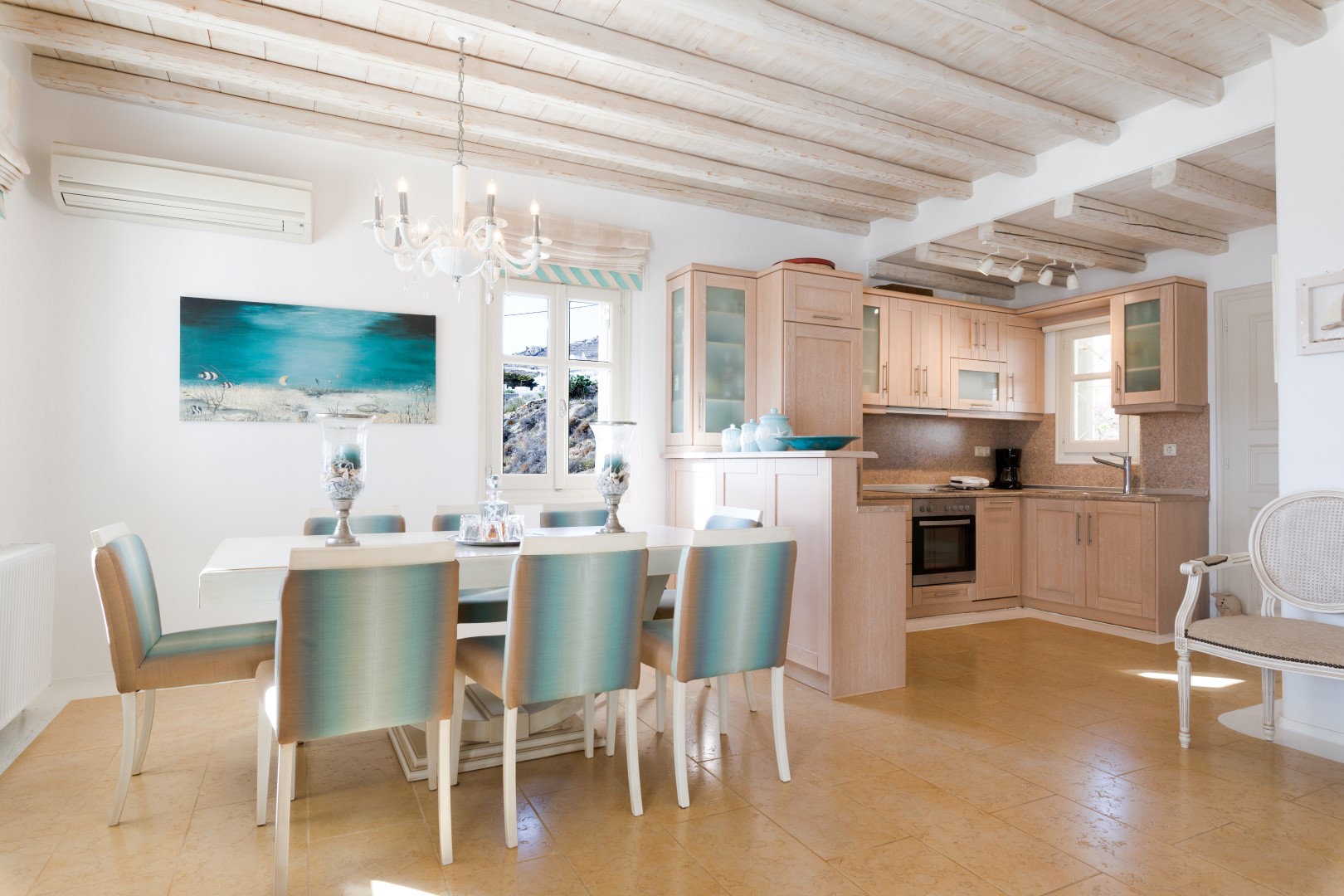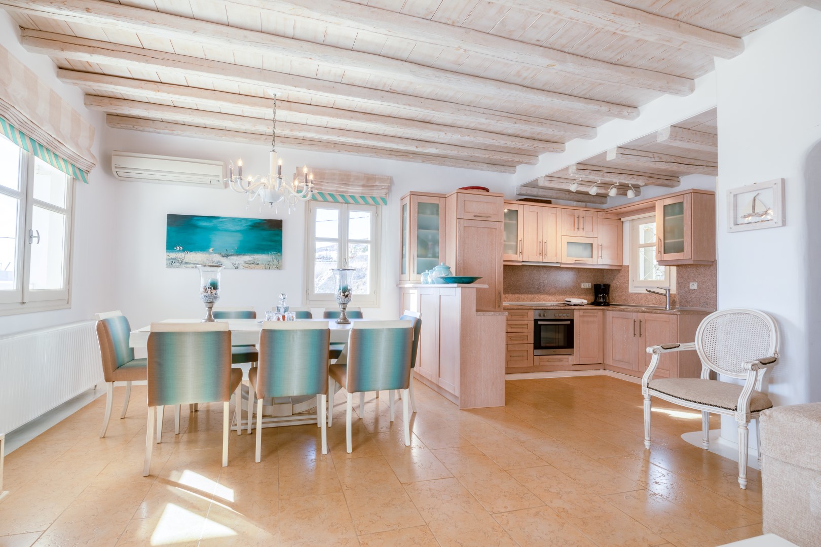 The decor is classic Cycladic with luxurious attributes. The living room has a Smart TV and a fully equipped kitchen with everything needed to enjoy convenient cooking including but not limited: to electric ovens and coffee maker (Nespresso) for the outmost home feeling. Cameras(outdoor) and alarm systems are available for security.