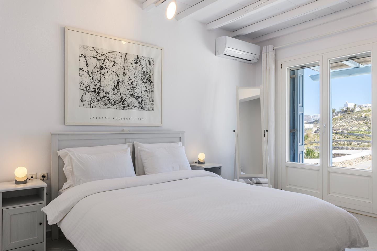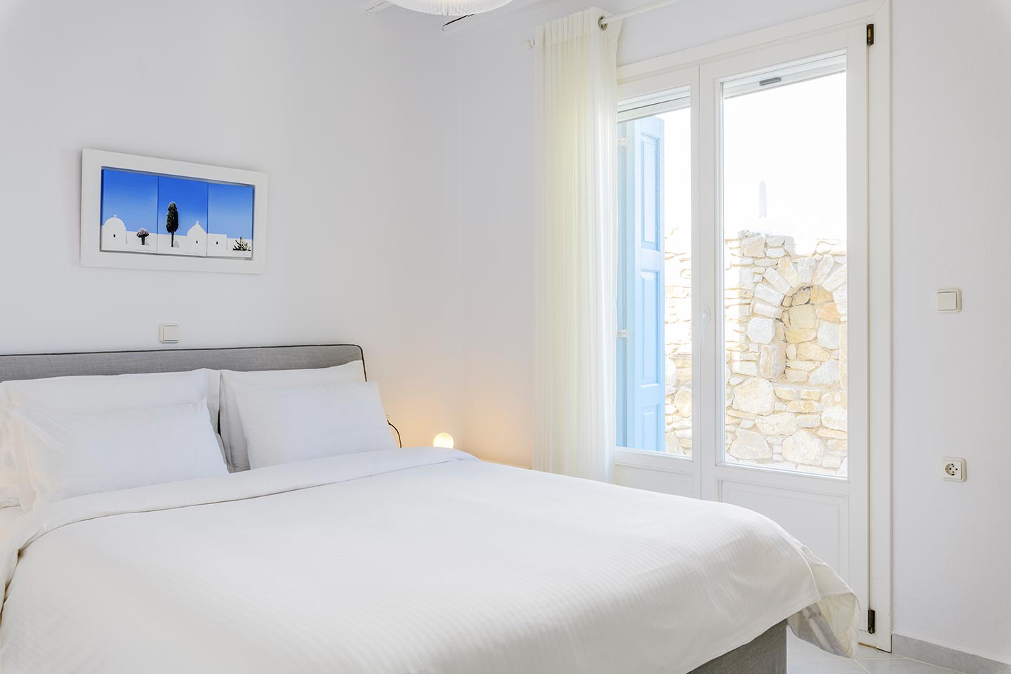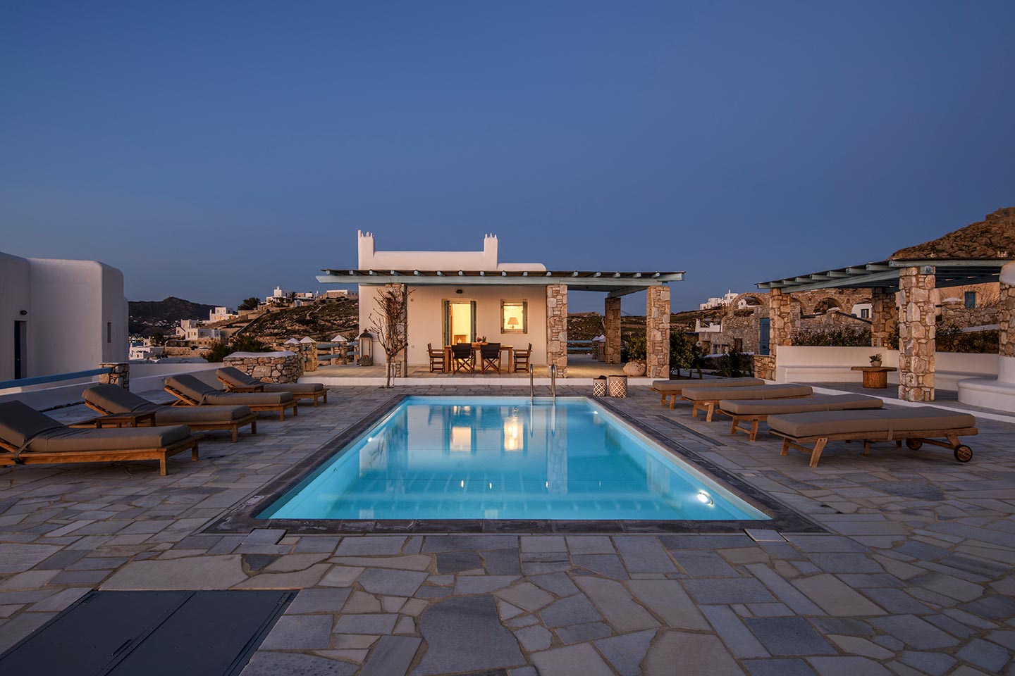 Influenced by traditional tone, the bright white colors mixed with natural stones and decorative details, vastly incorporating natural materials and focusing on simple geometric shapes result to an easy and breezy ambience; providing fashionable elegance, absolute c omfort and tranquility. The exclusive Kanalia peninsula lies at the southwestern shore of Mykonos facing Mykonos Town, Tinos Island the island , of Delos, Rhenia and Baos . Villa Ariadne is located at a hill spot in K analia which offers unique sunset view , while the famous beaches of Ornos and Agios Ioannis are in a short distance , as well as the cosmopolitan Mykonos town lies about 4km away.