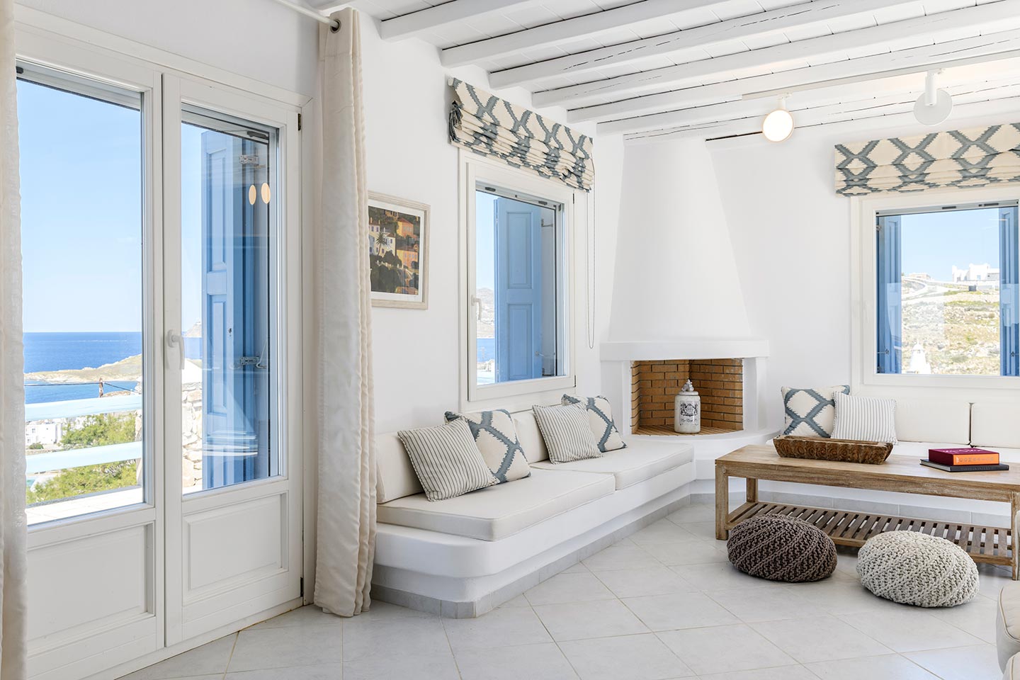 • Living room with fireplace and view to Mykonos Town and Aegean Sea