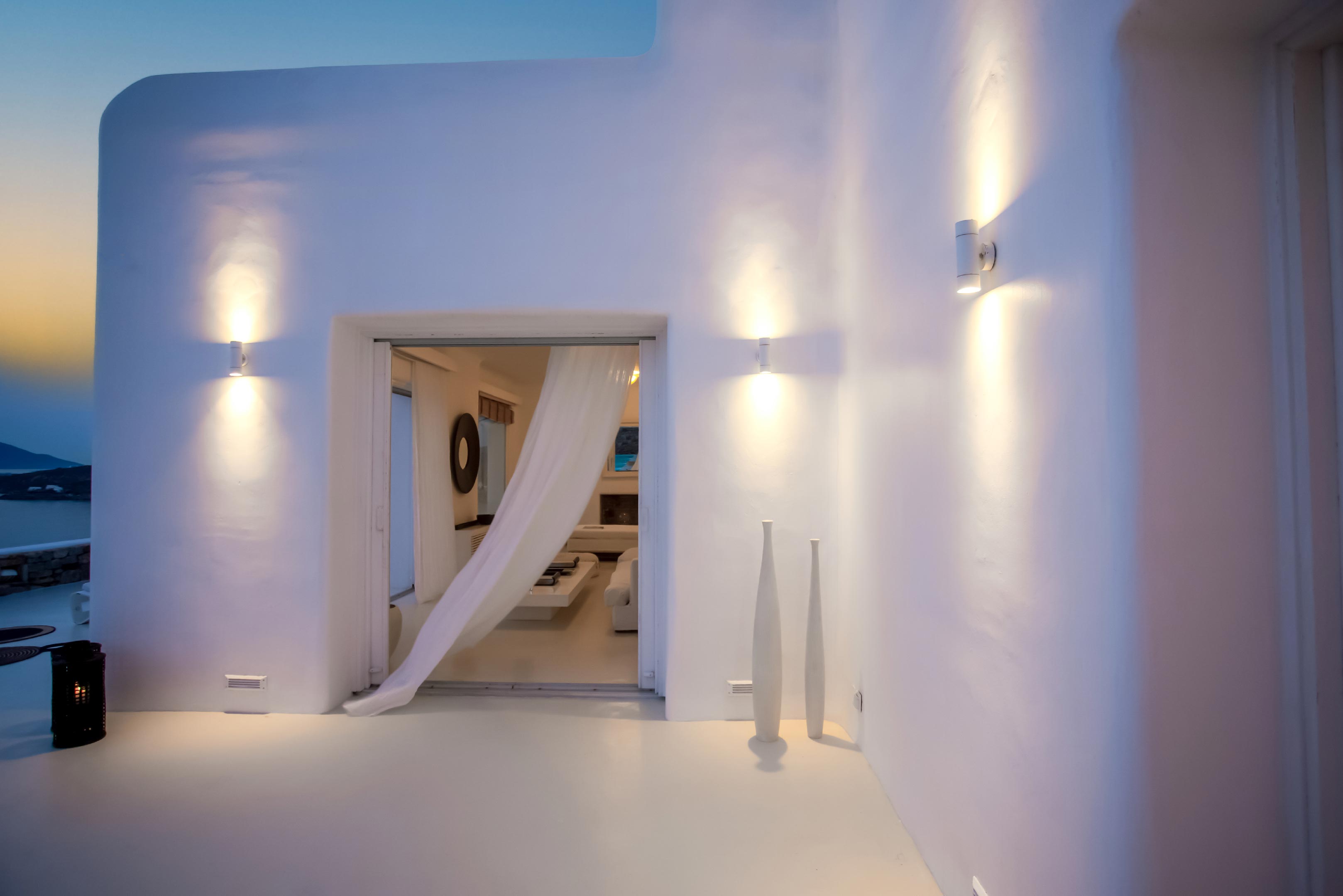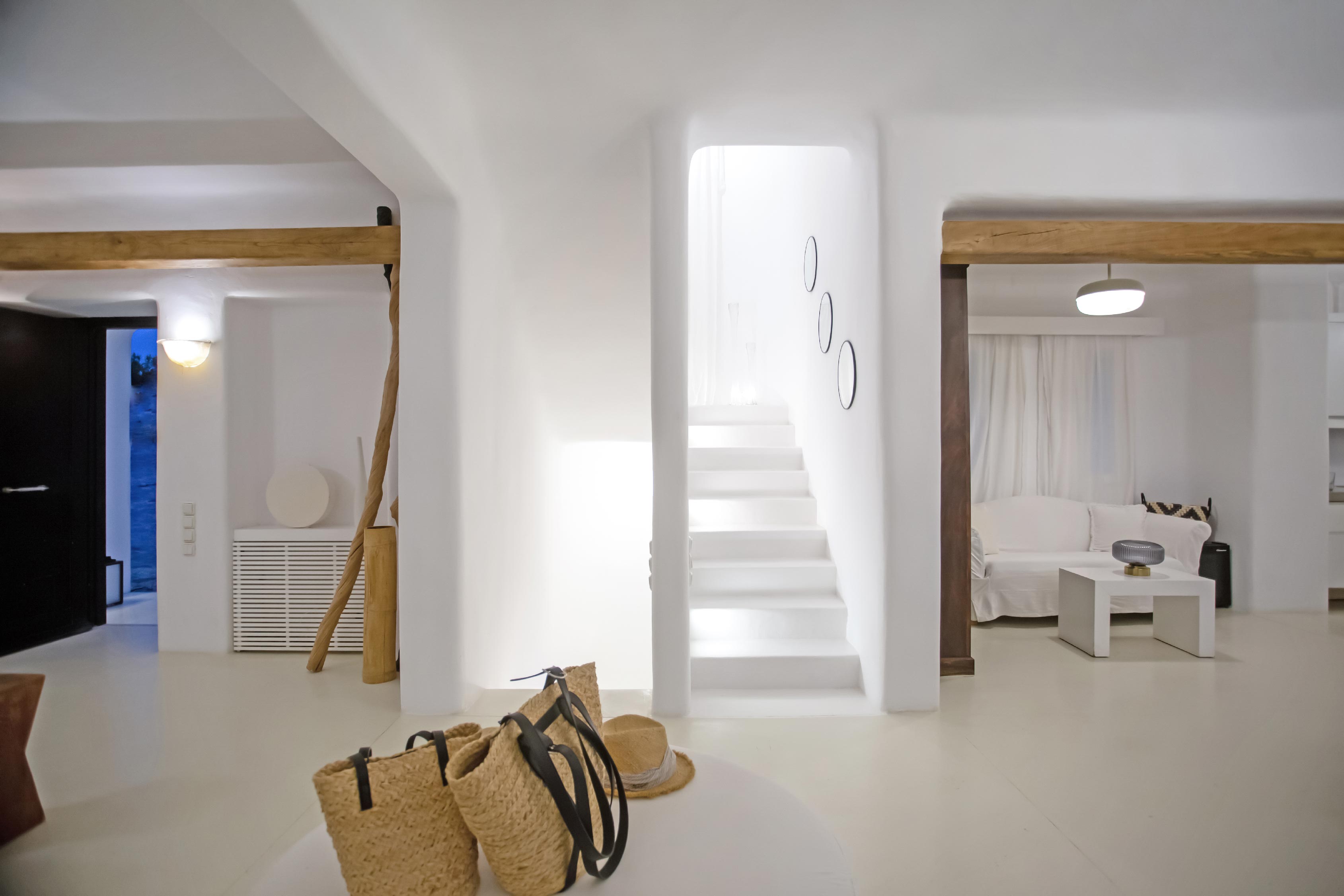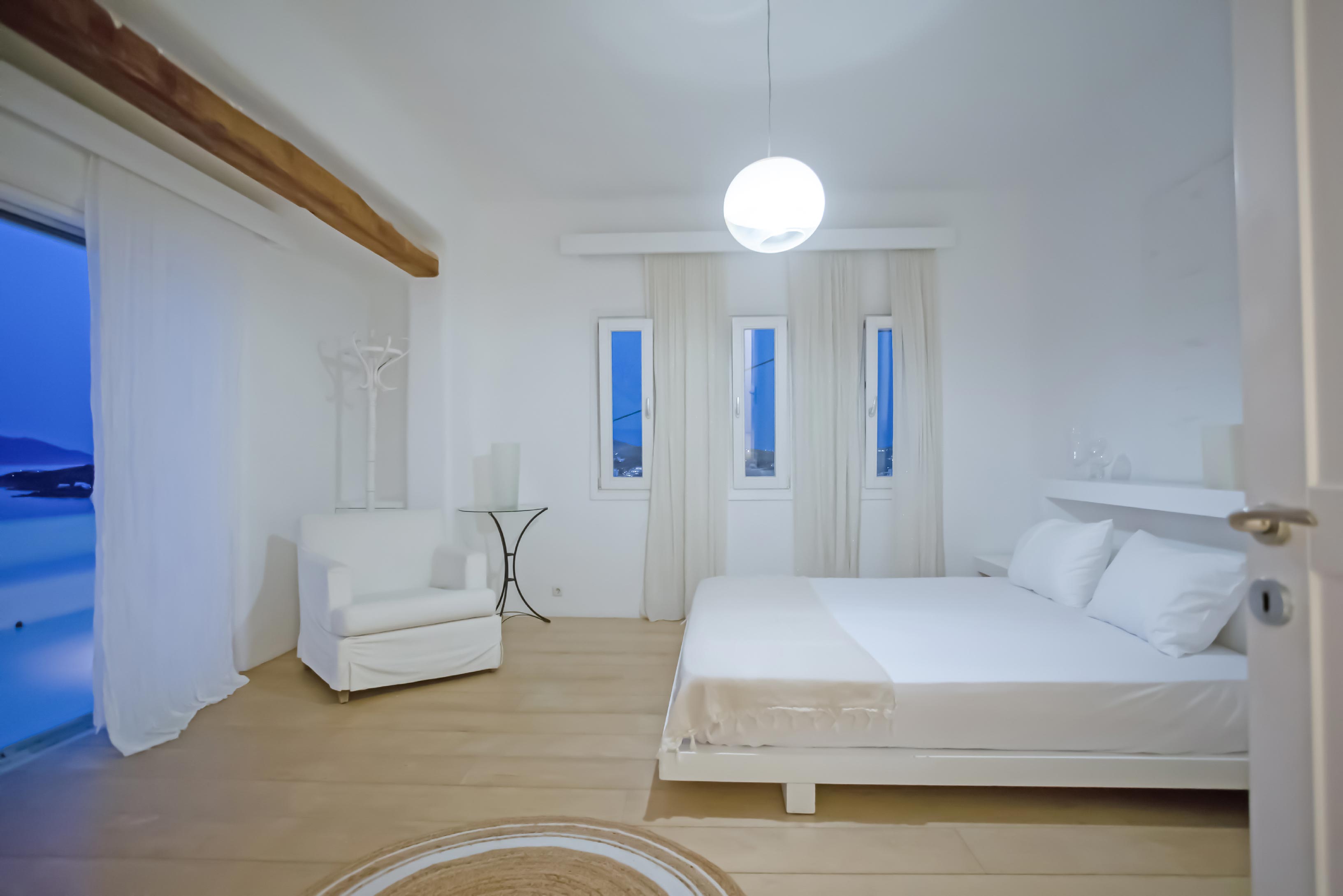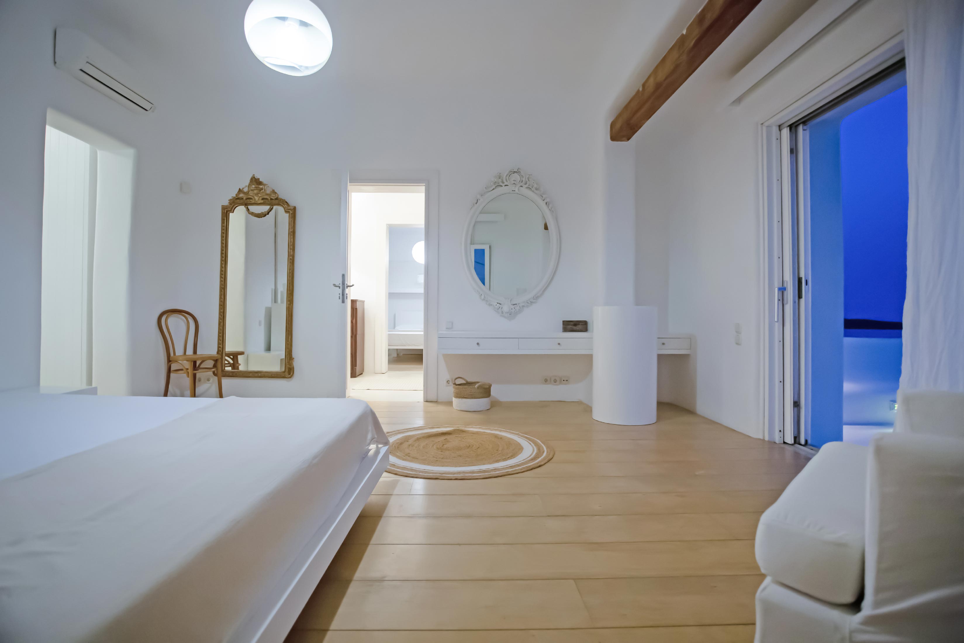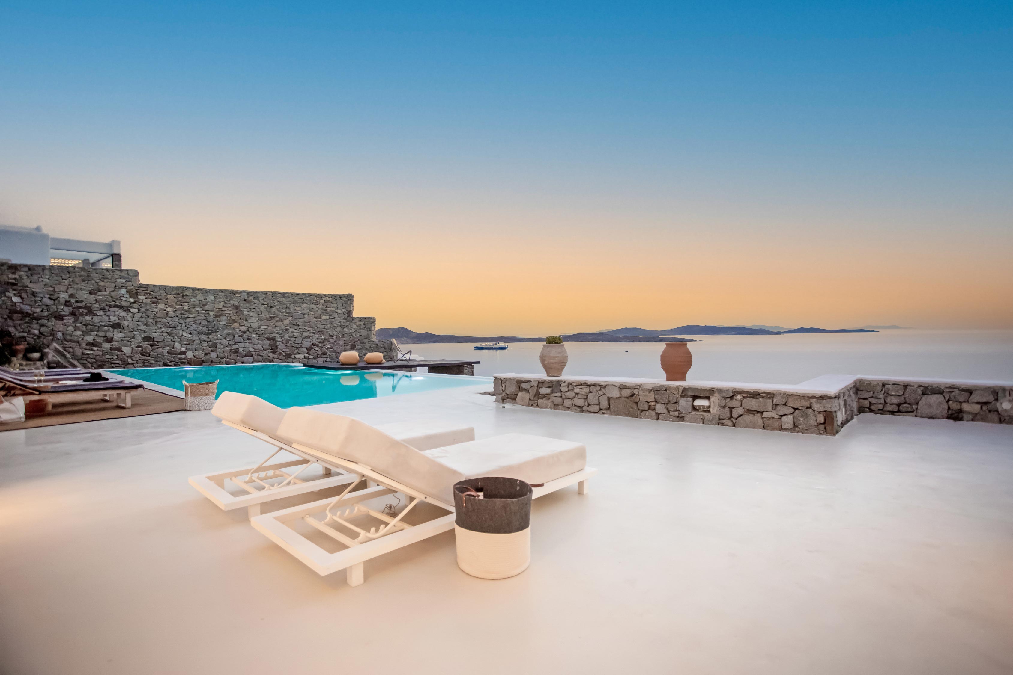 The exterior of the house is quite impressive. The infinity swimming pool is located on the front side of the deck overlooking the sea. In addition, there is the shaded dinging area where guests can enjoy a homemade meal cooked in the BBQ. When the sun sets, it is the perfect timing to prepare a cocktail and sit with your friends in the lounge area. Overall, the Villa features a sophisticated interior with touches of the contemporary Myconian style.