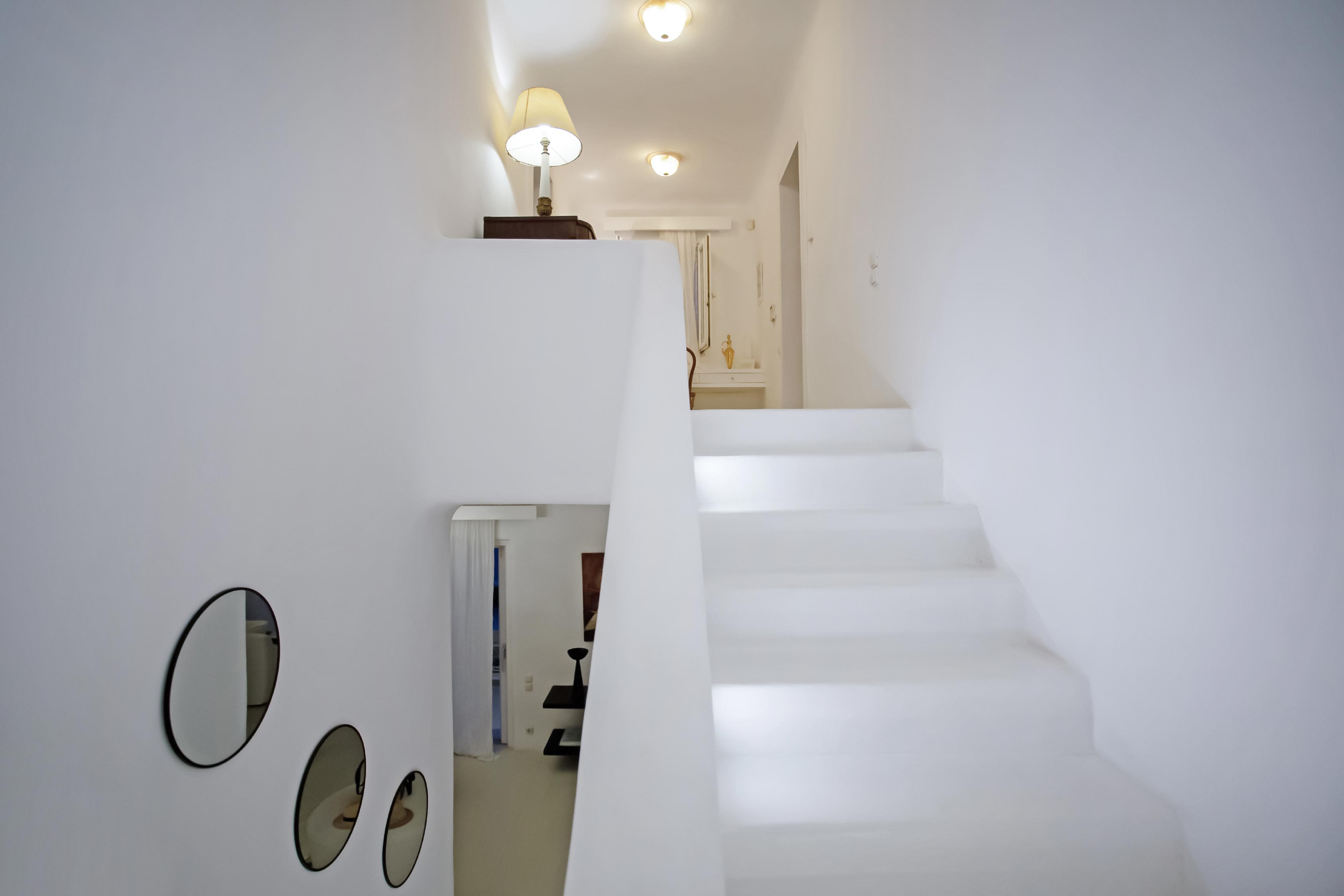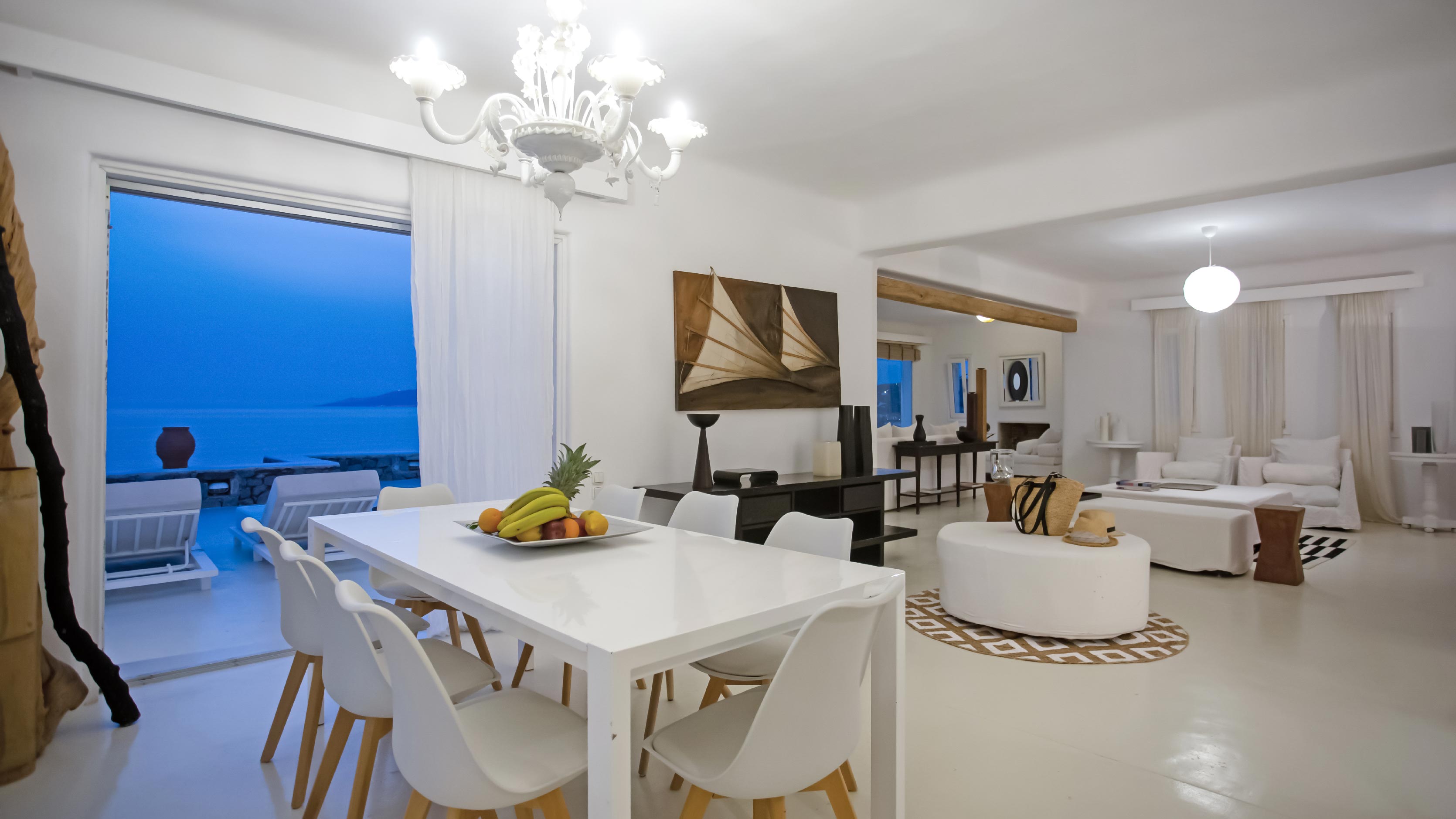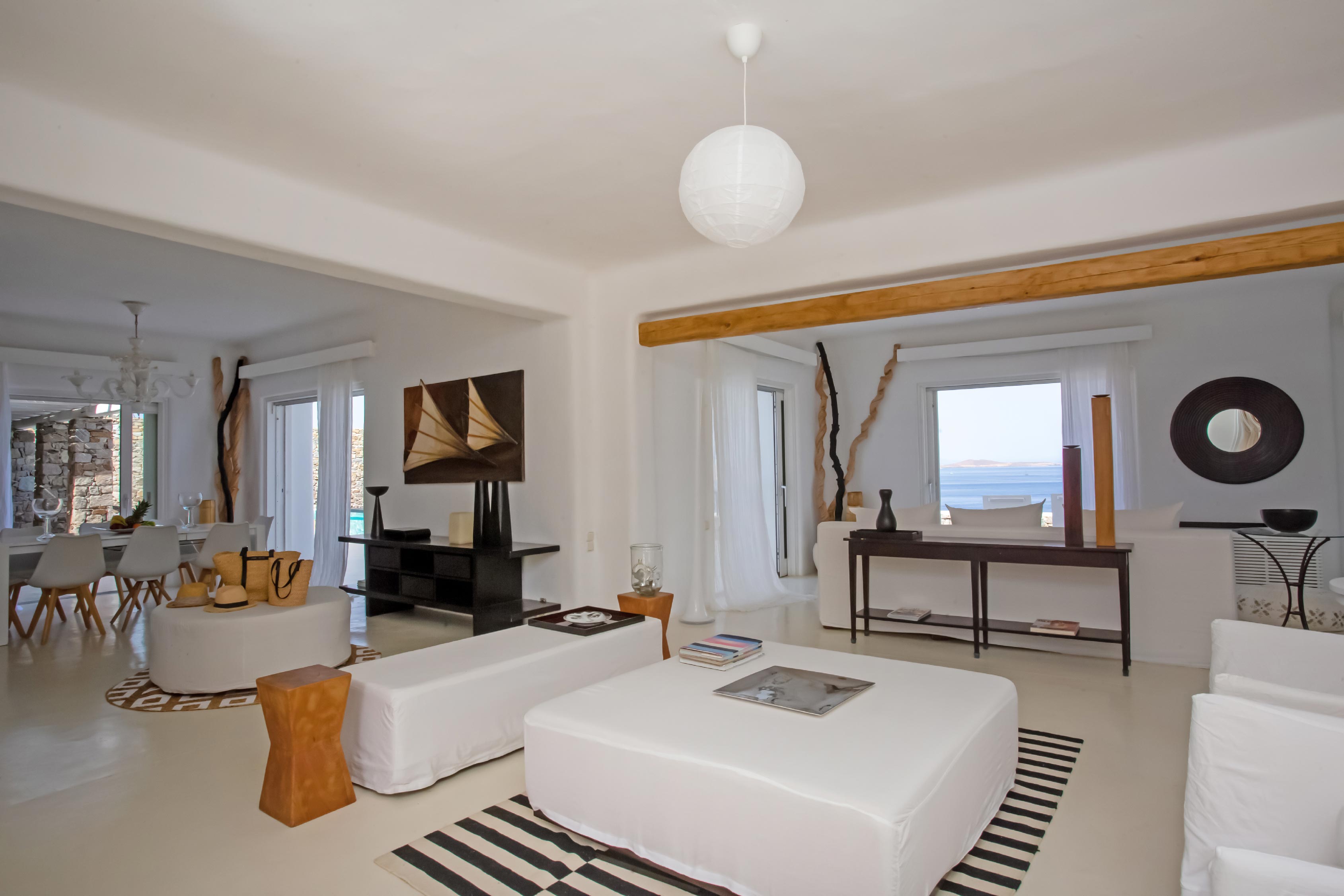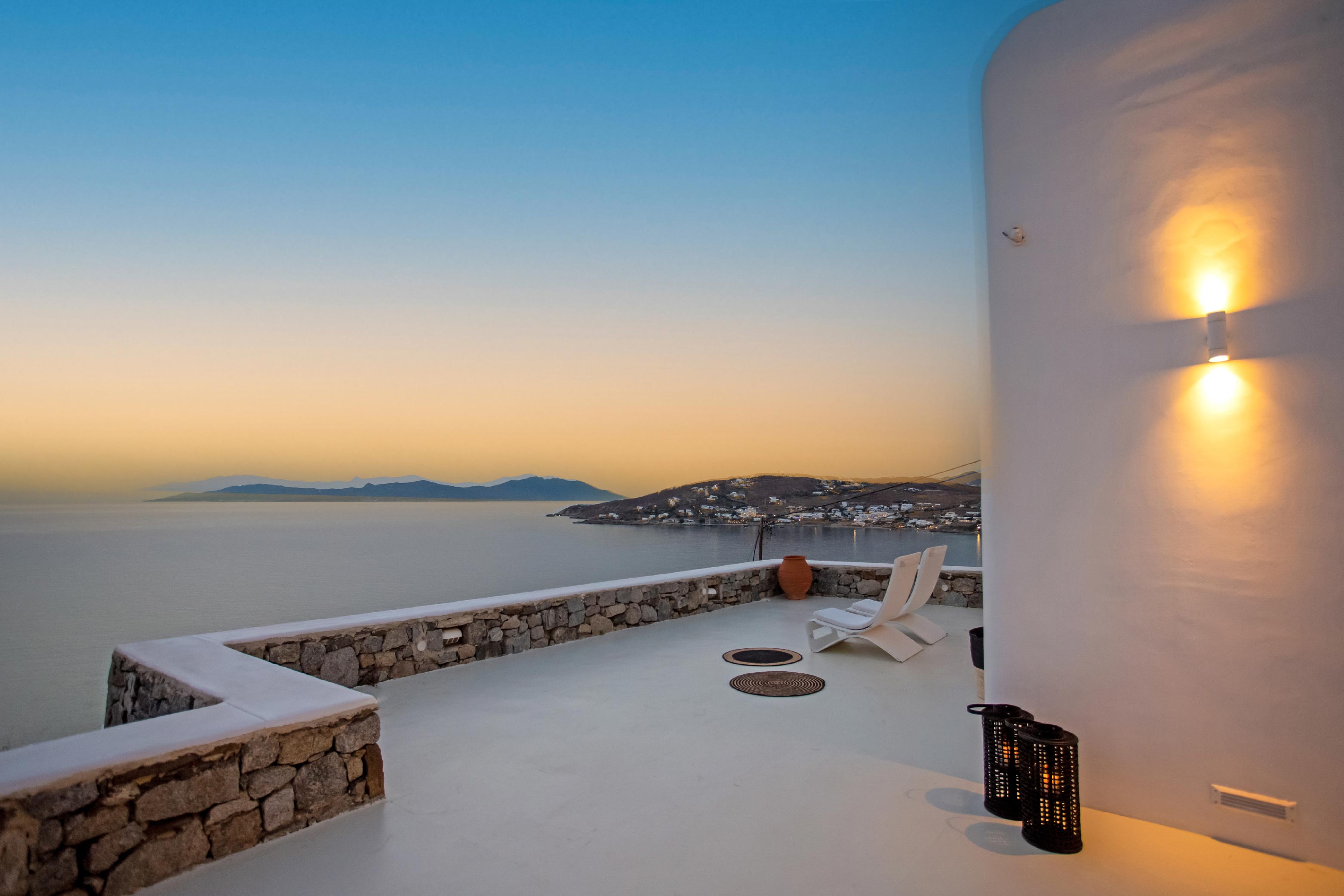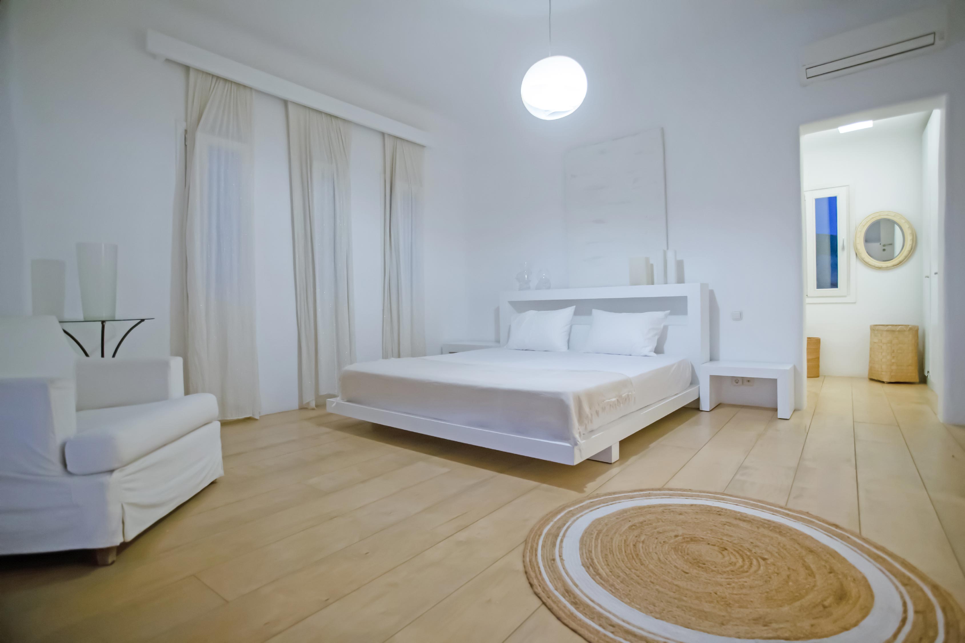 The exterior of the house is quite impressive. The infinity swimming pool is located on the front side of the deck overlooking the sea. In addition, there is the shaded dinging area where guests can enjoy a homemade meal cooked in the BBQ. When the sun sets, it is the perfect timing to prepare a cocktail and sit with your friends in the lounge area. Overall, the Villa features a sophisticated interior with touches of the contemporary Myconian style.