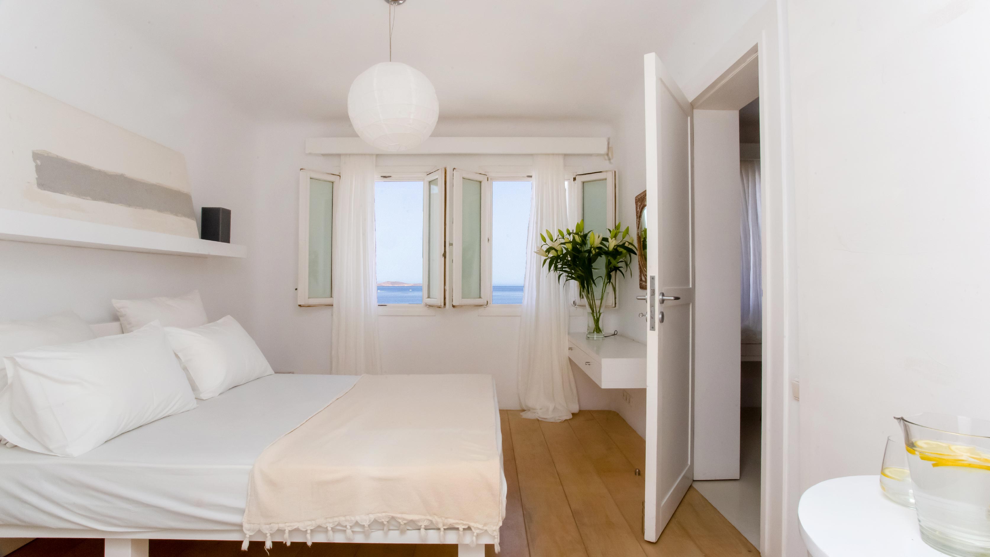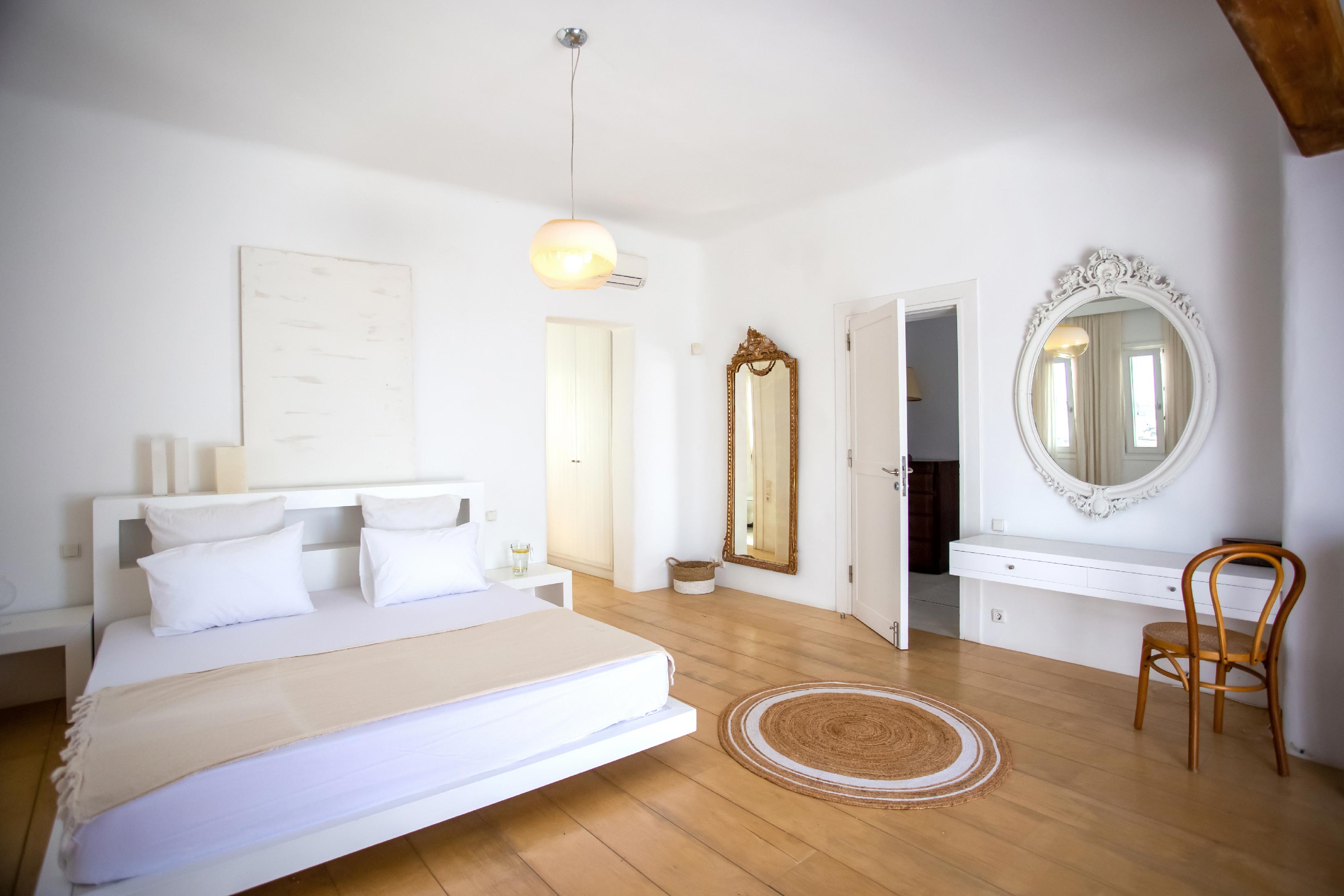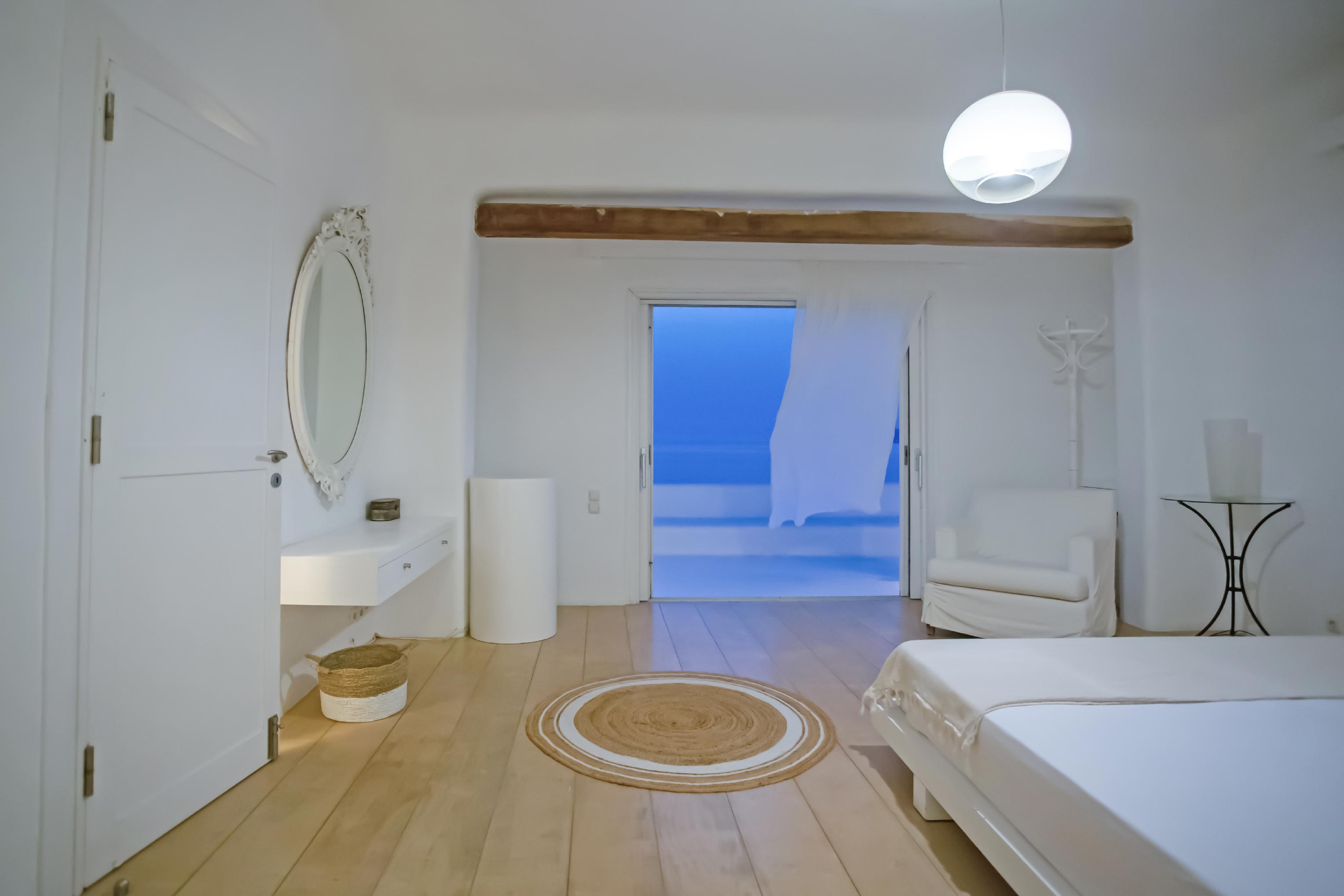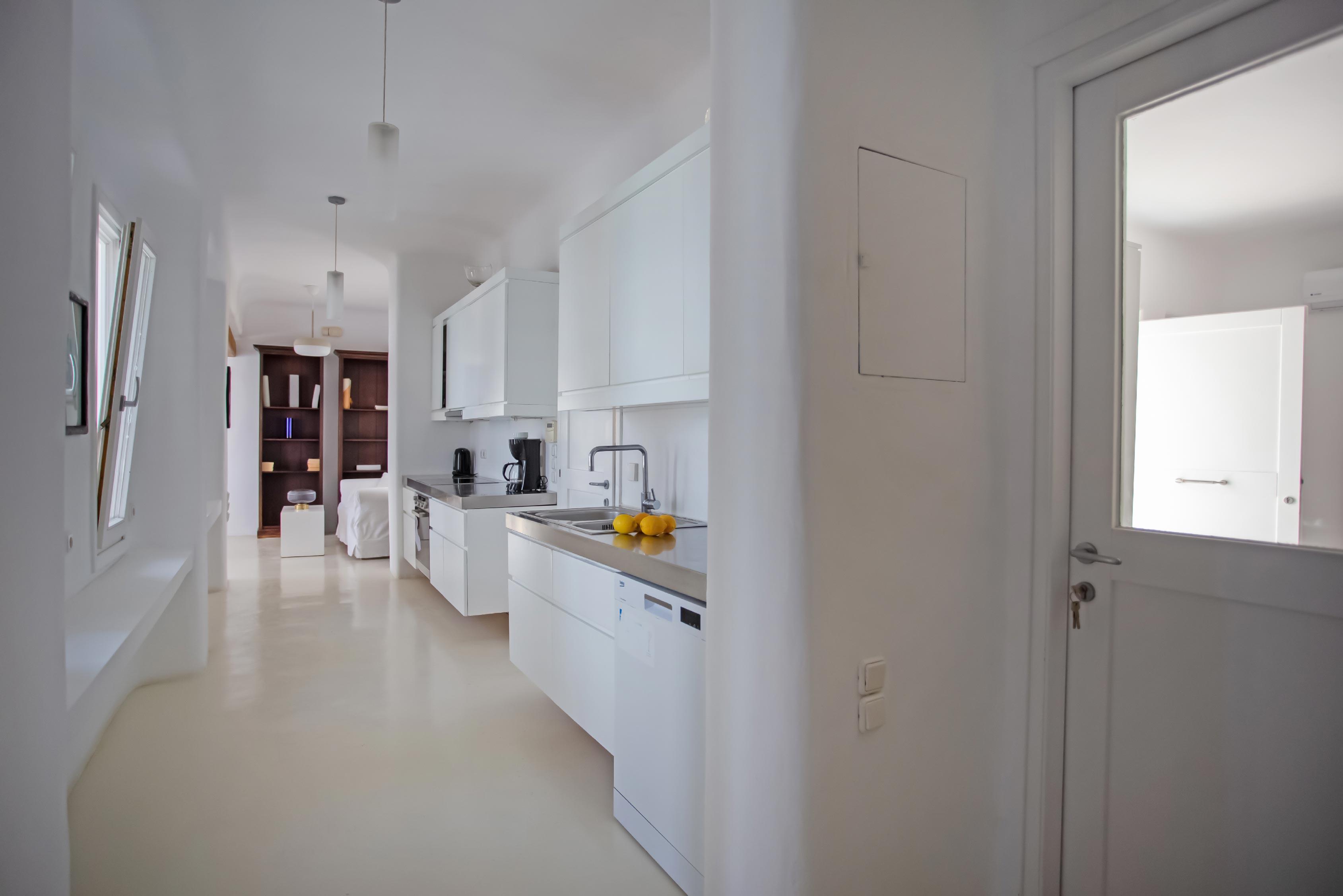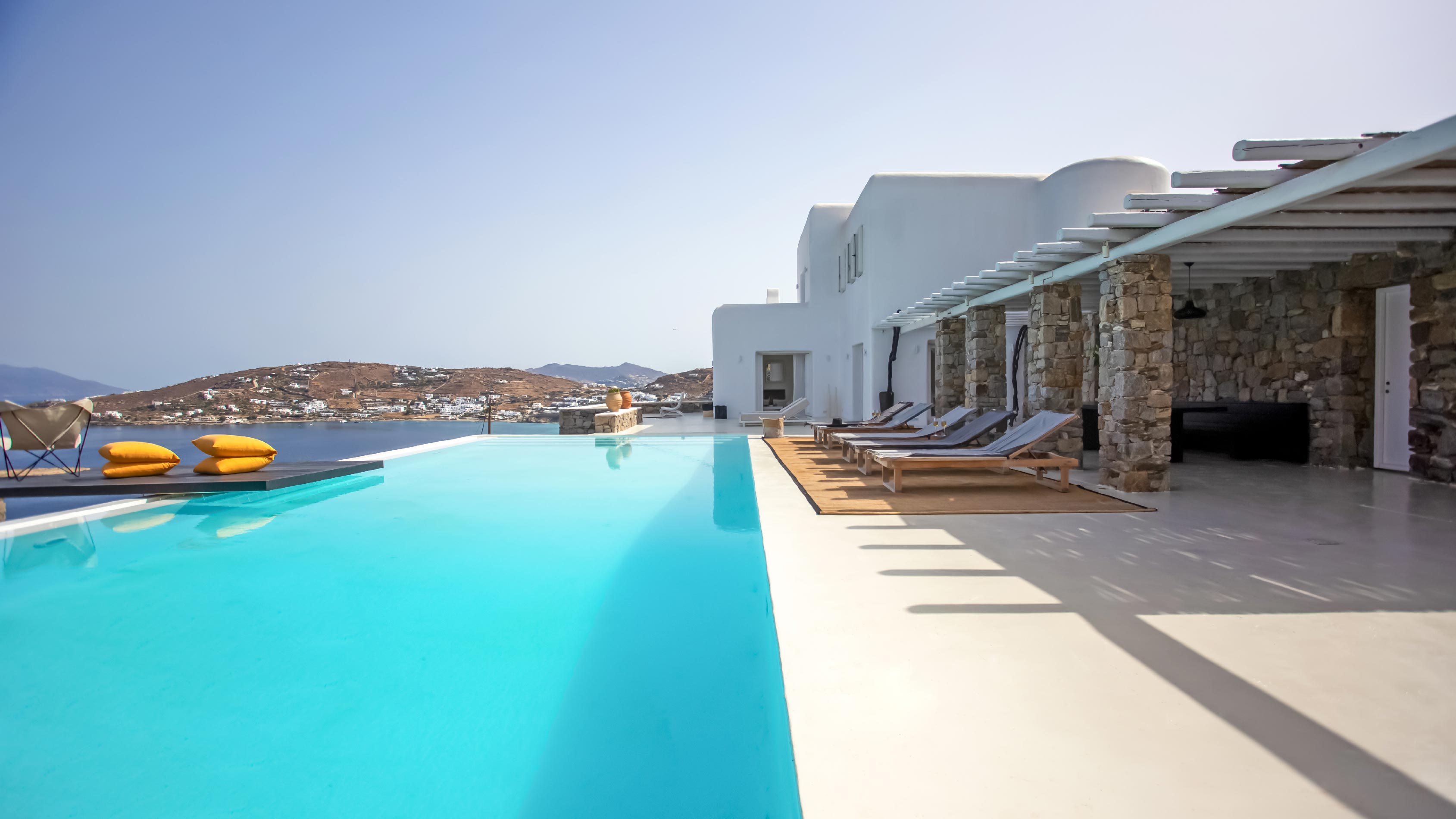 The exterior of the house is quite impressive. The infinity swimming pool is located on the front side of the deck overlooking the sea. In addition, there is the shaded dinging area where guests can enjoy a homemade meal cooked in the BBQ. When the sun sets, it is the perfect timing to prepare a cocktail and sit with your friends in the lounge area. Overall, the Villa features a sophisticated interior with touches of the contemporary Myconian style.