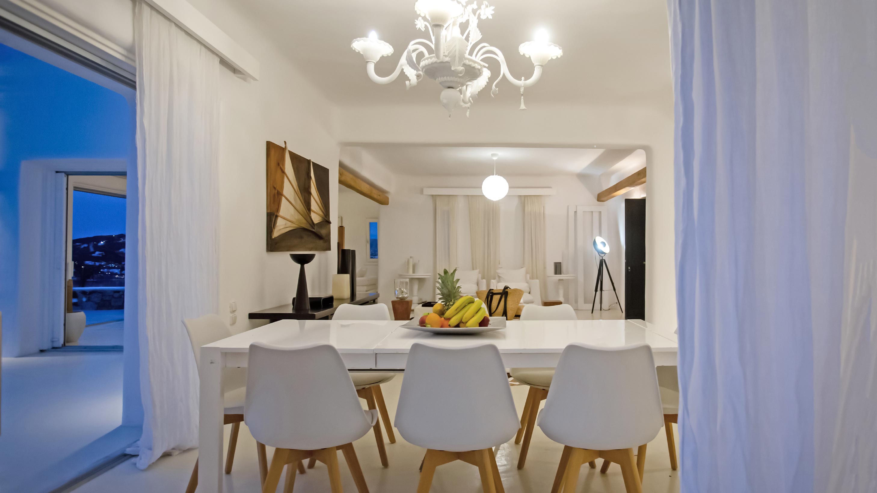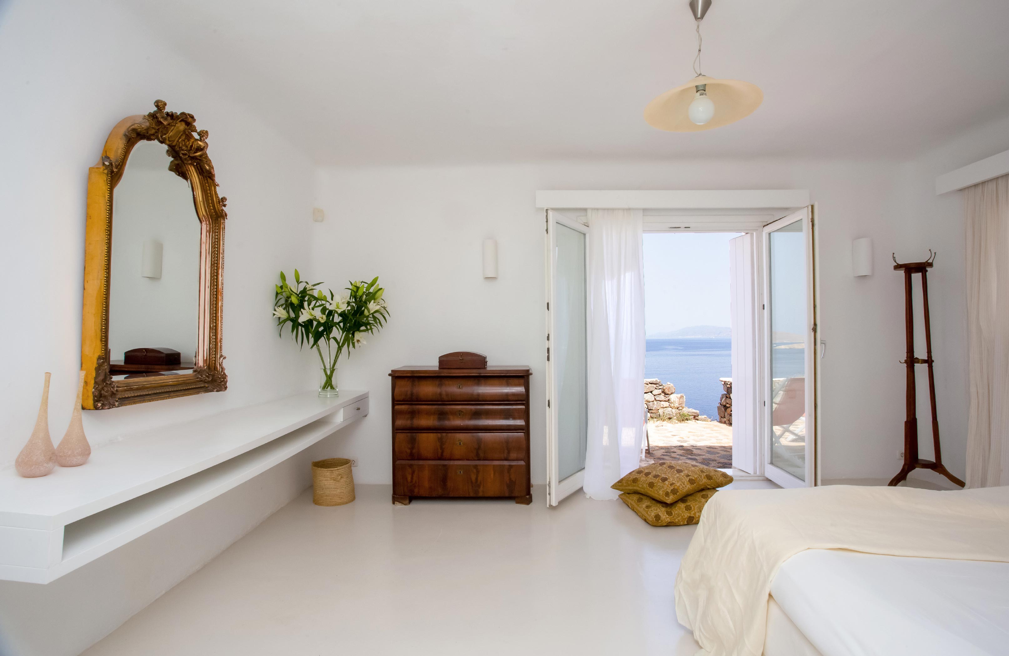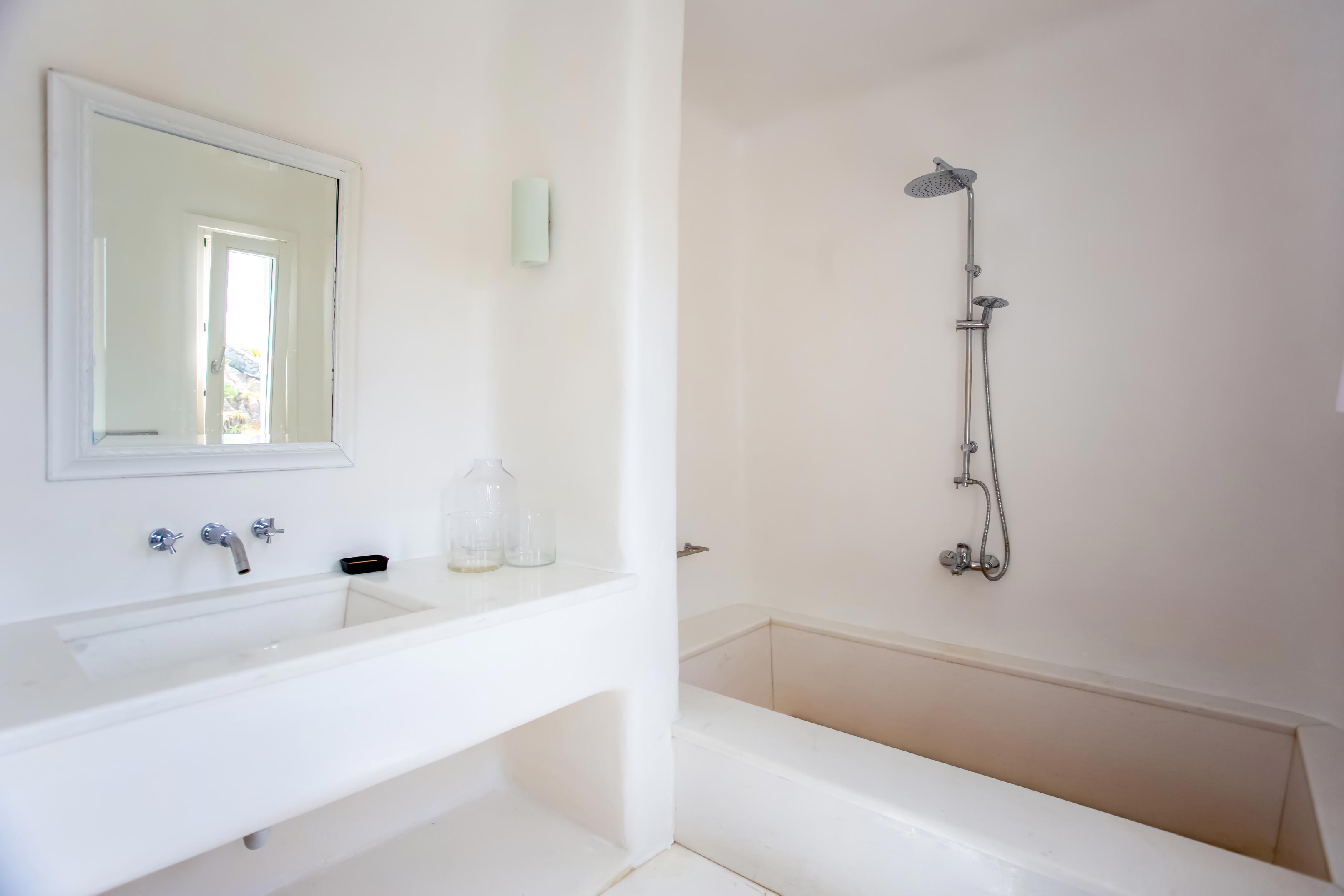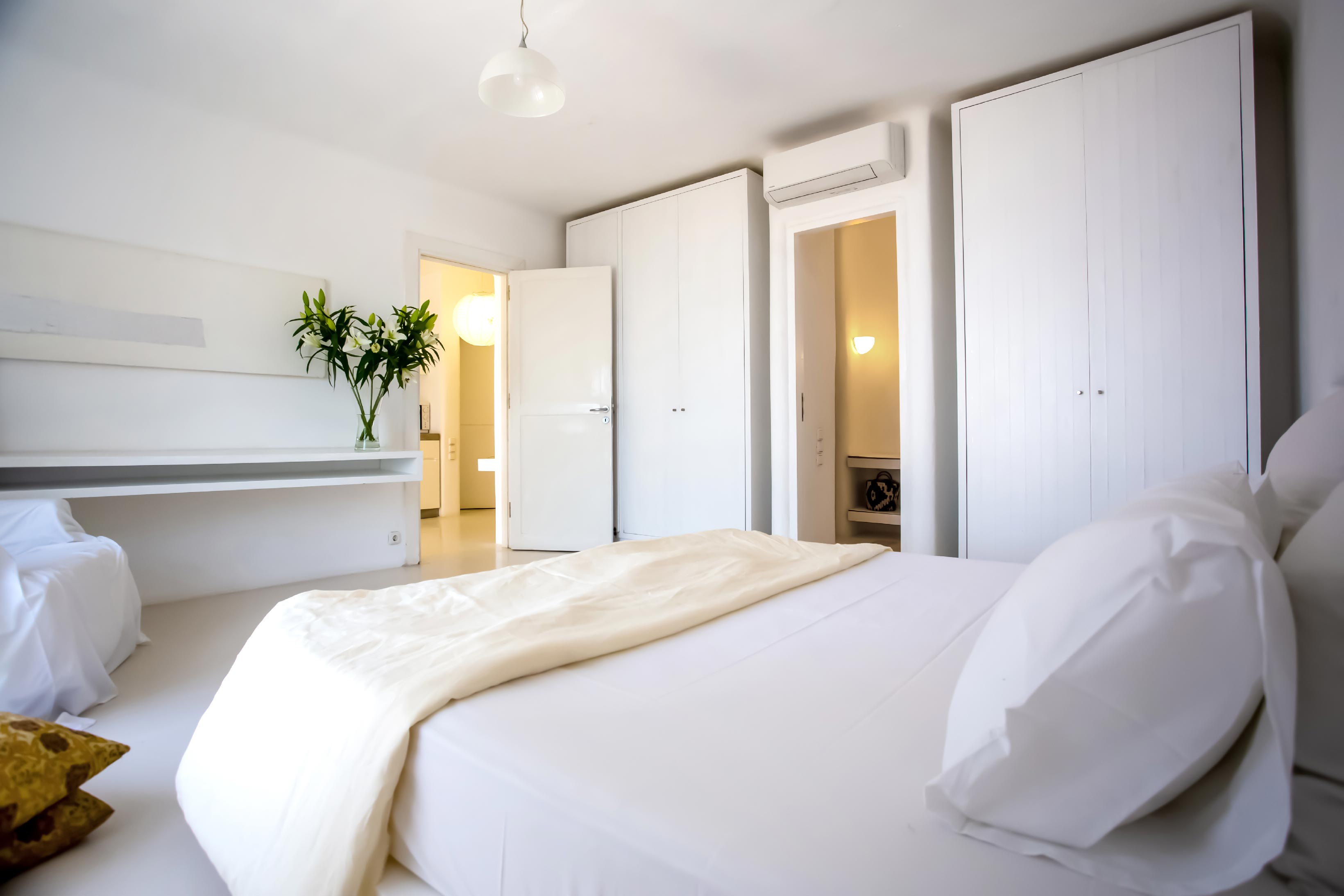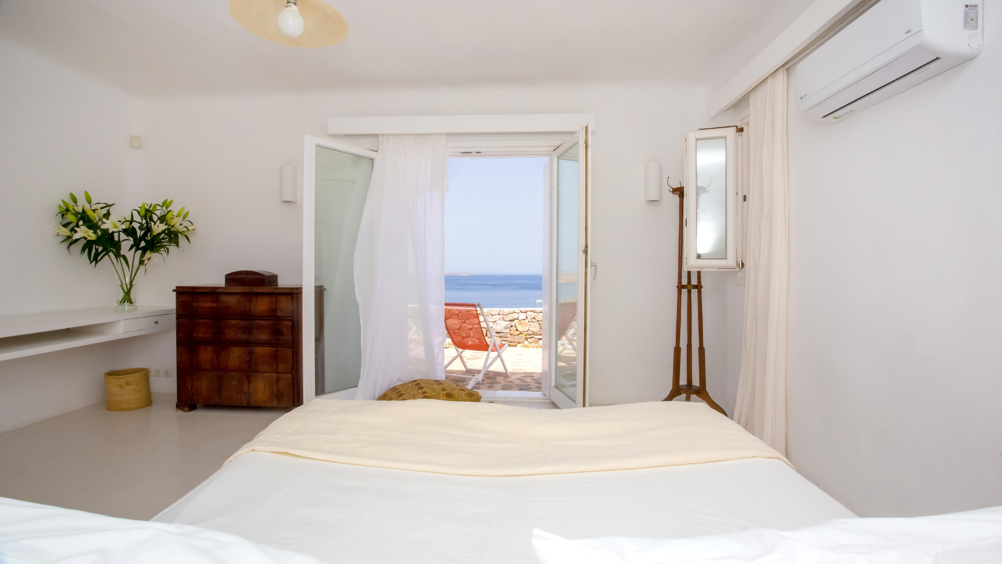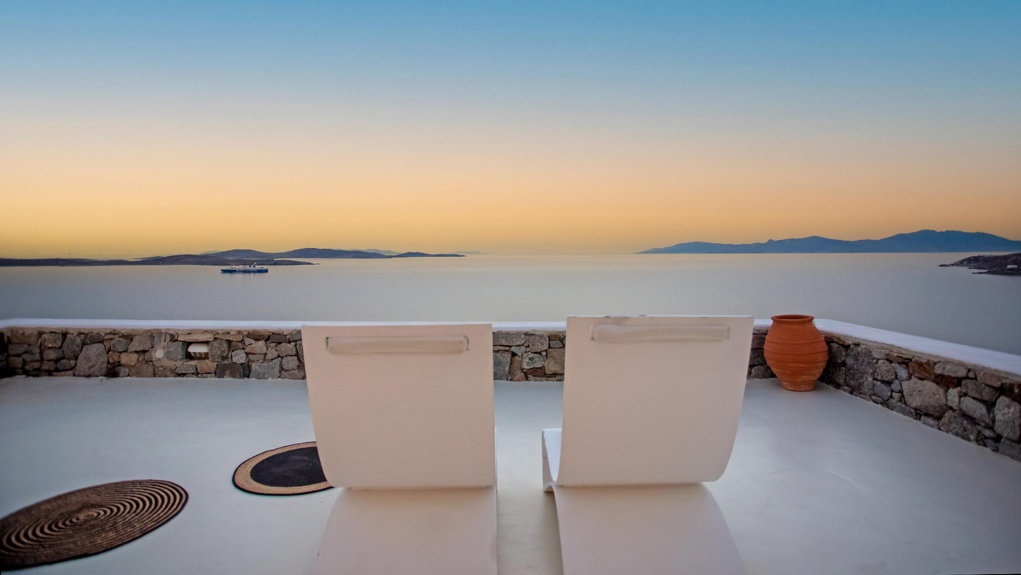 The exterior of the house is quite impressive. The infinity swimming pool is located on the front side of the deck overlooking the sea. In addition, there is the shaded dinging area where guests can enjoy a homemade meal cooked in the BBQ. When the sun sets, it is the perfect timing to prepare a cocktail and sit with your friends in the lounge area. Overall, the Villa features a sophisticated interior with touches of the contemporary Myconian style.