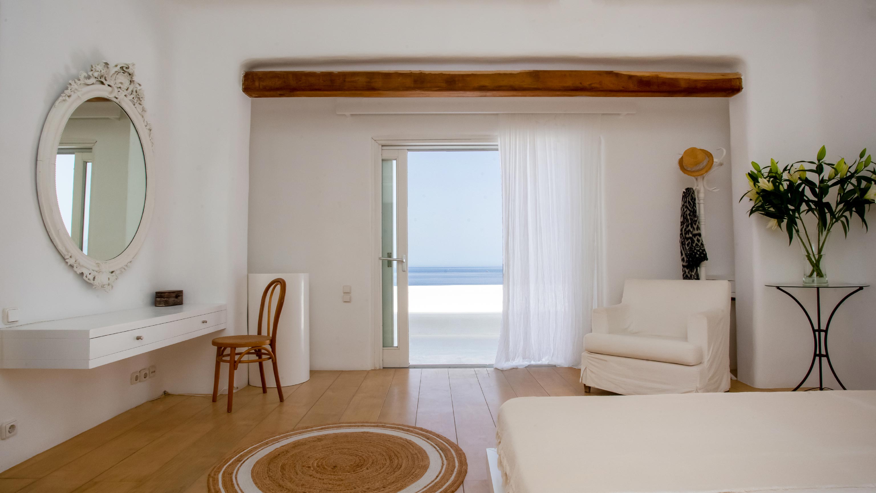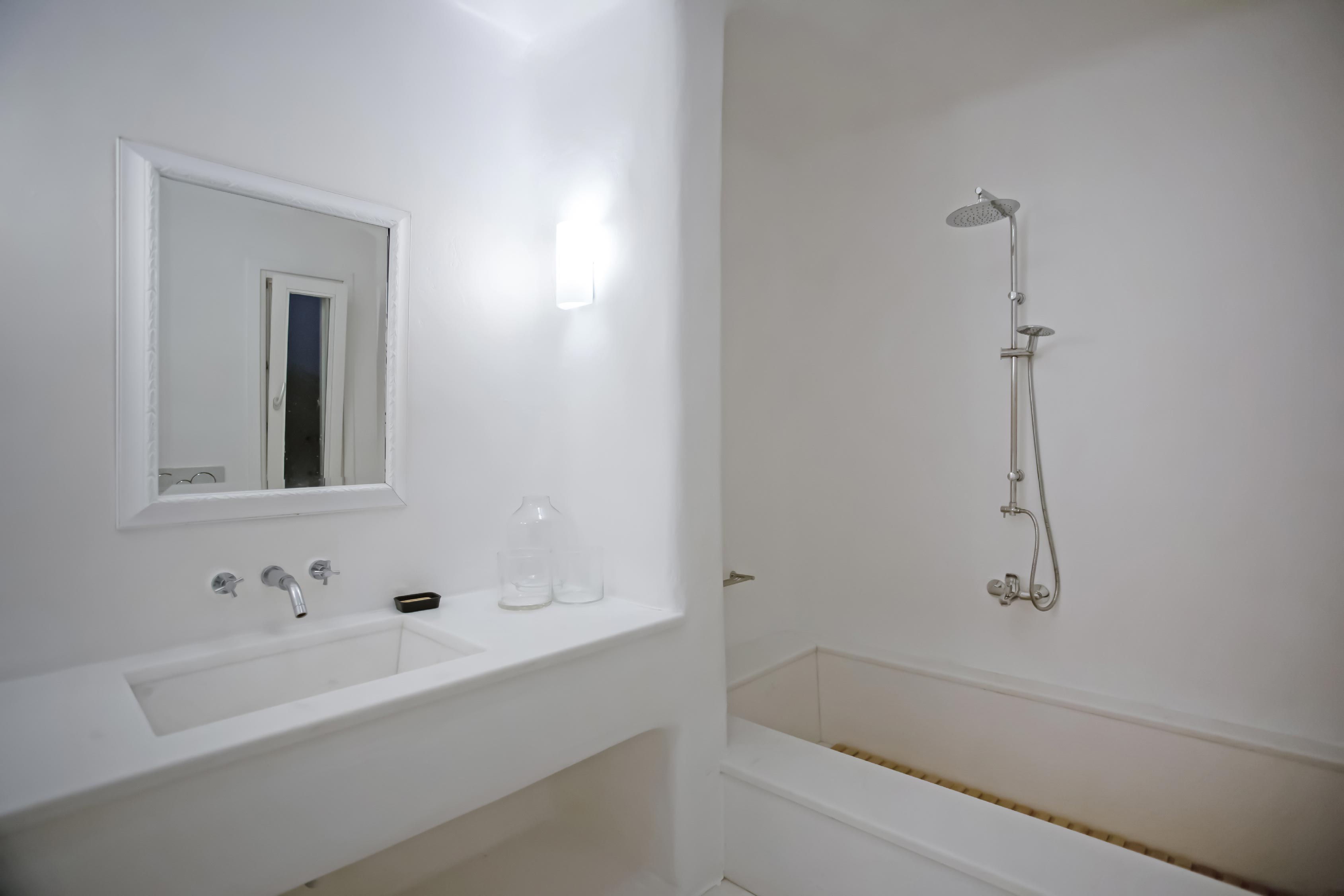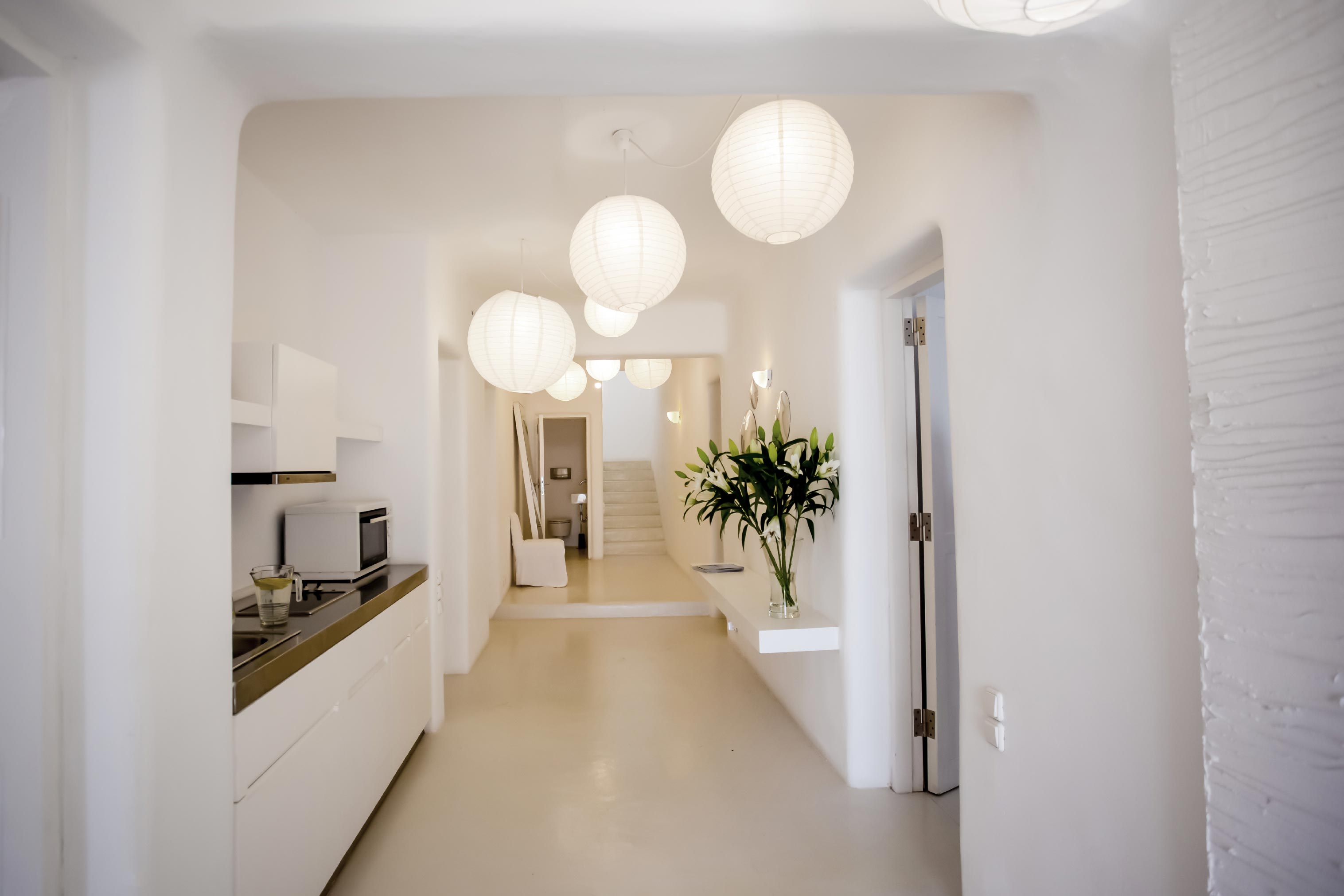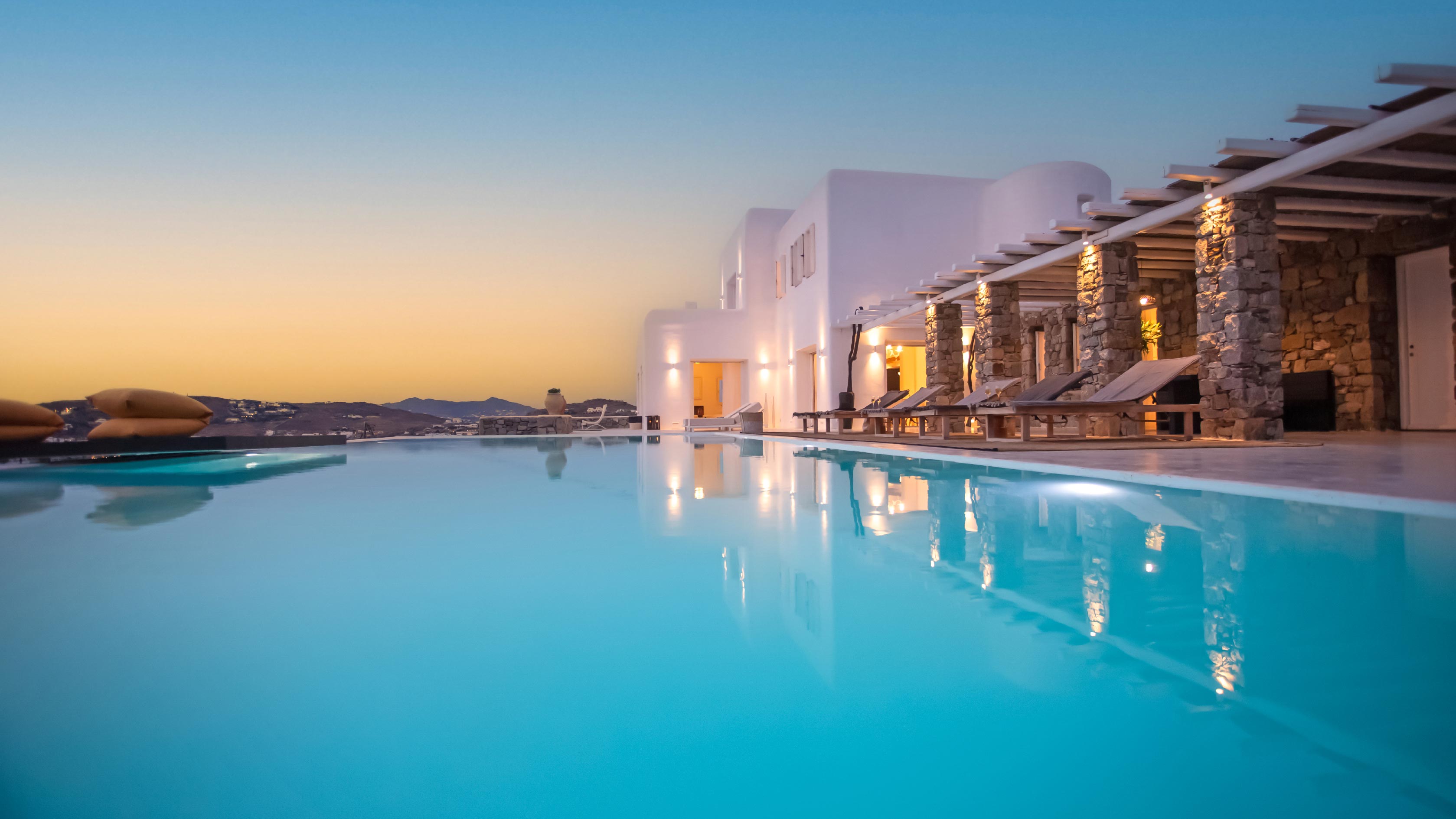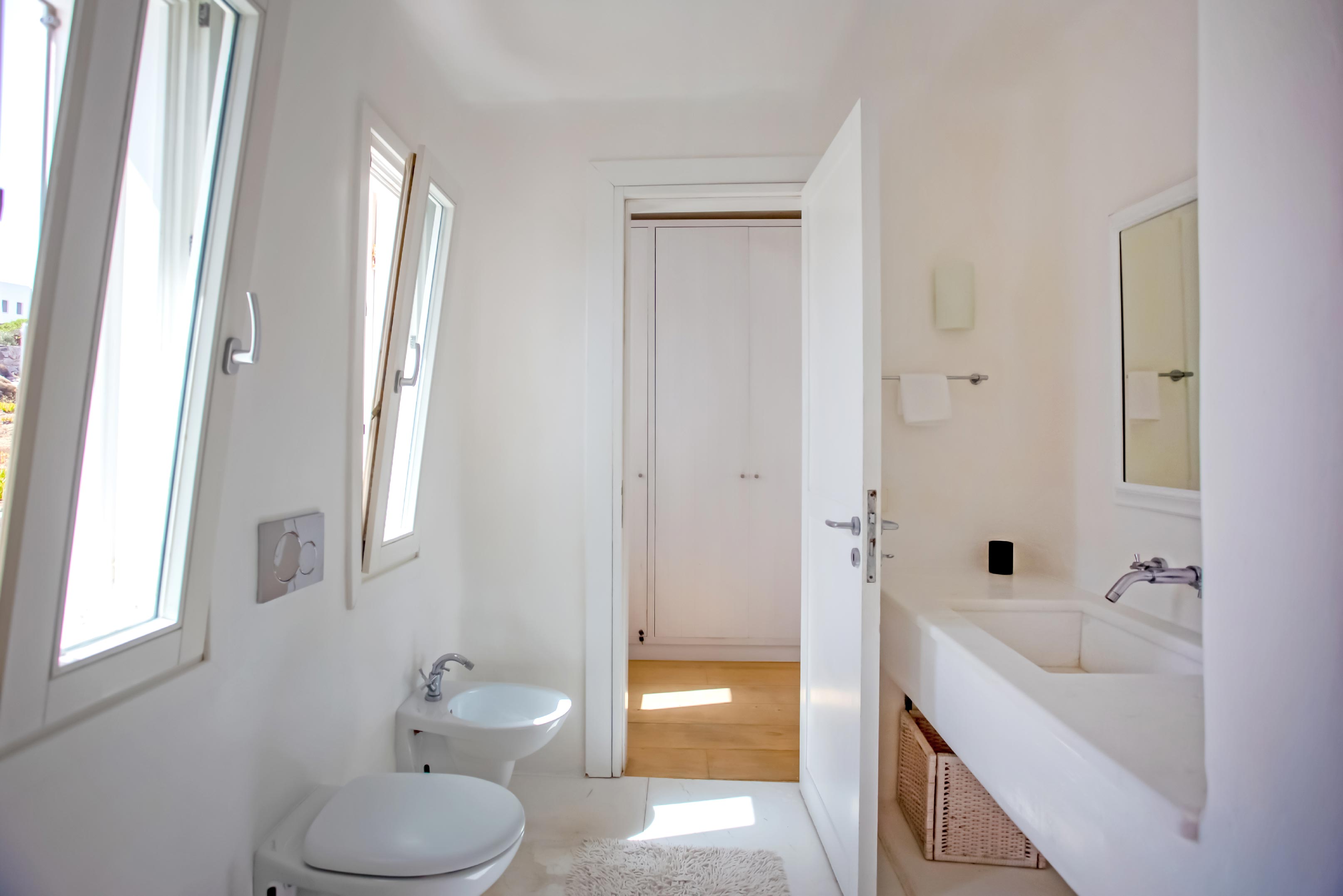 The exterior of the house is quite impressive. The infinity swimming pool is located on the front side of the deck overlooking the sea. In addition, there is the shaded dinging area where guests can enjoy a homemade meal cooked in the BBQ. When the sun sets, it is the perfect timing to prepare a cocktail and sit with your friends in the lounge area. Overall, the Villa features a sophisticated interior with touches of the contemporary Myconian style.