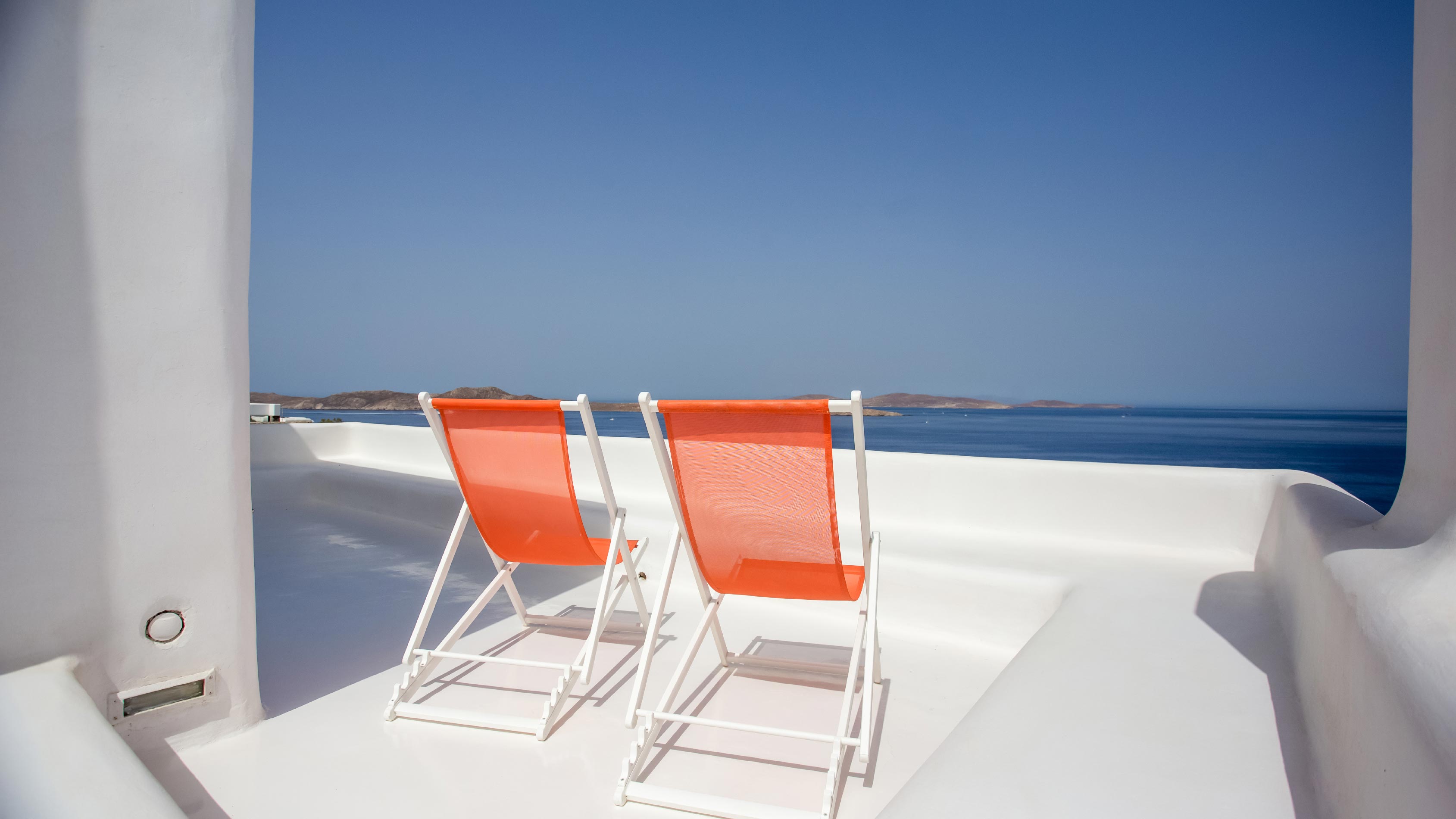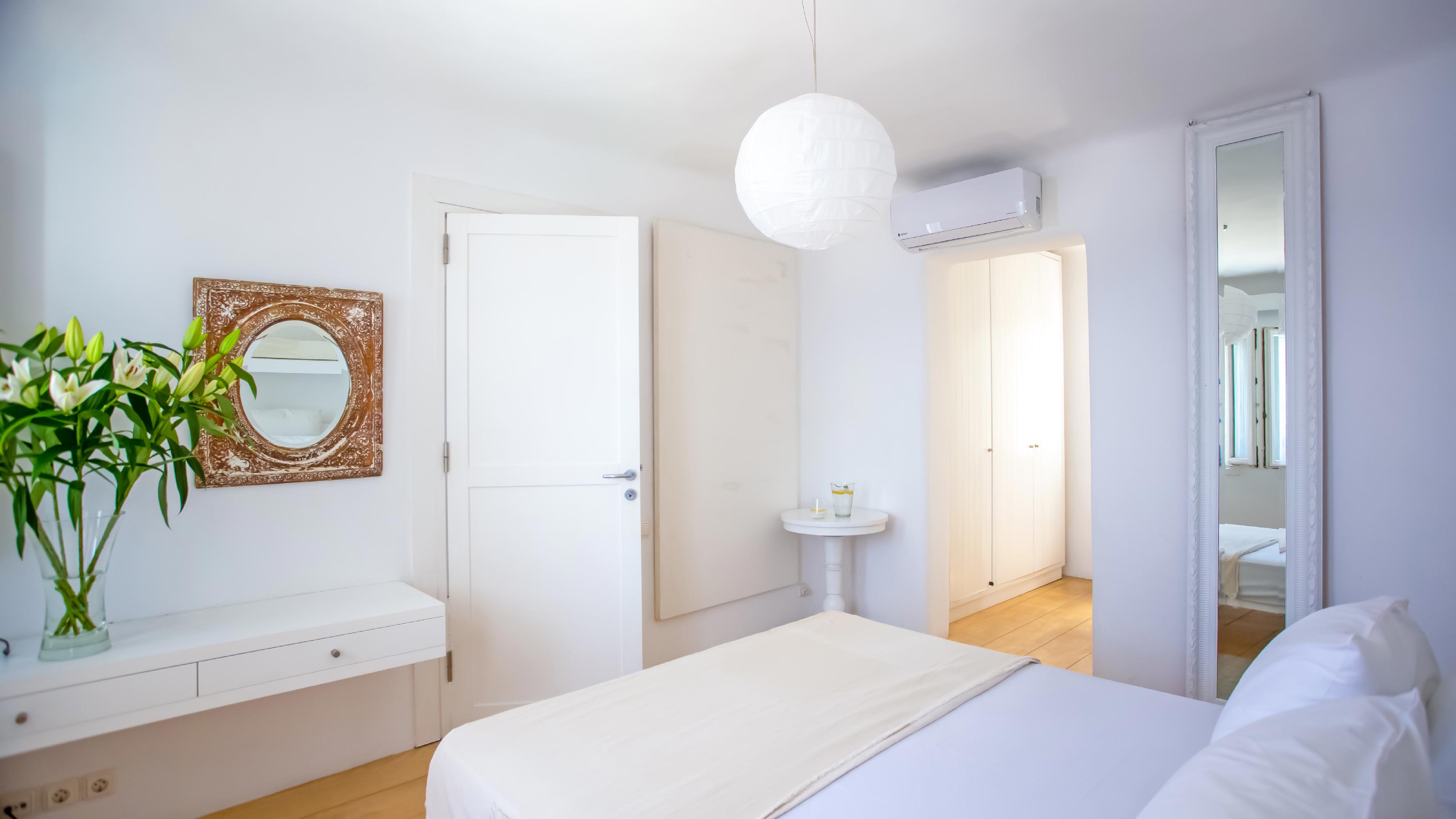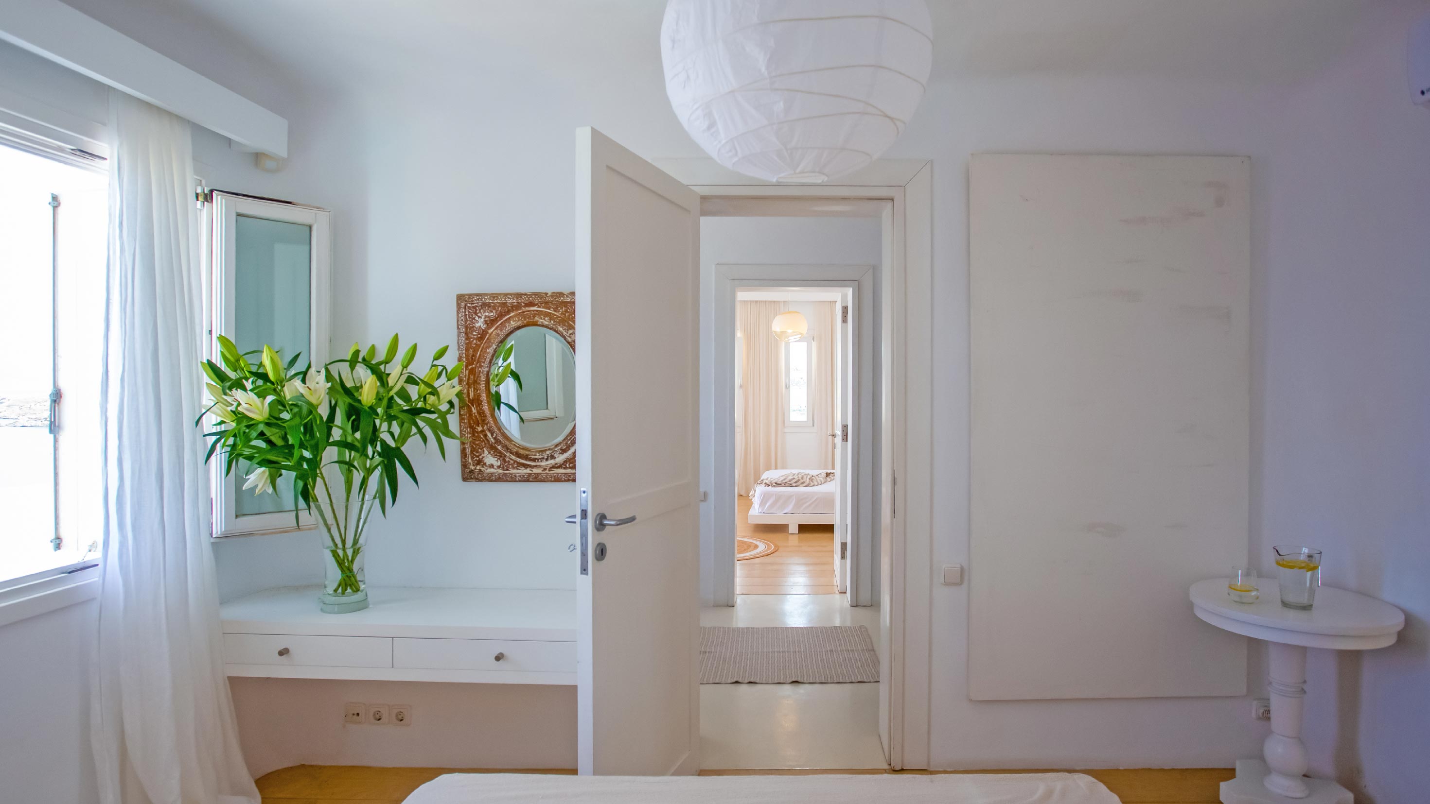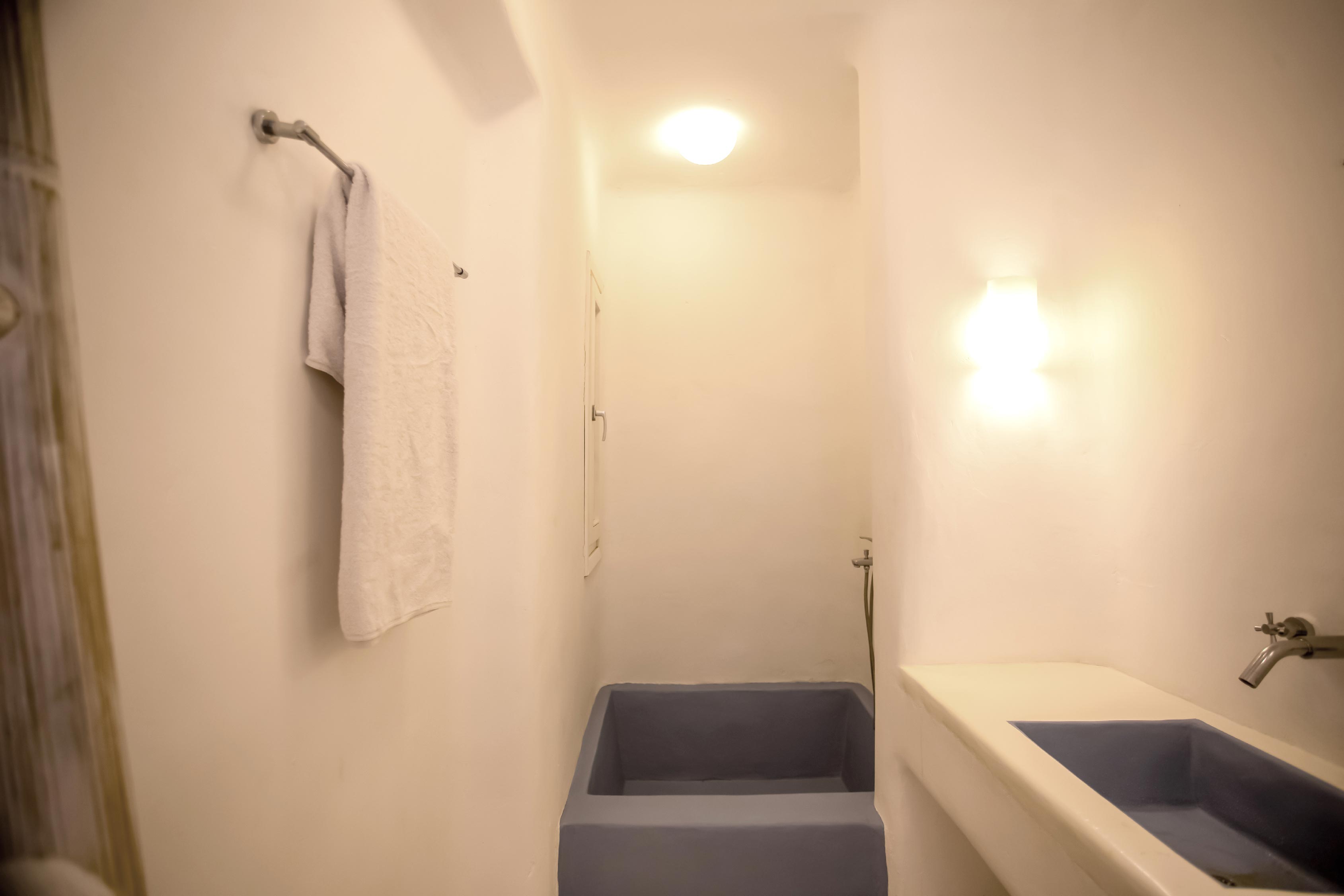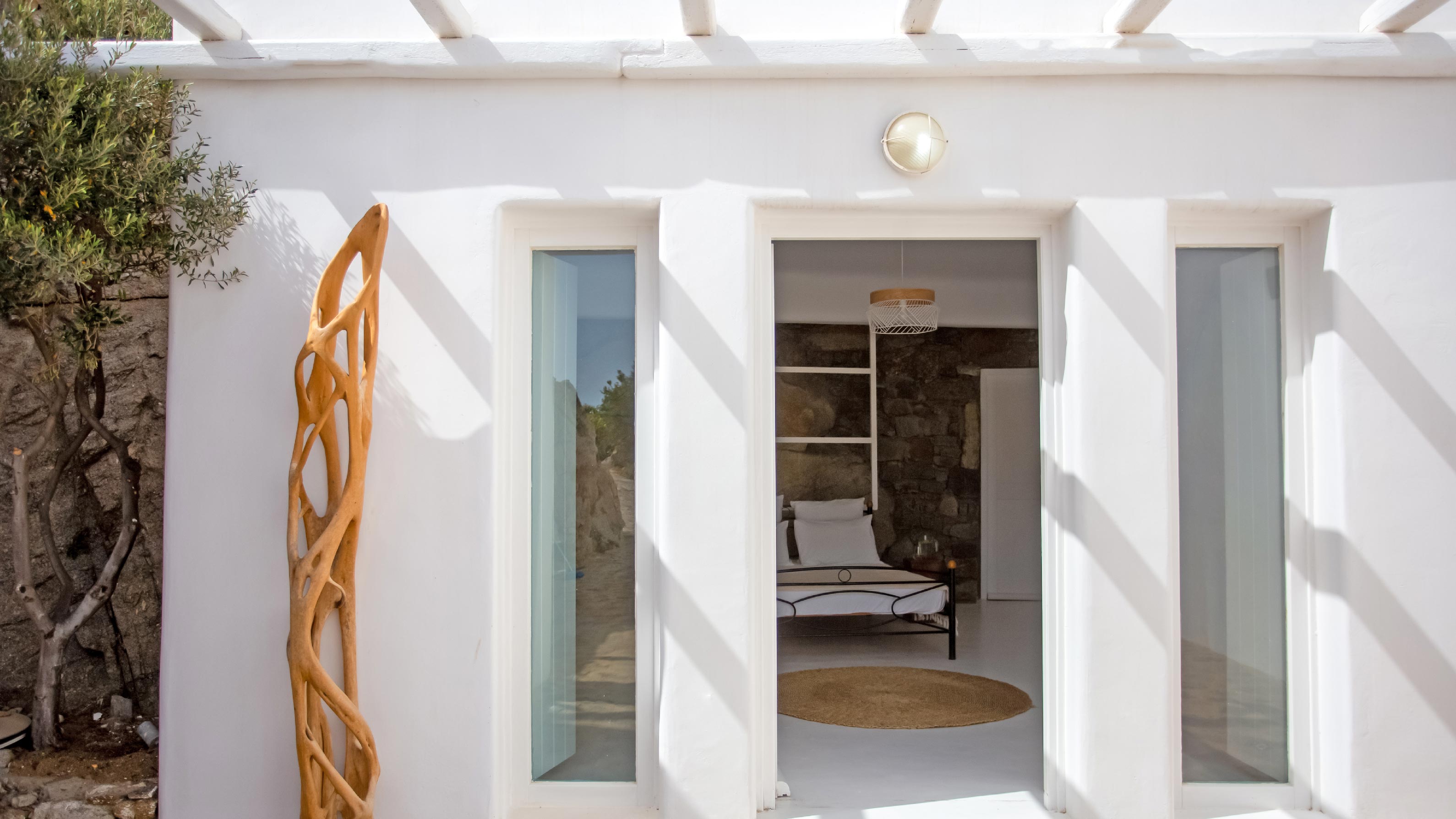The exterior of the house is quite impressive. The infinity swimming pool is located on the front side of the deck overlooking the sea. In addition, there is the shaded dinging area where guests can enjoy a homemade meal cooked in the BBQ. When the sun sets, it is the perfect timing to prepare a cocktail and sit with your friends in the lounge area. Overall, the Villa features a sophisticated interior with touches of the contemporary Myconian style.