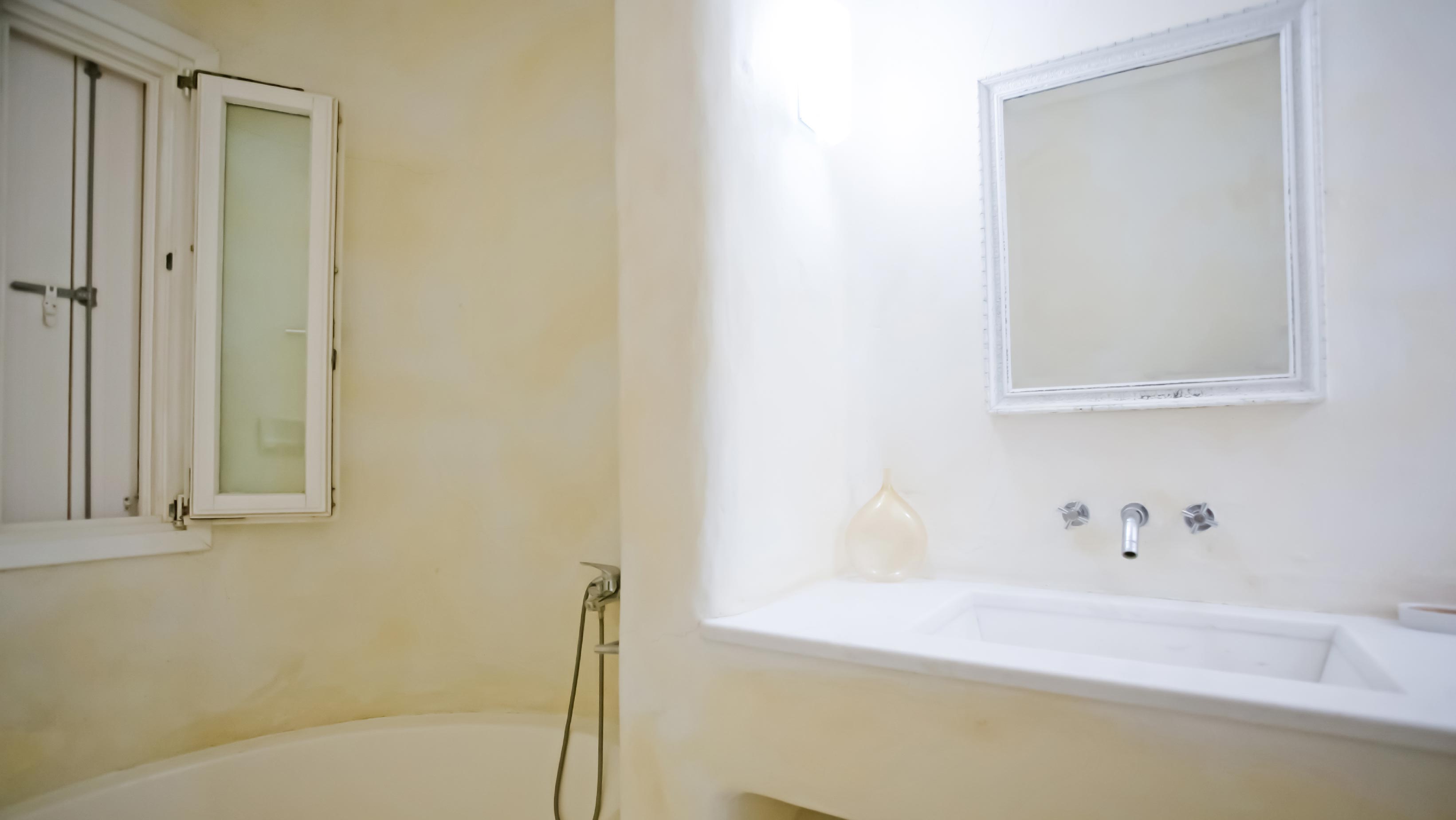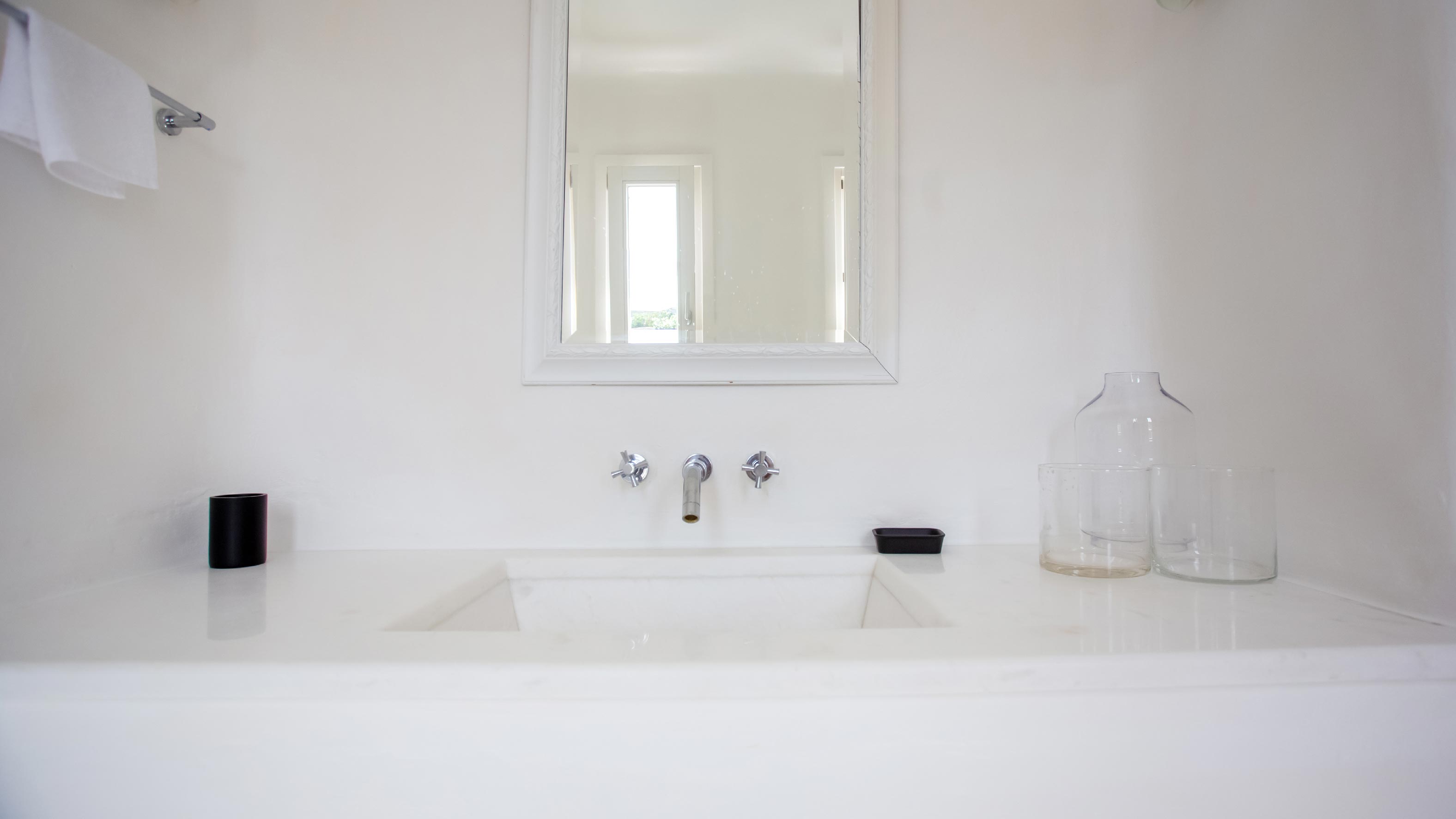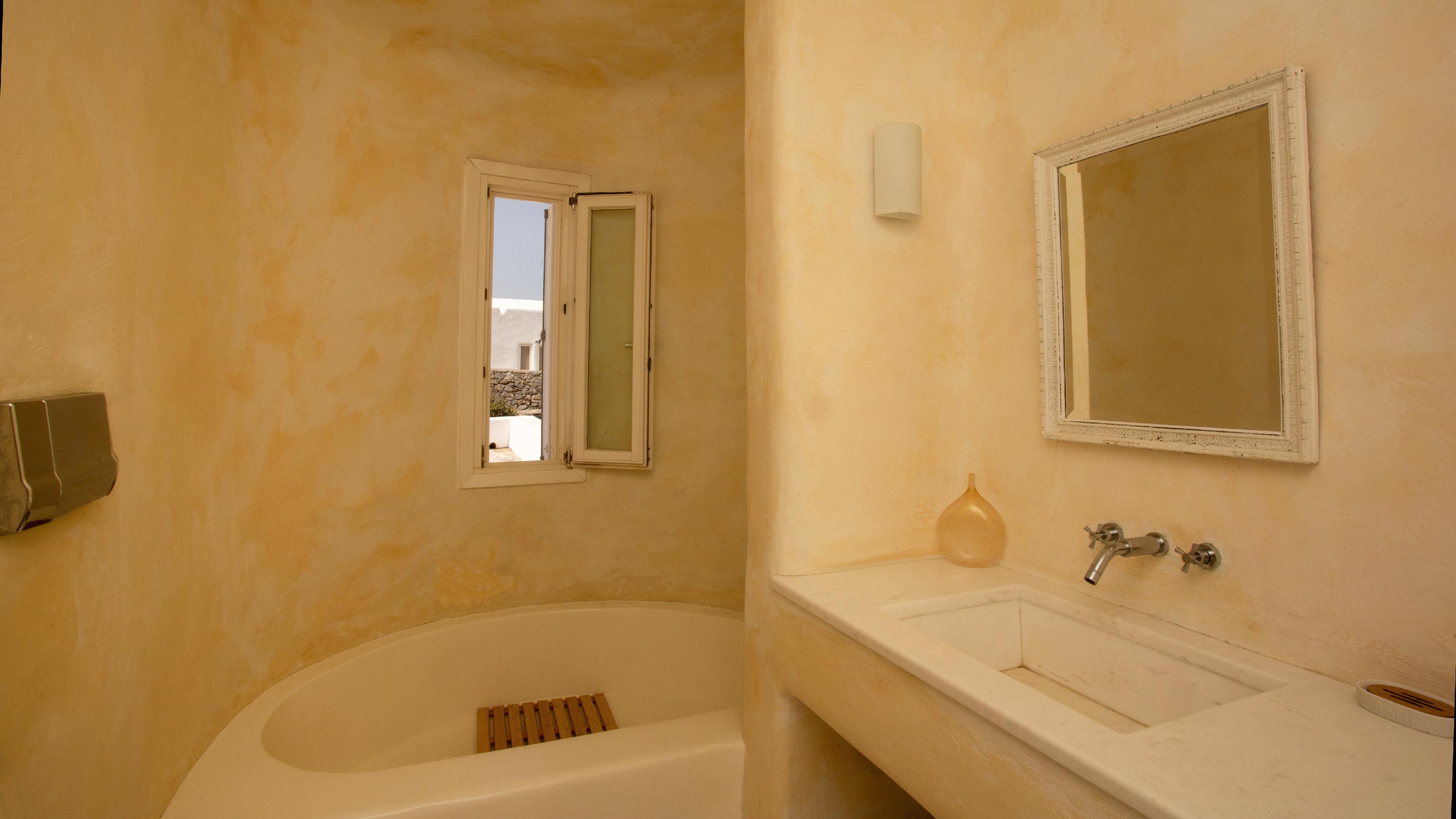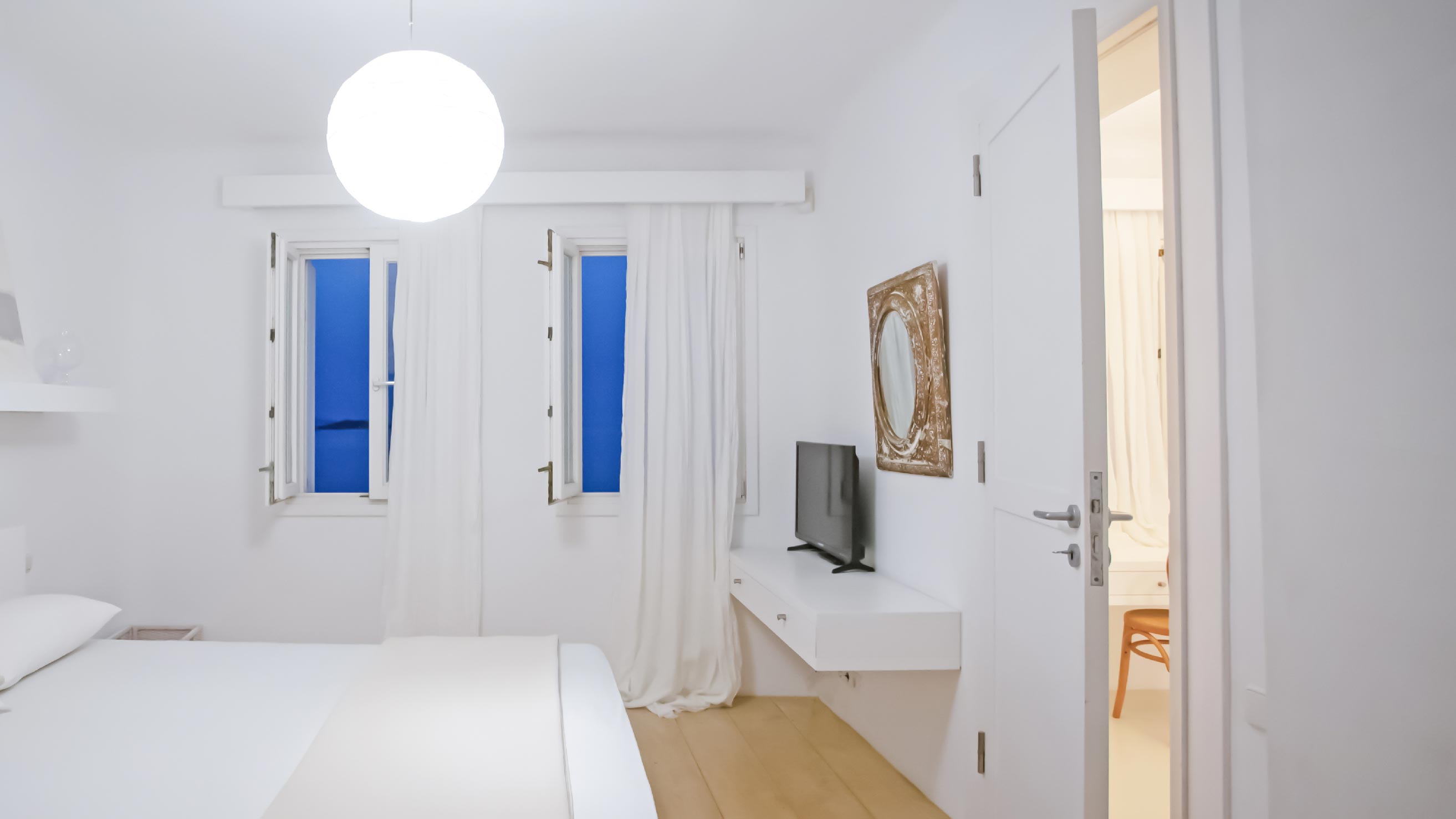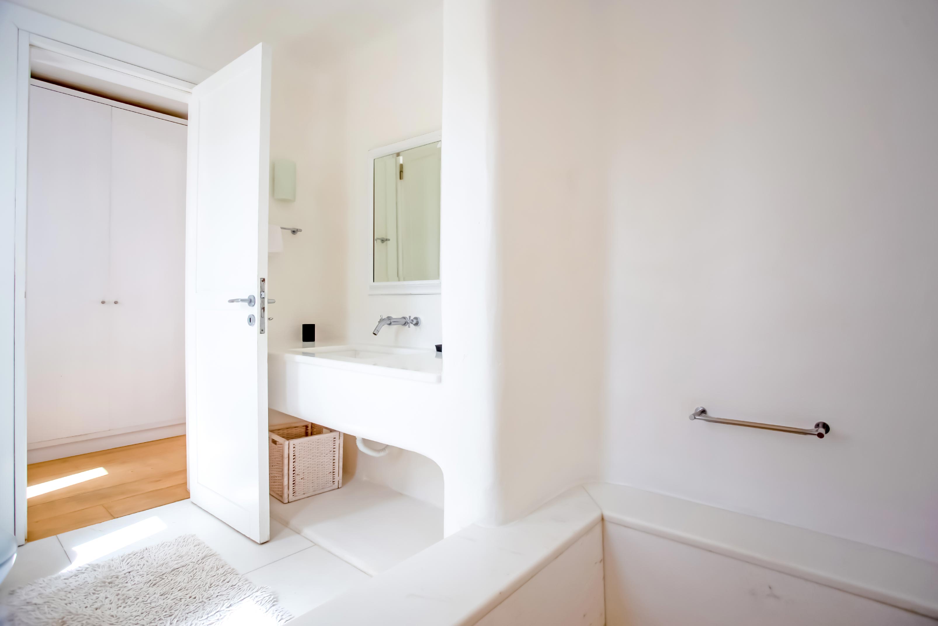 The exterior of the house is quite impressive. The infinity swimming pool is located on the front side of the deck overlooking the sea. In addition, there is the shaded dinging area where guests can enjoy a homemade meal cooked in the BBQ. When the sun sets, it is the perfect timing to prepare a cocktail and sit with your friends in the lounge area. Overall, the Villa features a sophisticated interior with touches of the contemporary Myconian style.