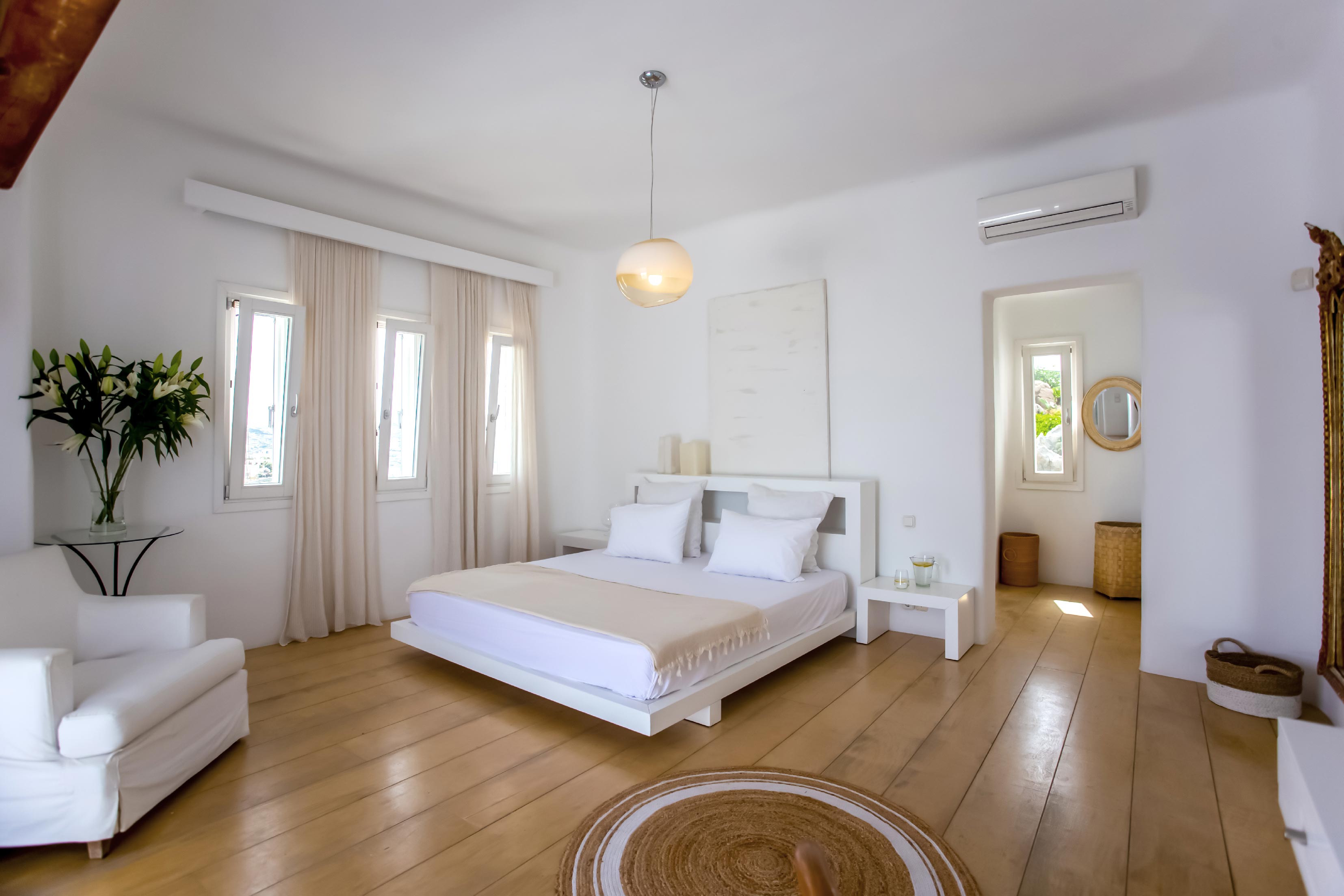 This is a luxury 5-bedroom Villa in Mykonos, showcasing Cycladic elegance. Located high above the cliffs of Agios Ioannis, the Villa offers breathtaking views of the Aegean Sea and Delos Island. Extending in 3 floors, it features 5 en-suite bedrooms and common areas, to host comfortably up to 10 guests. In more detail, the ground floor includes 2 Master bedrooms with en-suite bathrooms. On the first level, there are all the common areas along with 1 Suite with en-suite bathroom. As for the second floor, it features 1 Master en-suite bedroom with private terrace and 1 double en-suite bedroom.