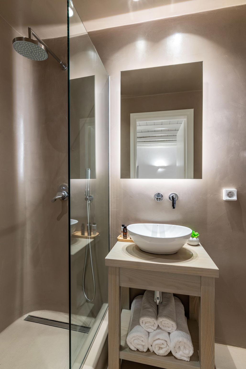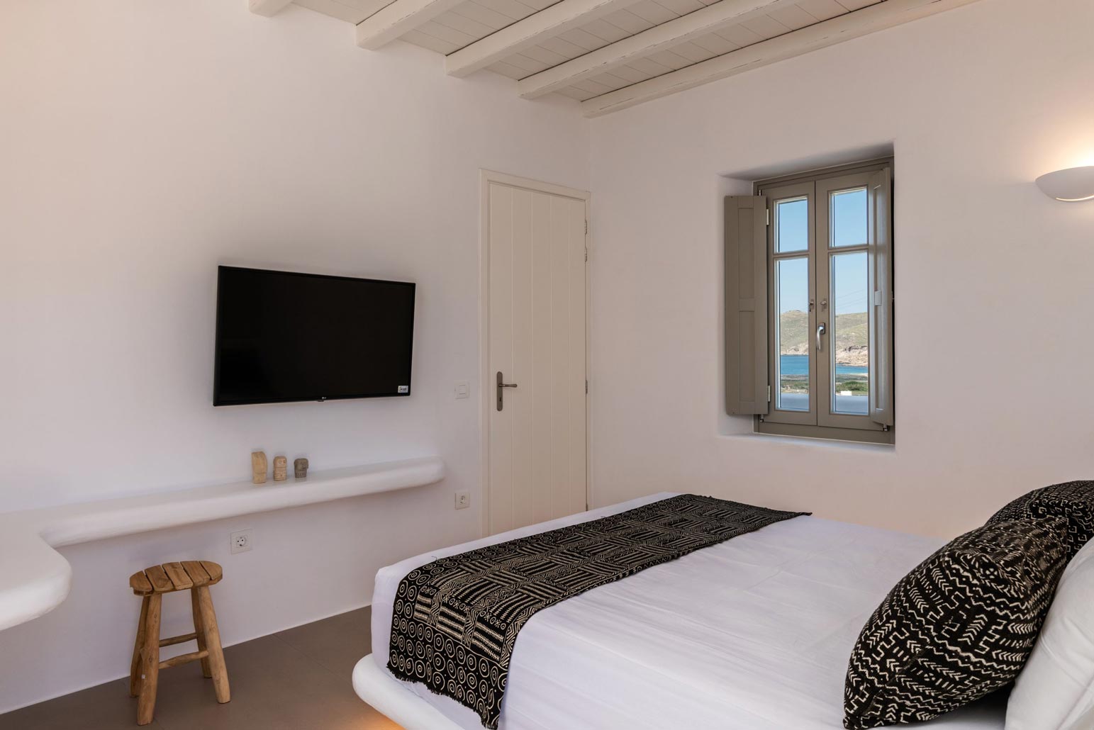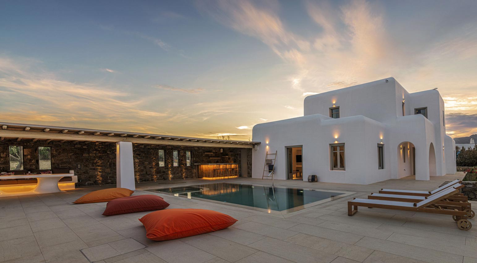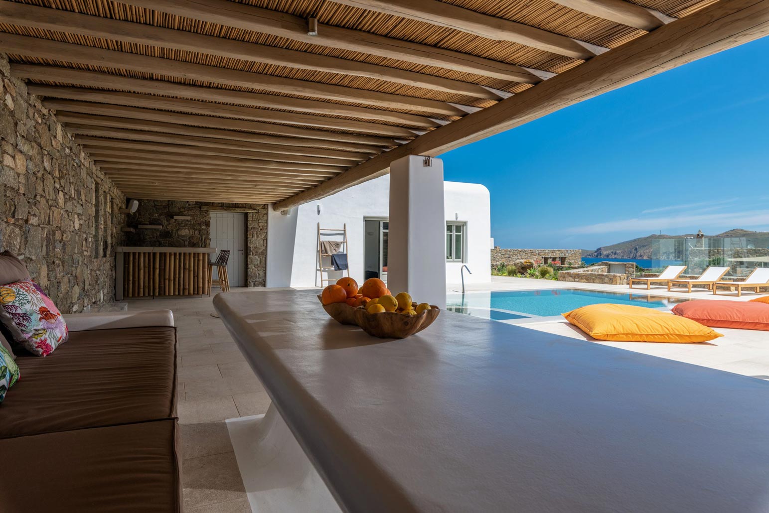 Villa Calypso s a brand new villa , which was built in 2019. The Property extends on a large plot of 1200m2 overlooking the northern Aegean Sea. The villa is located above Ftelia beach , 7 mins from Mykonos town.Villa Calypso provides 4 en-suite bedrooms and can comfortably accommodate 8 guests. It is divided into 2 sections.