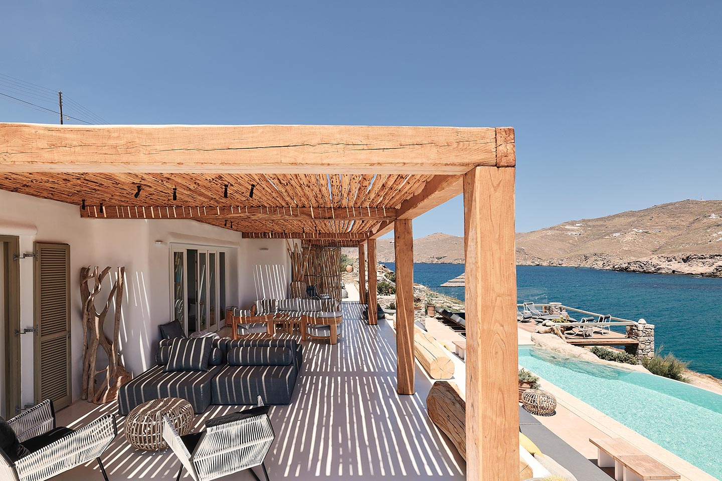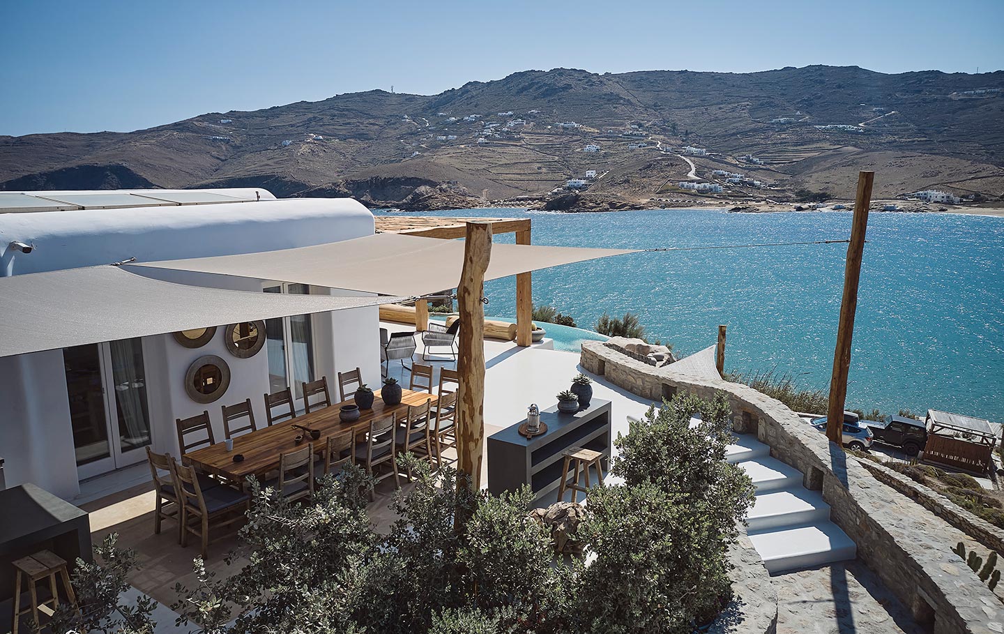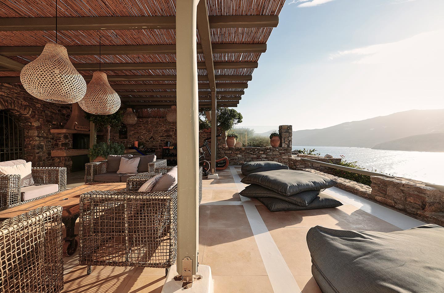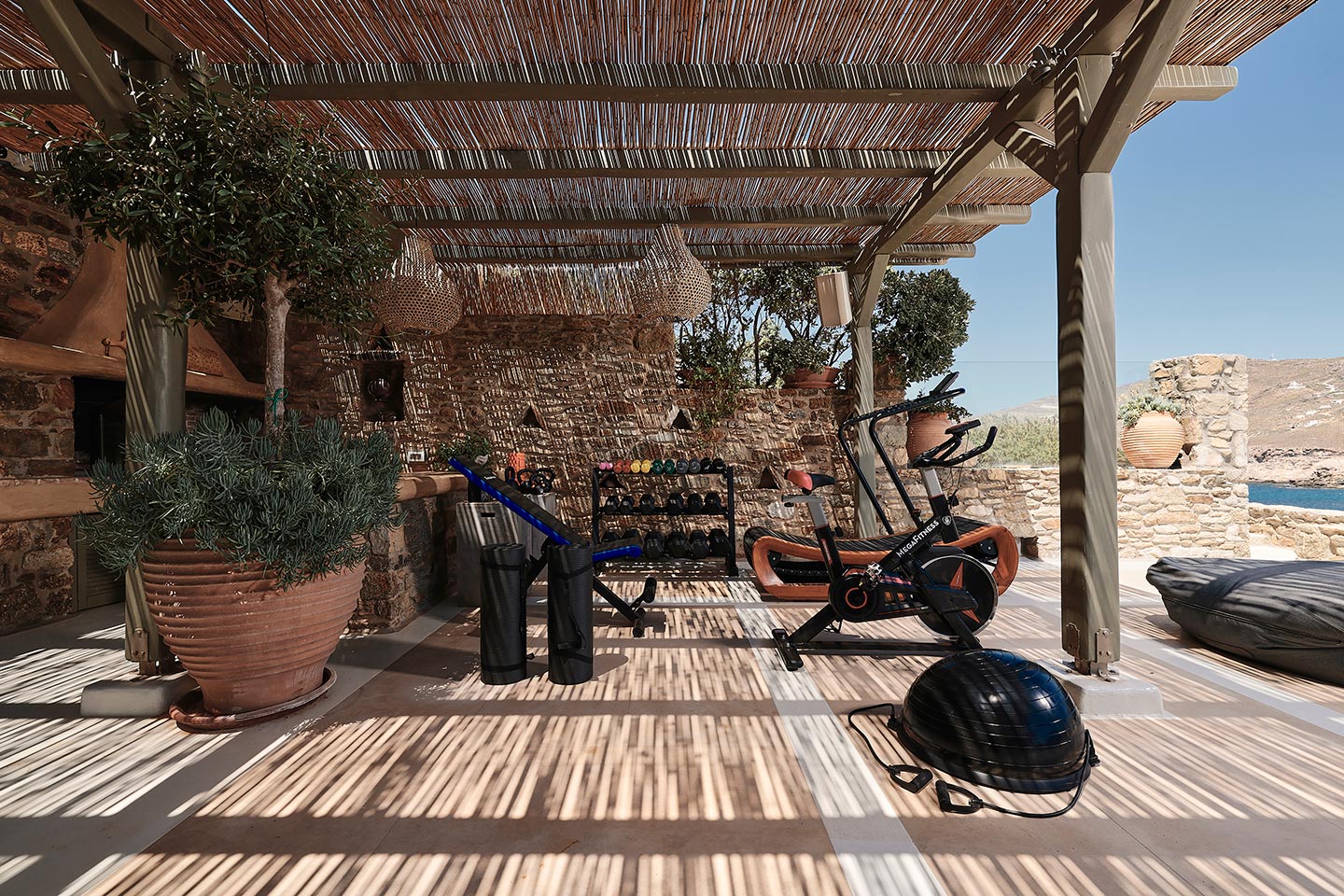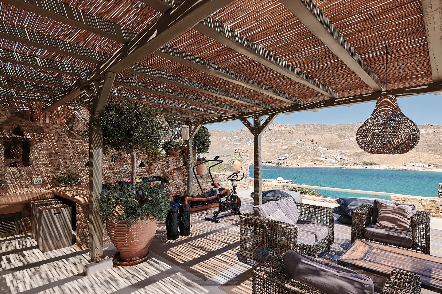 At the same time, it invites guests to unwind on the multiple lounge areas and the BBQ/dining area of the expansive terrace and gives the opportunity to the most athletic ones to remain active at the outdoor gym area, while gazing at the crystal-clear Aegean waters.