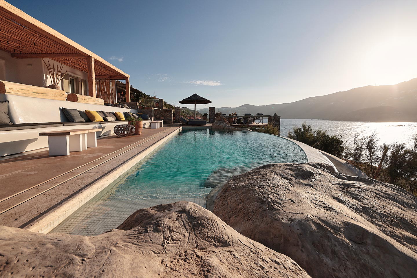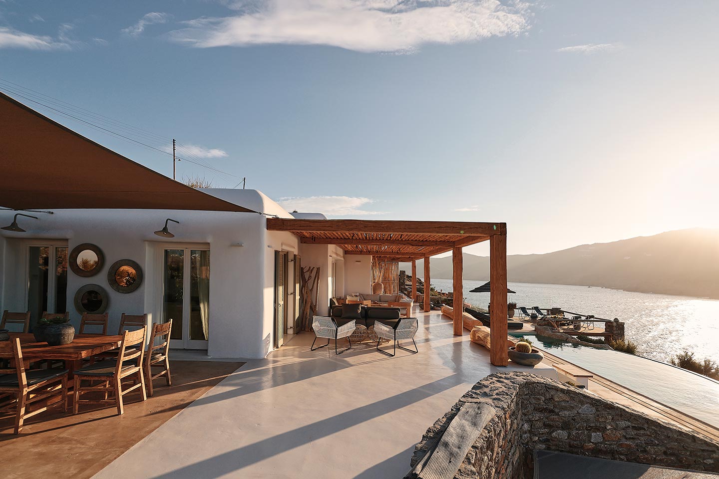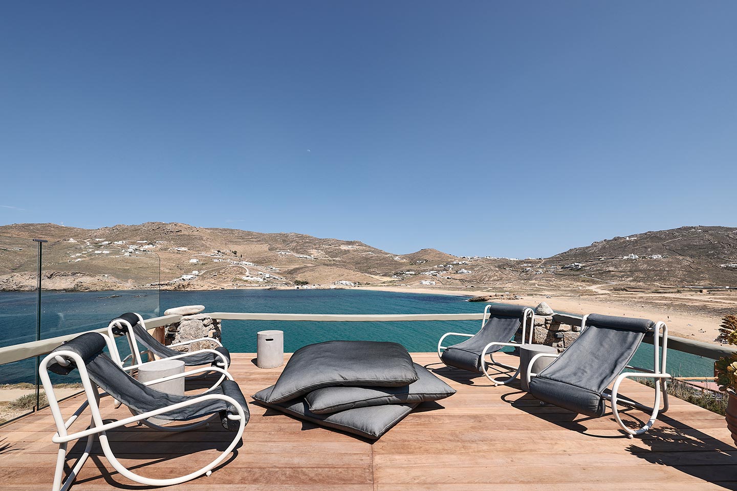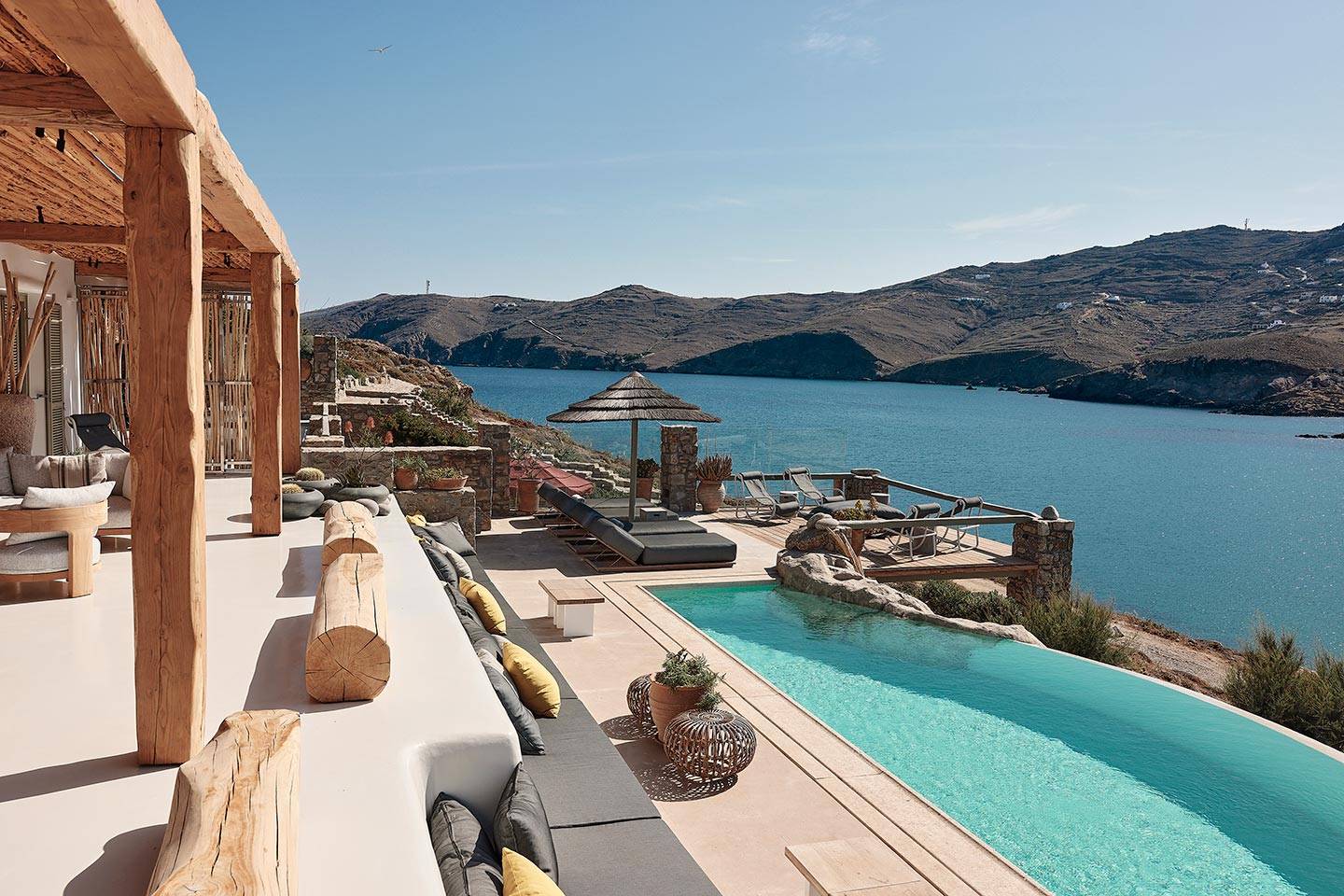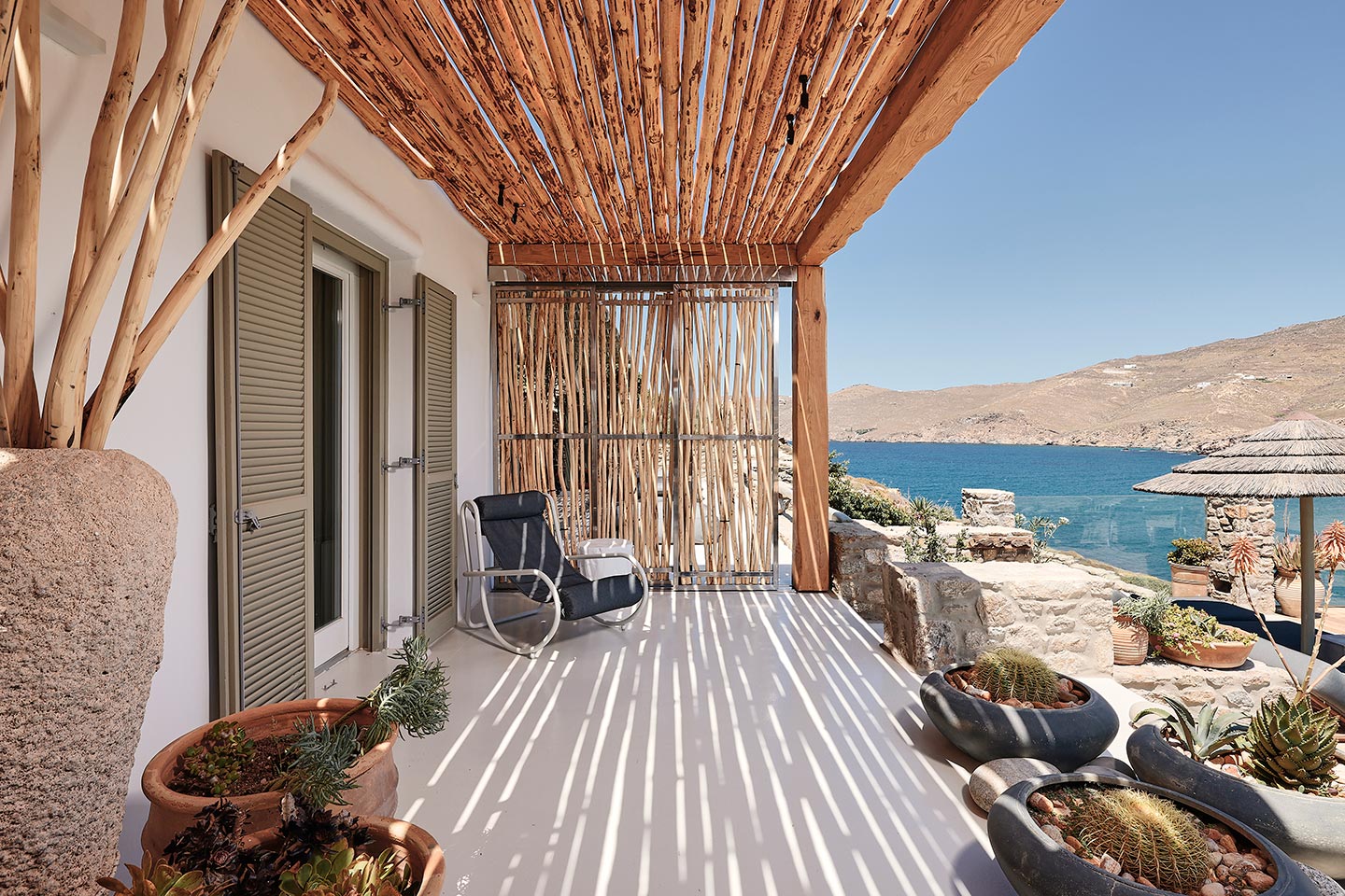 At the same time, it invites guests to unwind on the multiple lounge areas and the BBQ/dining area of the expansive terrace and gives the opportunity to the most athletic ones to remain active at the outdoor gym area, while gazing at the crystal-clear Aegean waters.