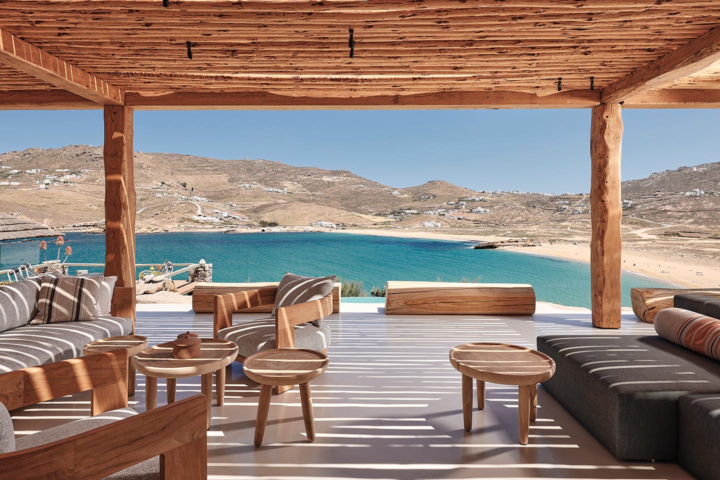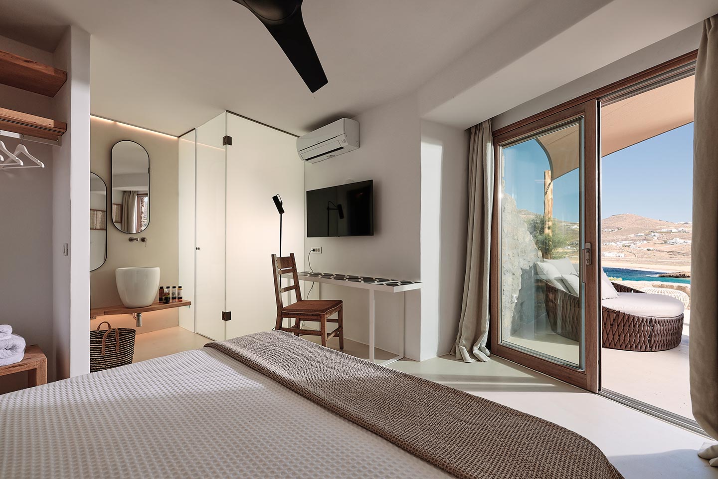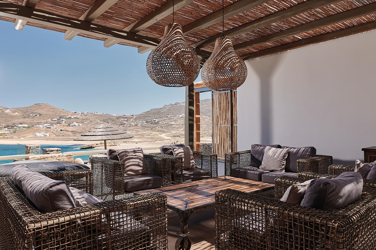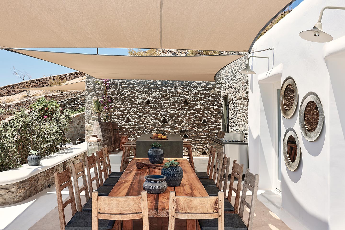 At the same time, it invites guests to unwind on the multiple lounge areas and the BBQ/dining area of the expansive terrace and gives the opportunity to the most athletic ones to remain active at the outdoor gym area, while gazing at the crystal-clear Aegean waters.