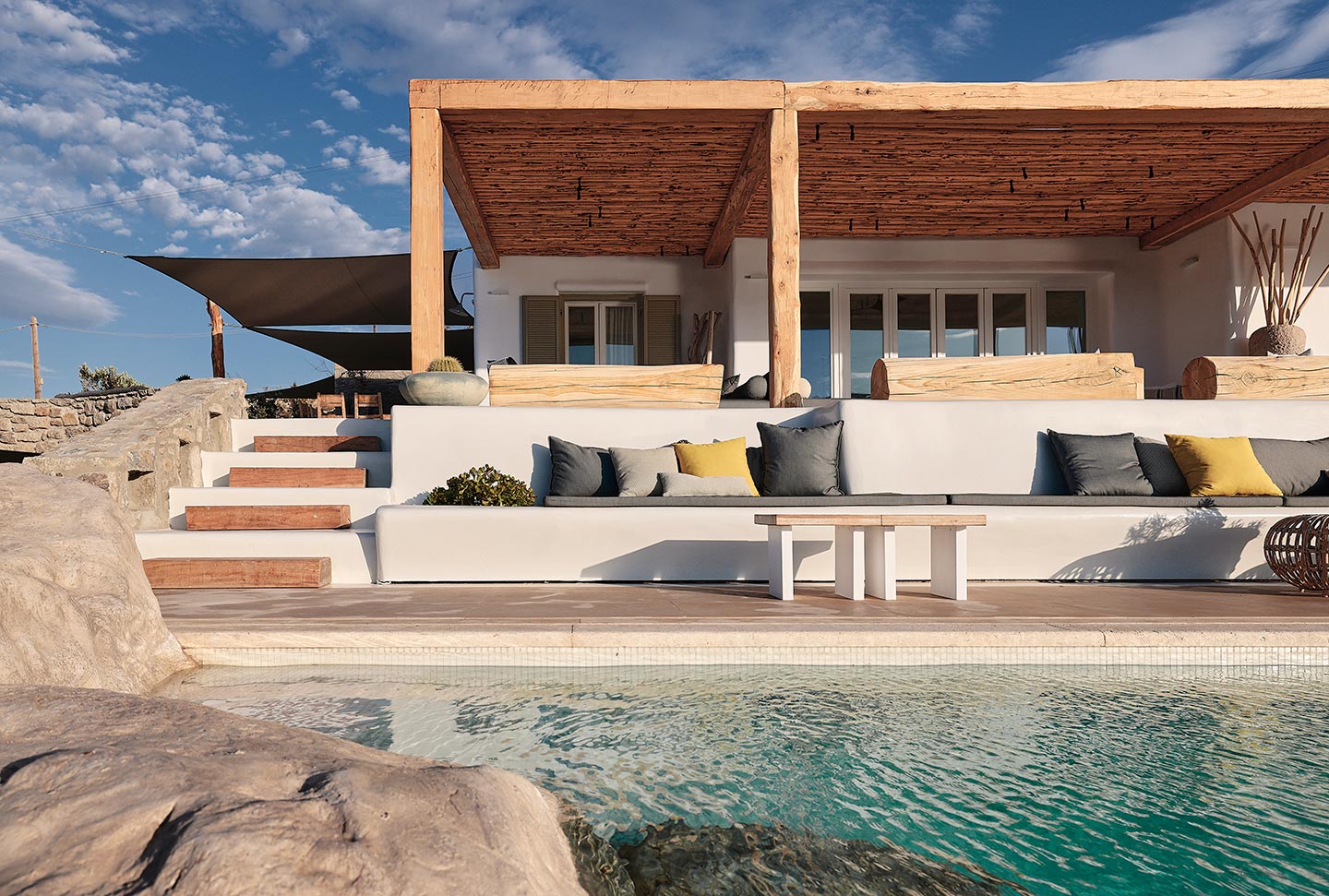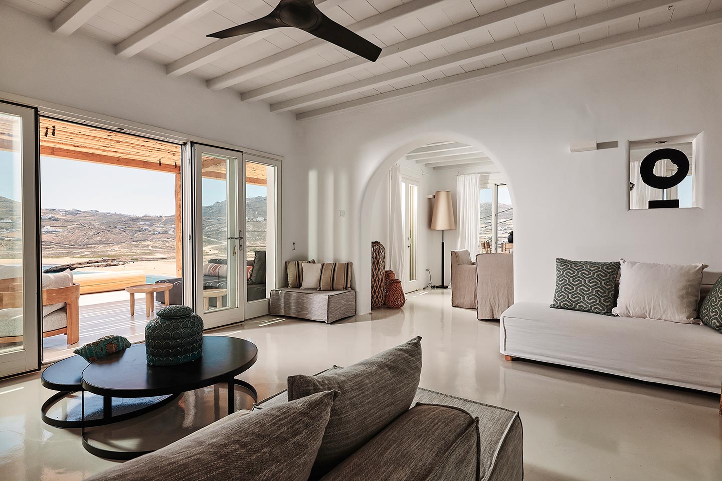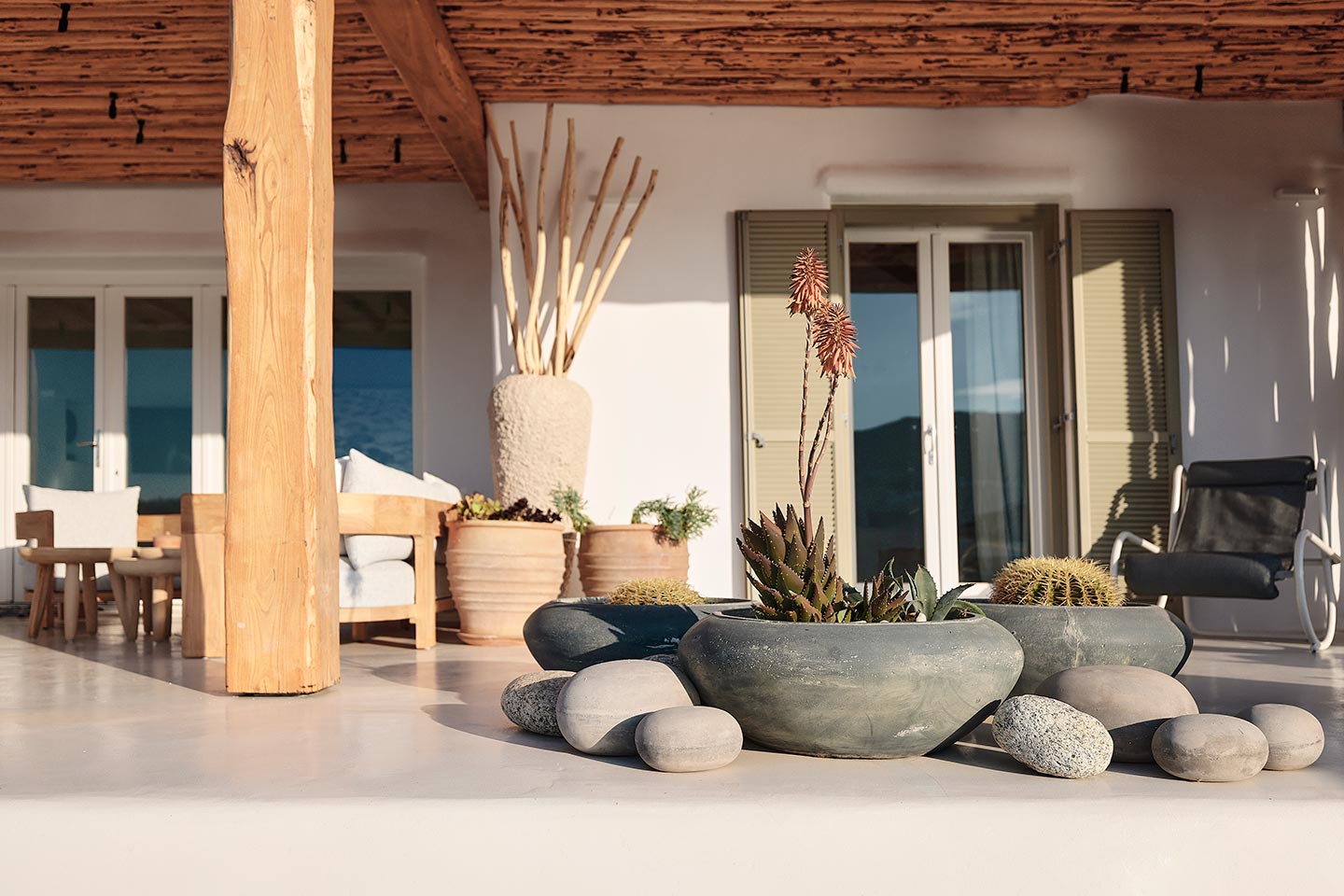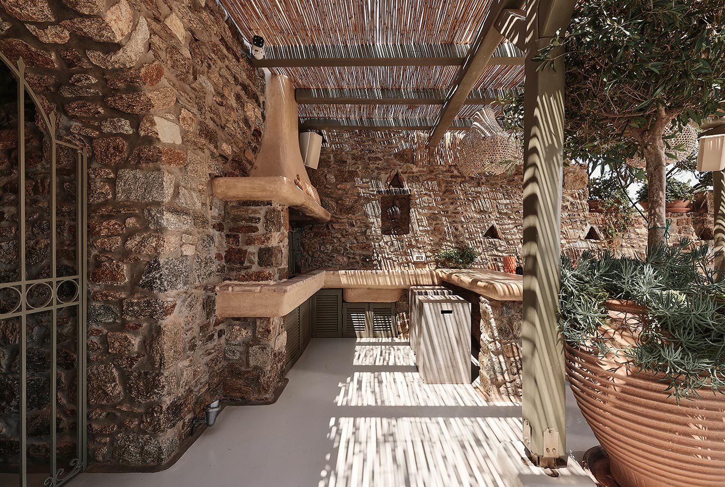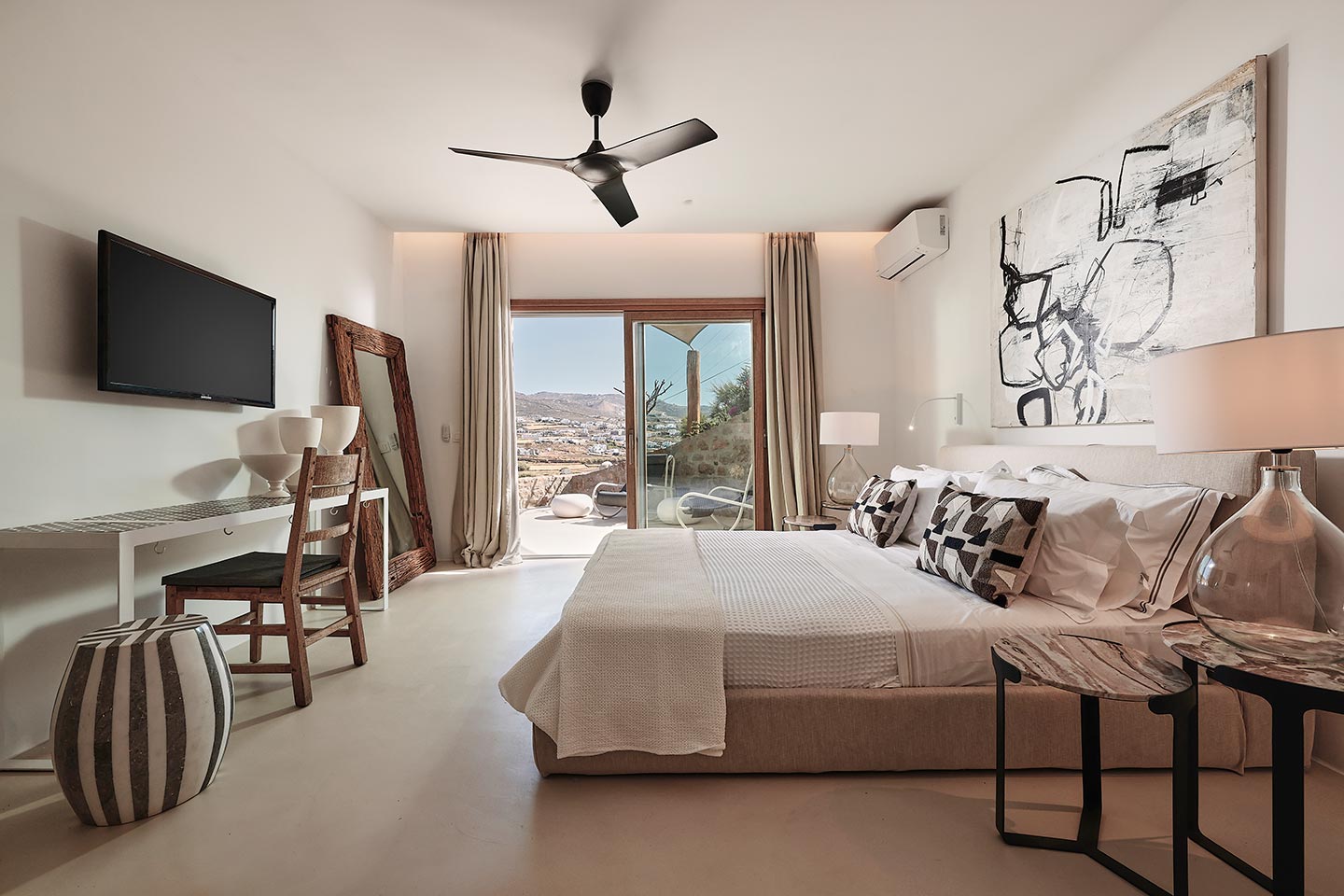 At the same time, it invites guests to unwind on the multiple lounge areas and the BBQ/dining area of the expansive terrace and gives the opportunity to the most athletic ones to remain active at the outdoor gym area, while gazing at the crystal-clear Aegean waters.