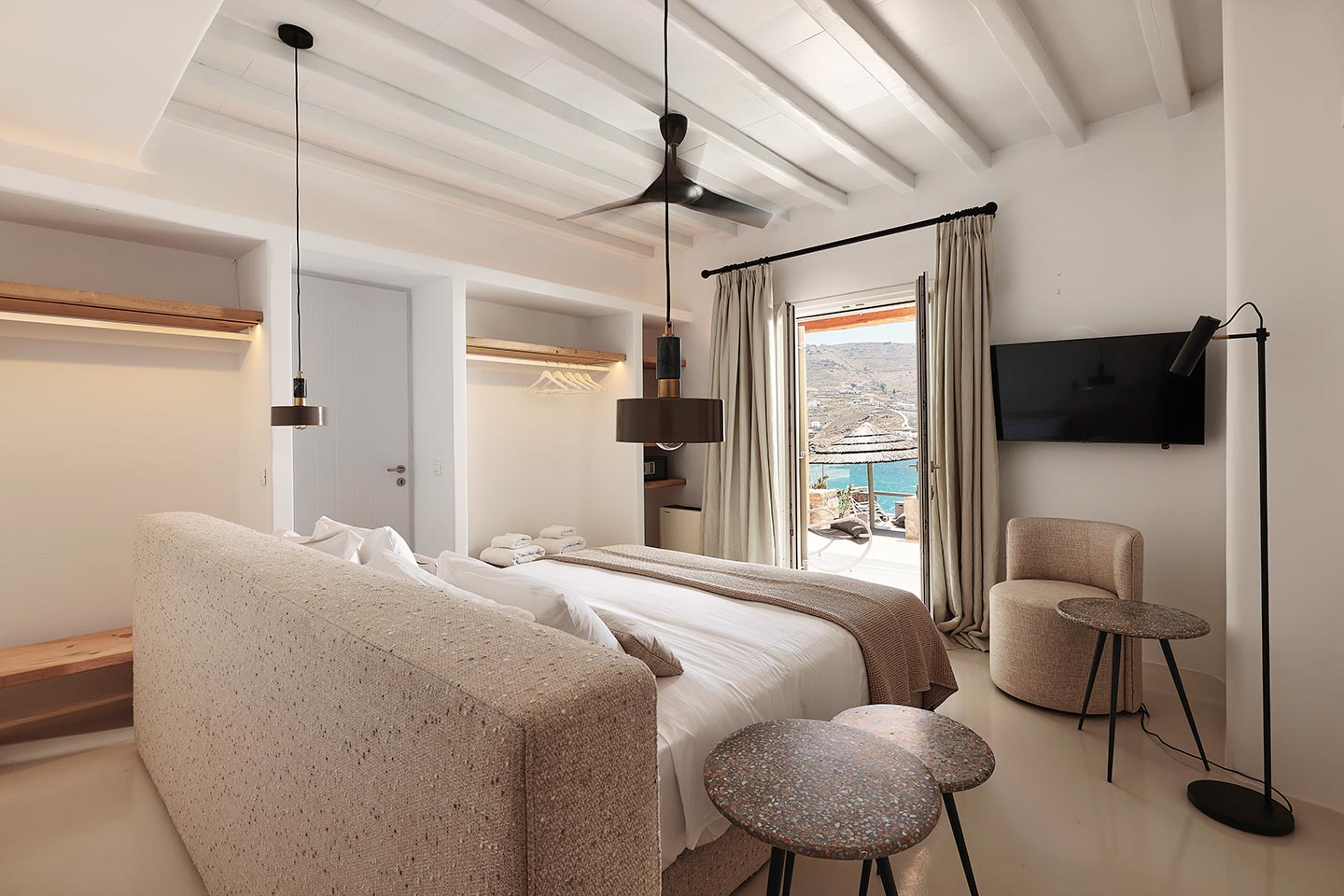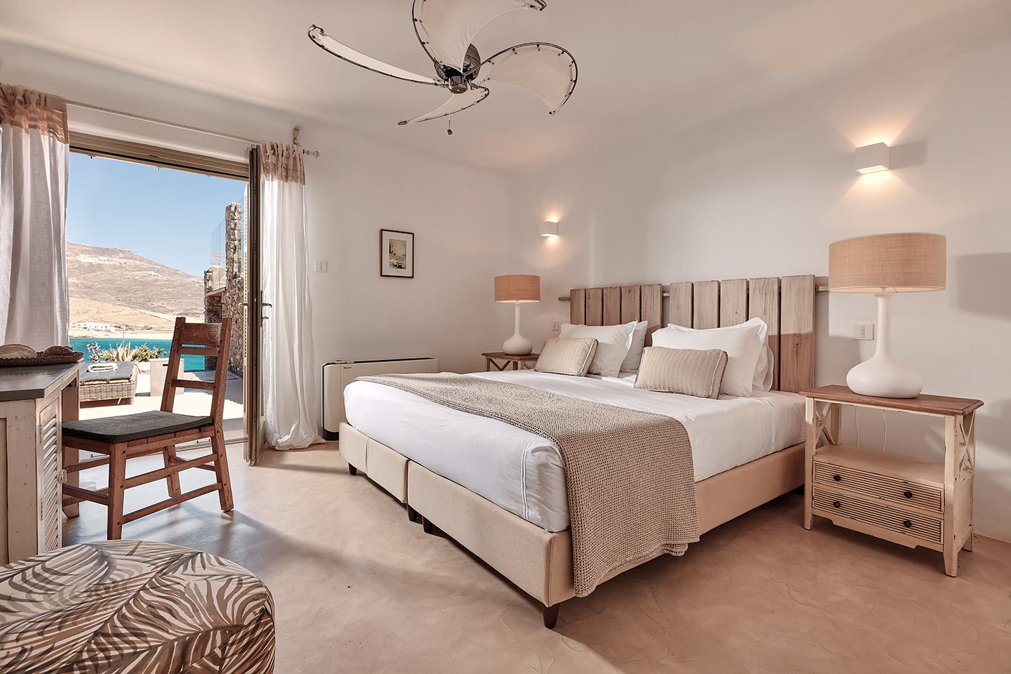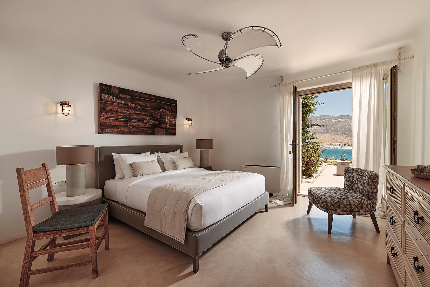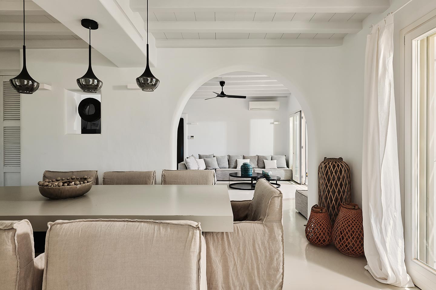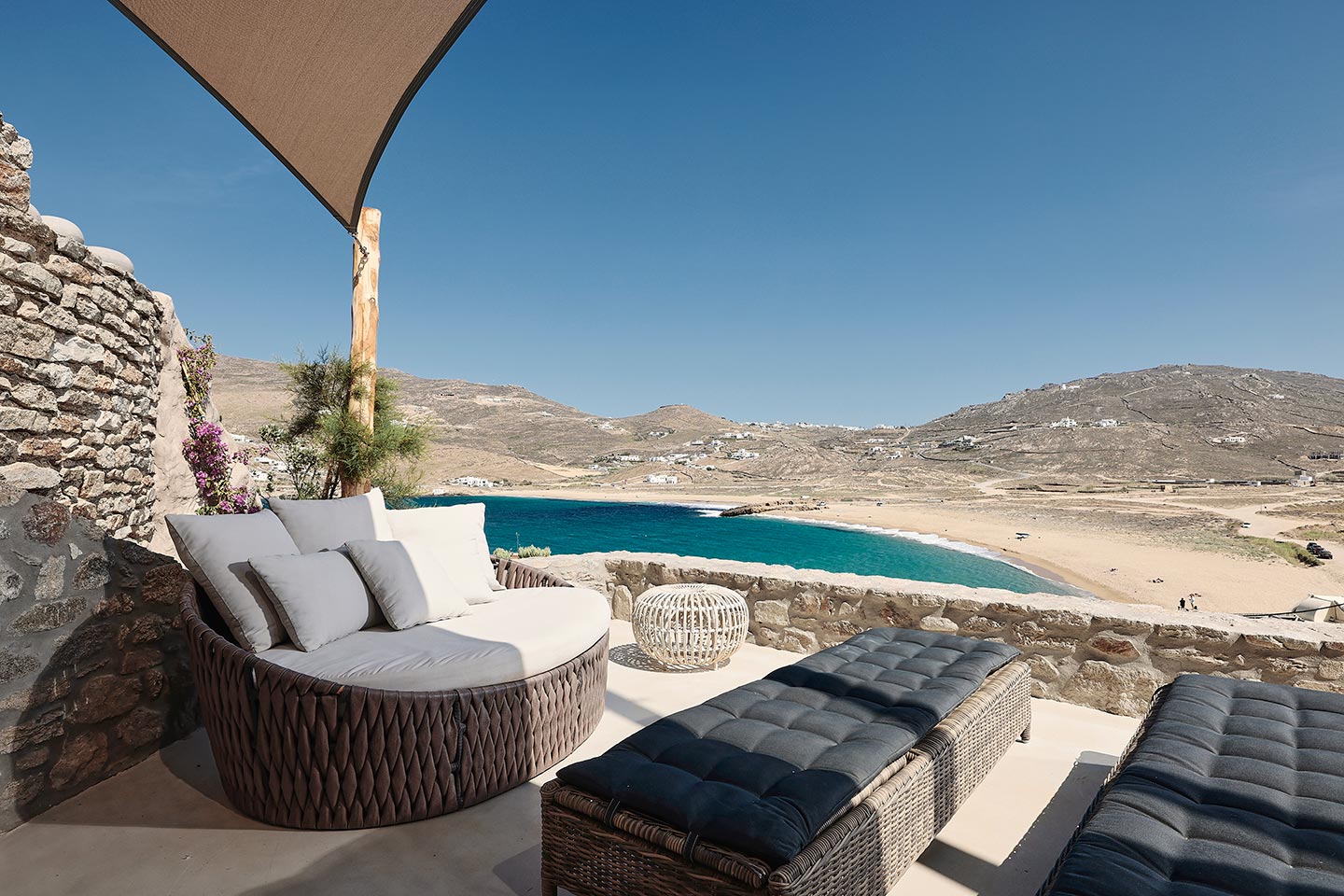 At the same time, it invites guests to unwind on the multiple lounge areas and the BBQ/dining area of the expansive terrace and gives the opportunity to the most athletic ones to remain active at the outdoor gym area, while gazing at the crystal-clear Aegean waters.