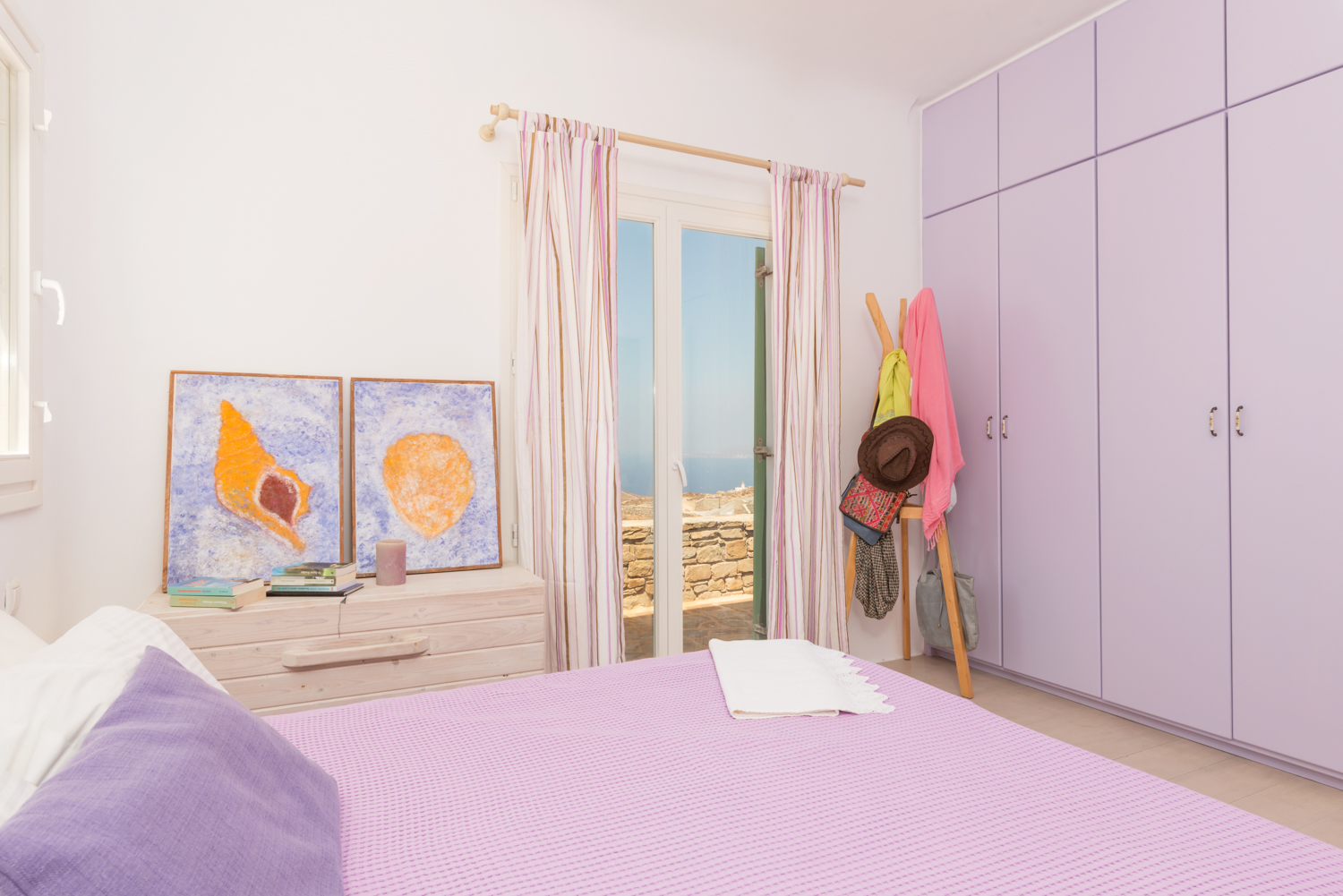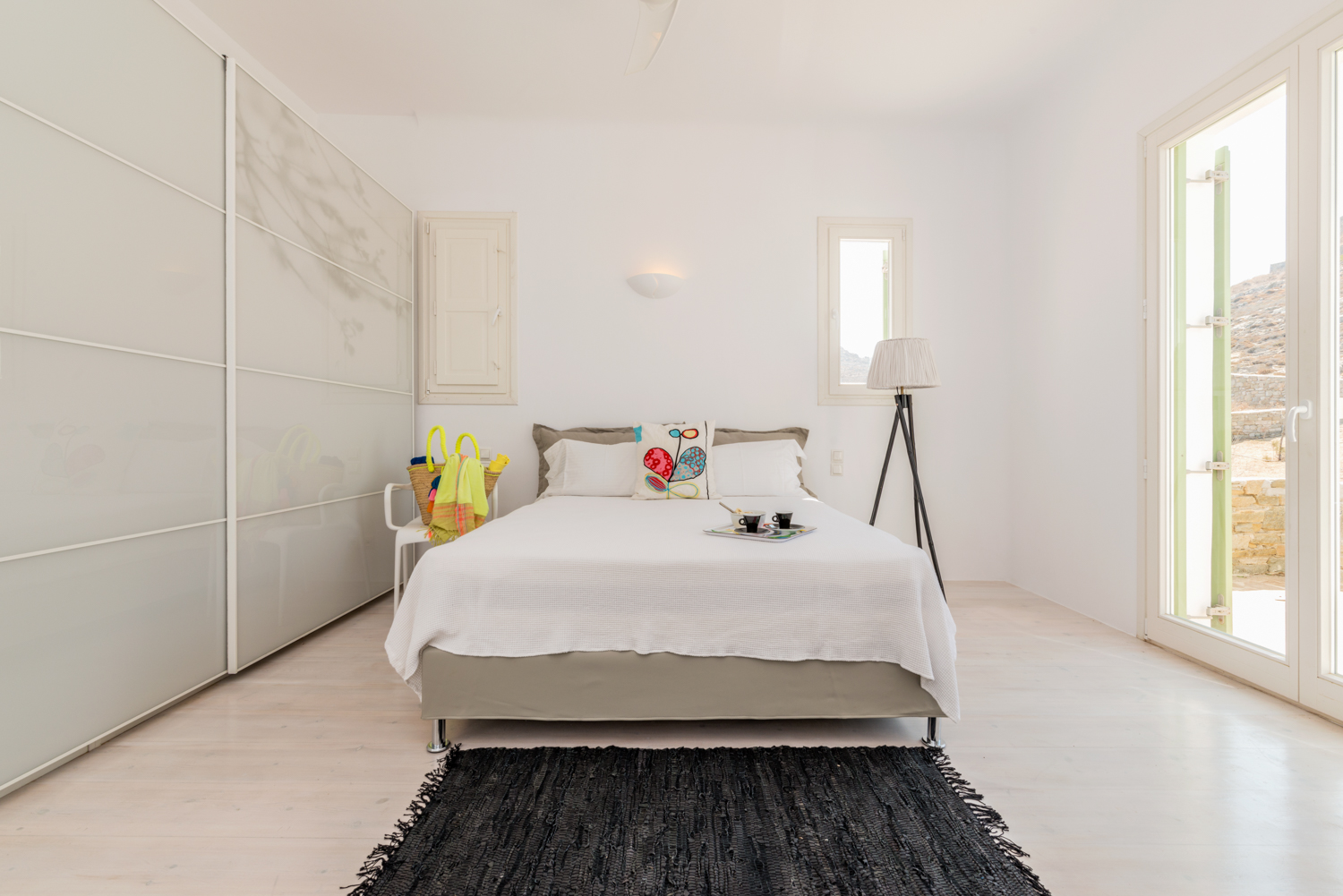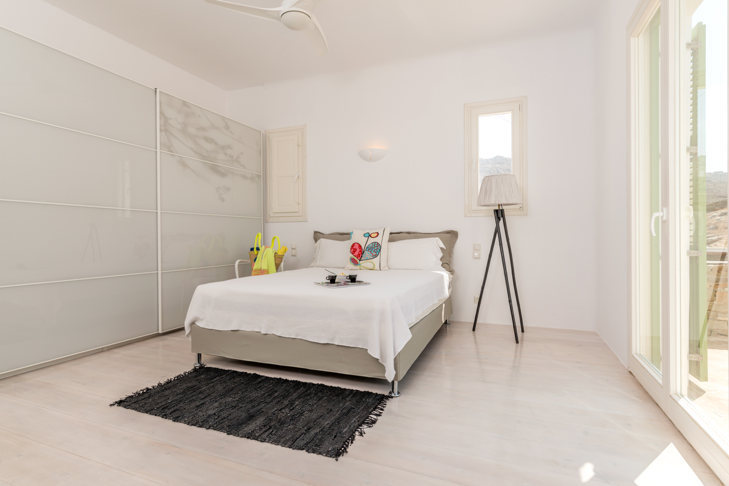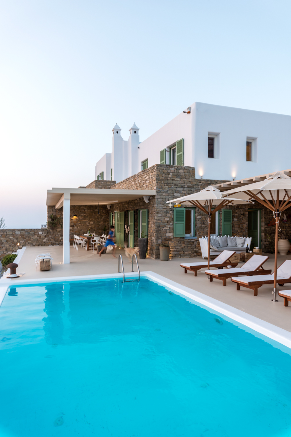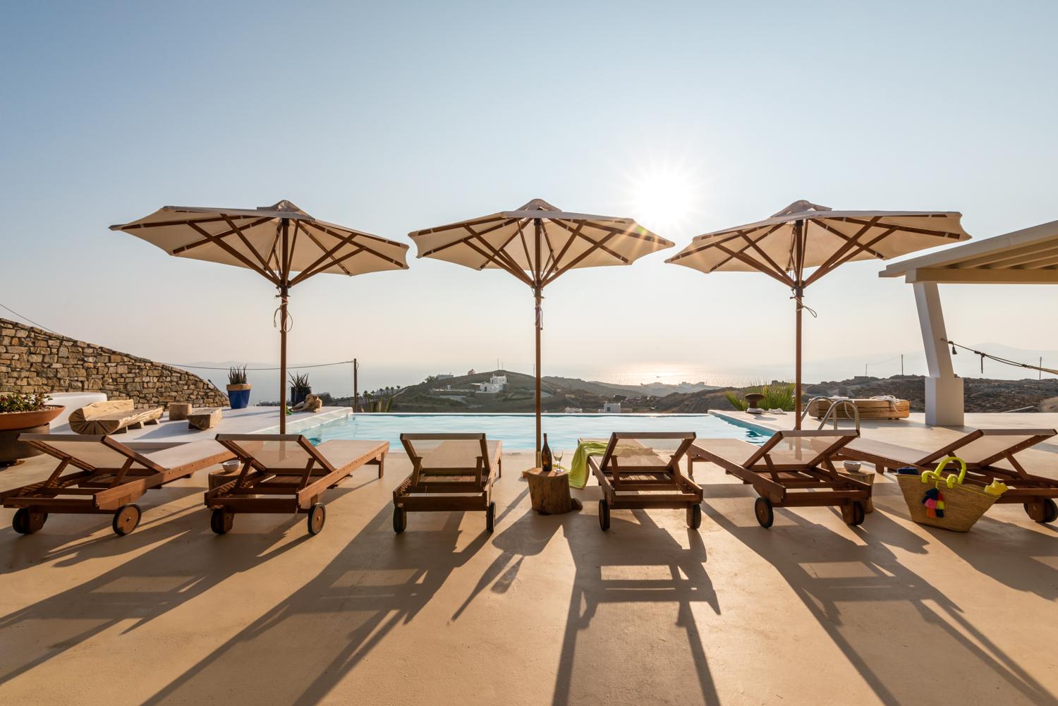 Villa Castillo,a 220q cozy luxury villa built on a lot of 2.500sqm offers the ideal family and party of friends holiday on the cosmpopolitan island of Mykonos. Its amazing view from the outdoor sitting areas where one can relax and enjoy a view of Delos, Tinos, Syros and the magic hour of one of the most enchanting sunsets. The main body of the villa consists of 3 bedrooms 2 with double and 1 twin beds, an open plan fully equiped kitchen and 4 bathrooms. The upstairs master bedroom has an ensuite bathroom. The ample guest house has a double bed and ceiling fan and a spacious ensuite bathroom. All rooms have ceiling fans and there is one aircondition in the living room of the main building.