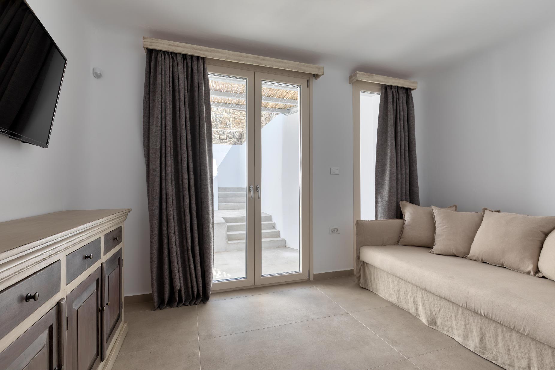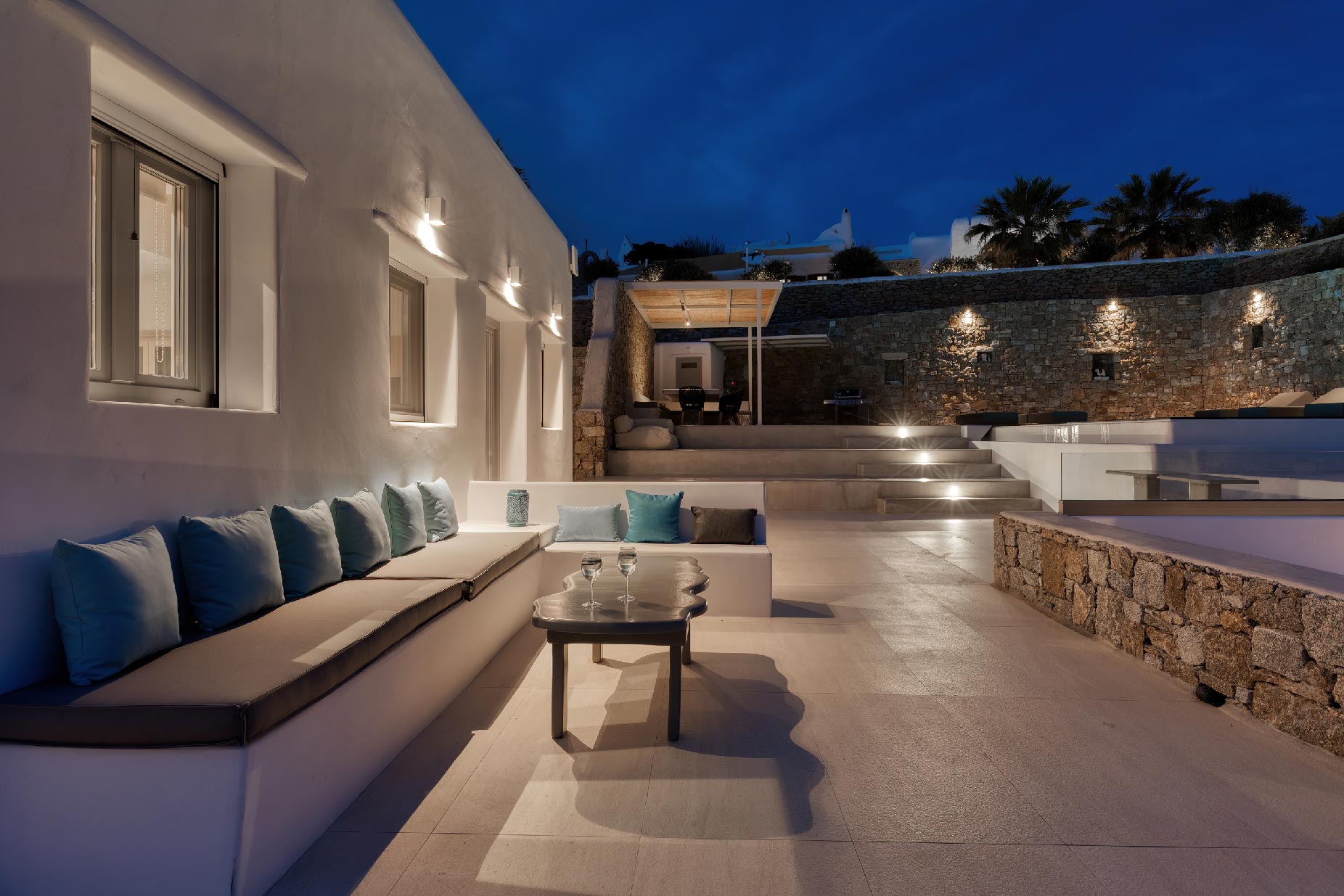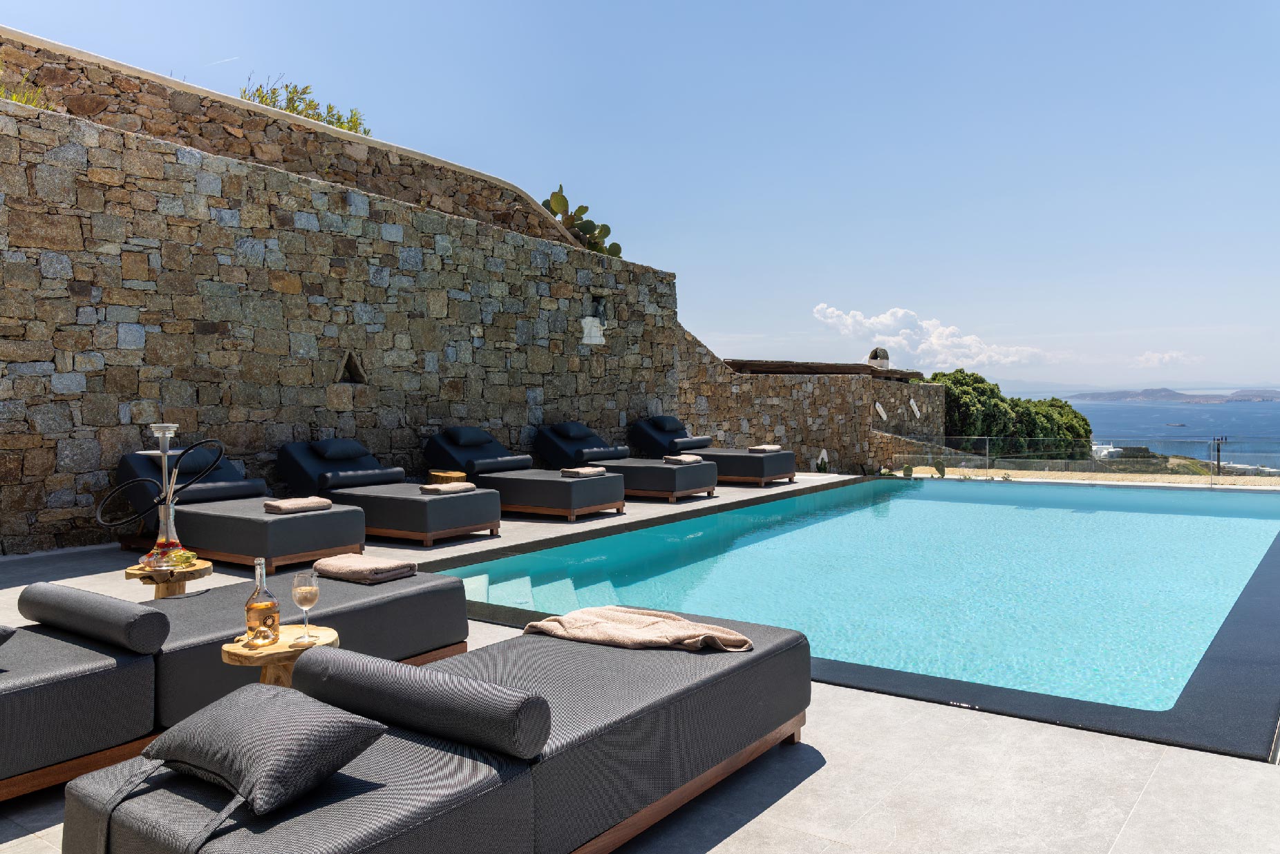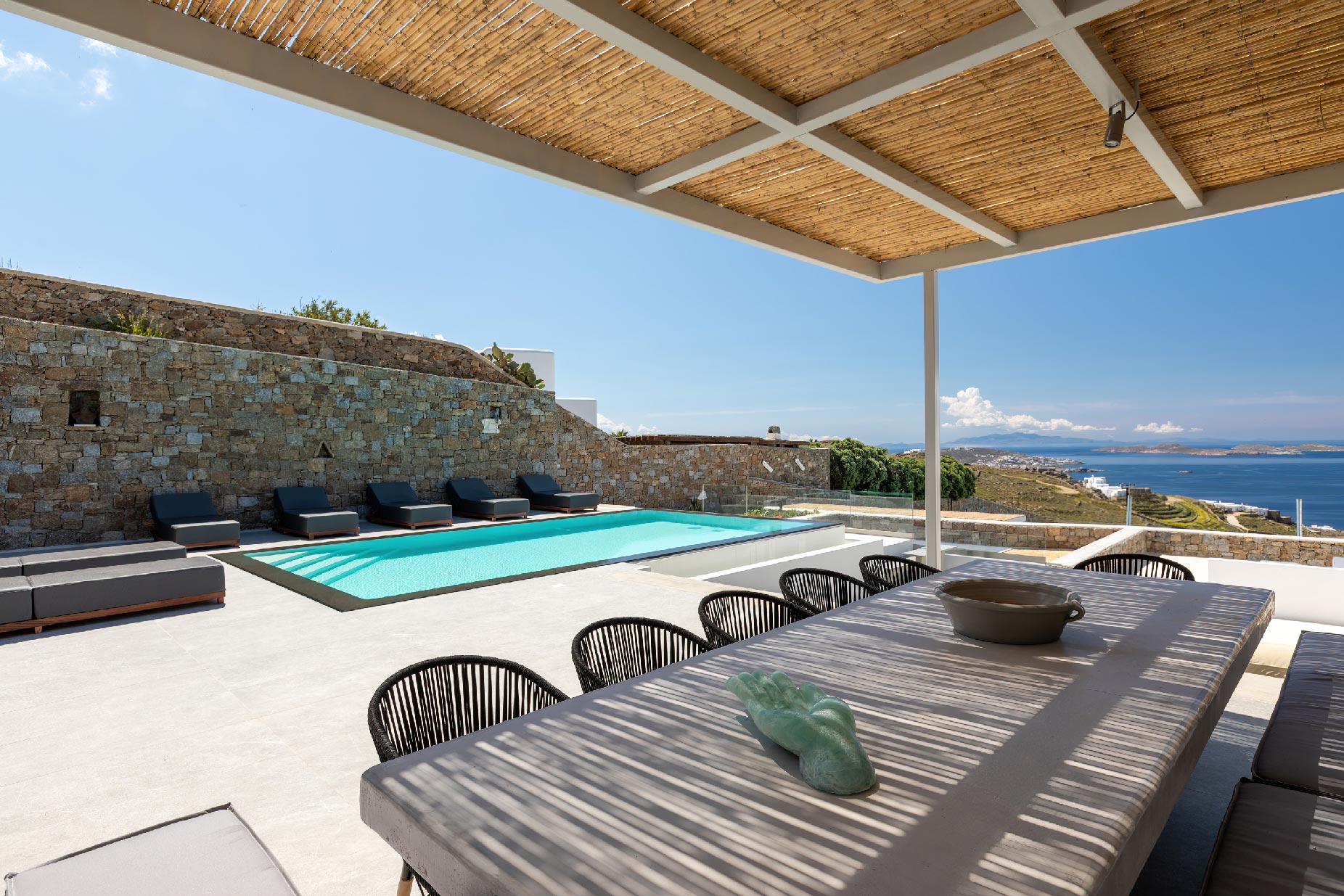 Clear blue sky and a view as far as the eye can travel, elegant and spacious lounging areas will surround you along with the villa’s Cycladic architecture. The outdoor area simply fulfills every individual need in an oasis-like environment from every aspect. The deck is almost floating above the sea and equipped with sun loungers, is perfect for leisure days soaking up the sun. Your only task is to relax by the amazing pool and allow your senses to free themselves away from indiscreet eyes.
