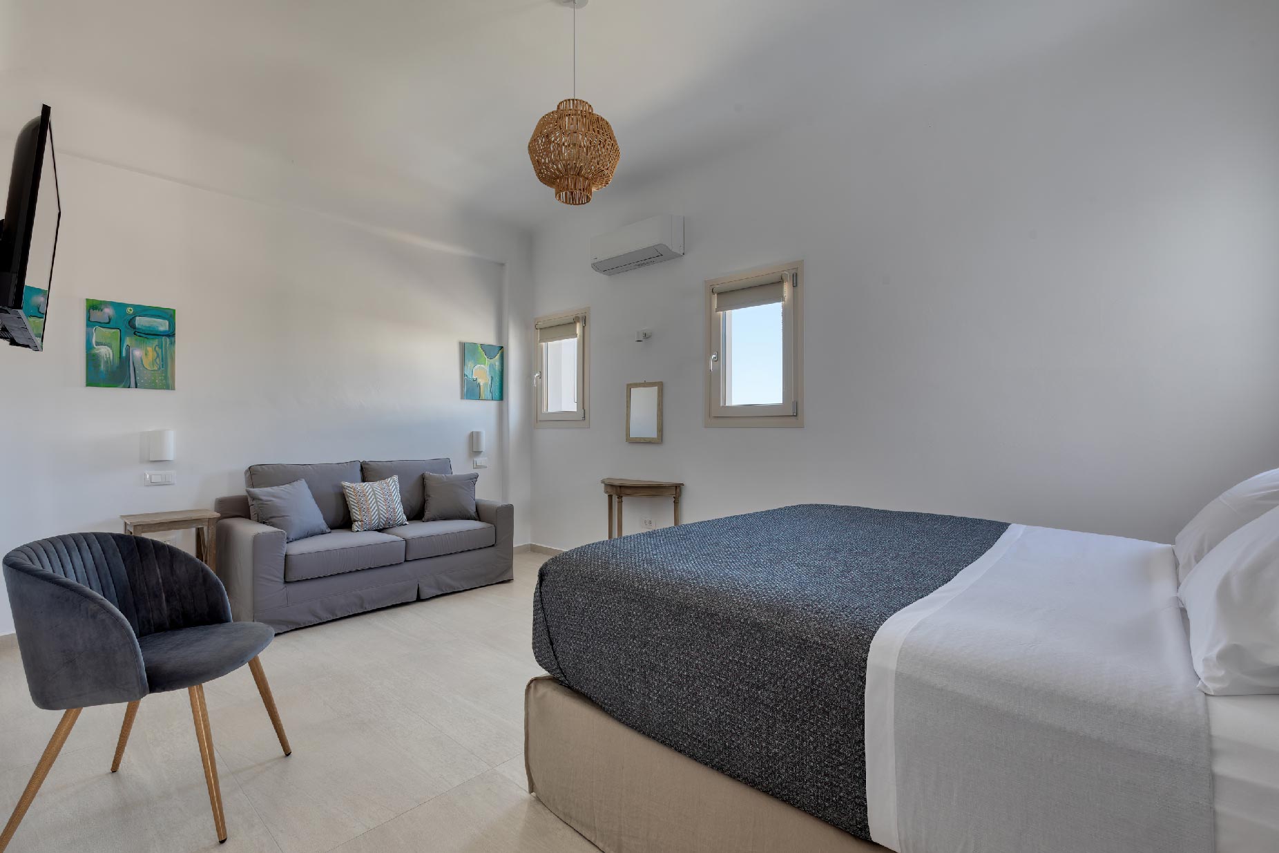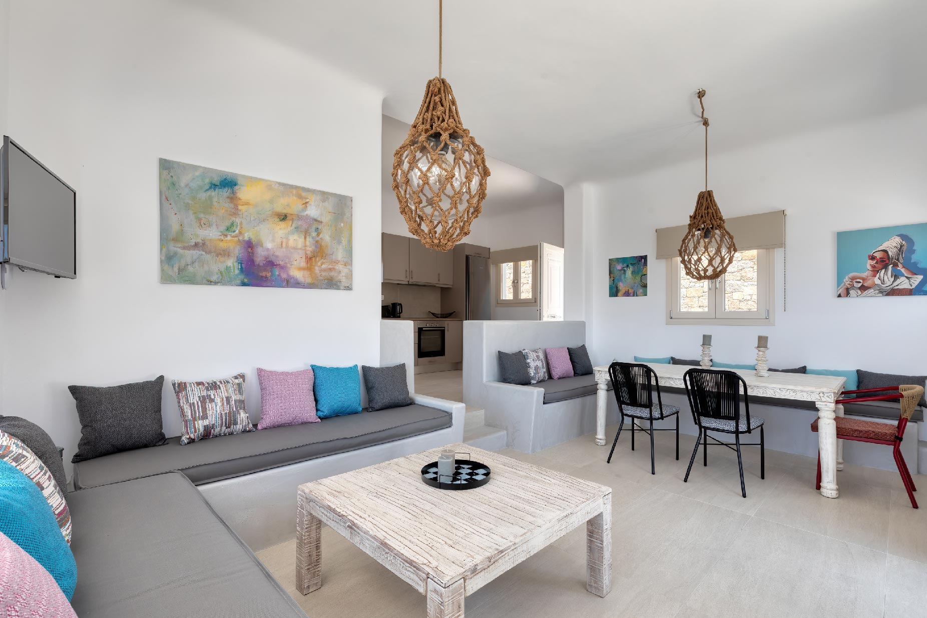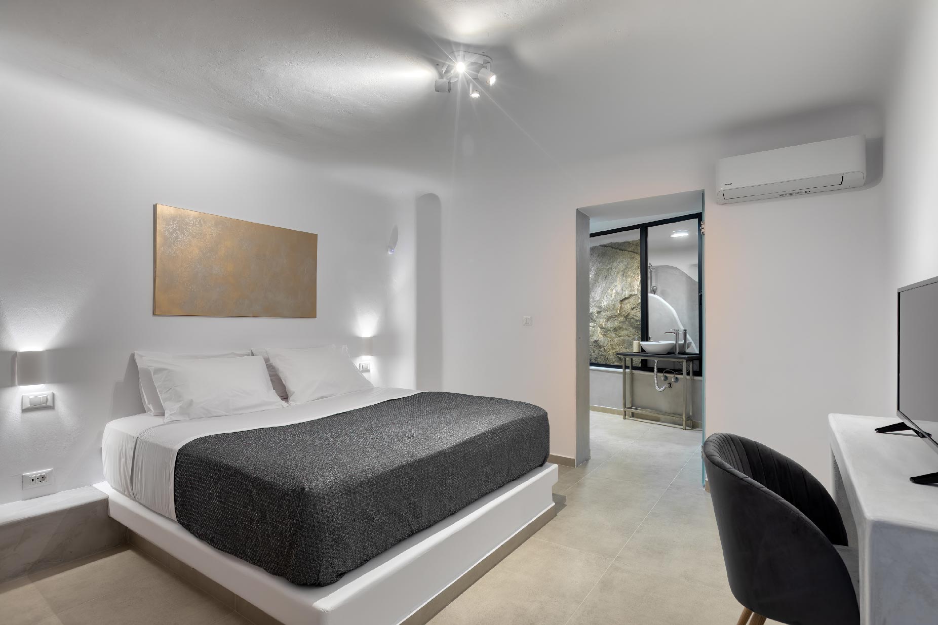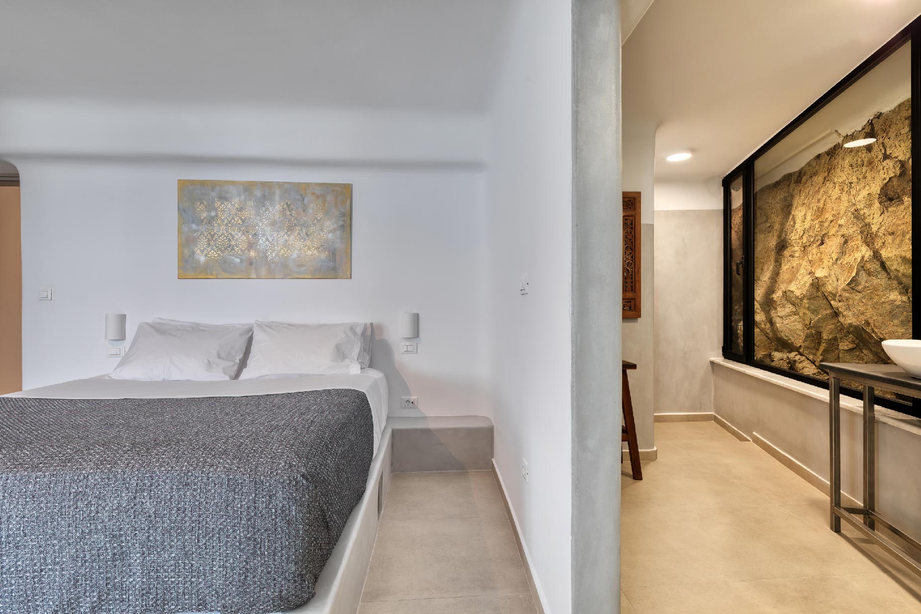 Clear blue sky and a view as far as the eye can travel, elegant and spacious lounging areas will surround you along with the villa’s Cycladic architecture. The outdoor area simply fulfills every individual need in an oasis-like environment from every aspect. The deck is almost floating above the sea and equipped with sun loungers, is perfect for leisure days soaking up the sun. Your only task is to relax by the amazing pool and allow your senses to free themselves away from indiscreet eyes.