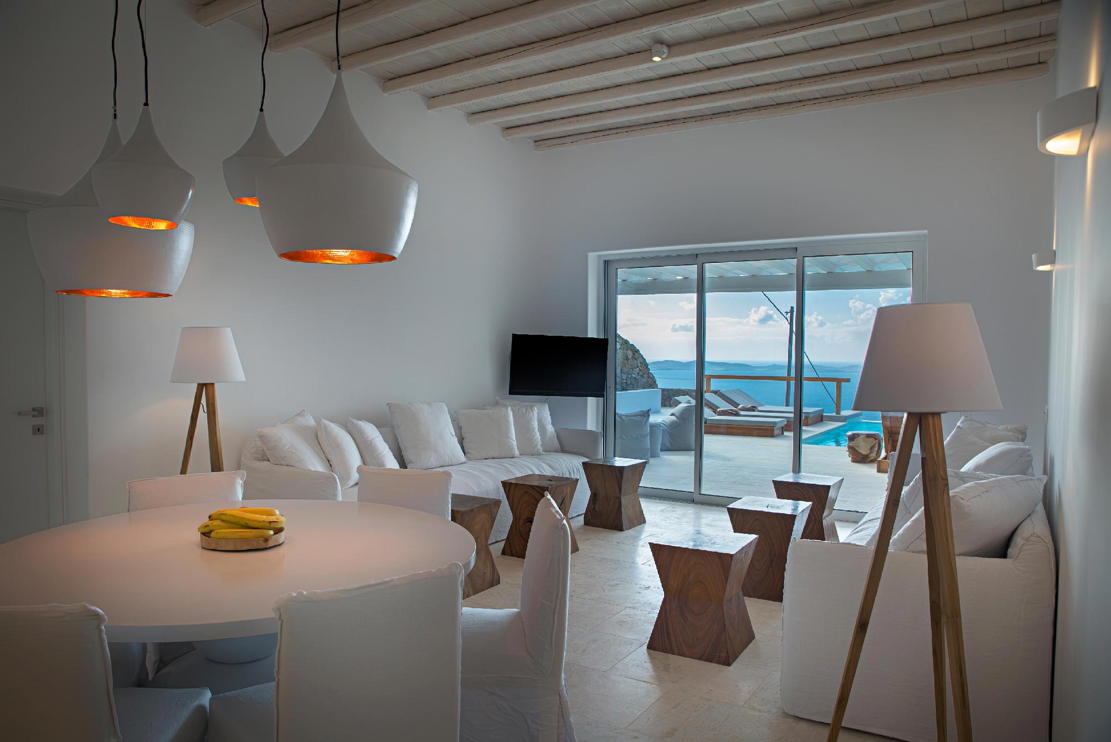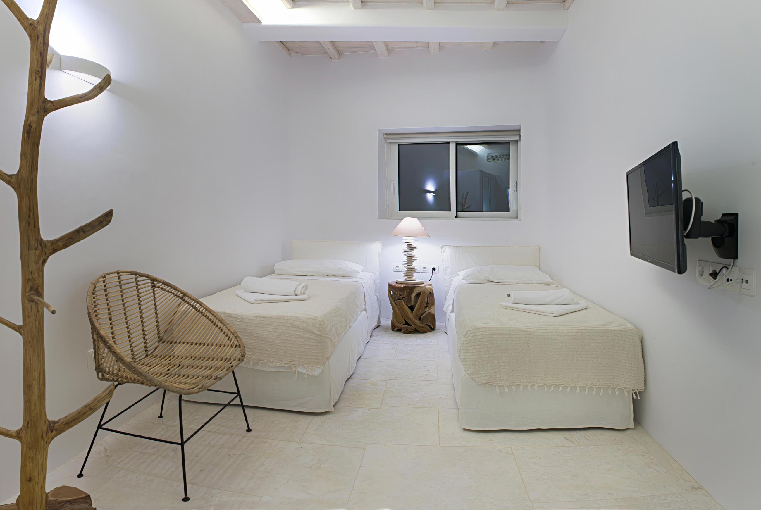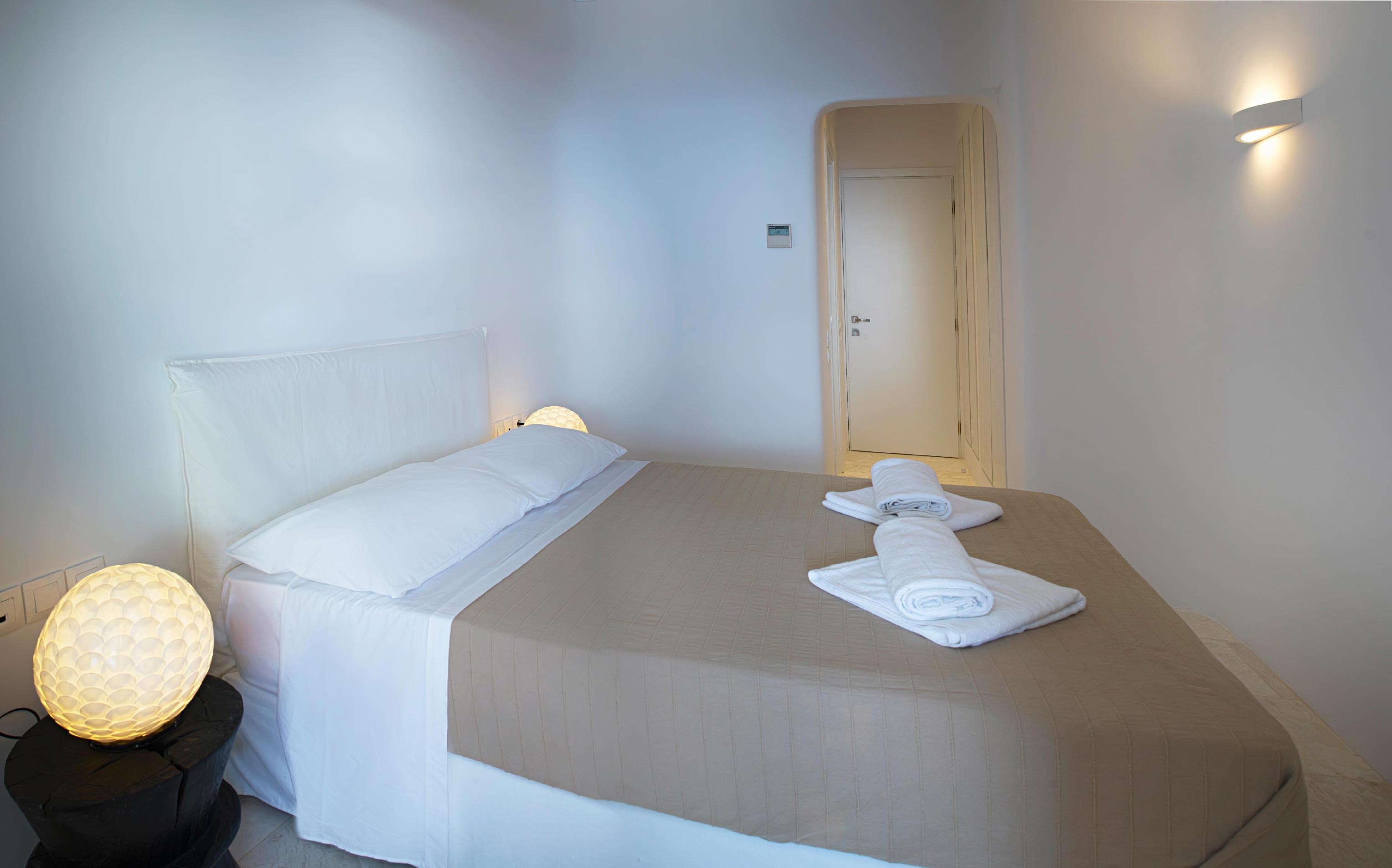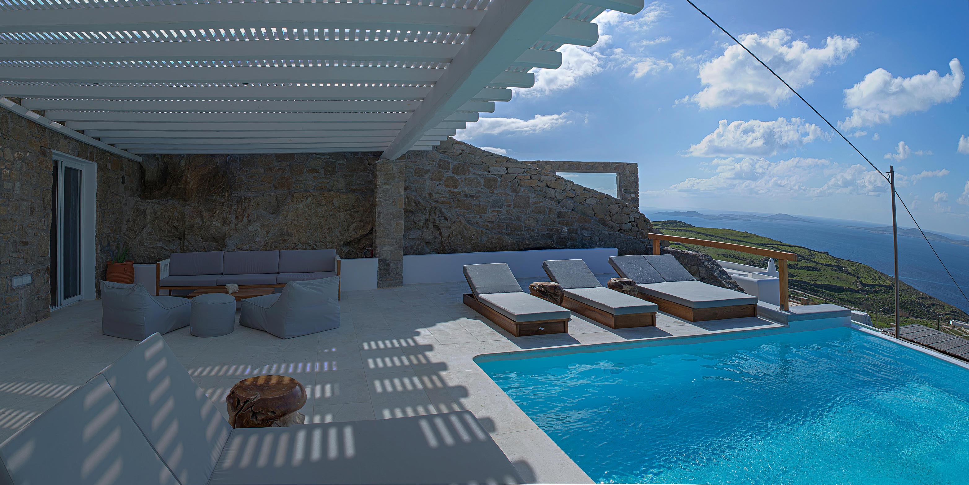 A luxurious villa, part of a glorious complex of Villas and Suites. Located at the mid level of the complex, offering unique sea views and sunset. With an outdoor lounge, dining room, swimming pool and sun loungers. Inside you will find a spacious lounge with a large dining area and a fully equipped kitchen. 3 master bedrooms with double beds (160cm*200cm) and one master bedroom with two single beds (100cm*200cm) An independent guest house with one double bed (180cm*200cm), located at the lower level of the complex which is connected with the outdoor area of the Villa through a traditional stone stair case.