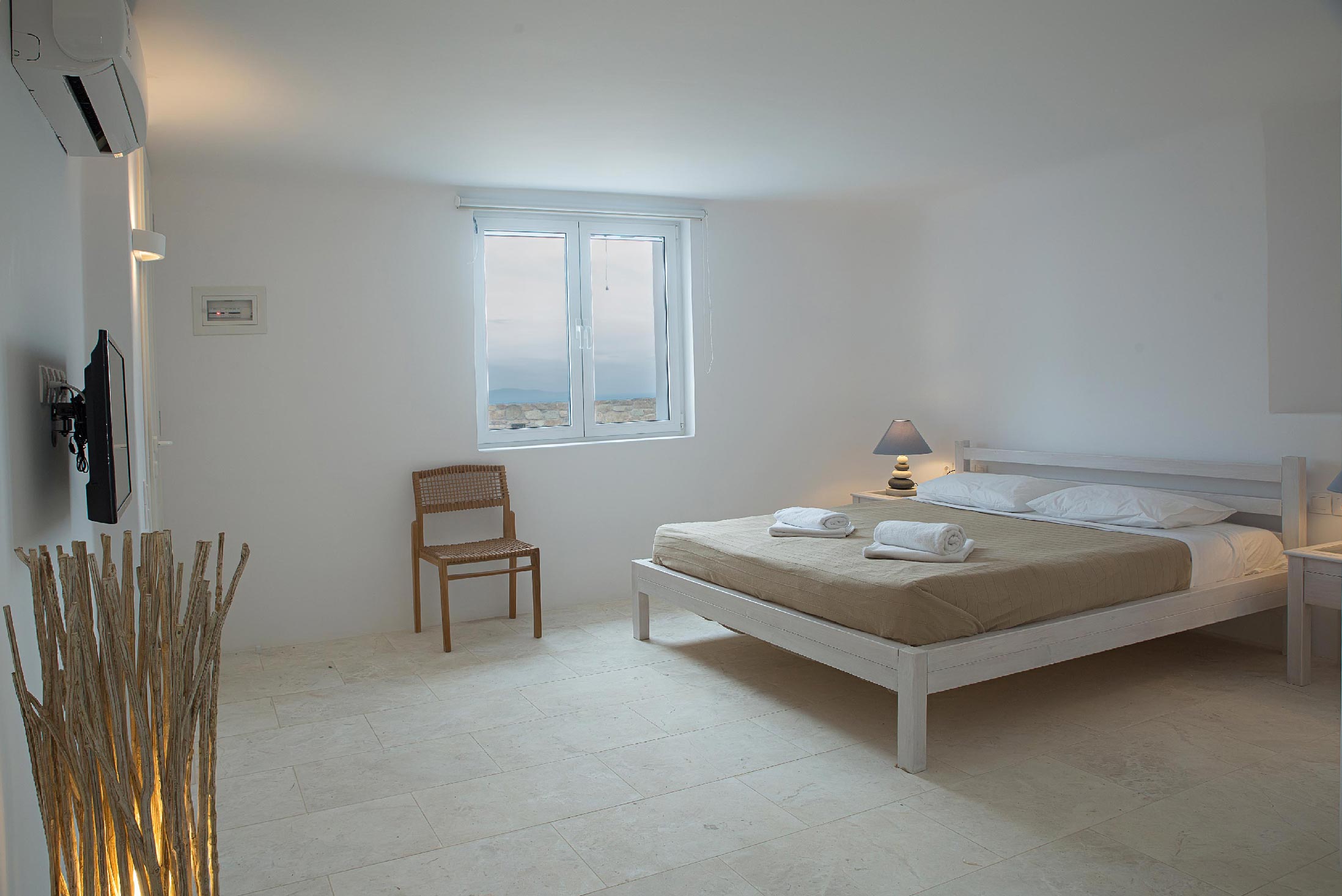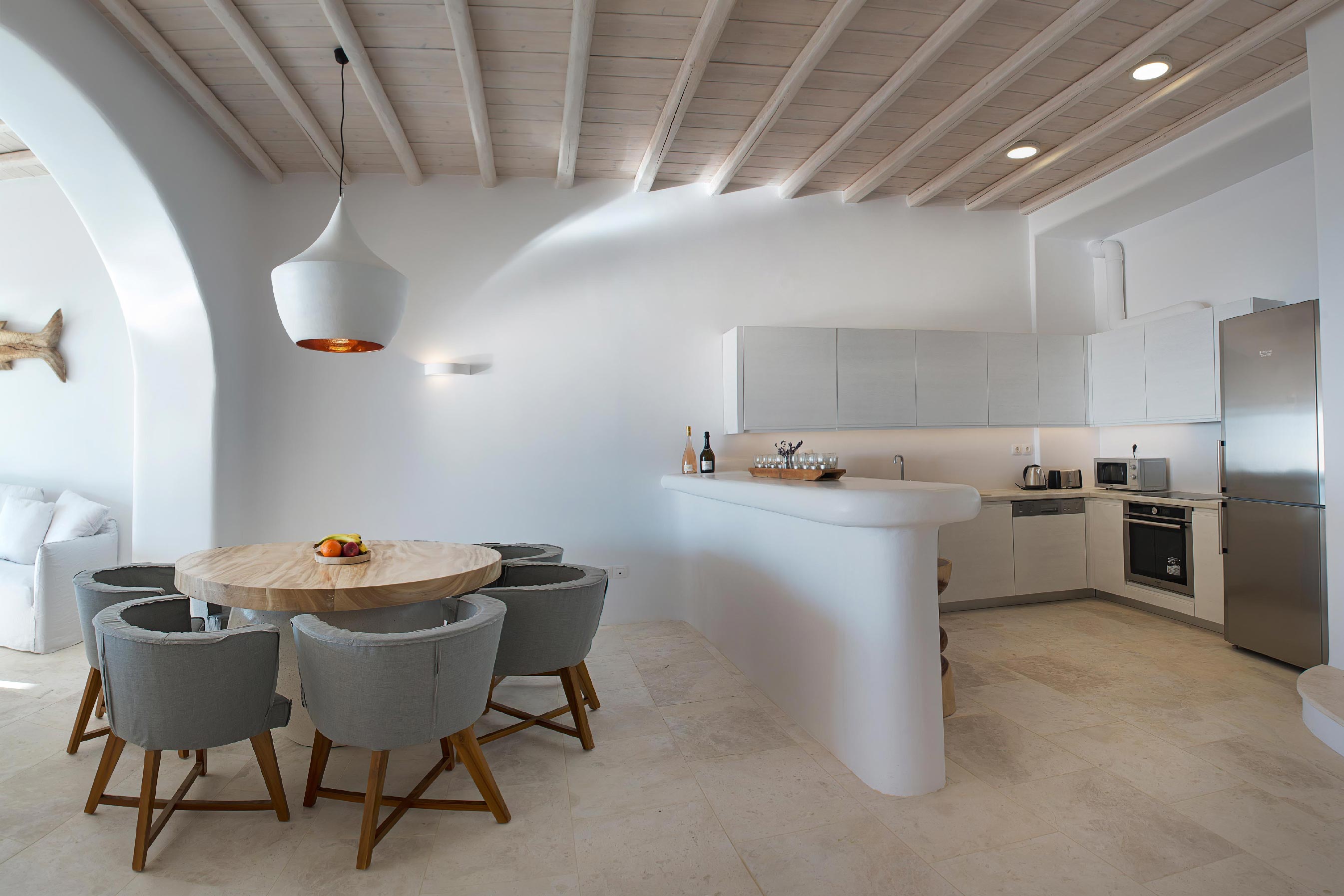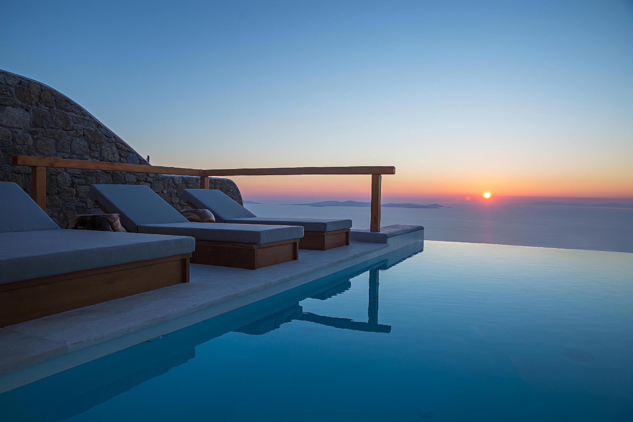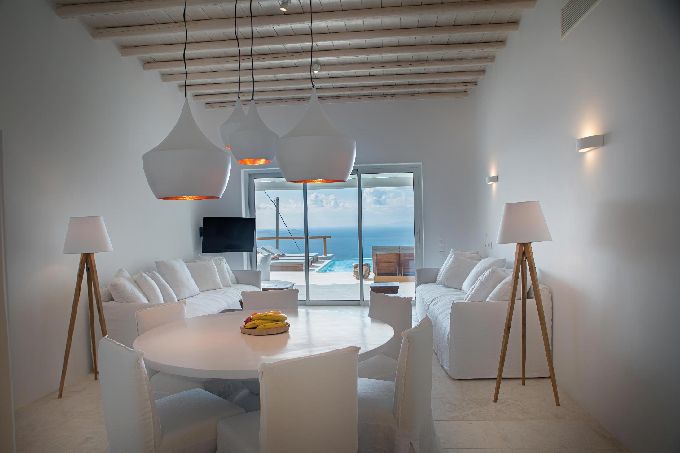 A luxurious villa, part of a glorious complex of Villas and Suites. Located at the mid level of the complex, offering unique sea views and sunset. With an outdoor lounge, dining room, swimming pool and sun loungers. Inside you will find a spacious lounge with a large dining area and a fully equipped kitchen. 3 master bedrooms with double beds (160cm*200cm) and one master bedroom with two single beds (100cm*200cm) An independent guest house with one double bed (180cm*200cm), located at the lower level of the complex which is connected with the outdoor area of the Villa through a traditional stone stair case.