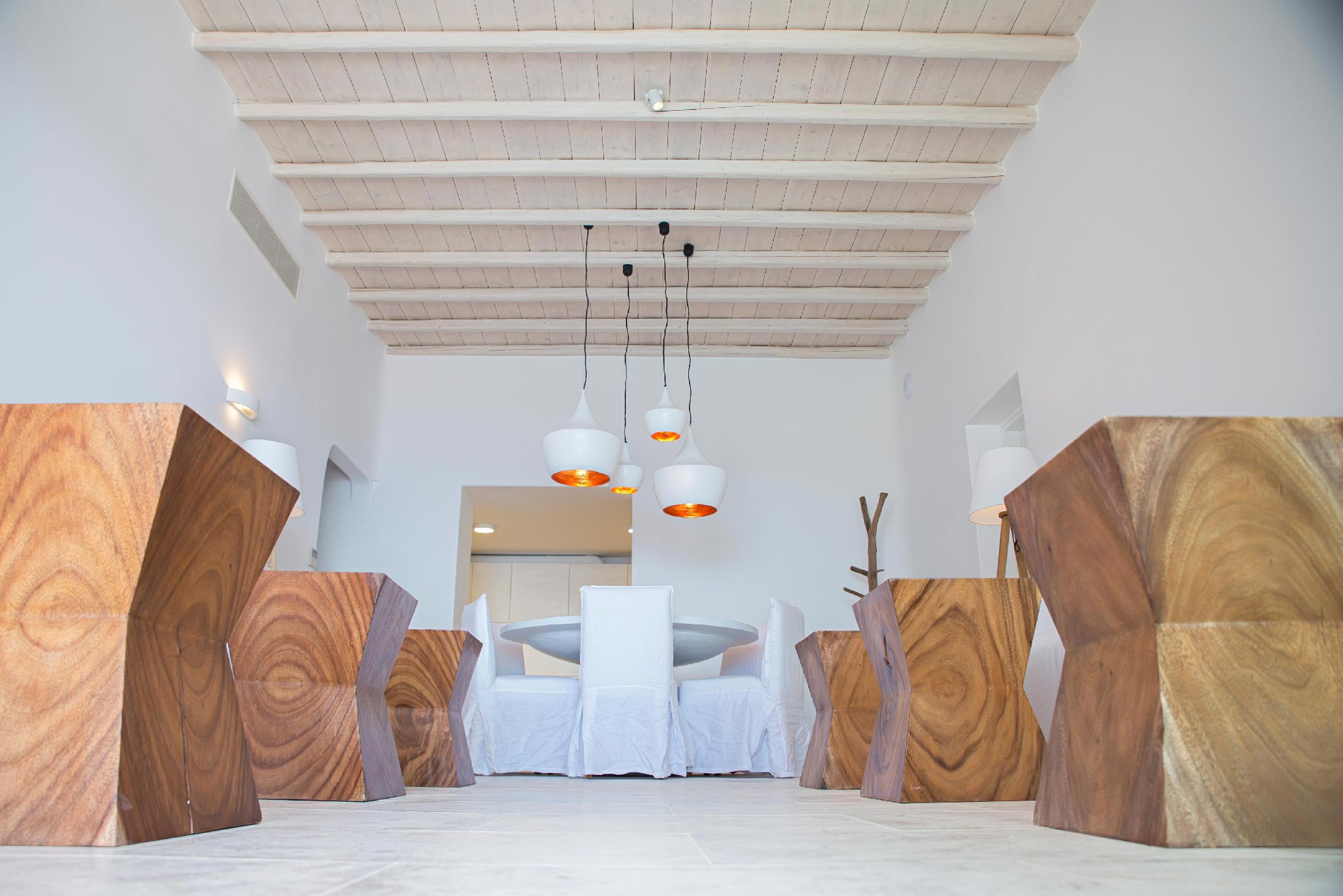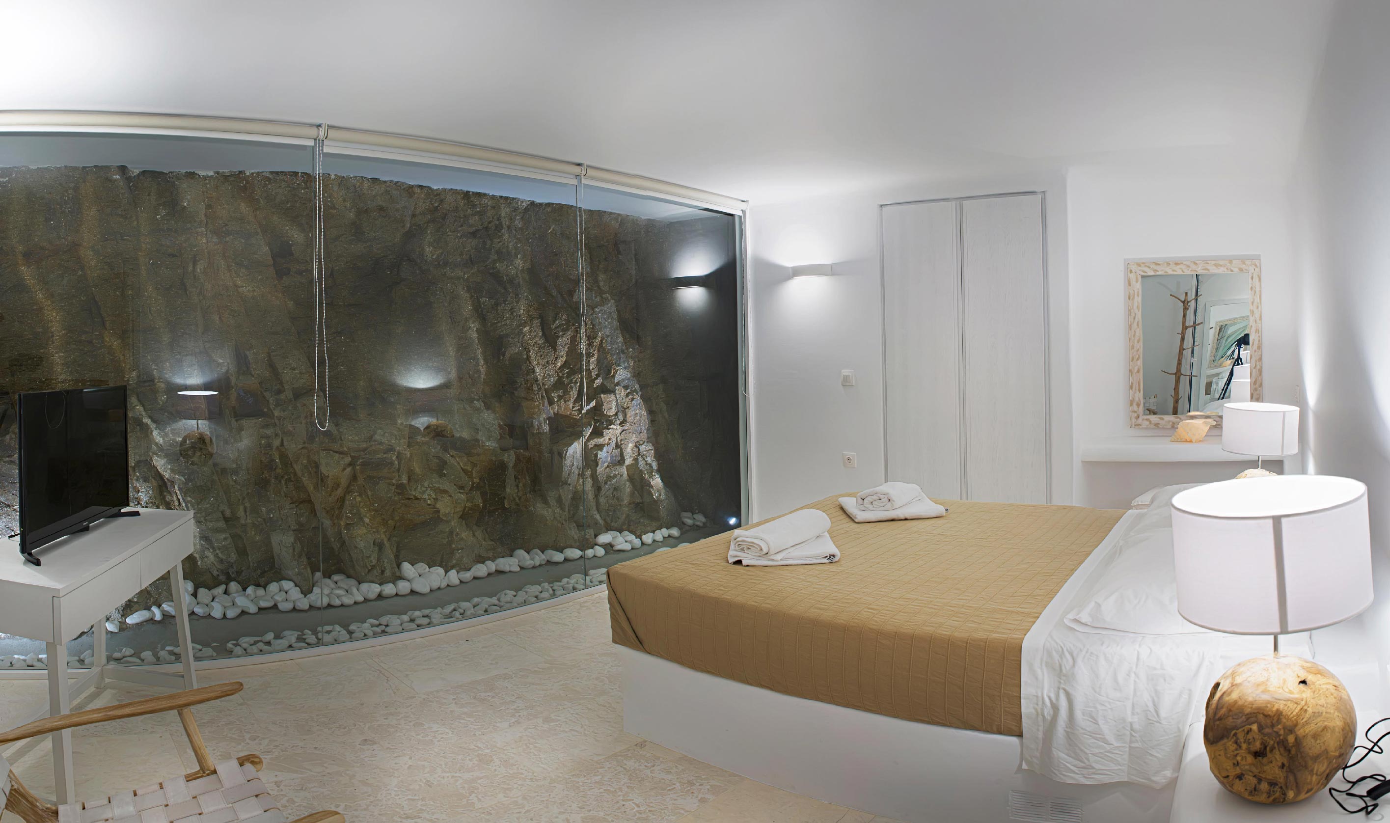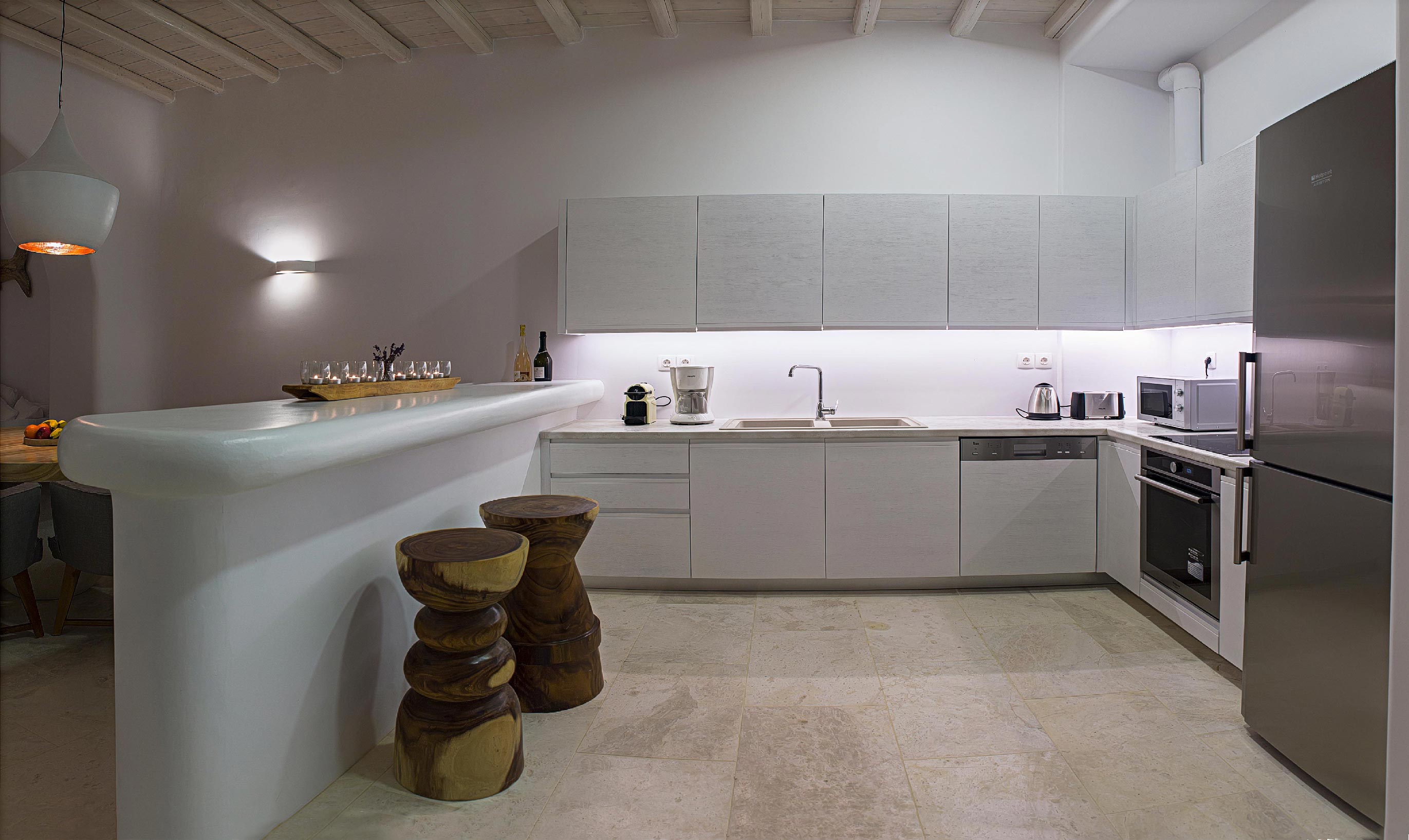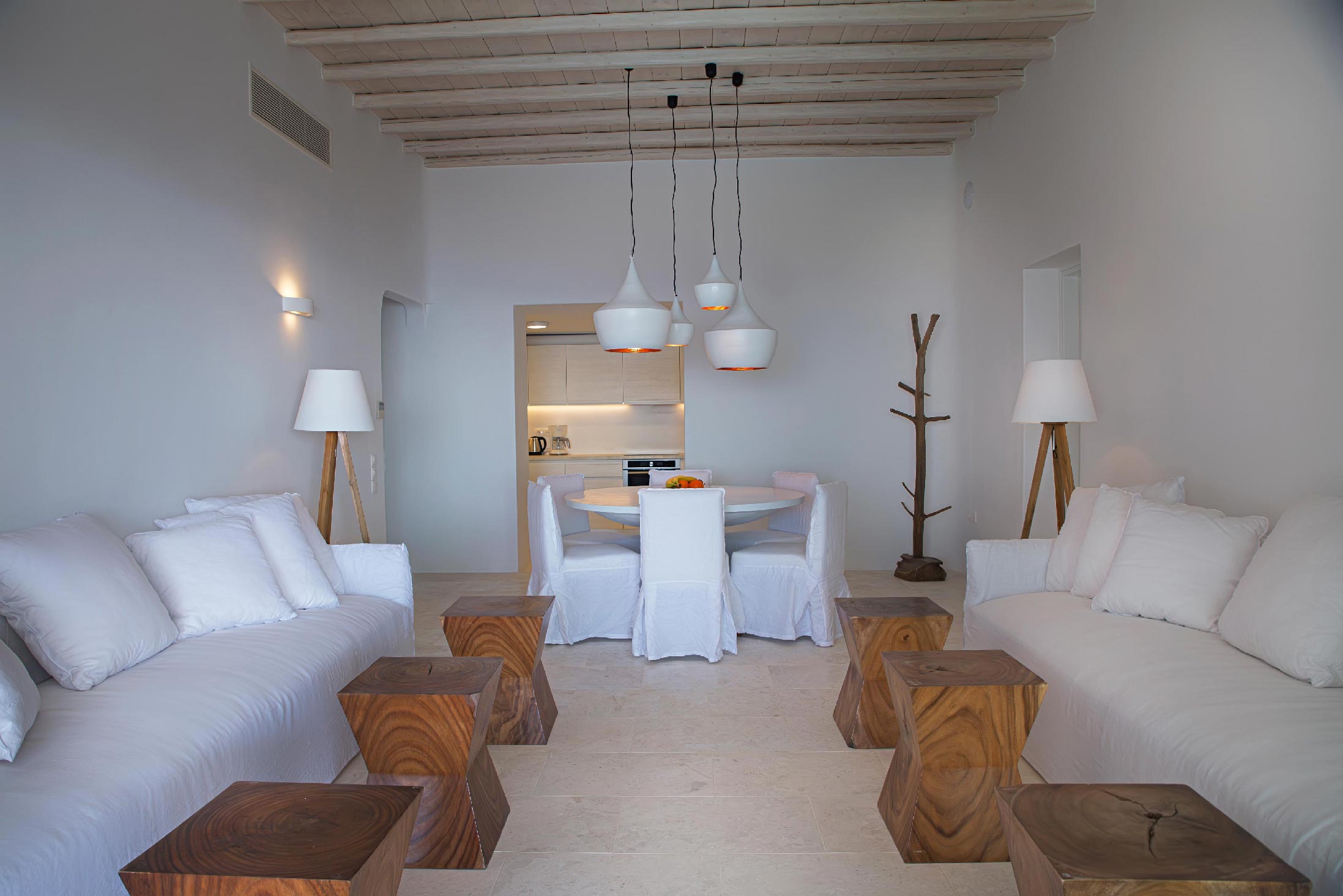 A luxurious villa, part of a glorious complex of Villas and Suites. Located at the mid level of the complex, offering unique sea views and sunset. With an outdoor lounge, dining room, swimming pool and sun loungers. Inside you will find a spacious lounge with a large dining area and a fully equipped kitchen. 3 master bedrooms with double beds (160cm*200cm) and one master bedroom with two single beds (100cm*200cm) An independent guest house with one double bed (180cm*200cm), located at the lower level of the complex which is connected with the outdoor area of the Villa through a traditional stone stair case.